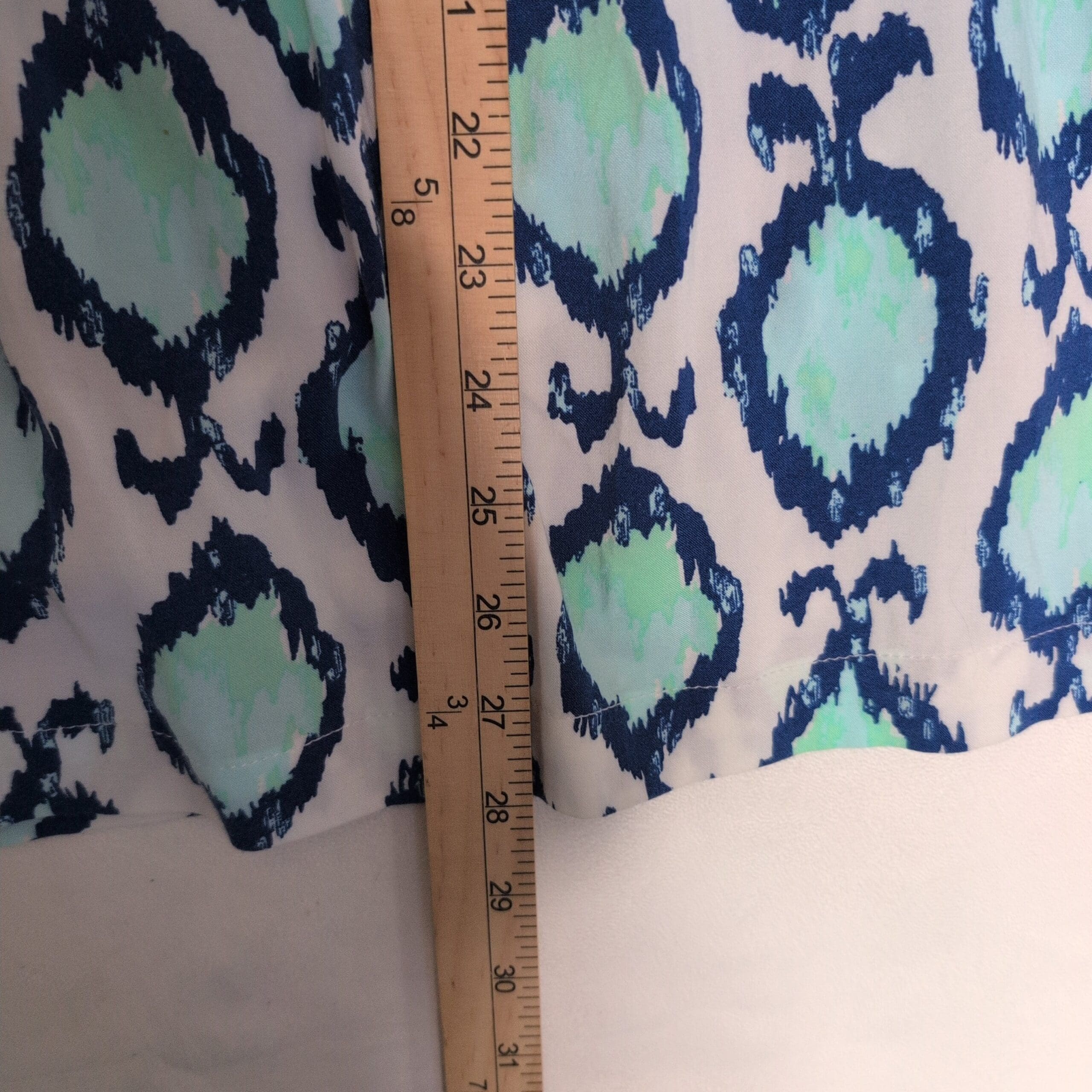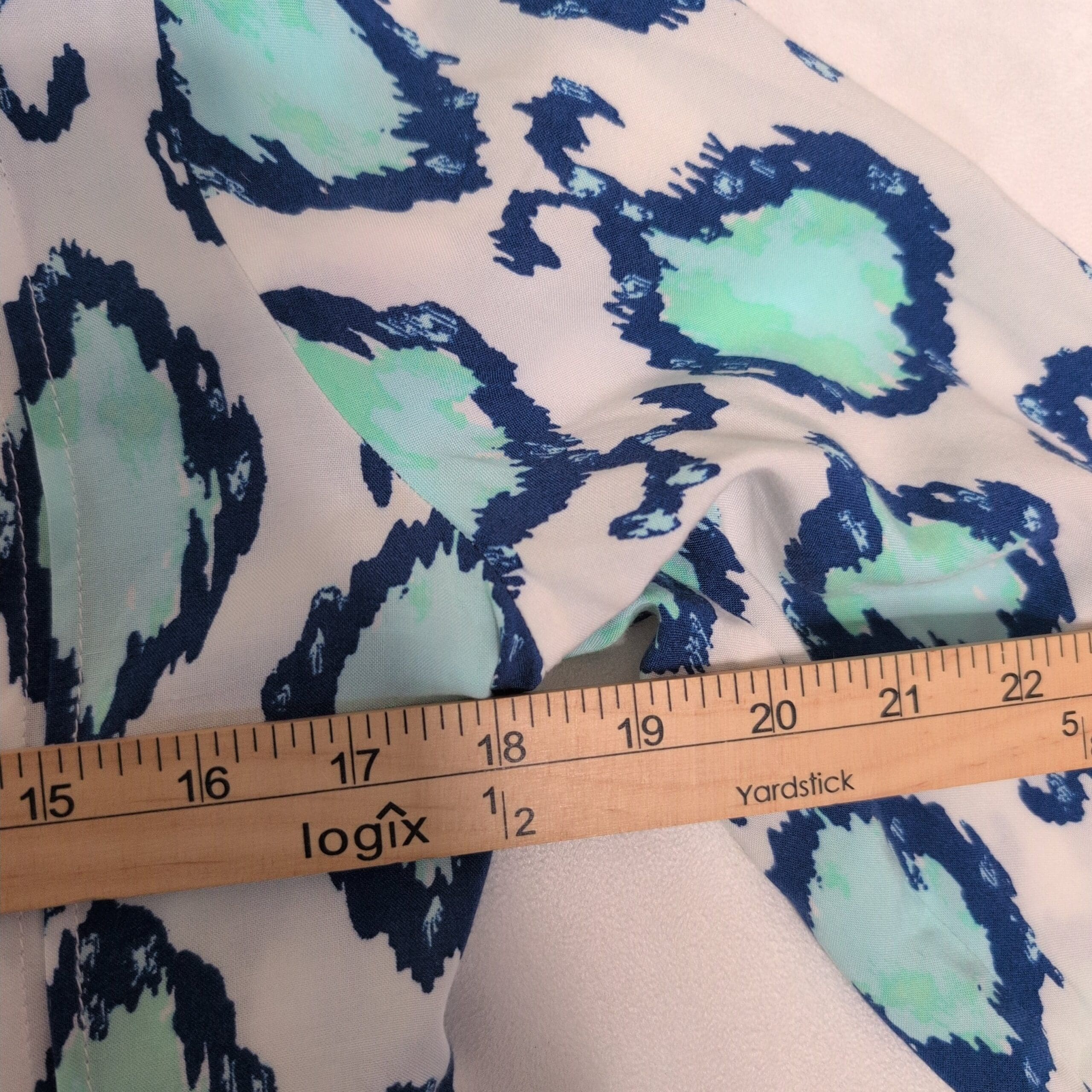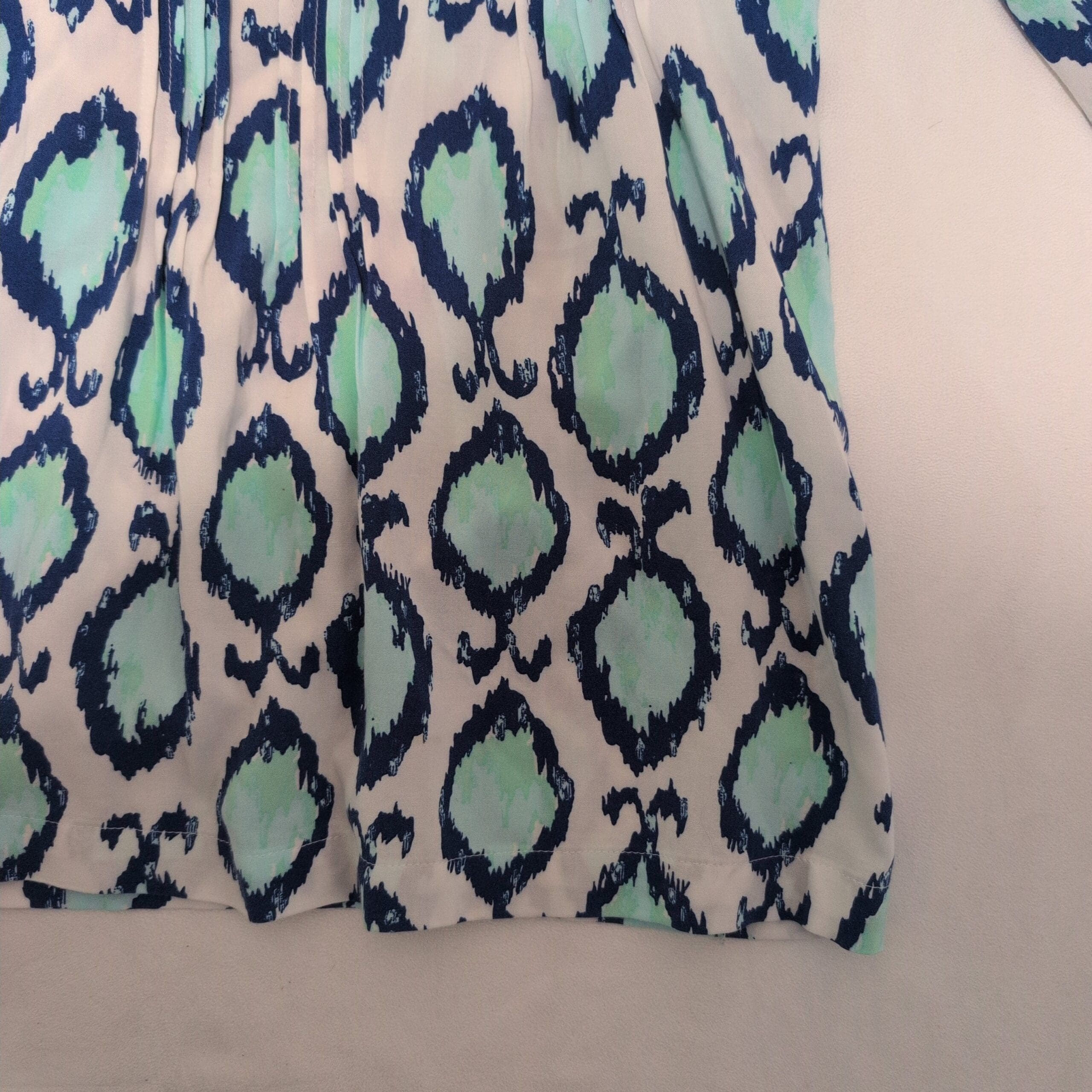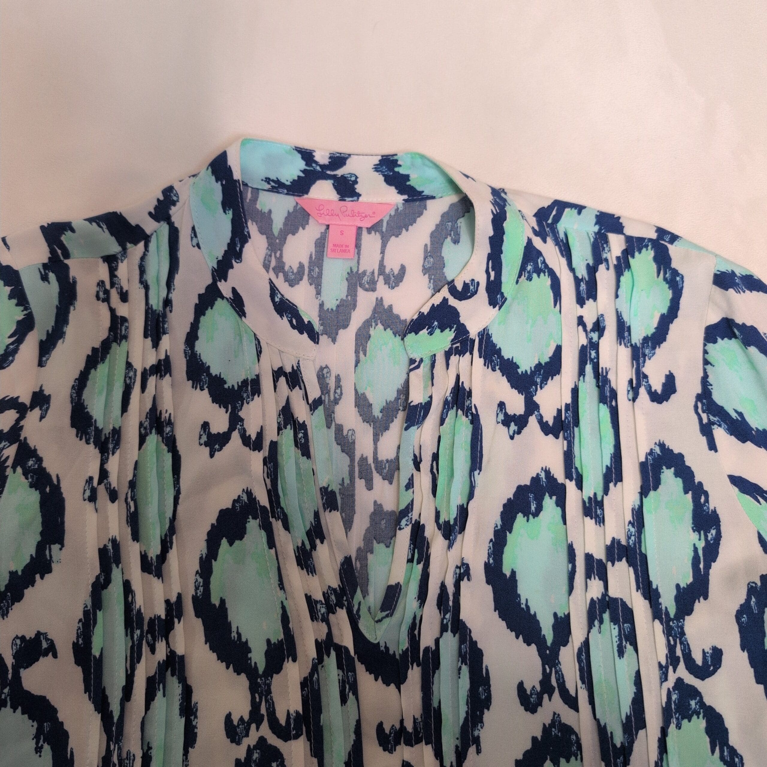 Lilly Pulitzer women’s tunic in size S. White background with aqua/teal and navy ikat-inspired print. V-neck with soft center pleating, three-quarter sleeves, and a relaxed A-line silhouette — perfect for warm-weather layering or resort wear. Gently used and free of major rips, tears, stains, or flaws; typical light wear consistent with pre-owned condition may be present.