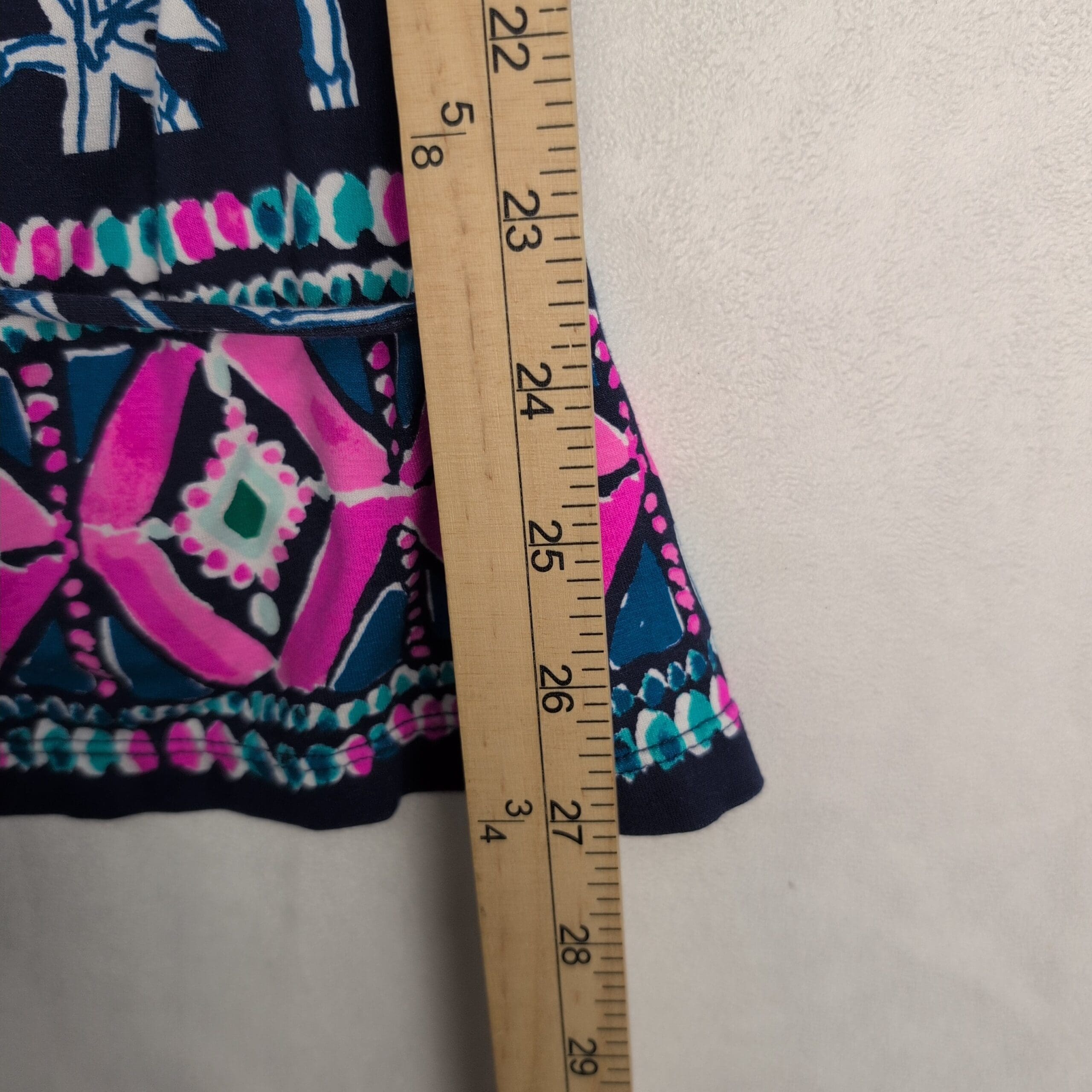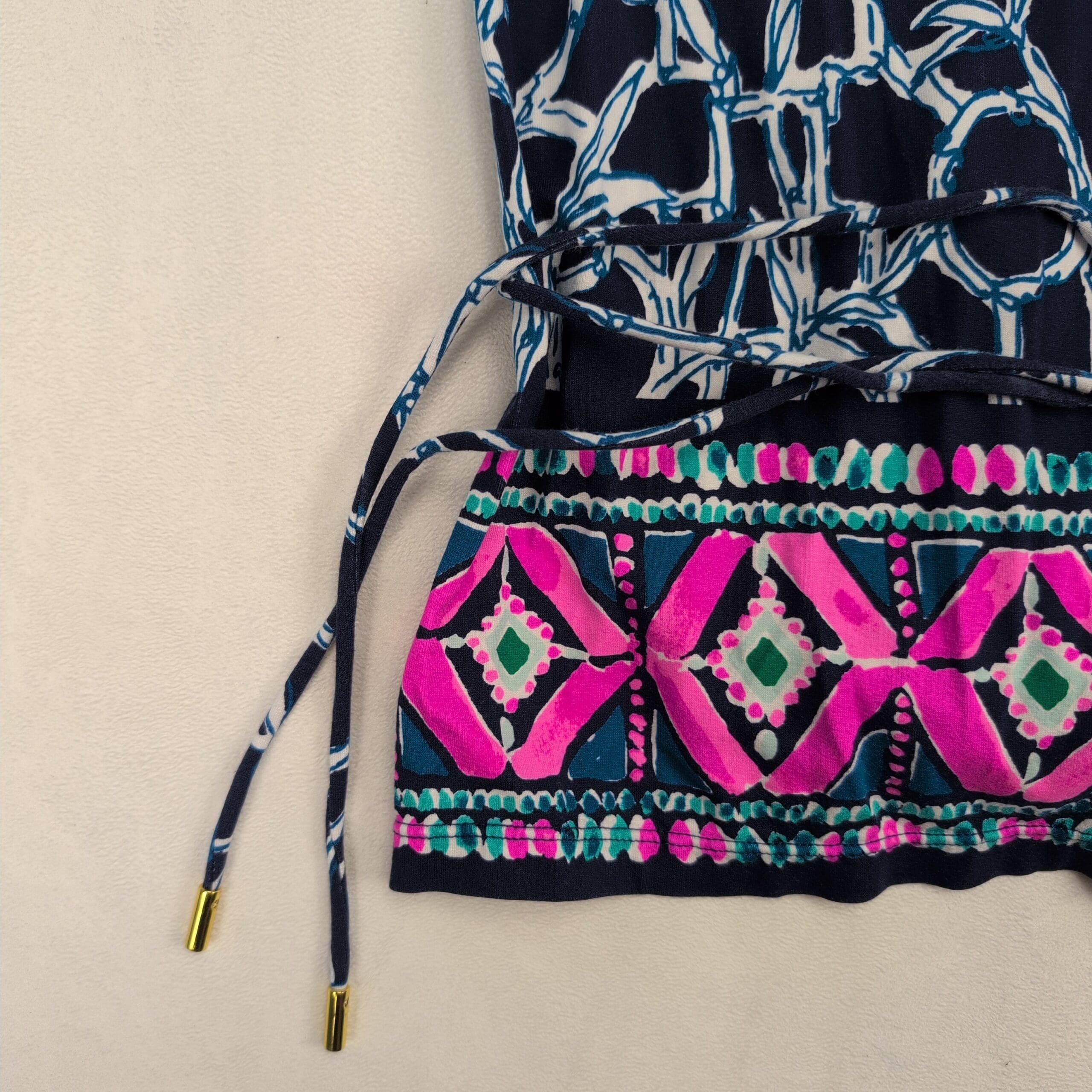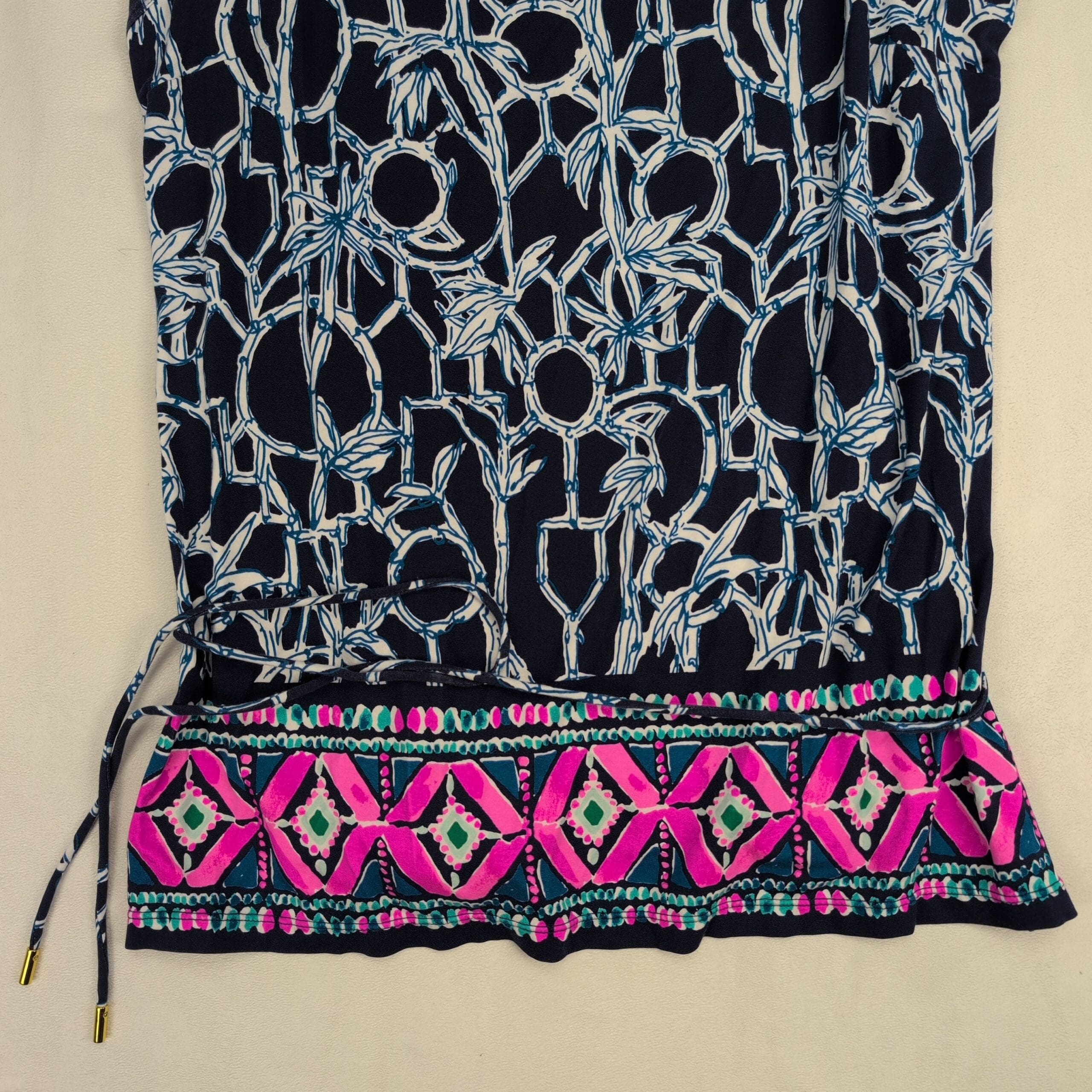 Color & pattern: Navy background with white interlocking bamboo/geometric print and a vibrant pink & teal border along the hem.