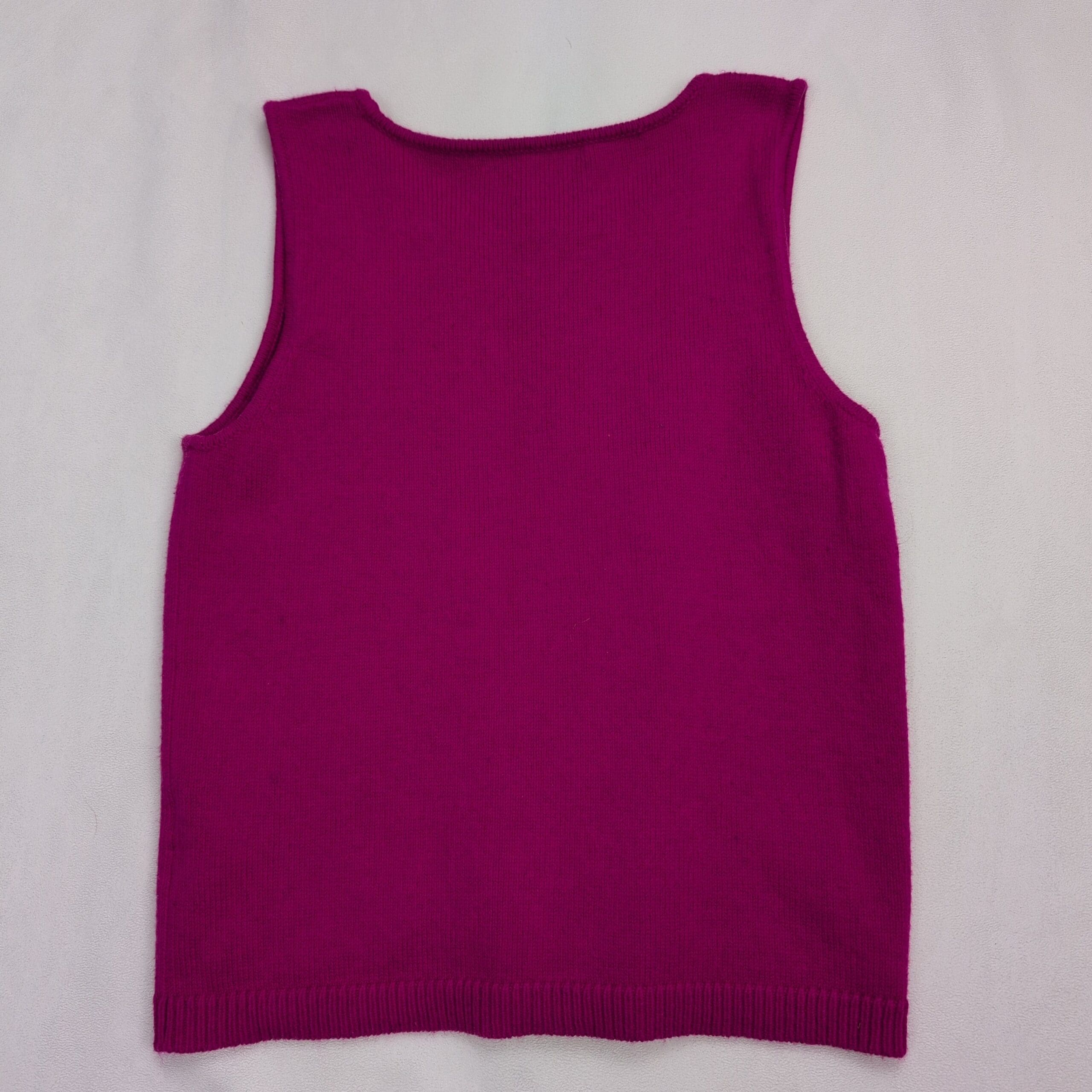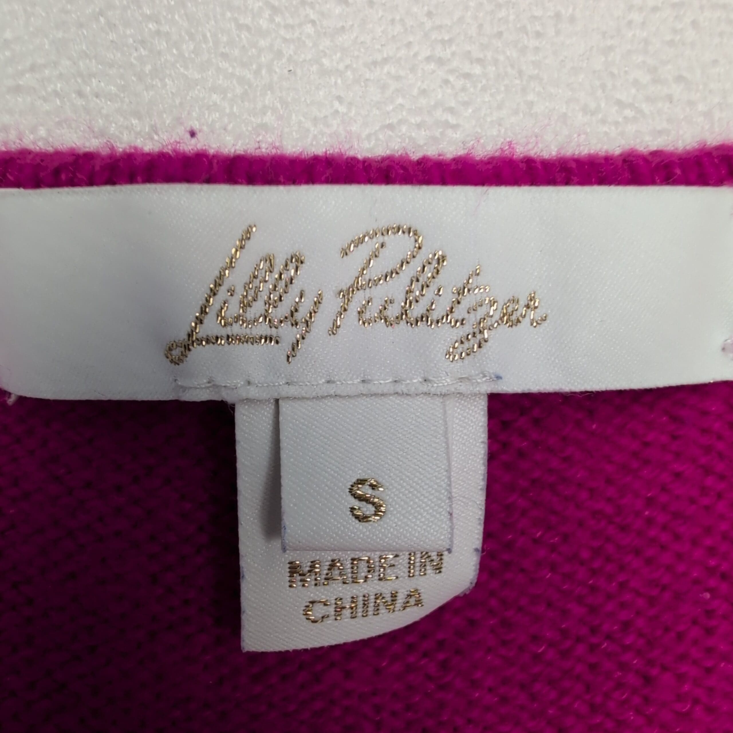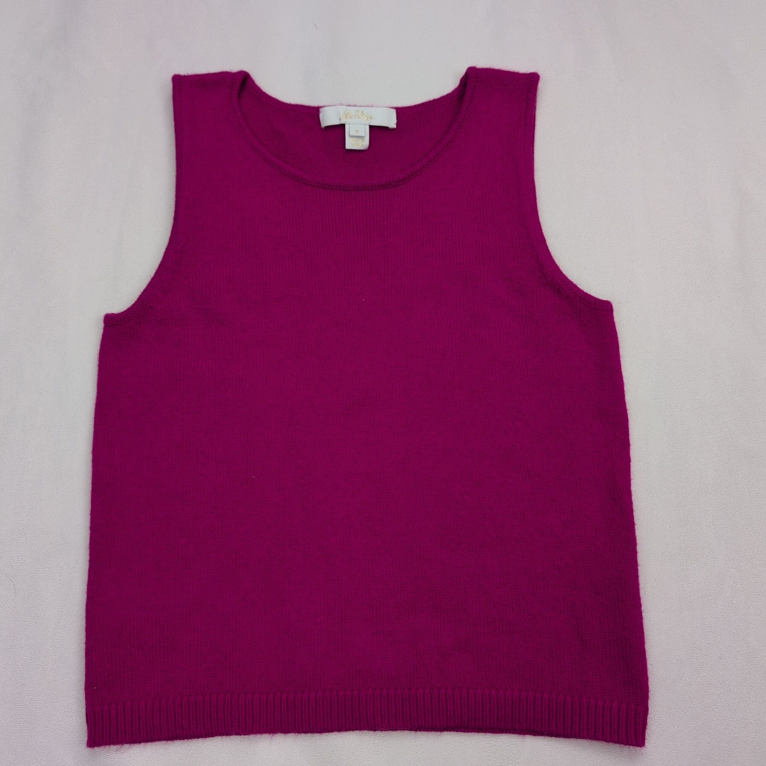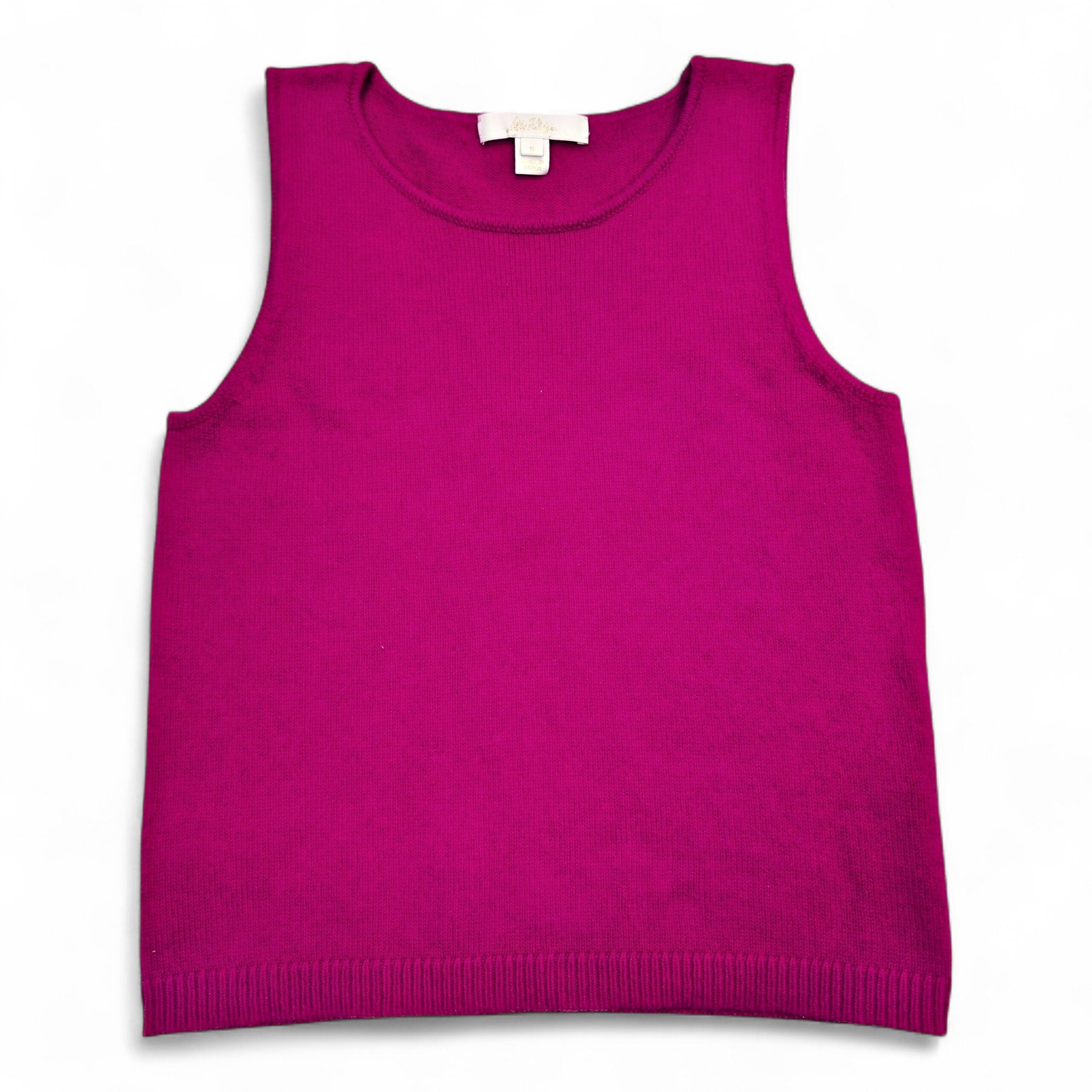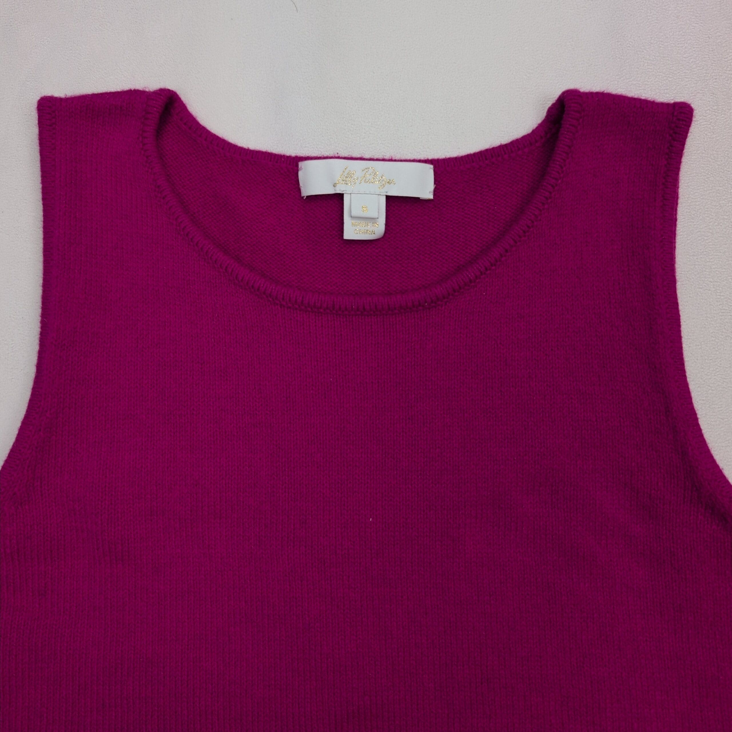 Lilly Pulitzer sleeveless knit sweater tank in a vibrant magenta. Size S (standard). Soft, lightweight sweater knit — great for layering or wearing on its own in transitional weather. Excellent used condition: free of major rips, tears, or stains; typical light wear consistent with prior use. Tag shows Lilly Pulitzer, size S. Please review photos for color and condition.