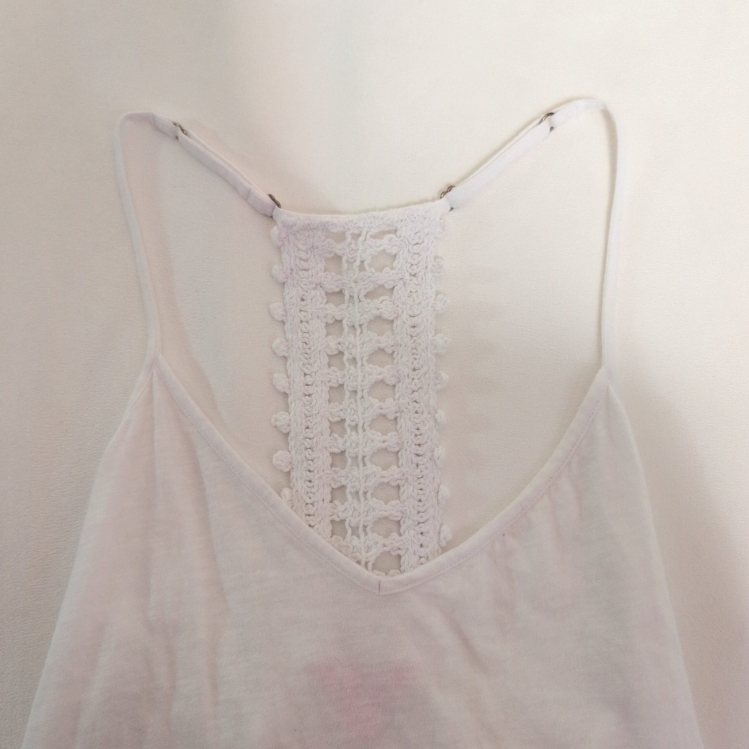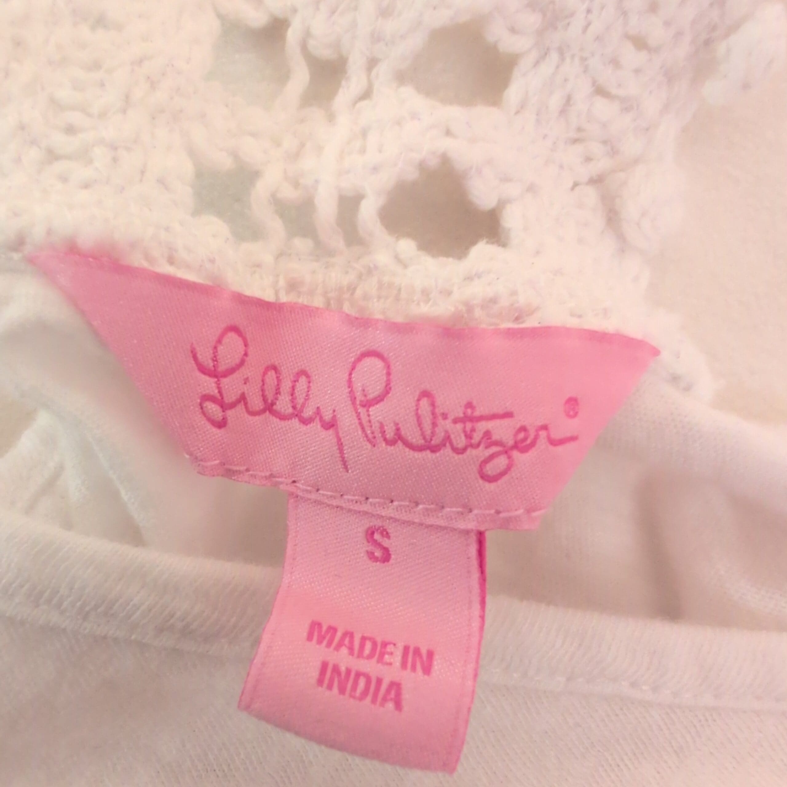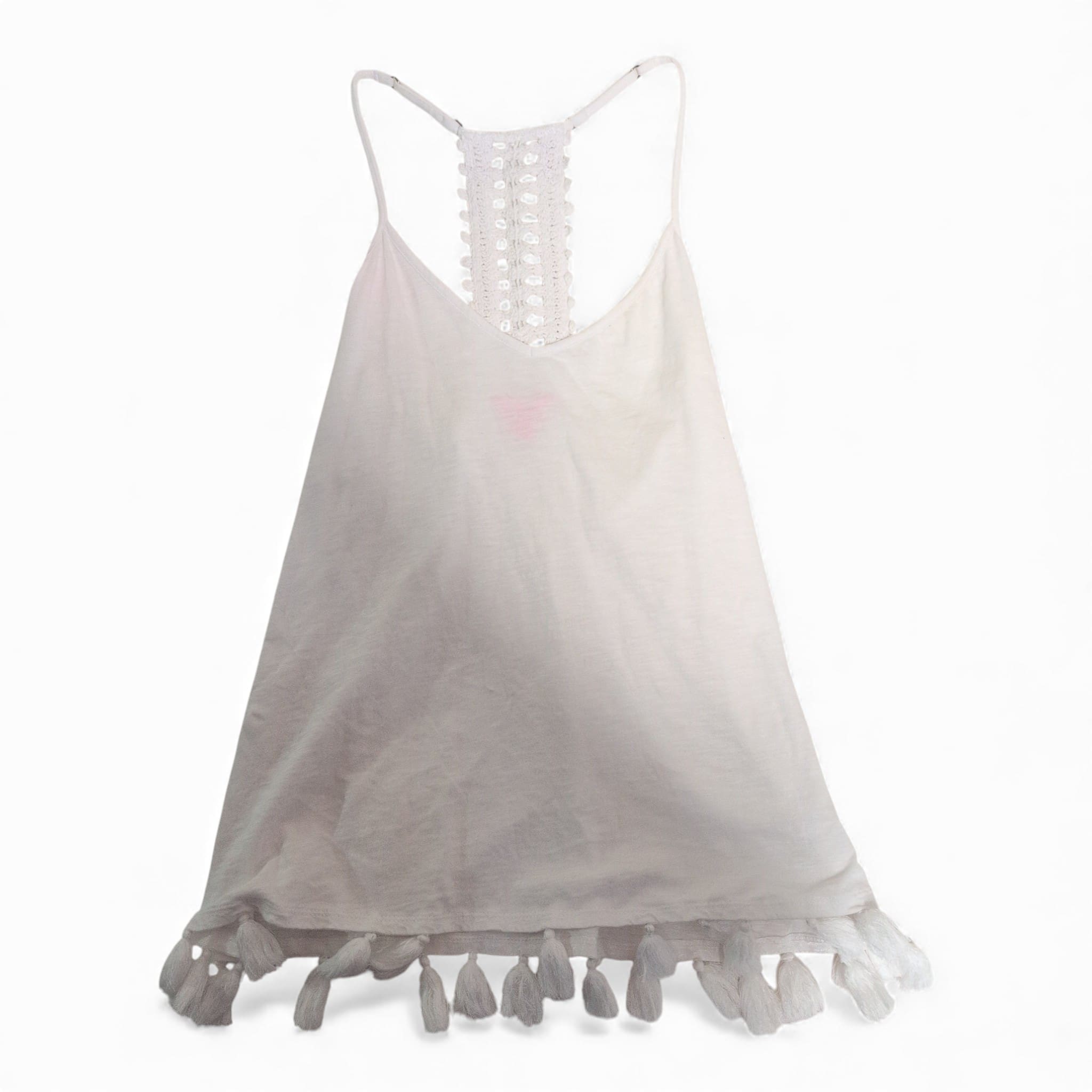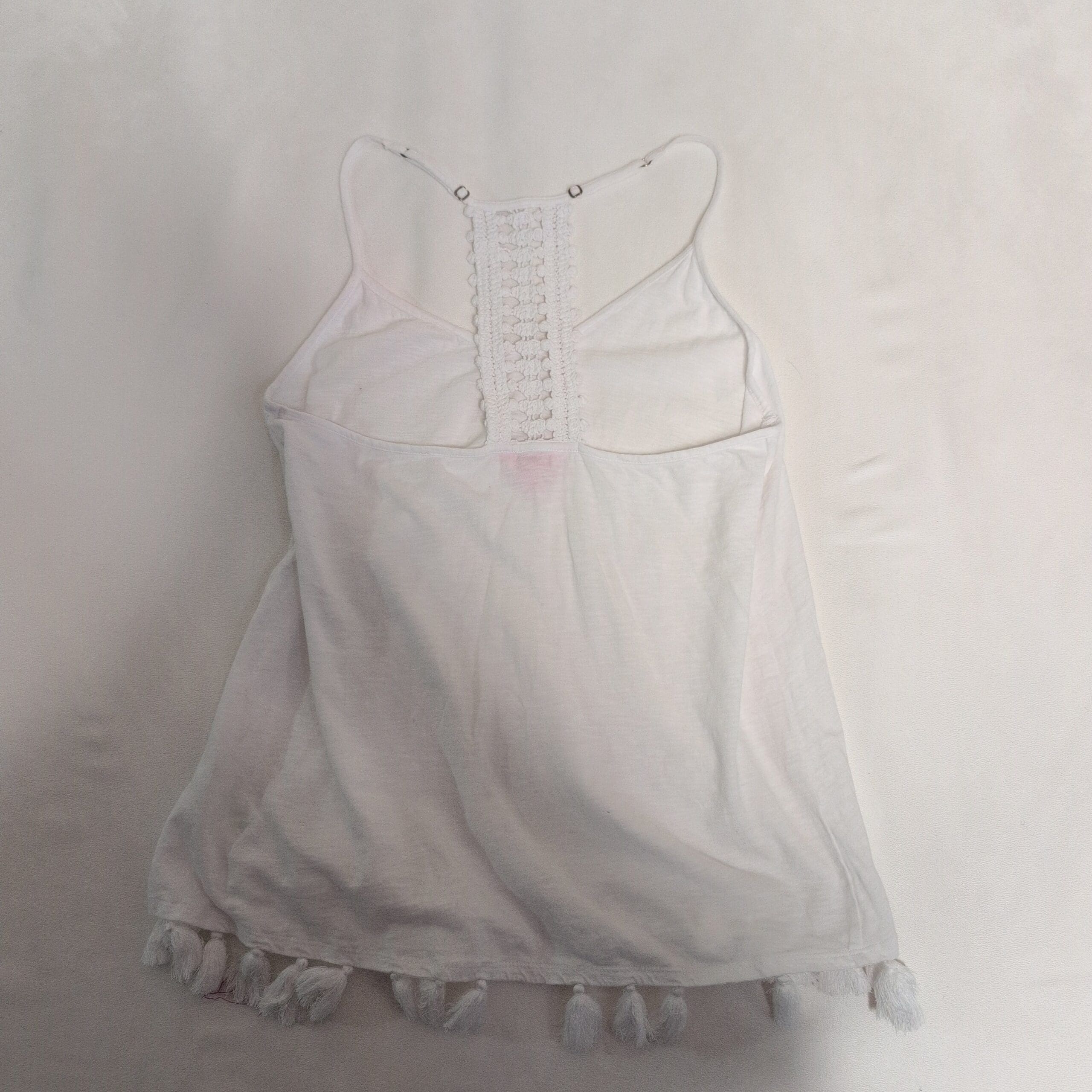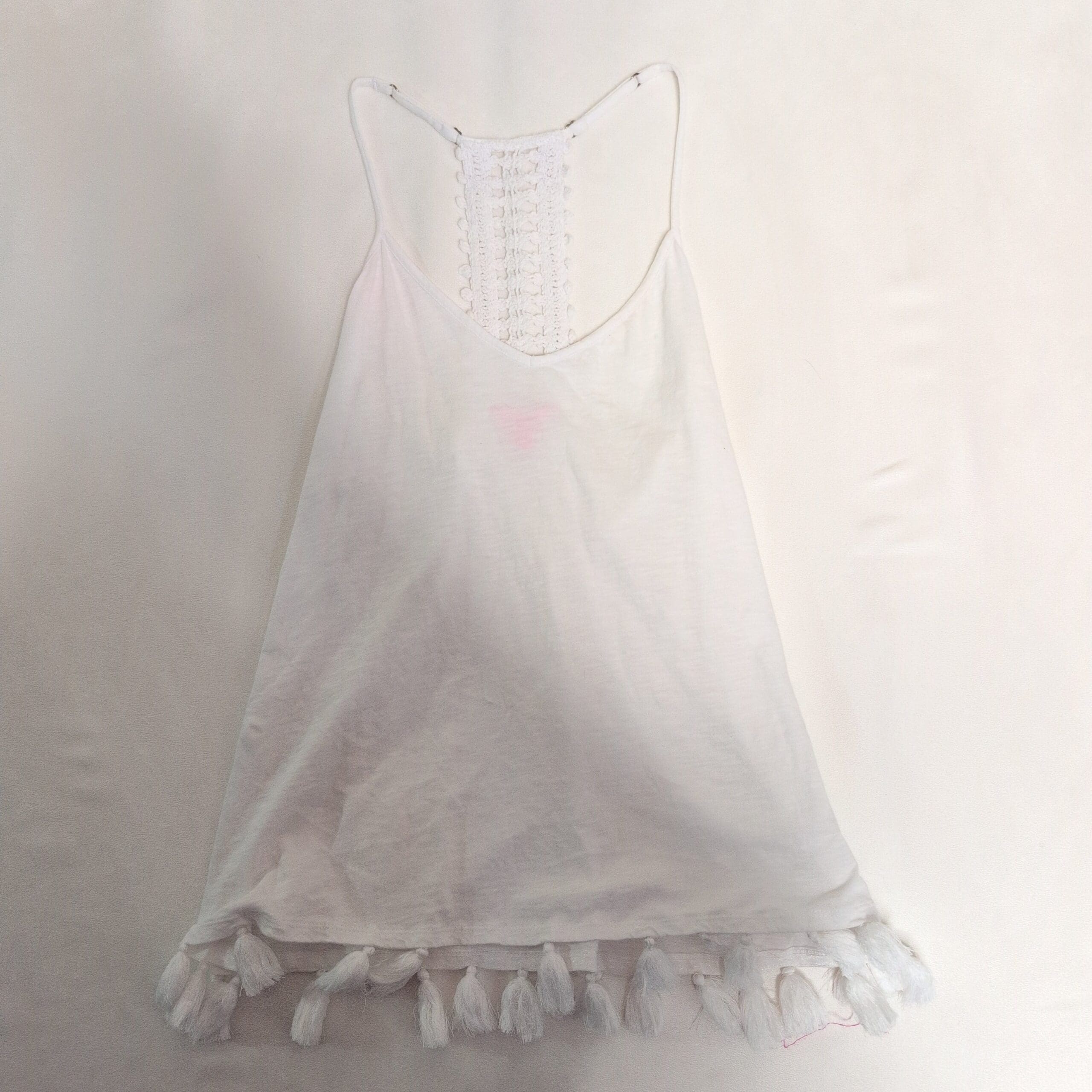 Lilly Pulitzer women’s white camisole in size S. Flirty tassel hem and crochet racerback add a boho-chic touch to a simple shell — great layered or worn on its own for summer. Soft, lightweight feel and a flattering A-line cut. Pre-owned — shows light wear with a faint pink stain on the front (visible in photos). Crochet panel and tassels are intact; a couple tassels may be slightly frayed. No holes or large tears noted. Please review photos closely and message with any questions; measurements were not provided.