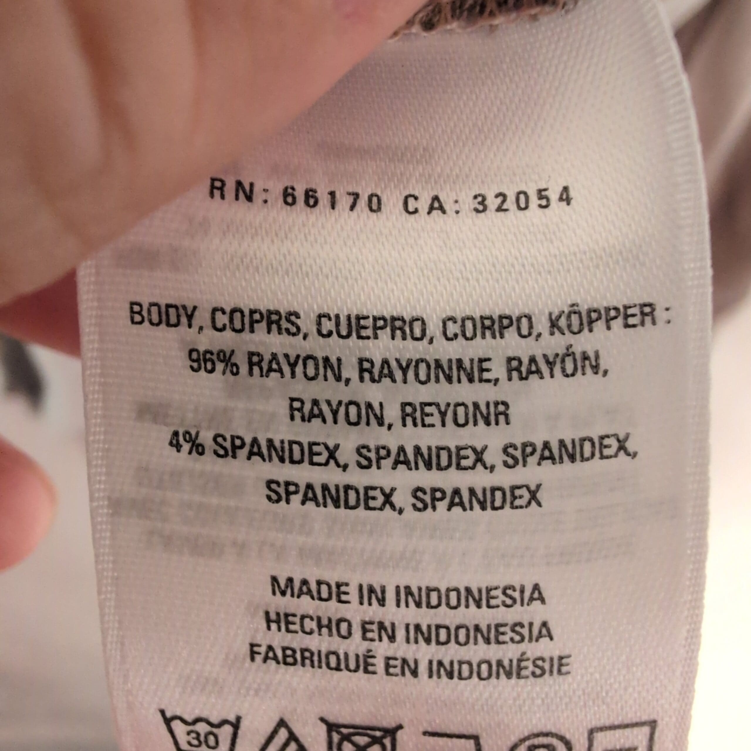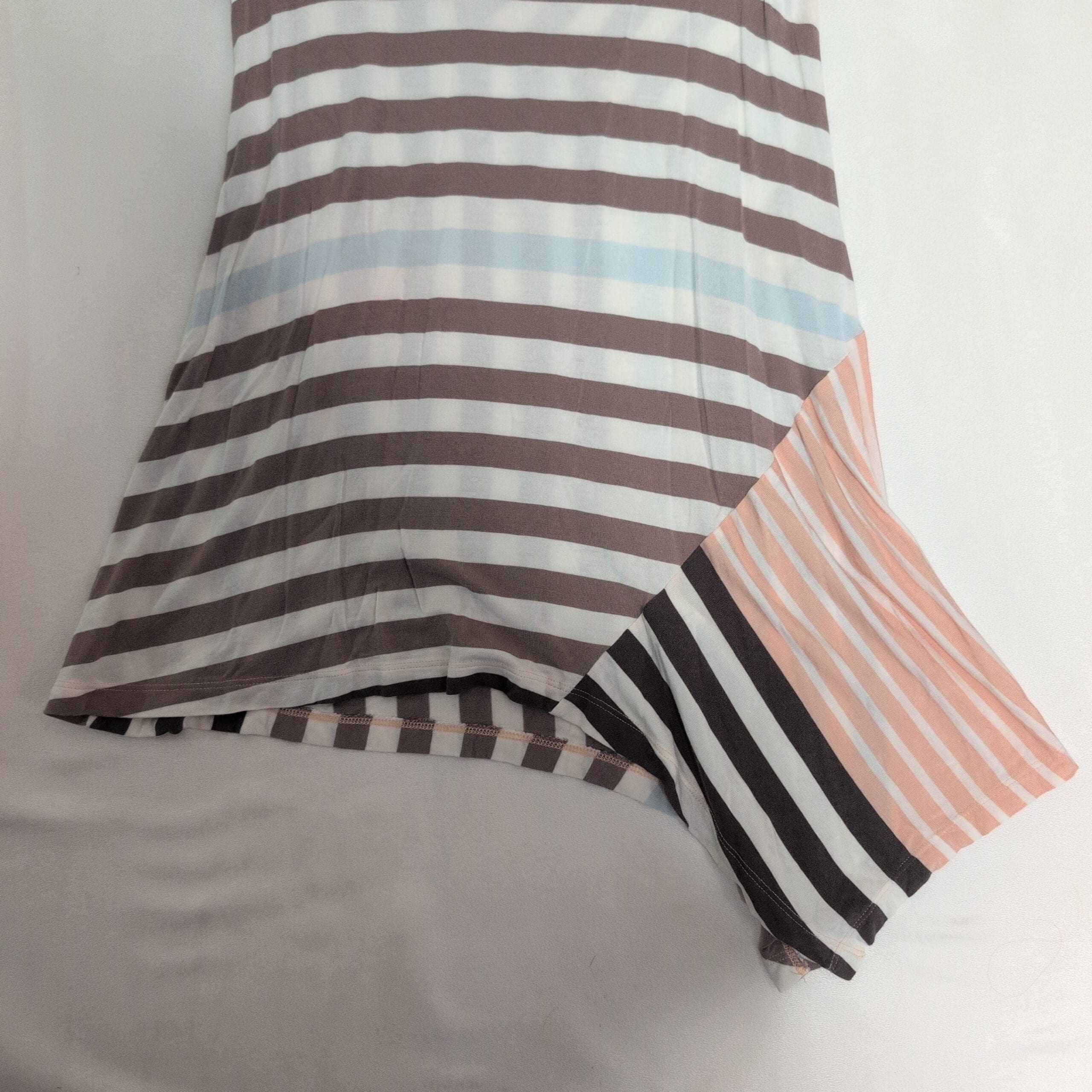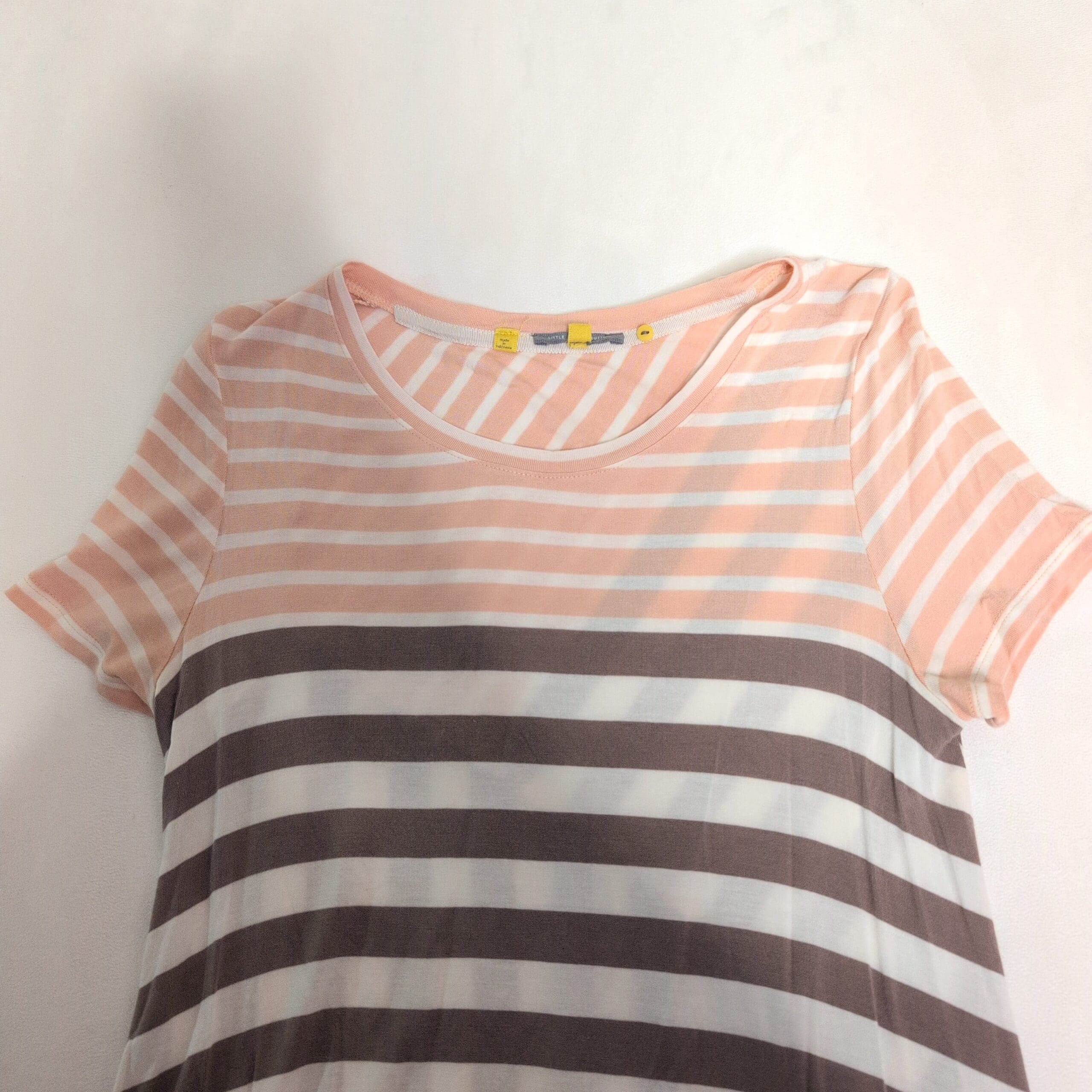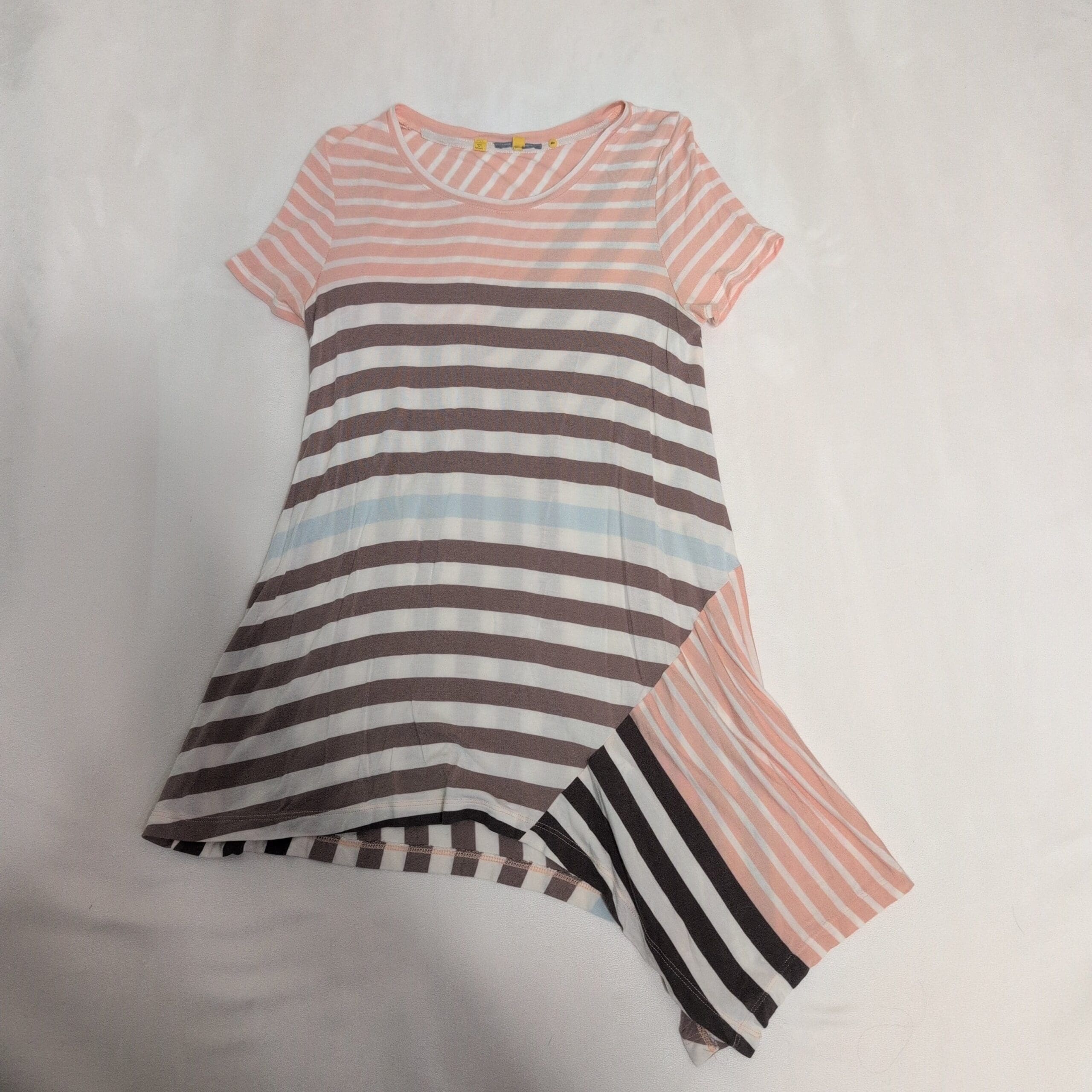 Little Yellow Button women’s tunic in size XS. Lightweight, short-sleeve scoop neck with horizontal stripes in brown, white, blush pink and pale blue. A-line swing silhouette with an asymmetrical hem panel for a flattering, casual look — great over leggings or skinny jeans. Fits like a standard XS; no measurements provided.