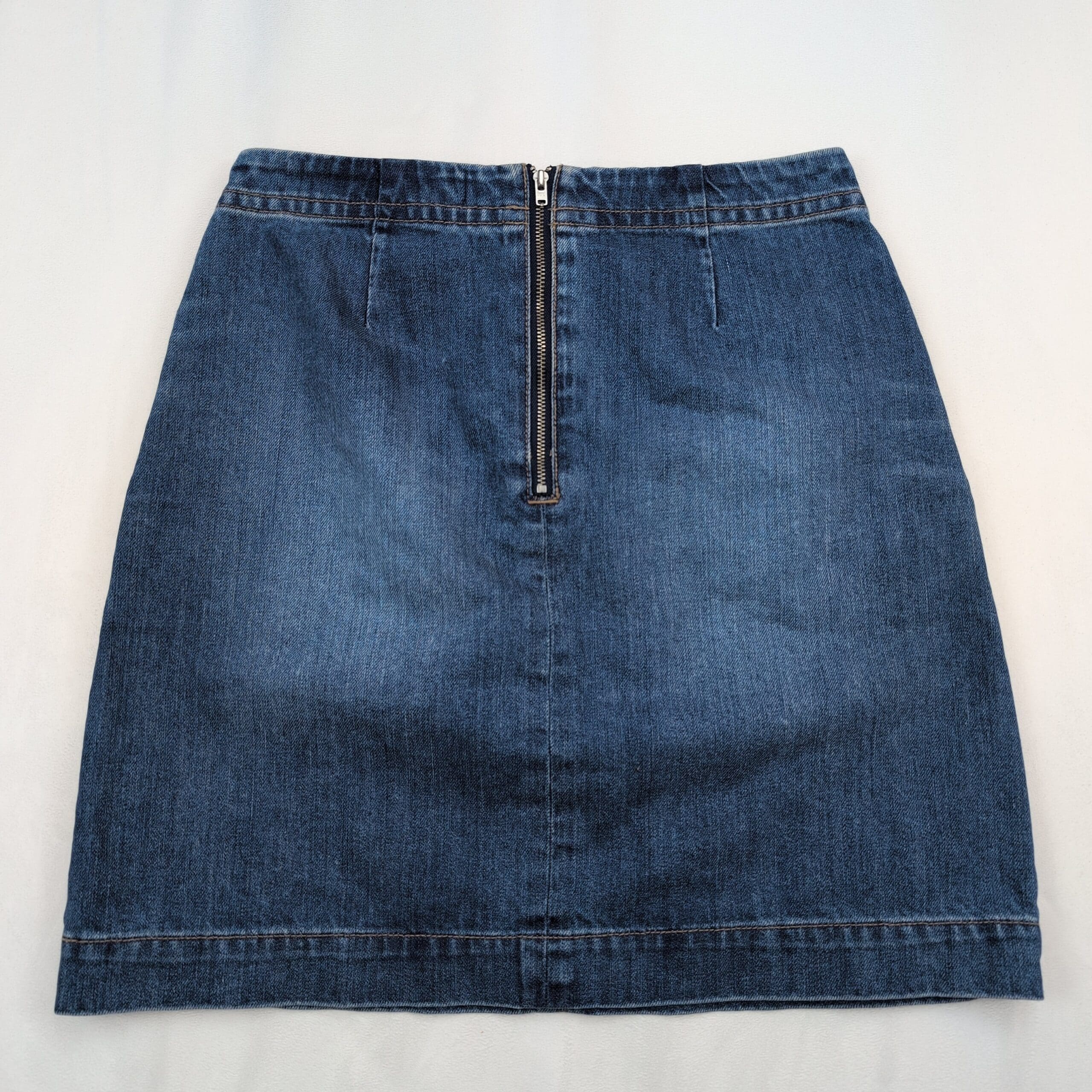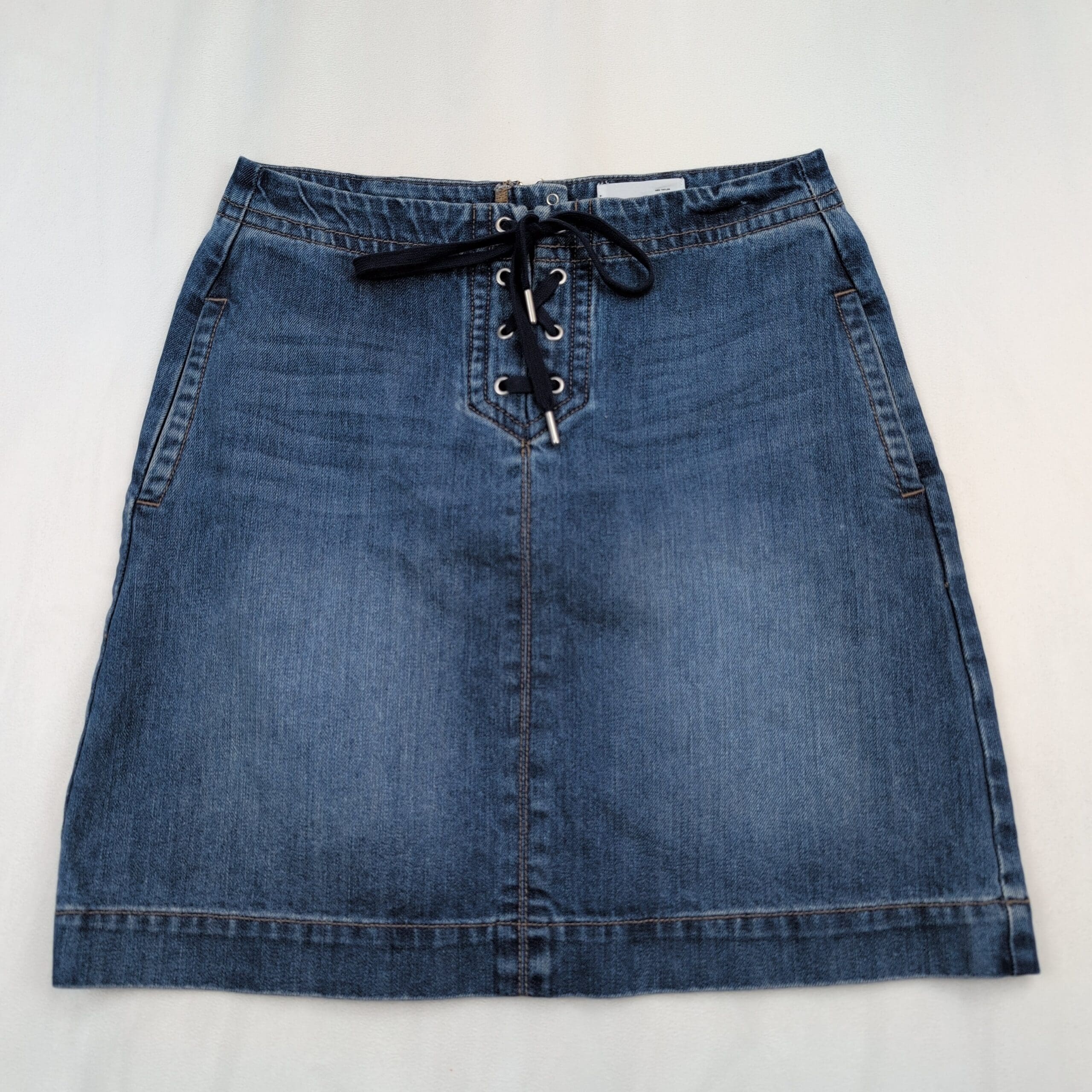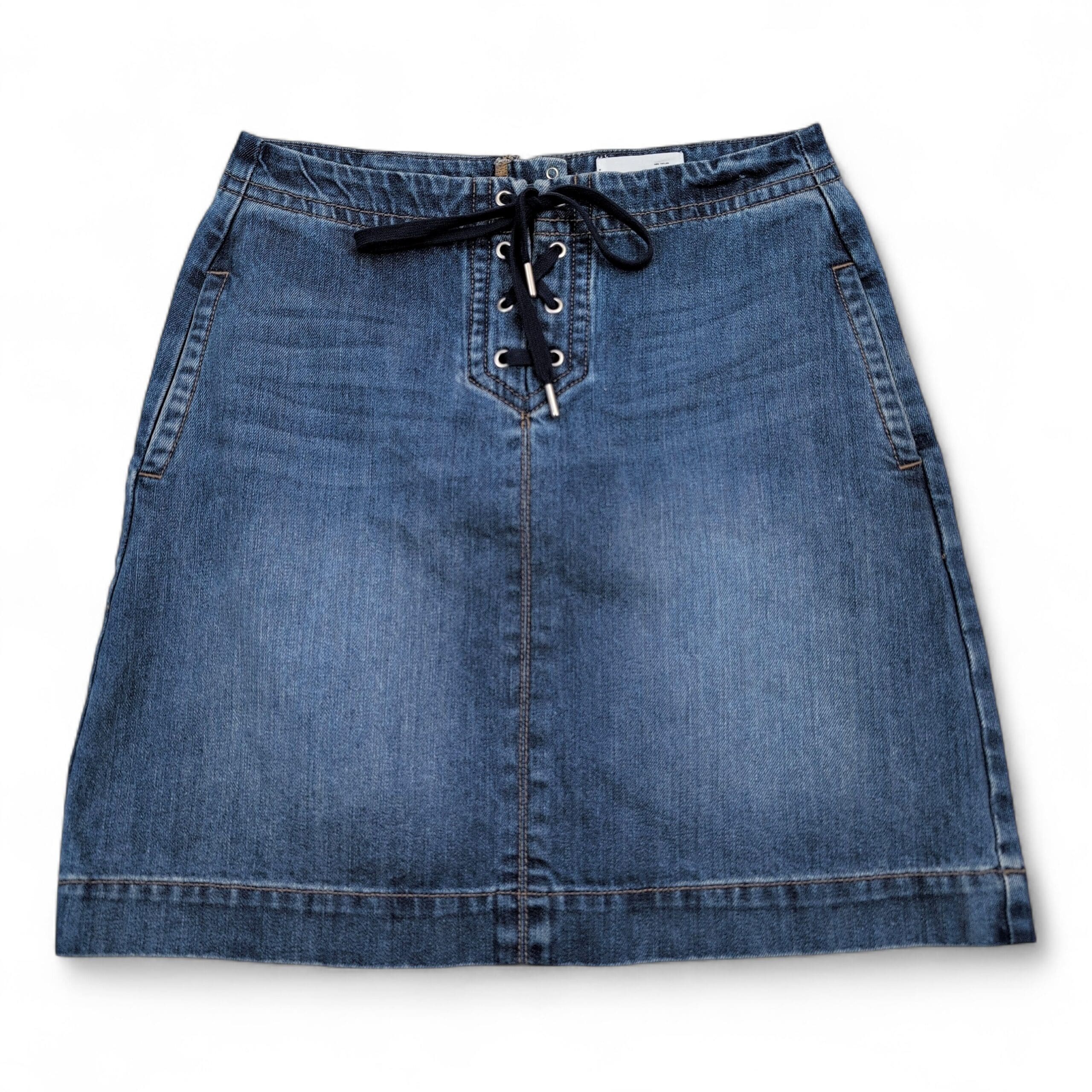 LOFT denim skirt in women’s size 2. A flattering A-line silhouette with a lace-up front and metal grommet detail for a modern, casual look. Medium indigo wash with subtle lived-in fading, front side pockets, and topstitched hem. Excellent used condition — free of major rips, tears, stains, or flaws; typical light wear may be present.