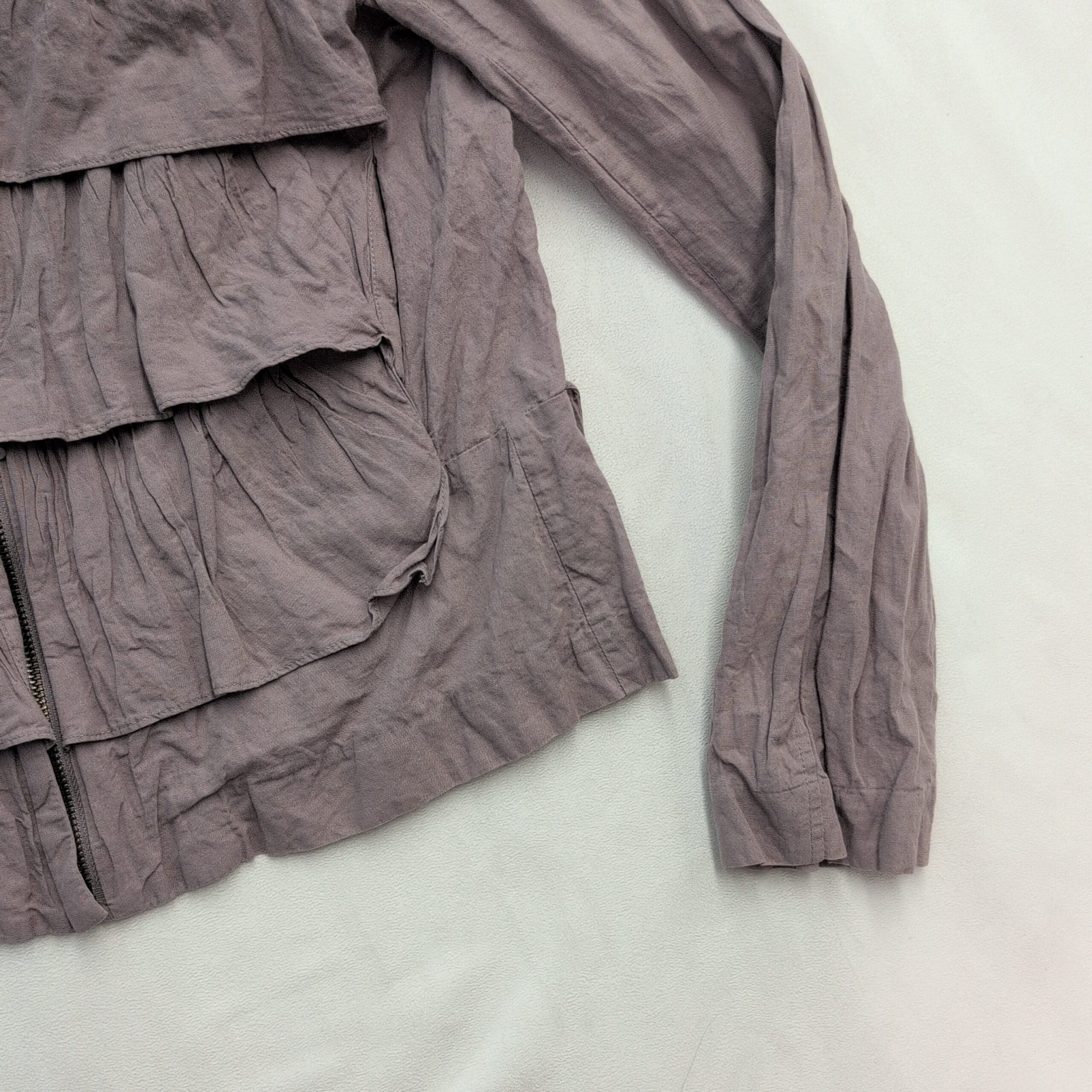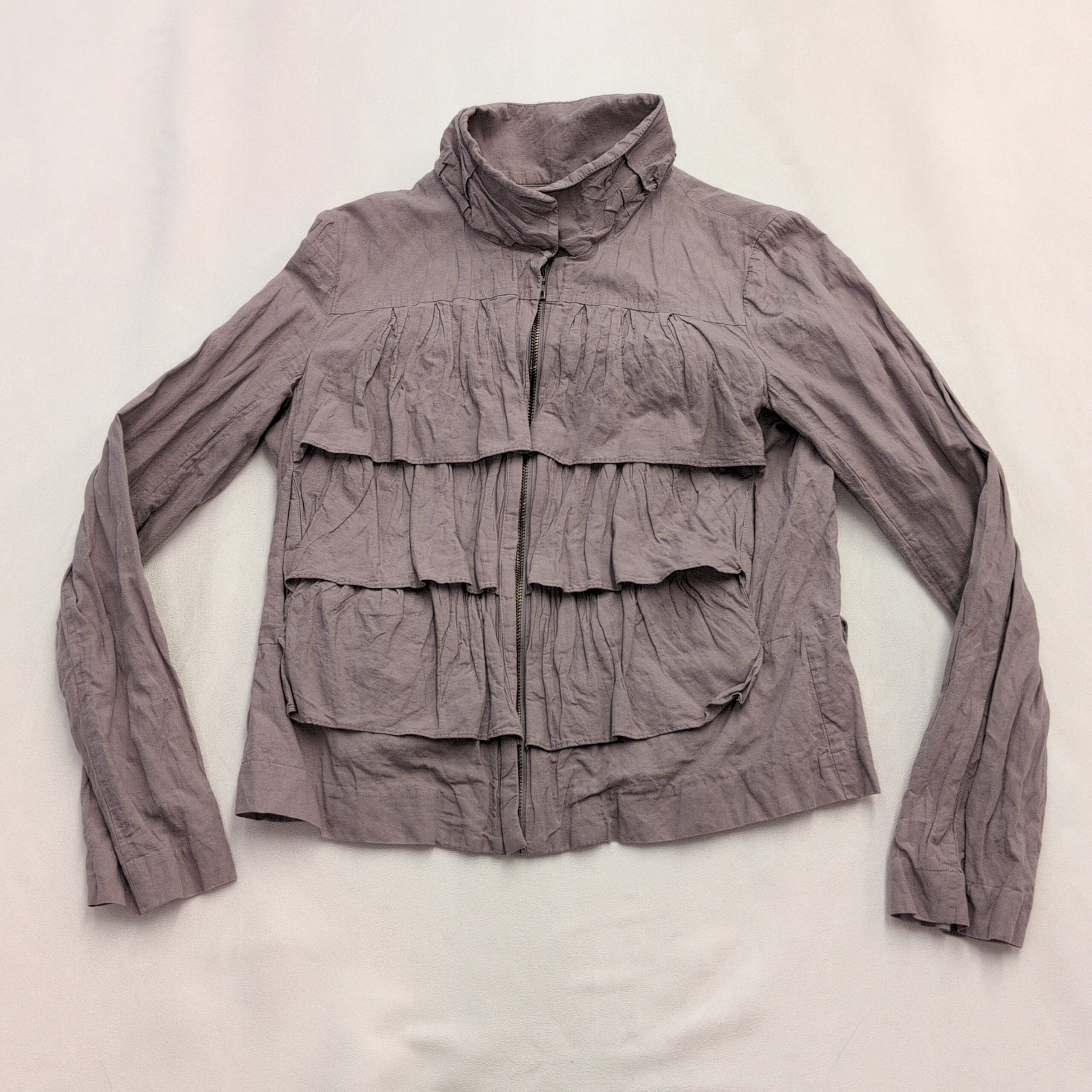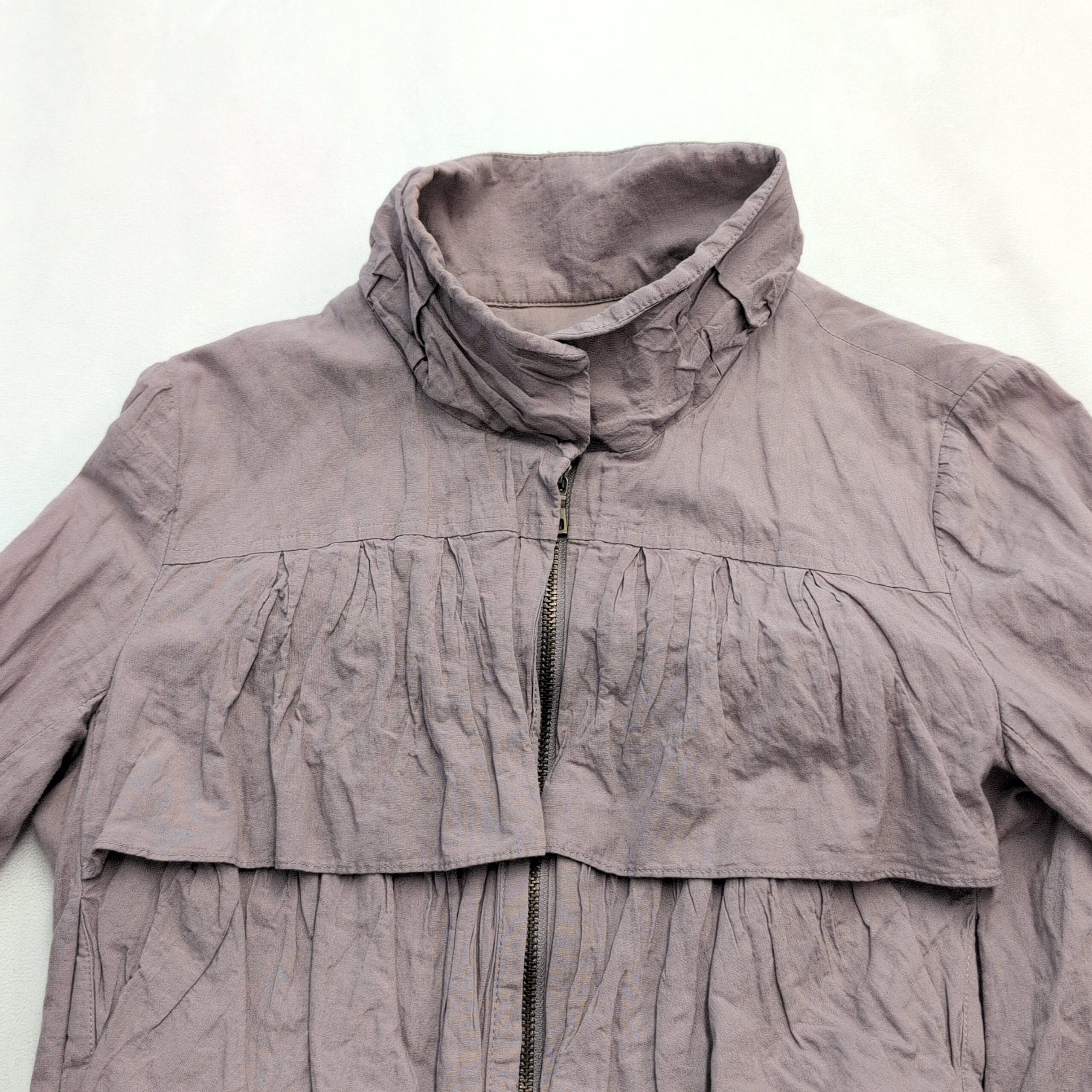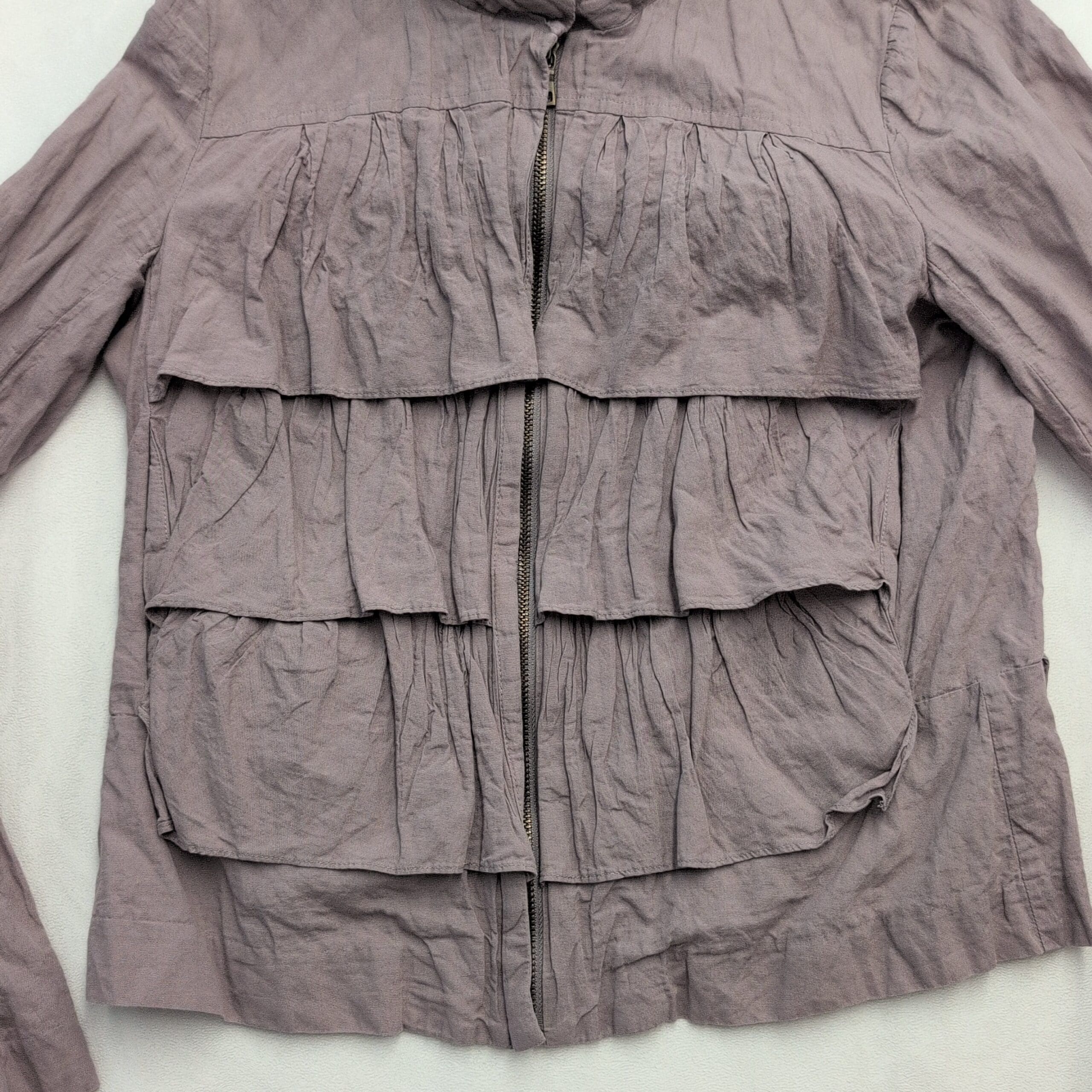 LOFT women’s cotton zip-front jacket in a soft mauve/lavender tone. Features layered ruffle tiers across the front, a stand collar, long sleeves, and a full zipper closure. Lightweight cotton with a relaxed, slightly textured look — a feminine, versatile layering piece. Excellent used condition with no major rips, tears, or stains; typical light wear may be present. Quality note: some discoloration on the inside of the neckline as shown in photos. Size 6 (standard).
