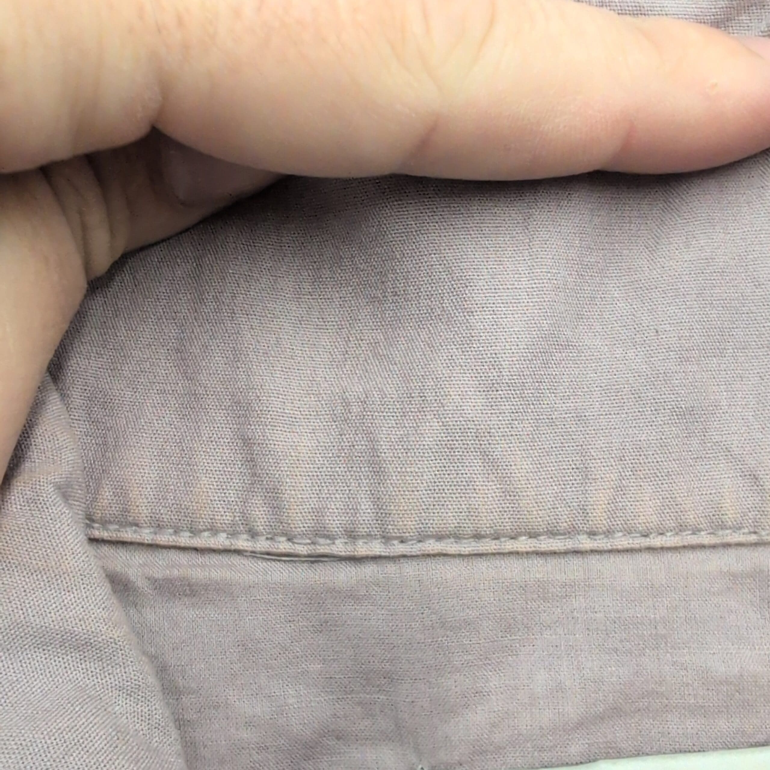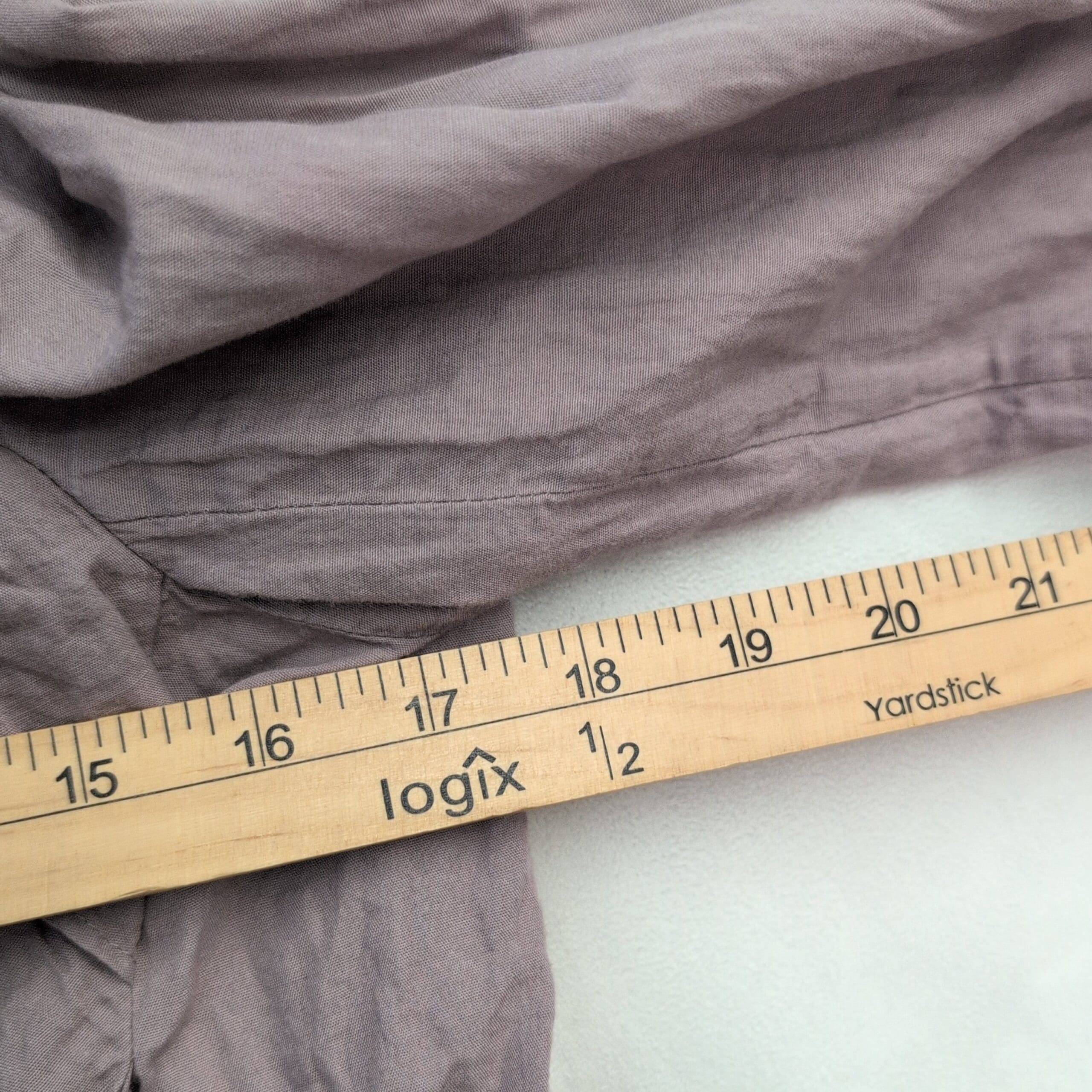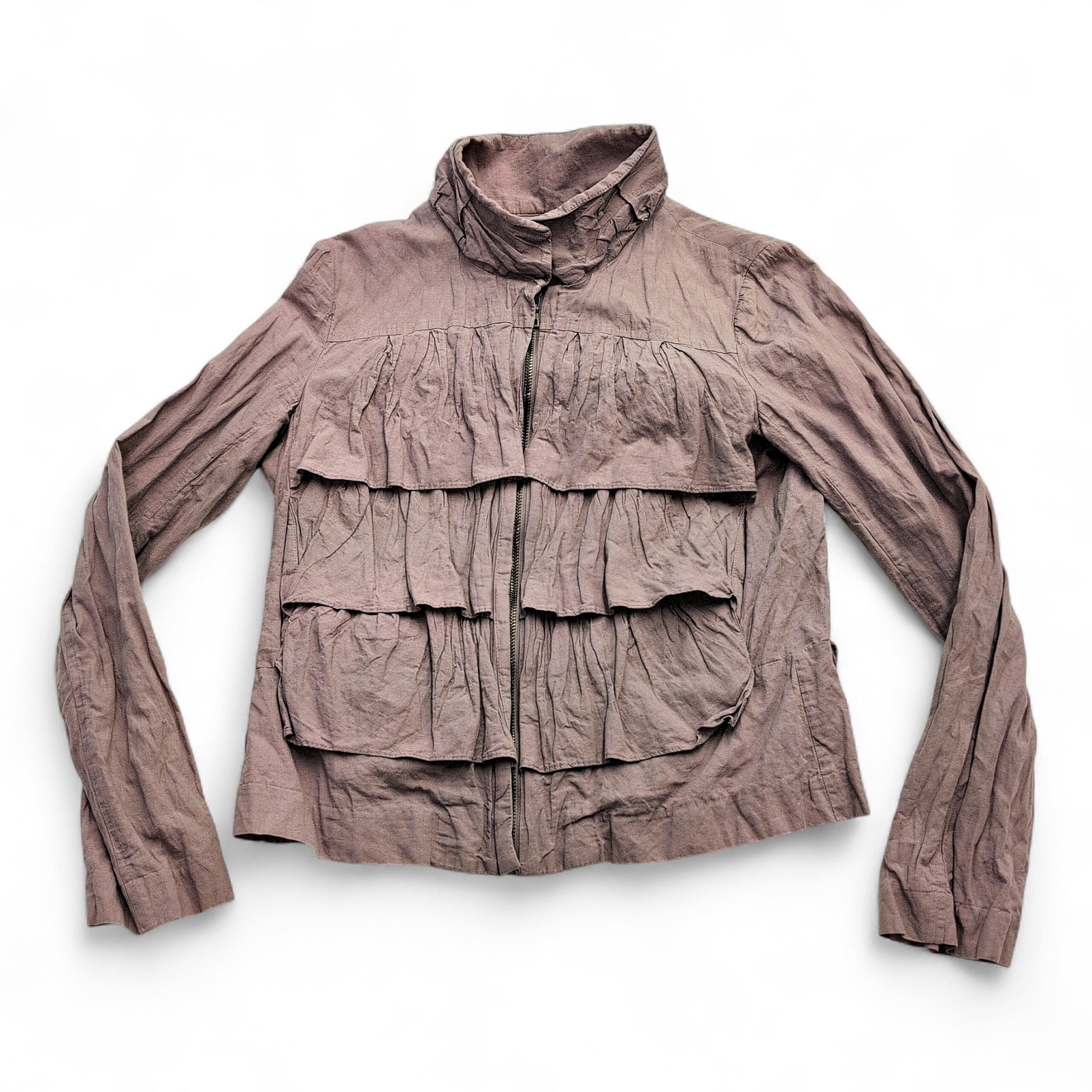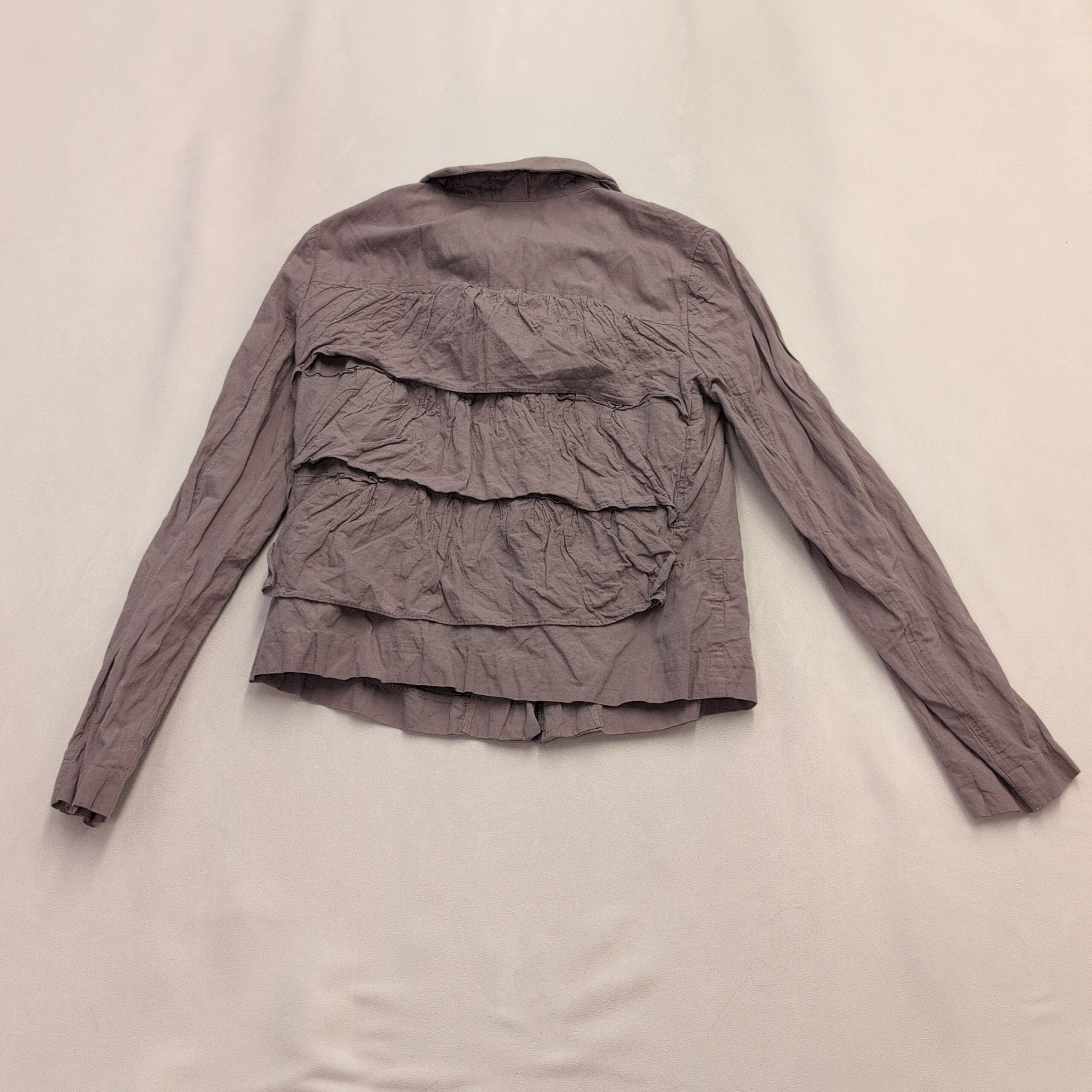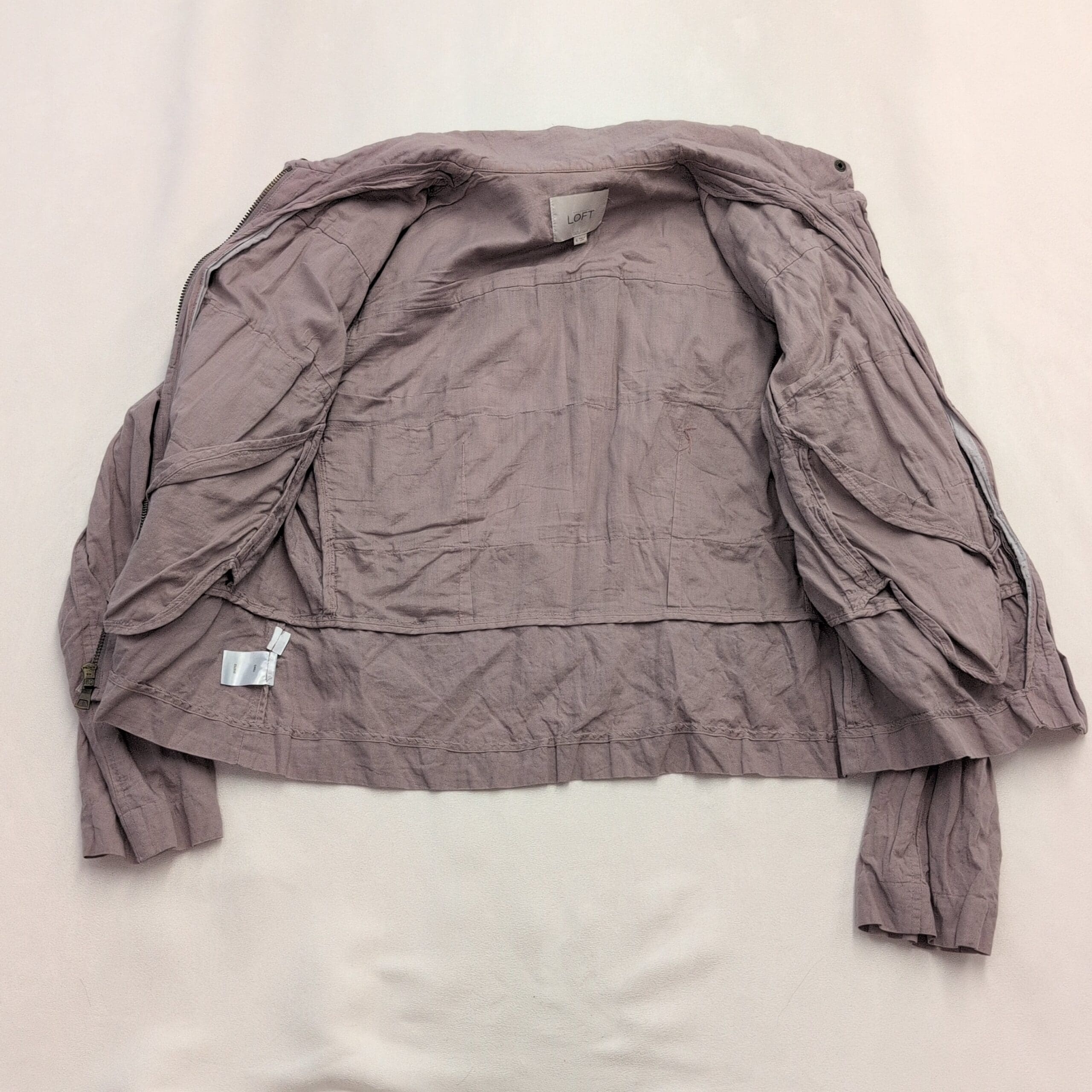 LOFT women’s cotton zip-front jacket in a soft mauve/lavender tone. Features layered ruffle tiers across the front, a stand collar, long sleeves, and a full zipper closure. Lightweight cotton with a relaxed, slightly textured look — a feminine, versatile layering piece. Excellent used condition with no major rips, tears, or stains; typical light wear may be present. Quality note: some discoloration on the inside of the neckline as shown in photos. Size 6 (standard).
