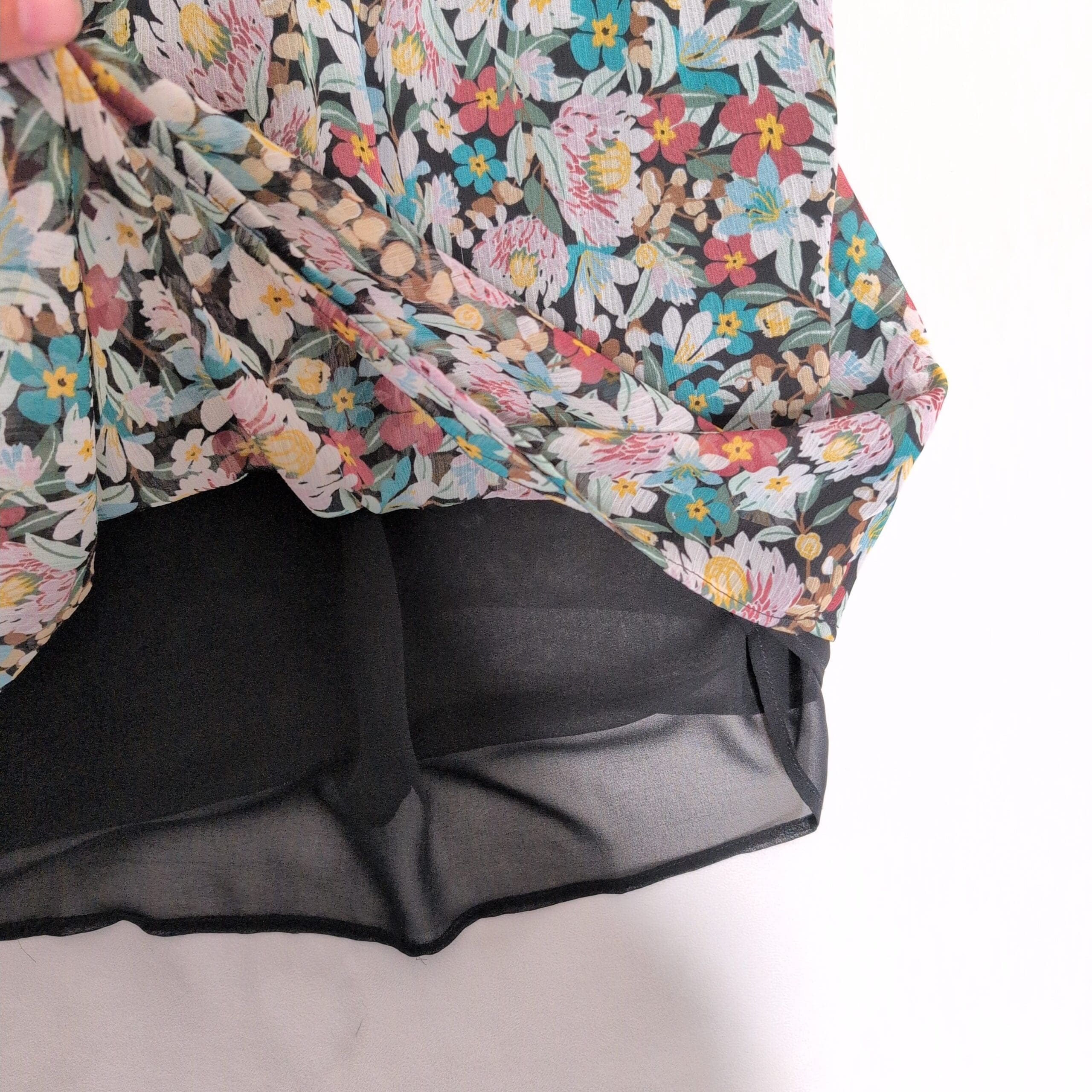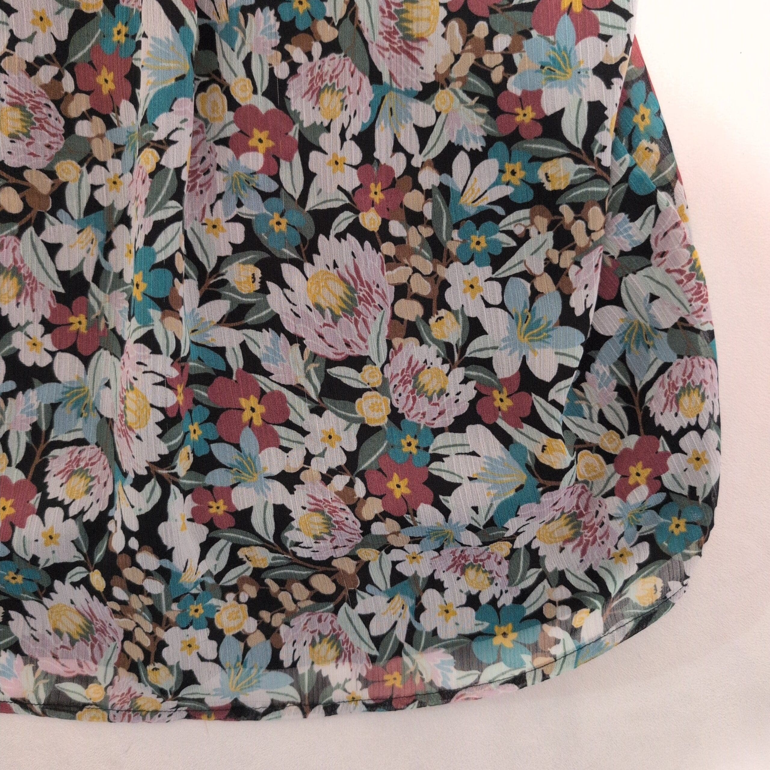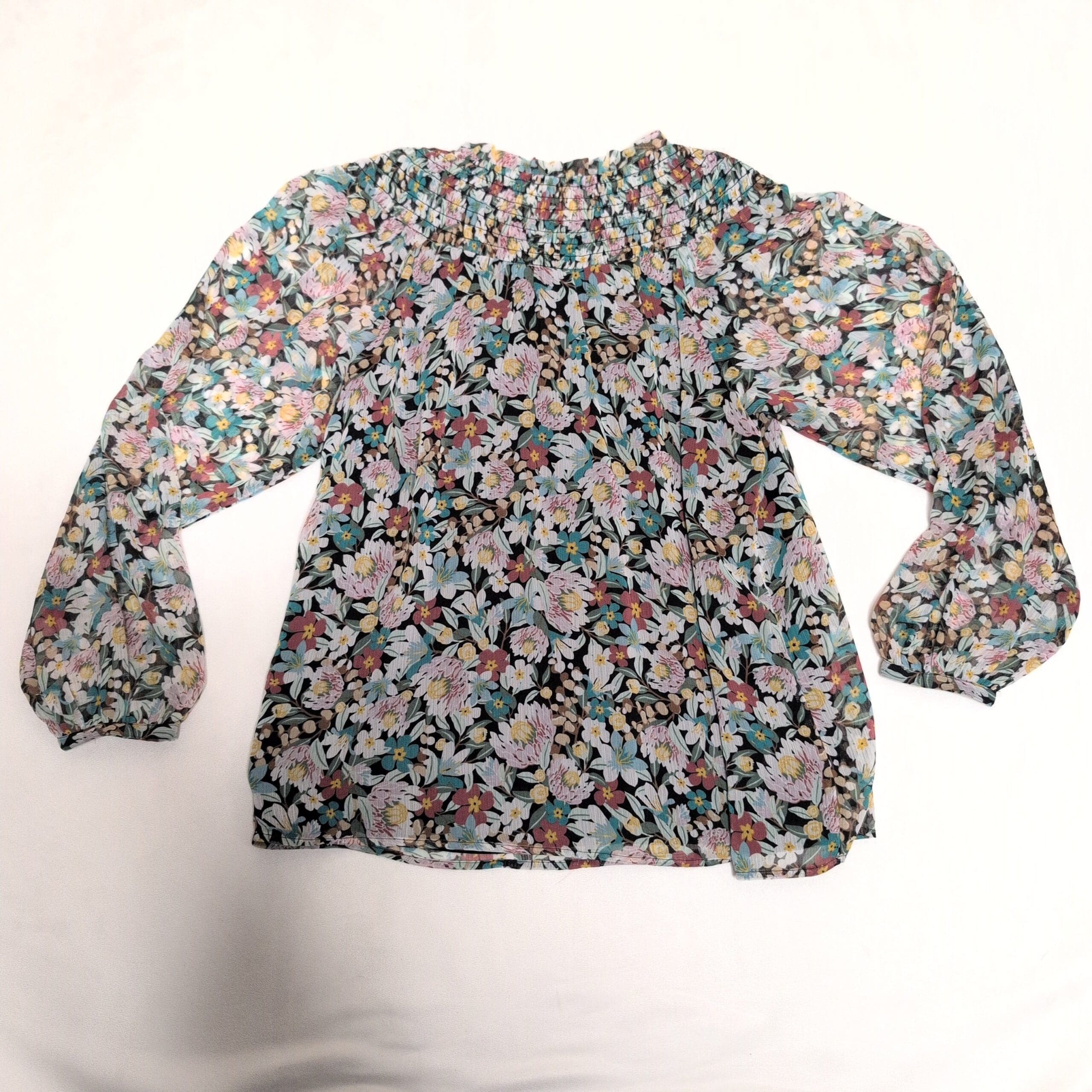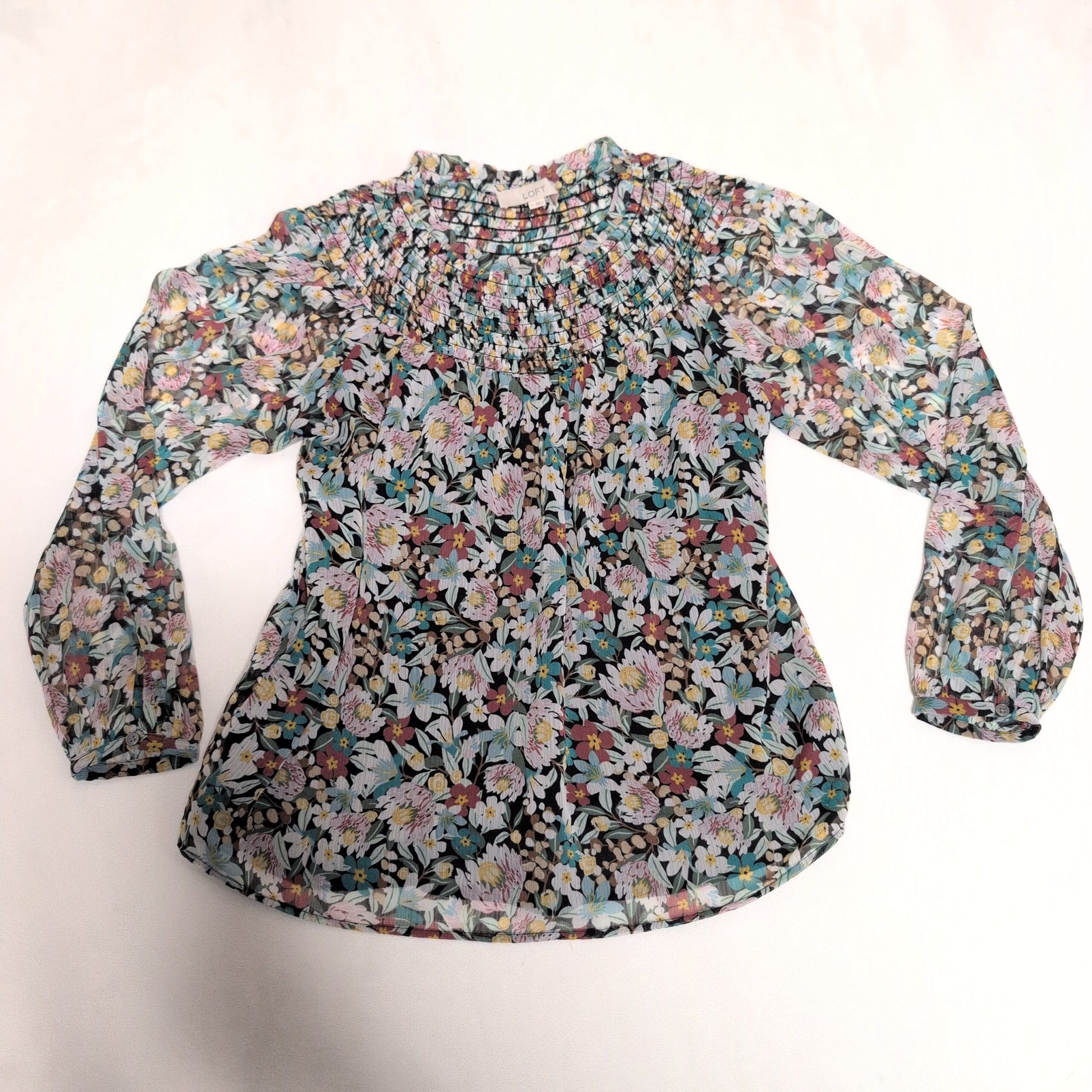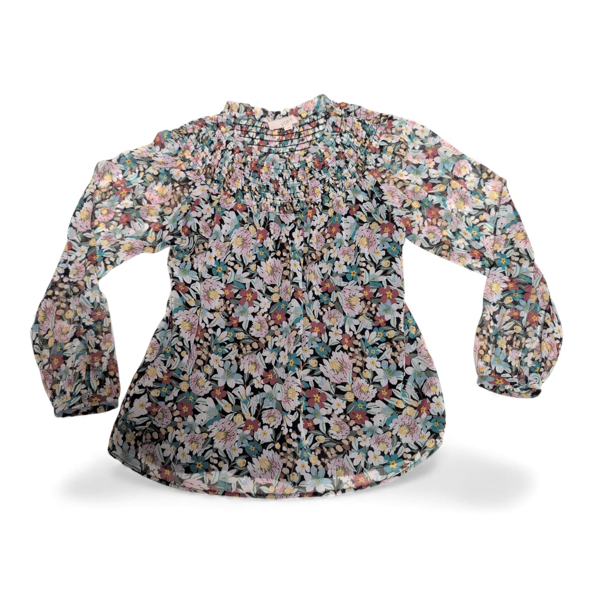 LOFT women’s floral blouse in green tones, size S. Features a smocked yoke with gentle gathers, long sheer sleeves with elastic cuffs, and a relaxed, slightly A-line body with a curved hem. Lightweight and airy — perfect layered over a cami for work or weekend styling. Colors include green, teal, lavender and soft yellow on a darker base. Pre-owned and clean; ready to wear.