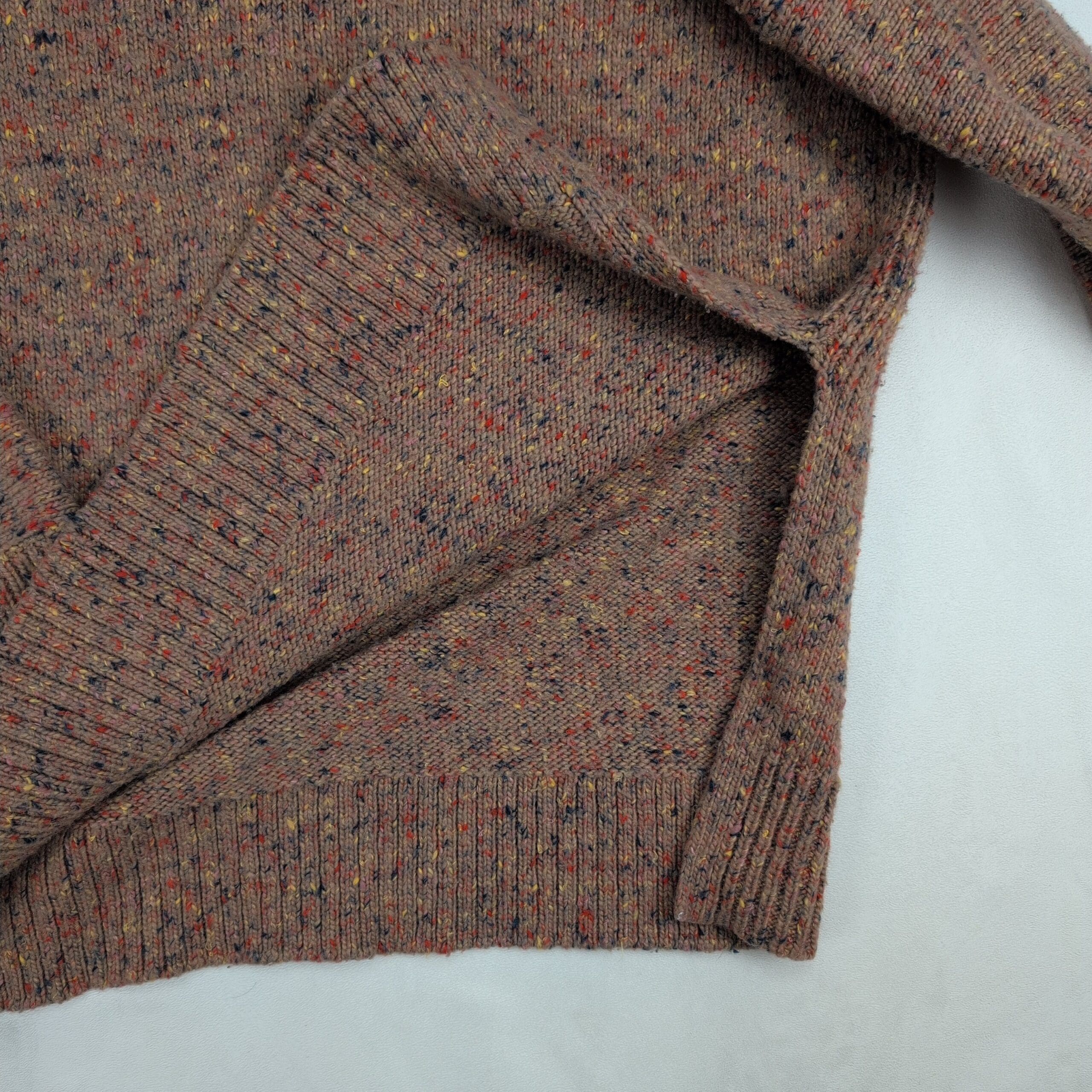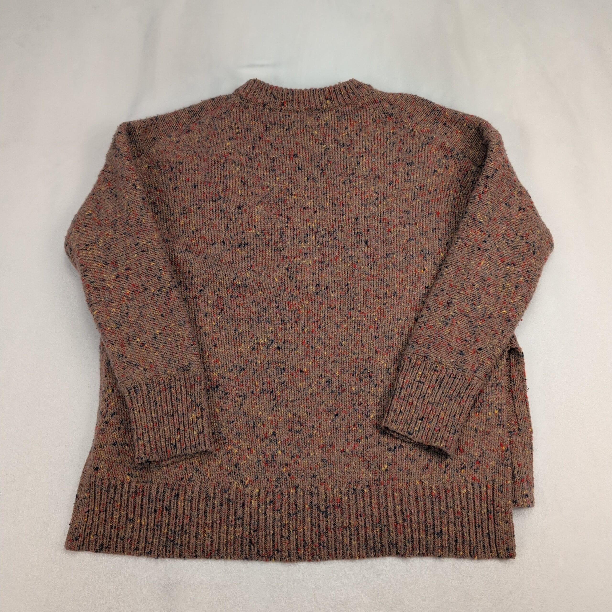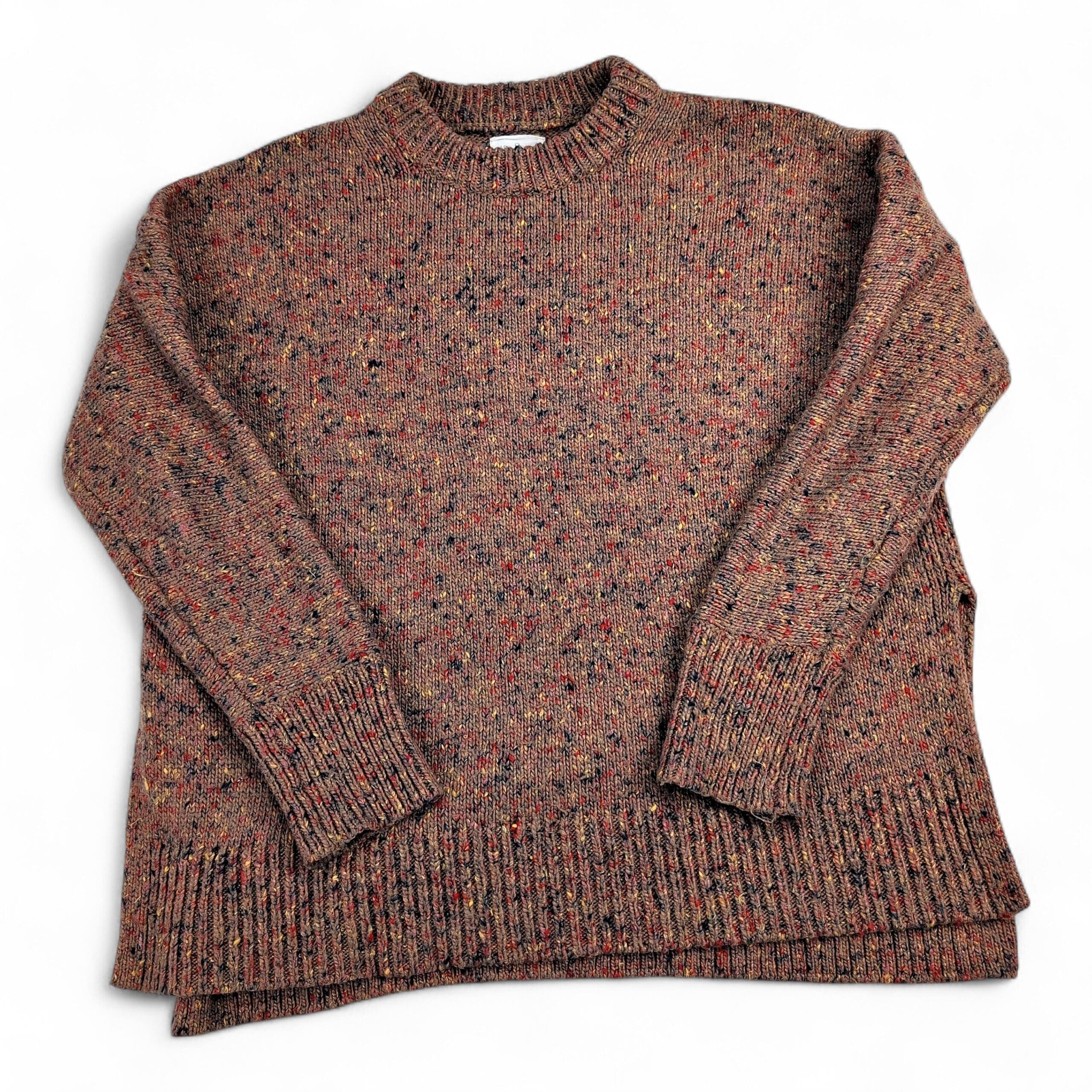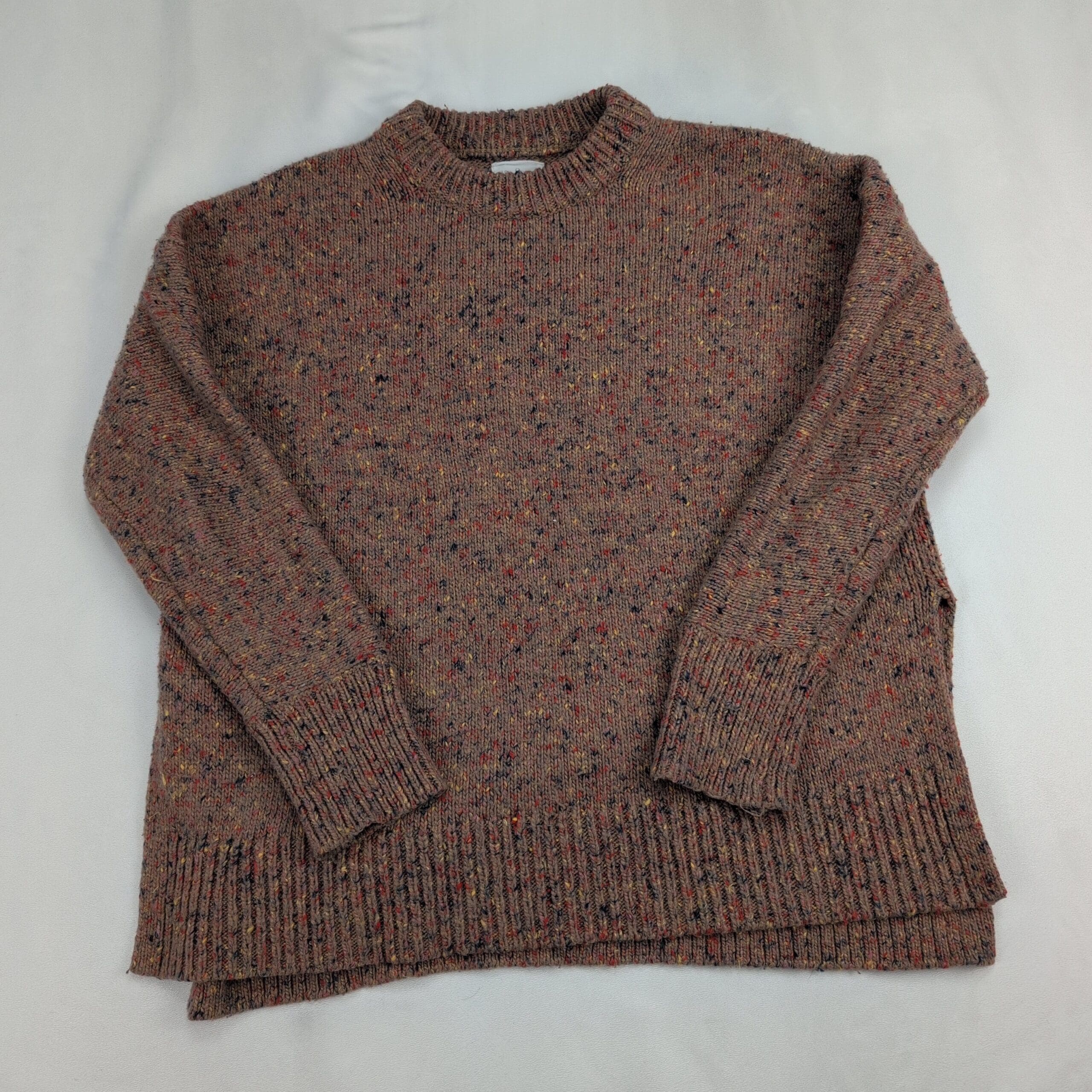 Lou & Grey women’s flecked crewneck sweater in size M. Cozy relaxed knit with a classic crew neckline, long sleeves, ribbed cuffs and hem, and subtle side slits for easy layering. Warm heathered brown base with multicolor speckled flecks for a textured, vintage-inspired look.