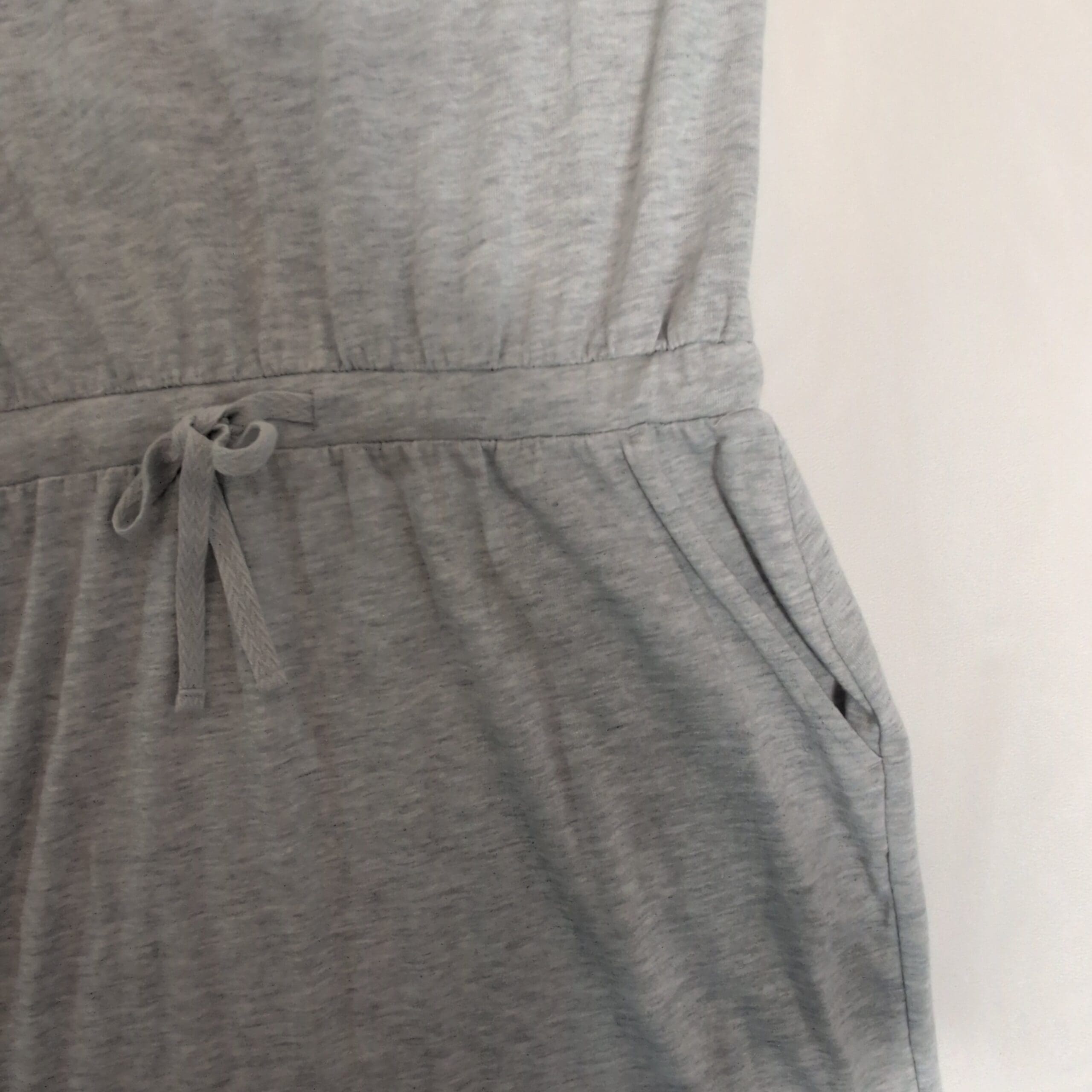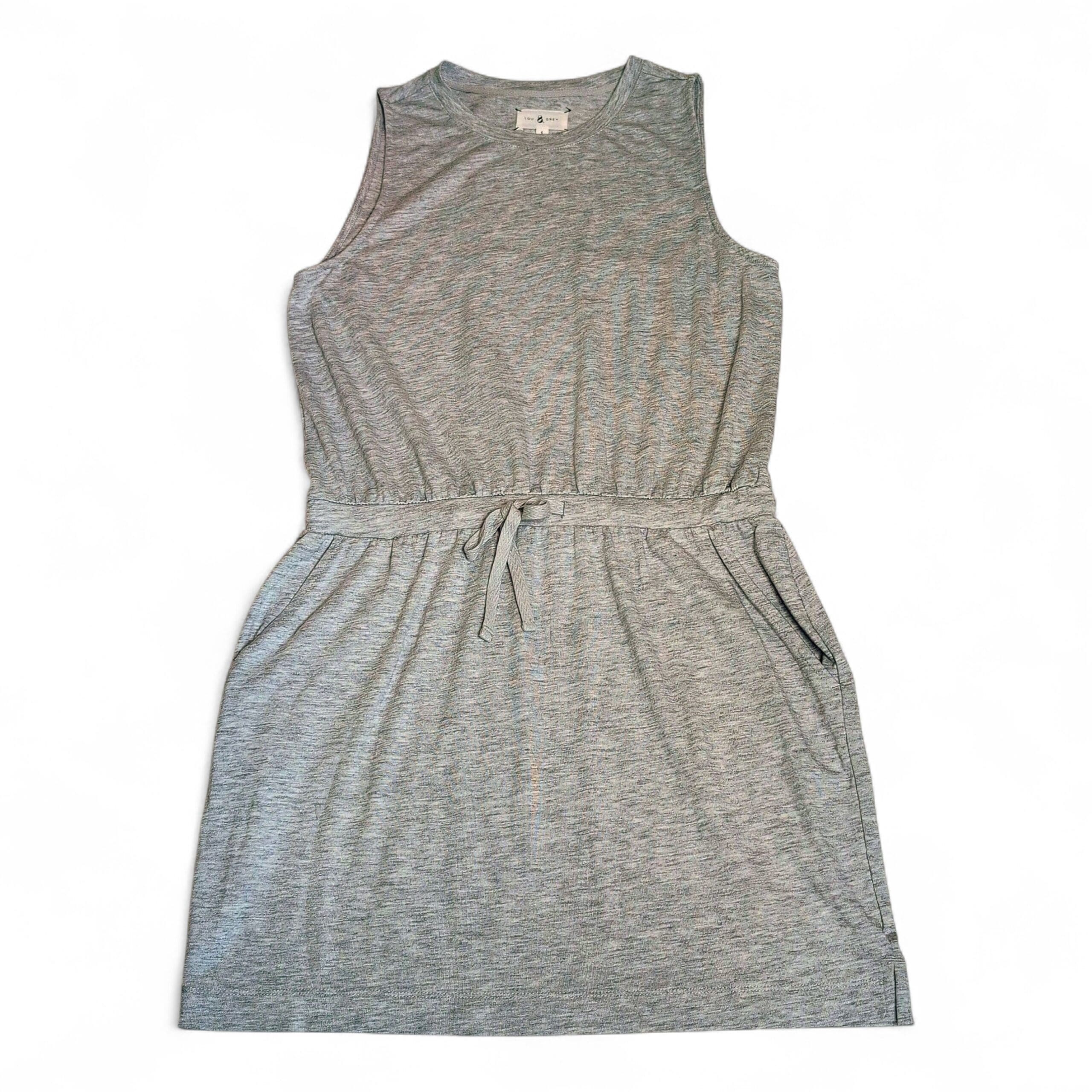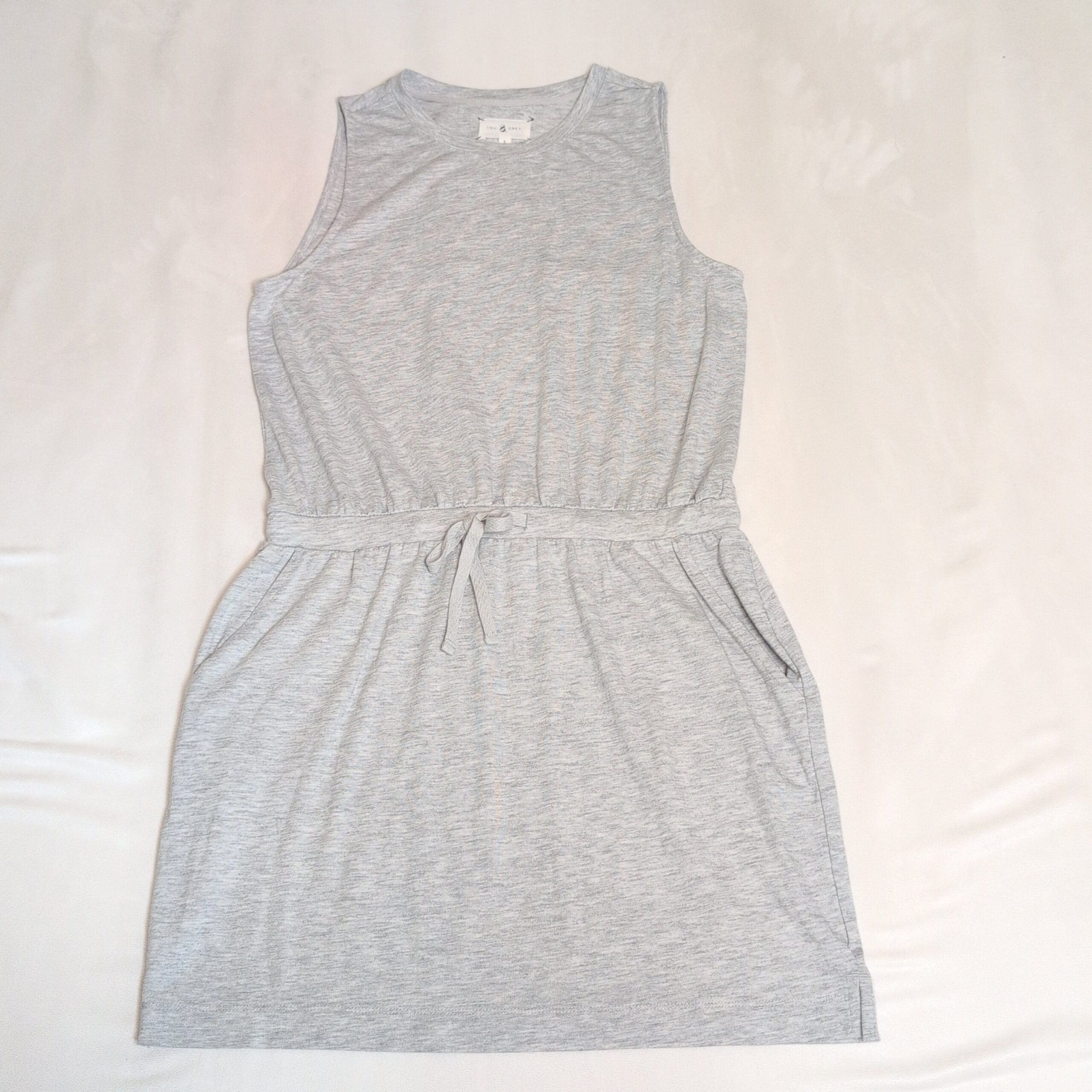 Relaxed sleeveless Lou & Grey dress in soft heather gray with a drawstring waist and side pockets for everyday comfort and easy styling. Casual jersey drape creates a lightly gathered waist for a flattering silhouette. Size: S (standard). Color: Gray. Great for errands, travel, or layering with a denim jacket or cardigan.