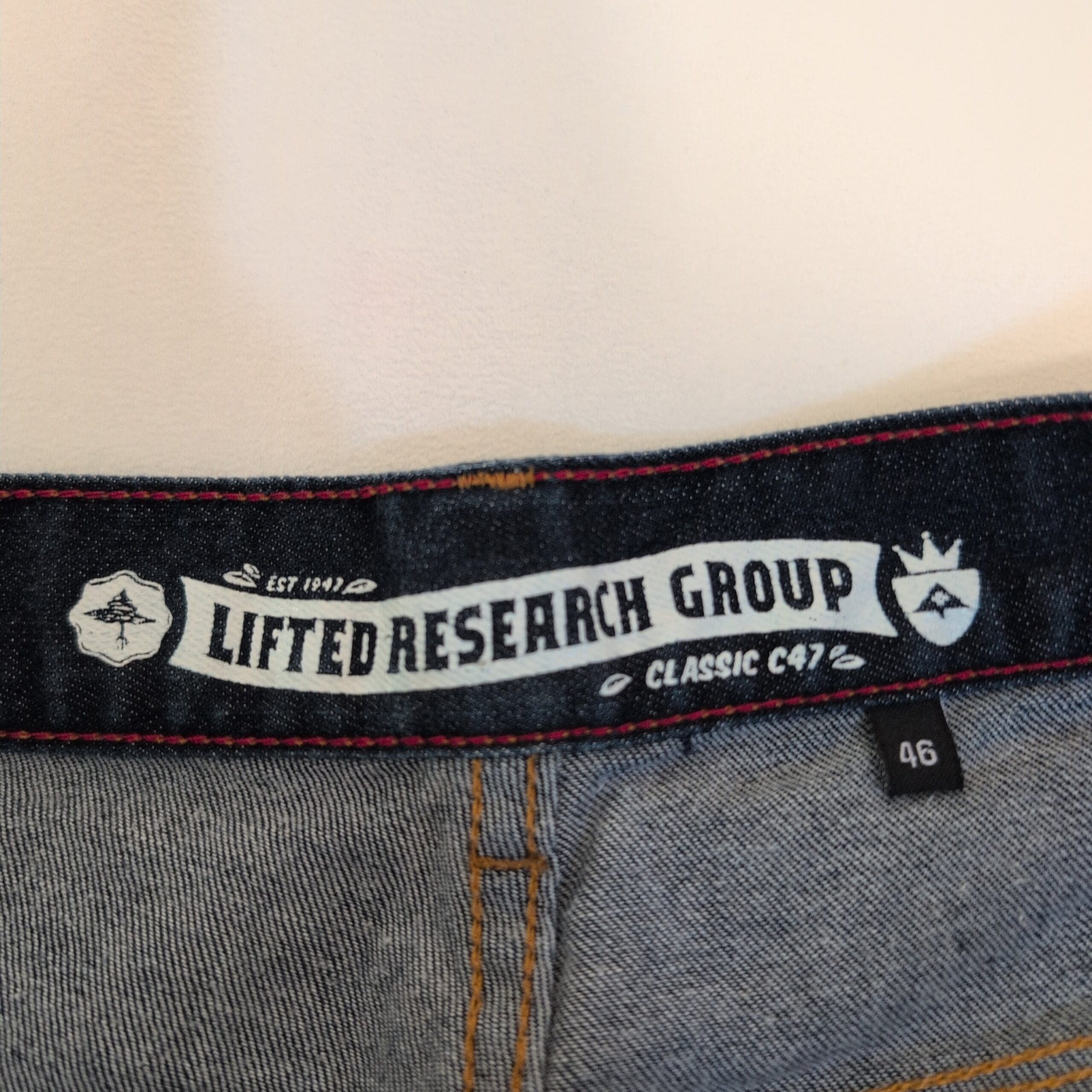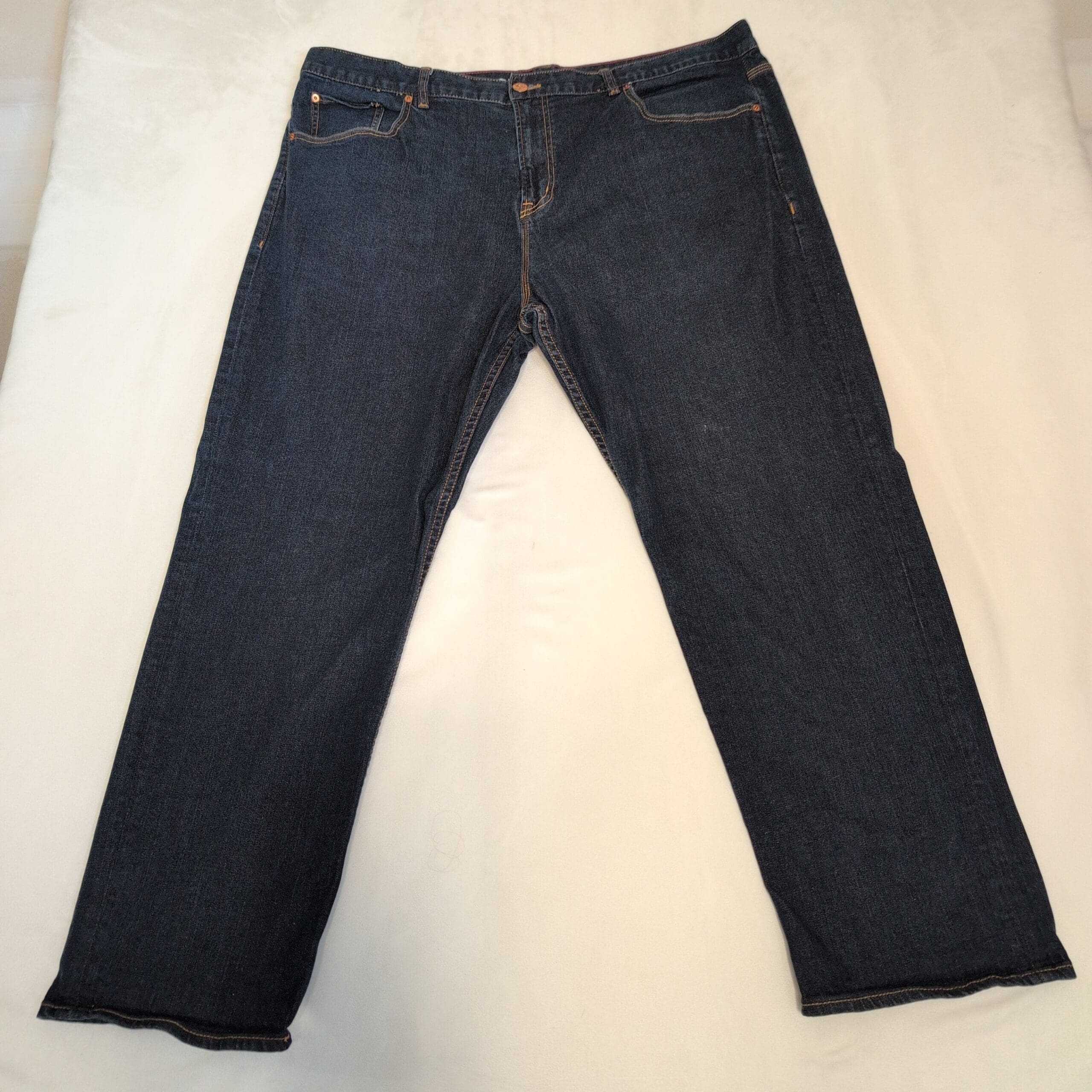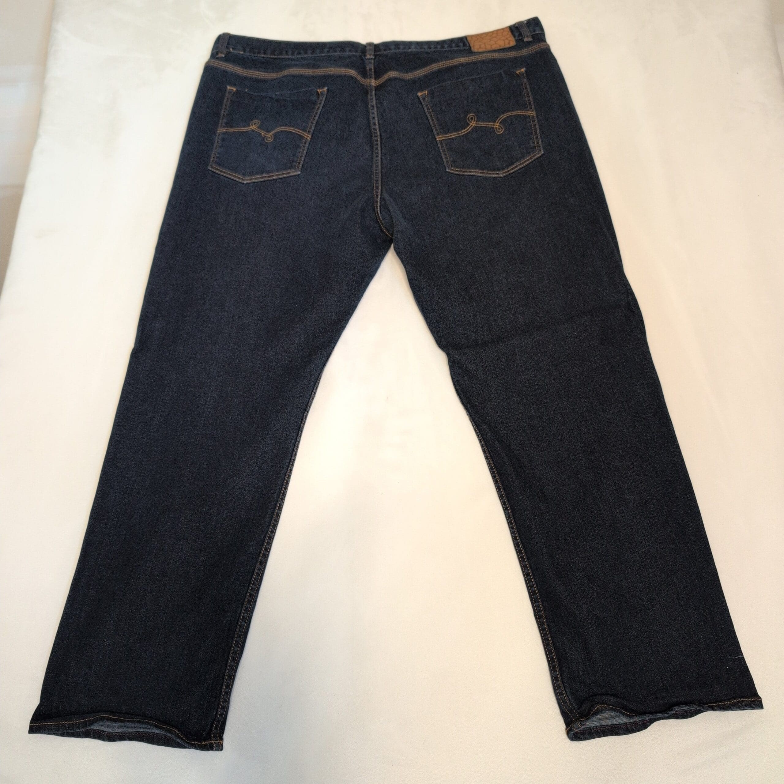 Classic LRG men’s relaxed-fit jeans in deep blue denim. Size: Waist 46 (Big & Tall). Comfortable relaxed cut with a straight leg — versatile for everyday wear. Five-pocket styling with contrast stitching and durable construction. Condition: pre-owned with a minor mark on the left leg; see photos for detail. Clean and ready to wear.