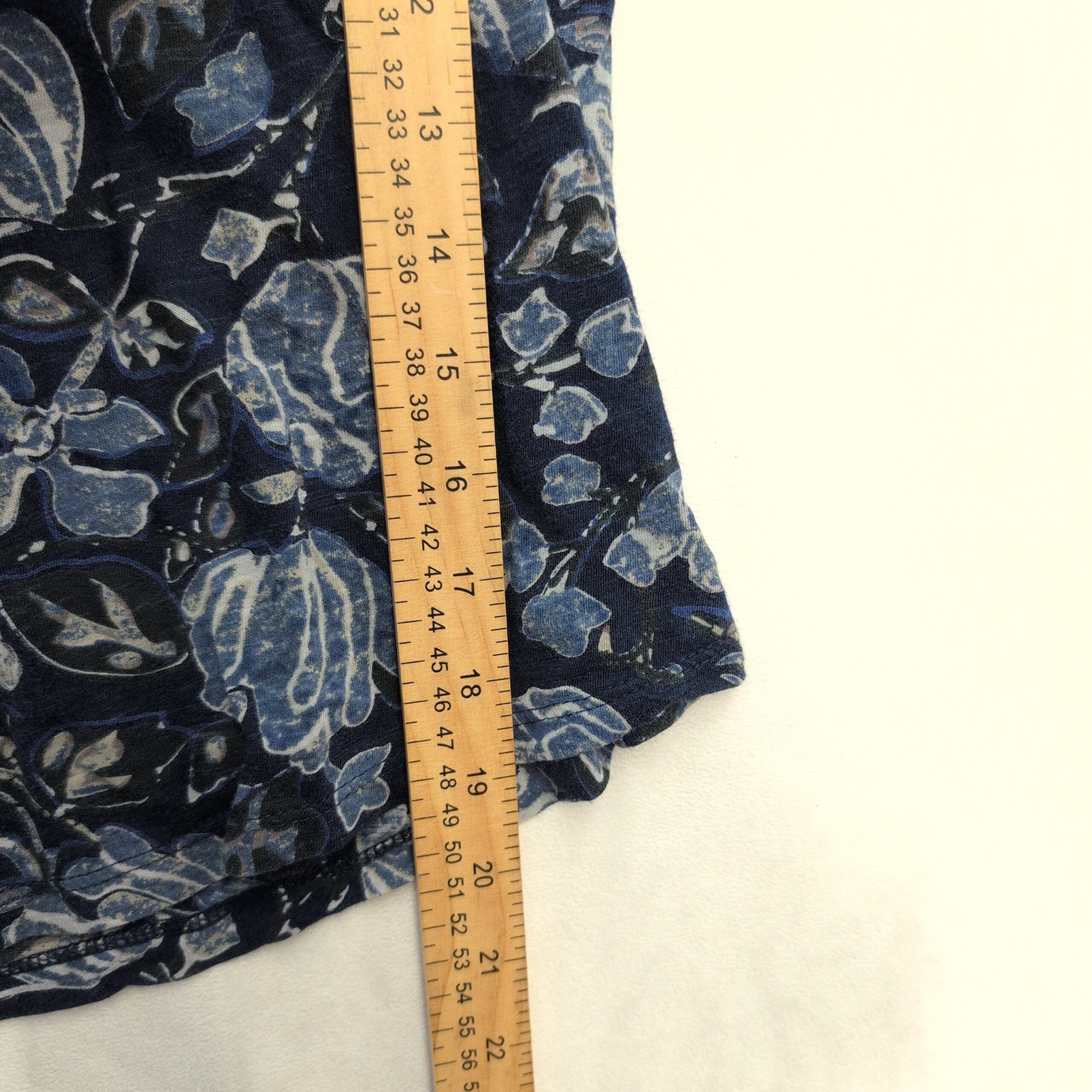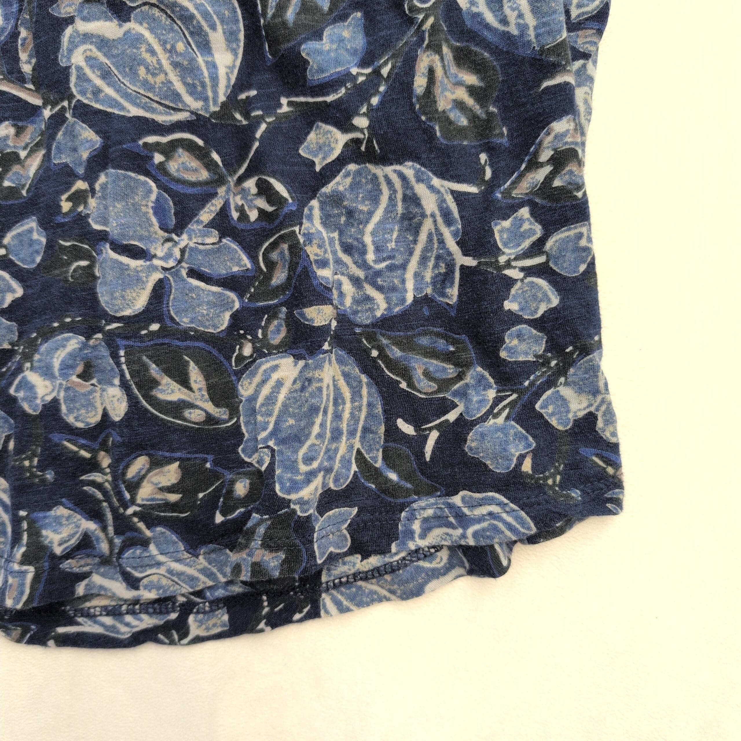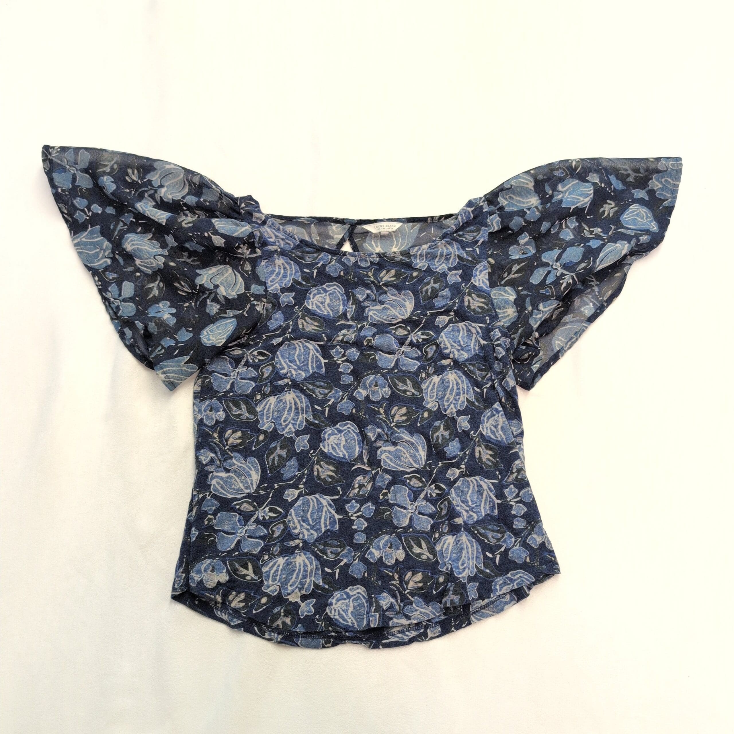 Lightweight Lucky Brand women’s blouse in a navy-blue floral print. Features flutter short sleeves with slightly sheer fabric, a rounded scoop neckline and a small keyhole at the back with a tie closure. Relaxed, waist-length silhouette perfect for casual days or dressed-up occasions.