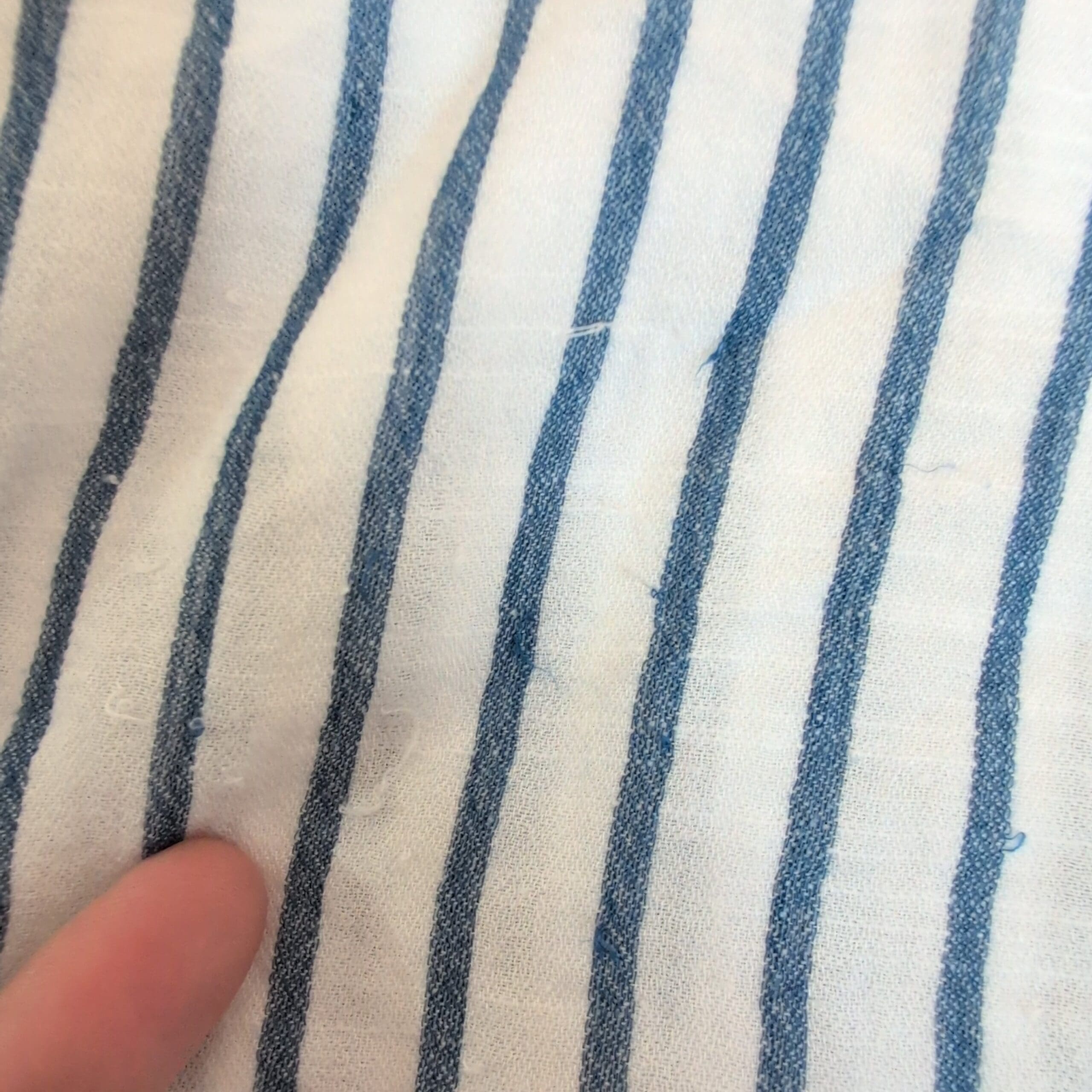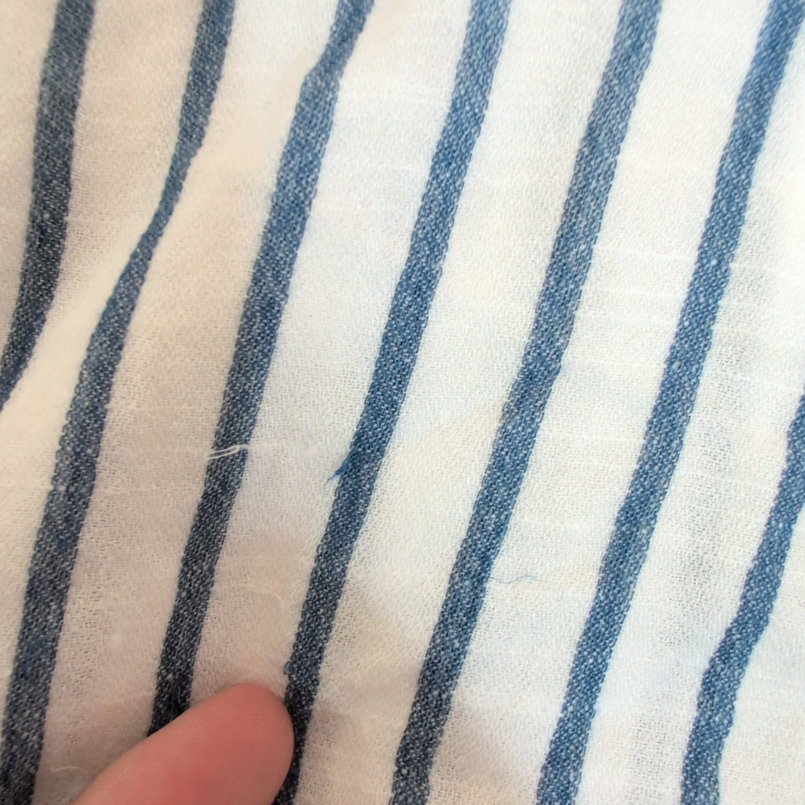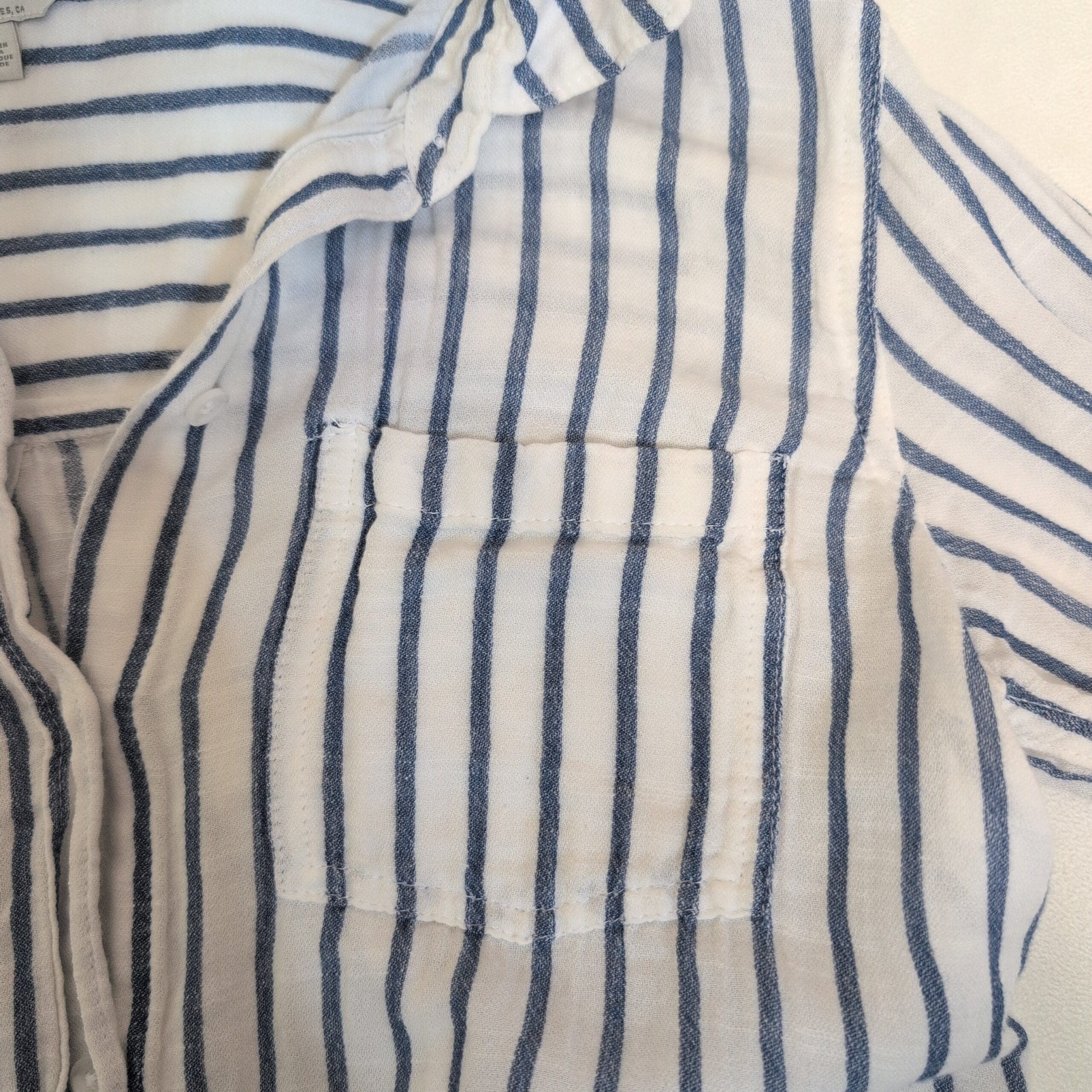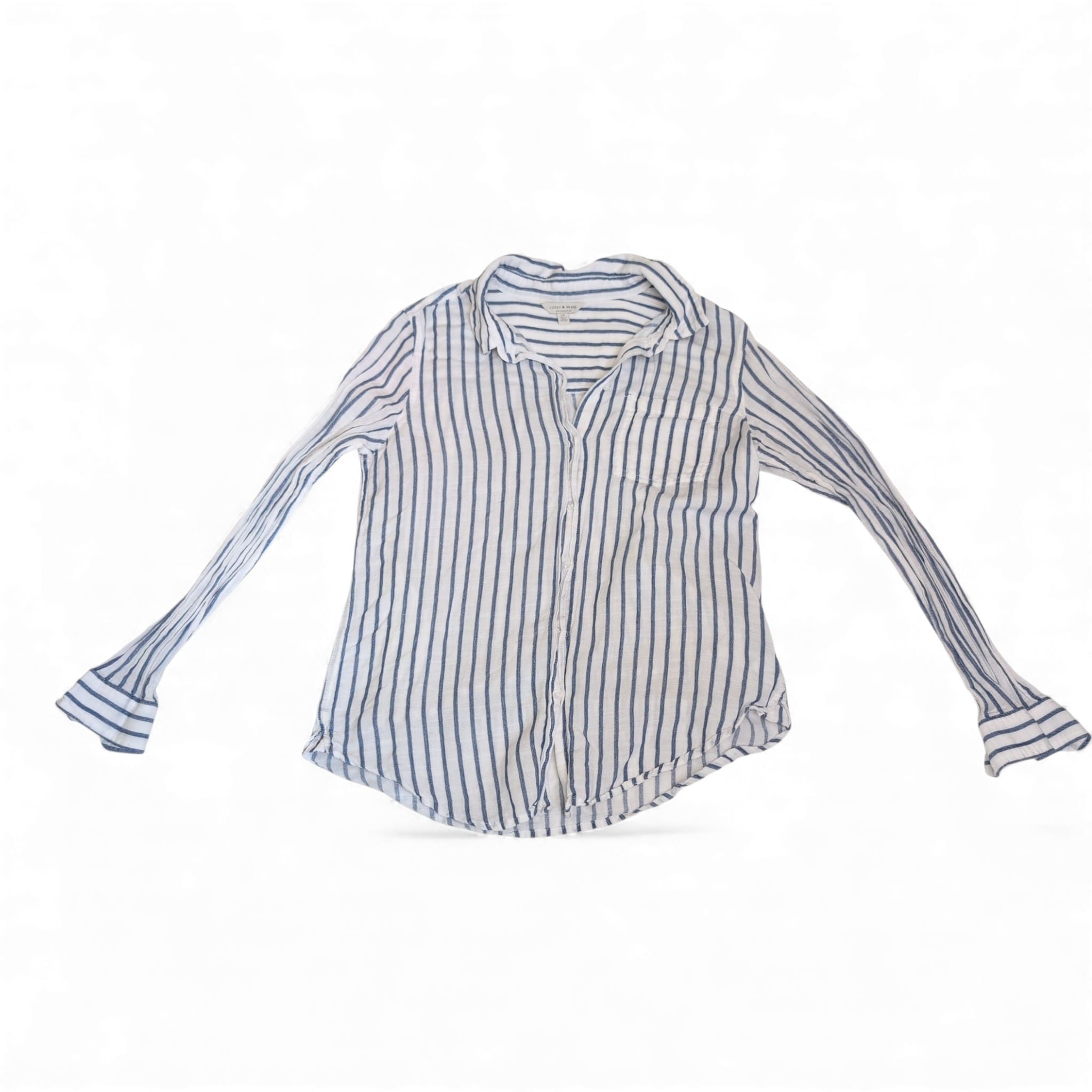 Lucky Brand blue and white vertical striped button-down shirt in women’s size S. Classic collared long-sleeve design with a single chest pocket and rounded hem—lightweight, breezy silhouette perfect for layering or casual wear. Buttons down the front; fits true to size. Condition: pre-owned with some pulled threads (see photos for details).
