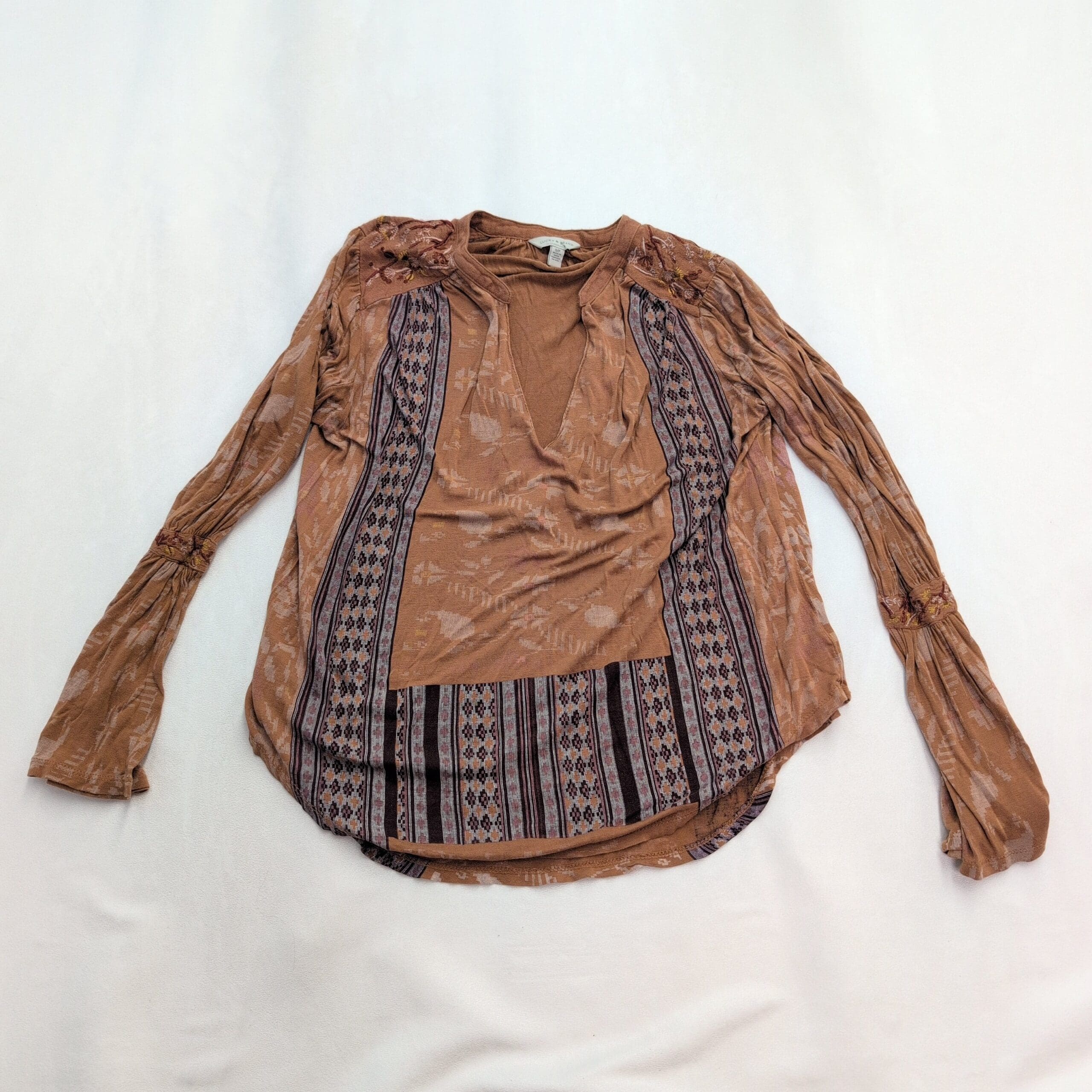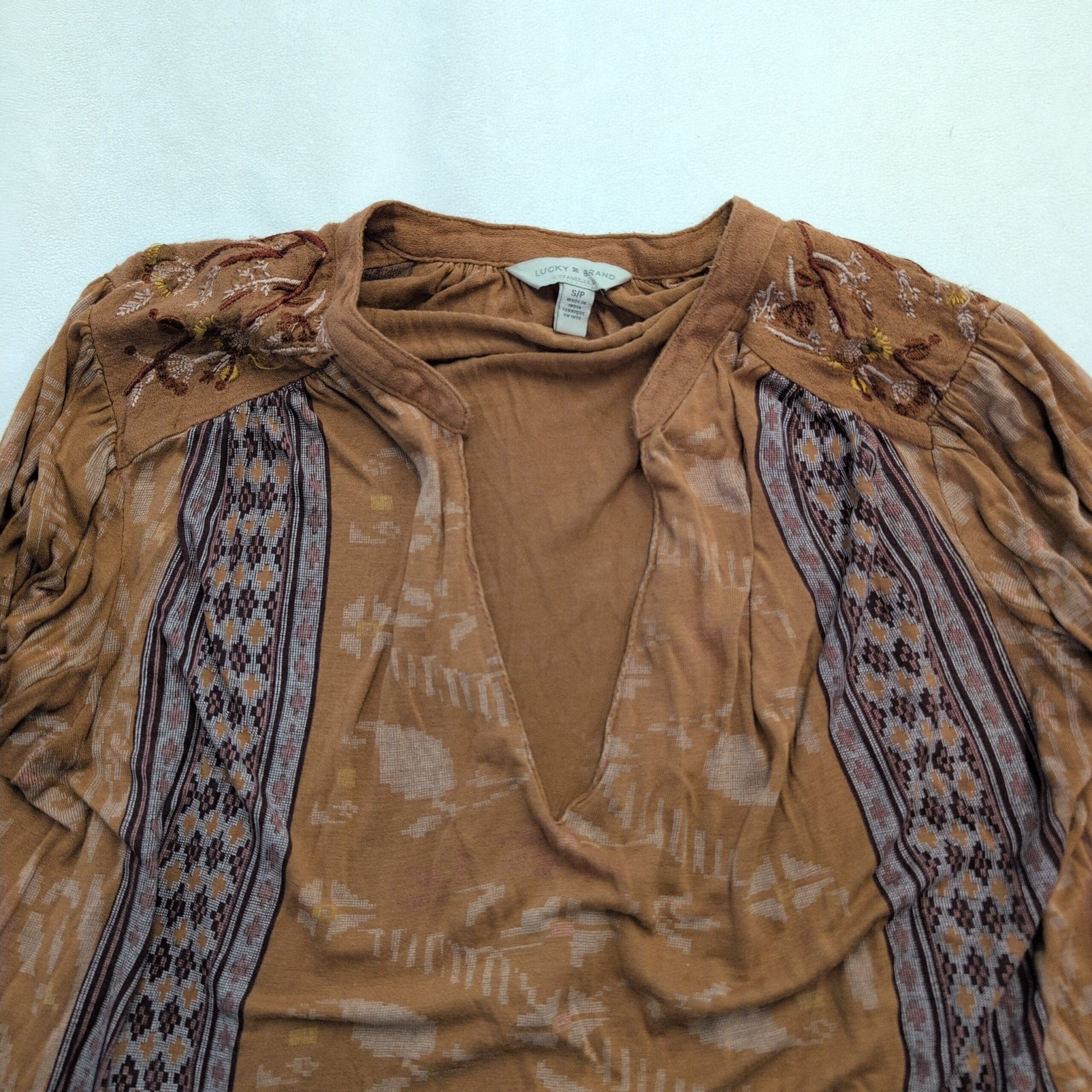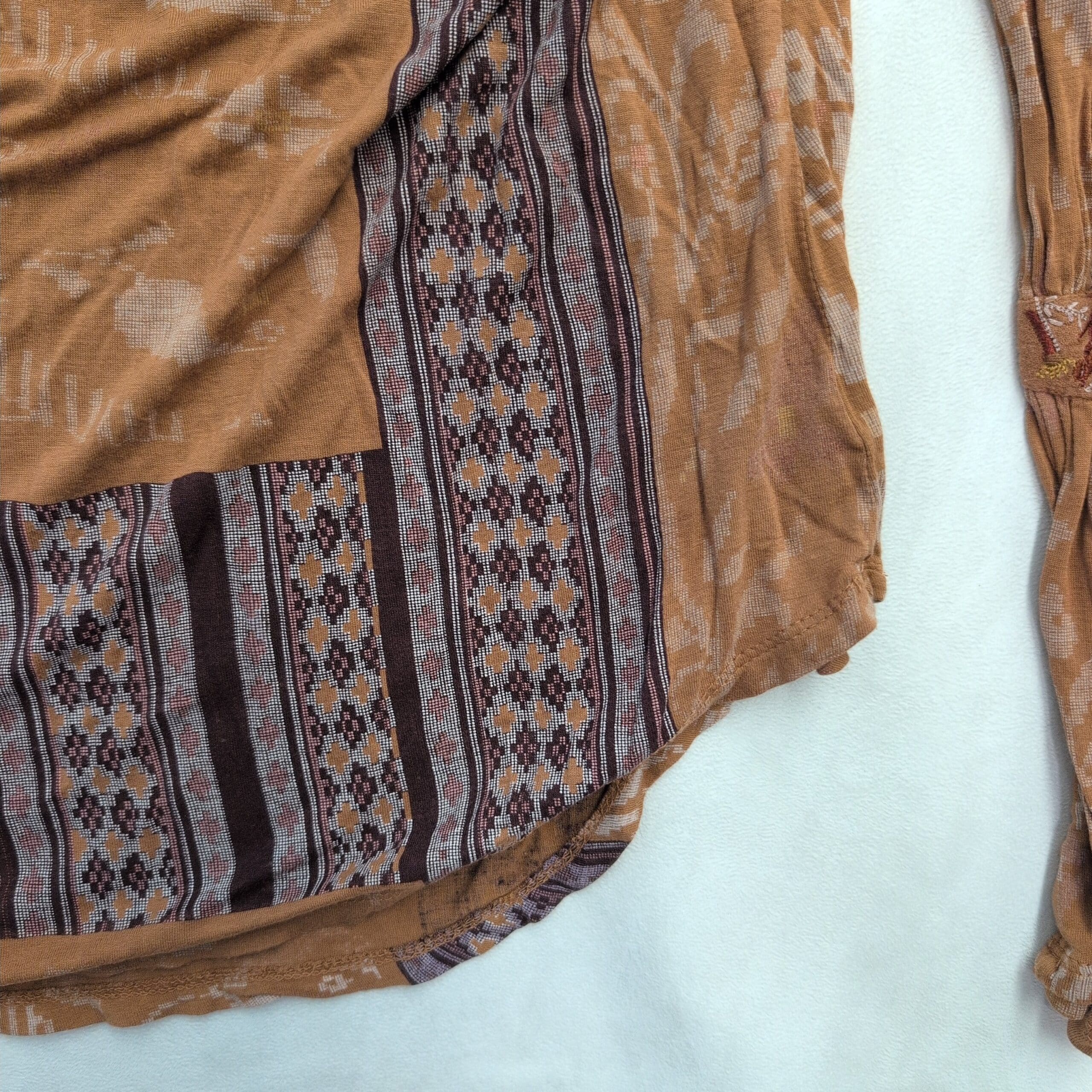 Lucky Brand women’s brown boho blouse in size S. Features a V-neck, mixed printed panels with geometric stripe detailing at the hem, and embroidered floral accents at the shoulders and cuffs. Long, pleated bell sleeves and a relaxed, slightly high-low hem create a flattering, effortless silhouette — great for layering or wearing alone.
