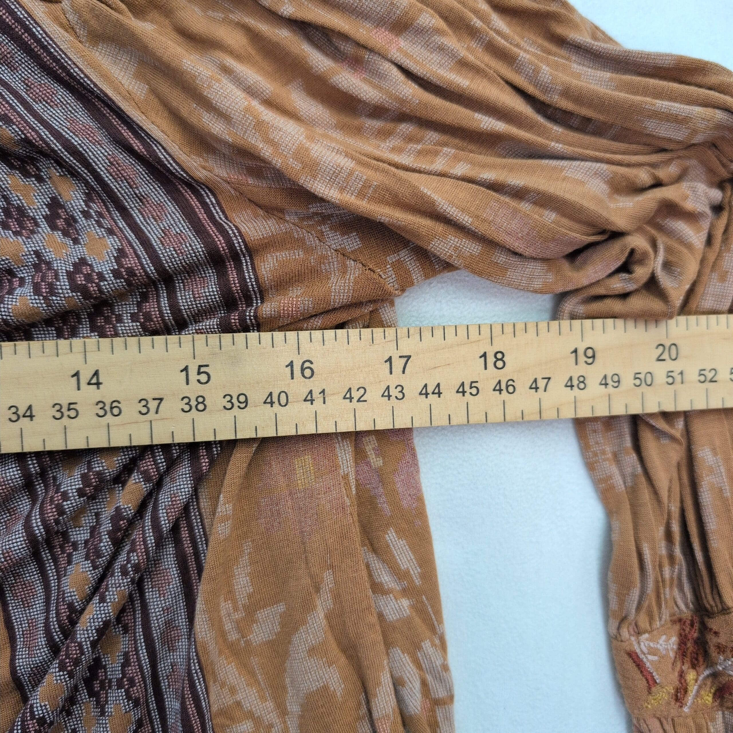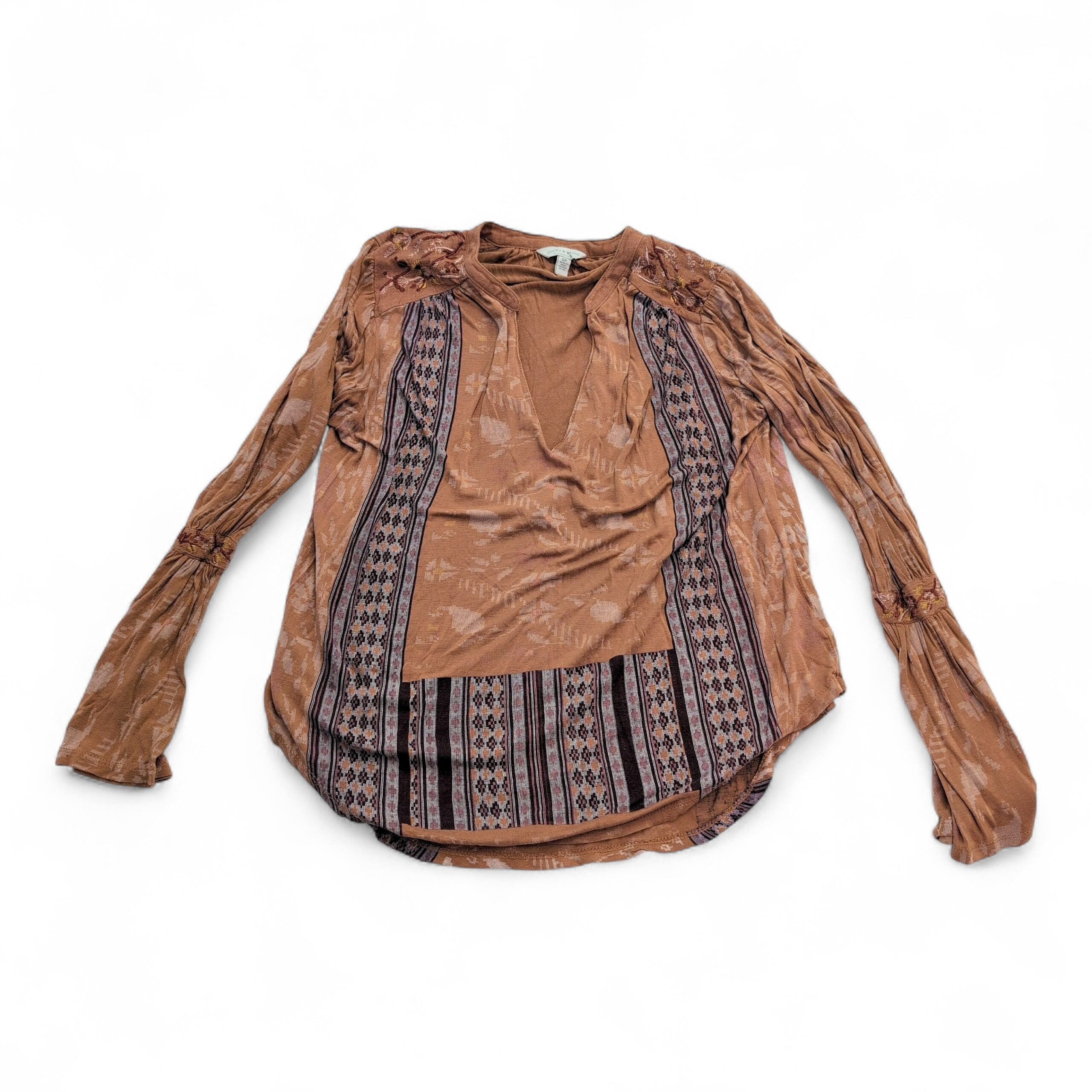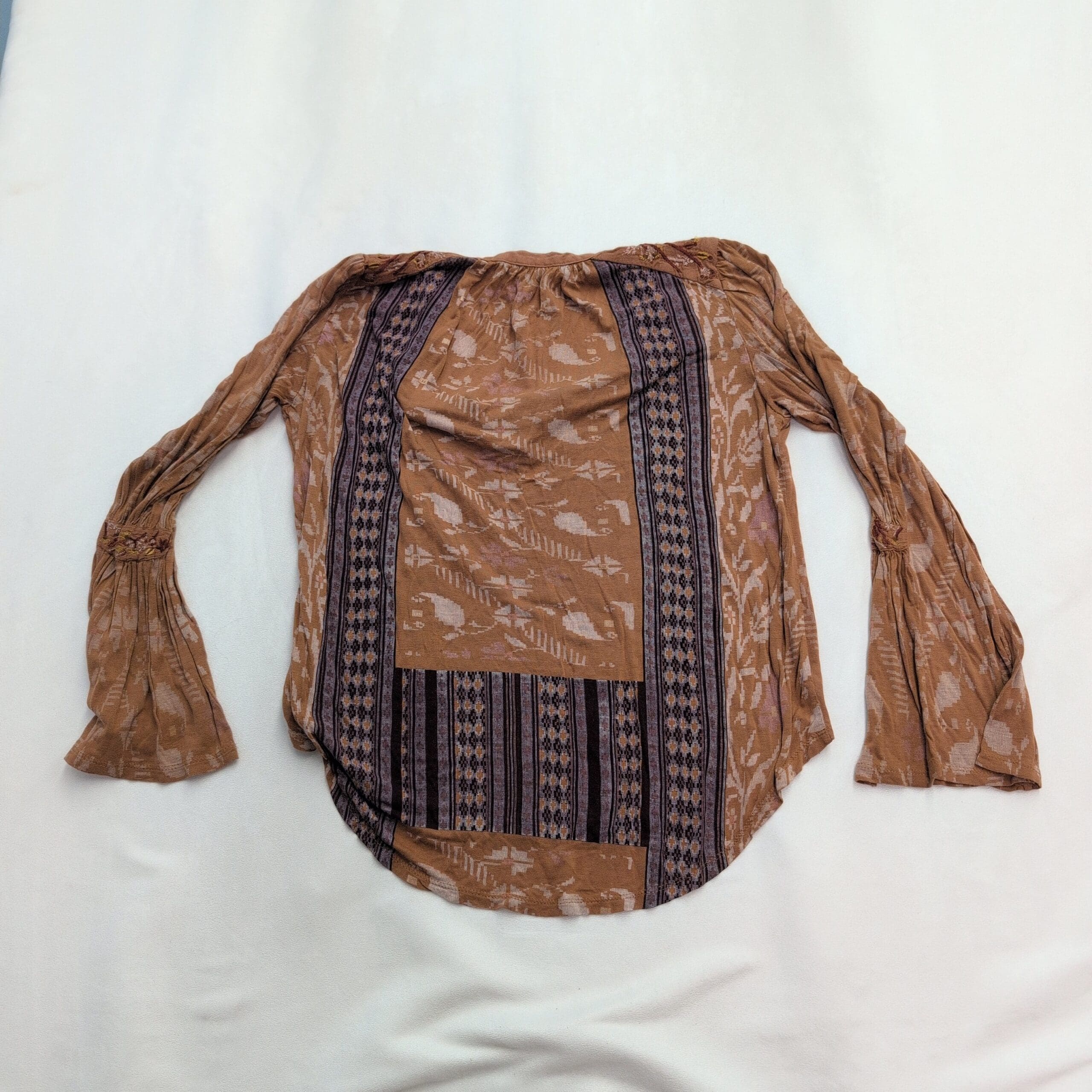 Lucky Brand women’s brown boho blouse in size S. Features a V-neck, mixed printed panels with geometric stripe detailing at the hem, and embroidered floral accents at the shoulders and cuffs. Long, pleated bell sleeves and a relaxed, slightly high-low hem create a flattering, effortless silhouette — great for layering or wearing alone.