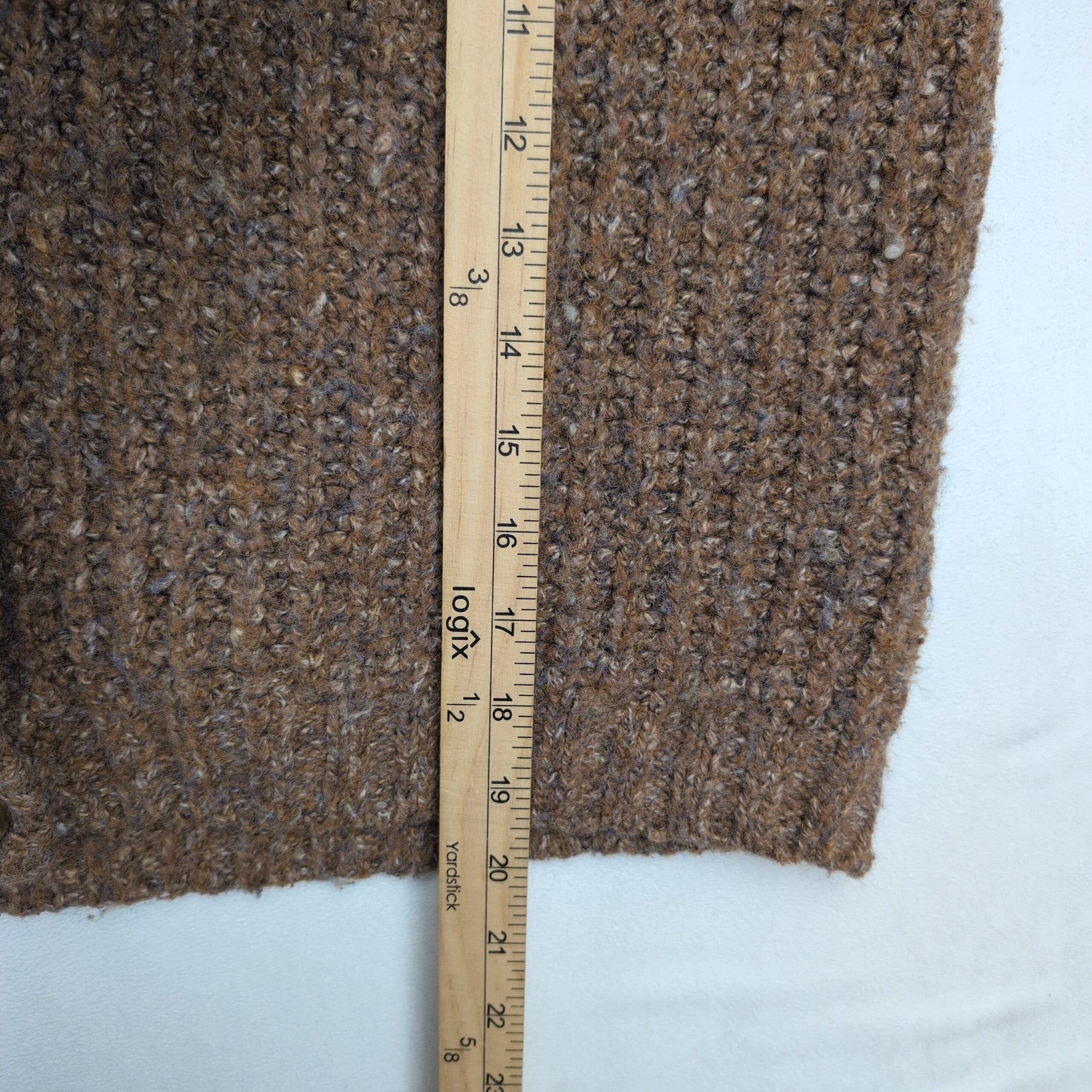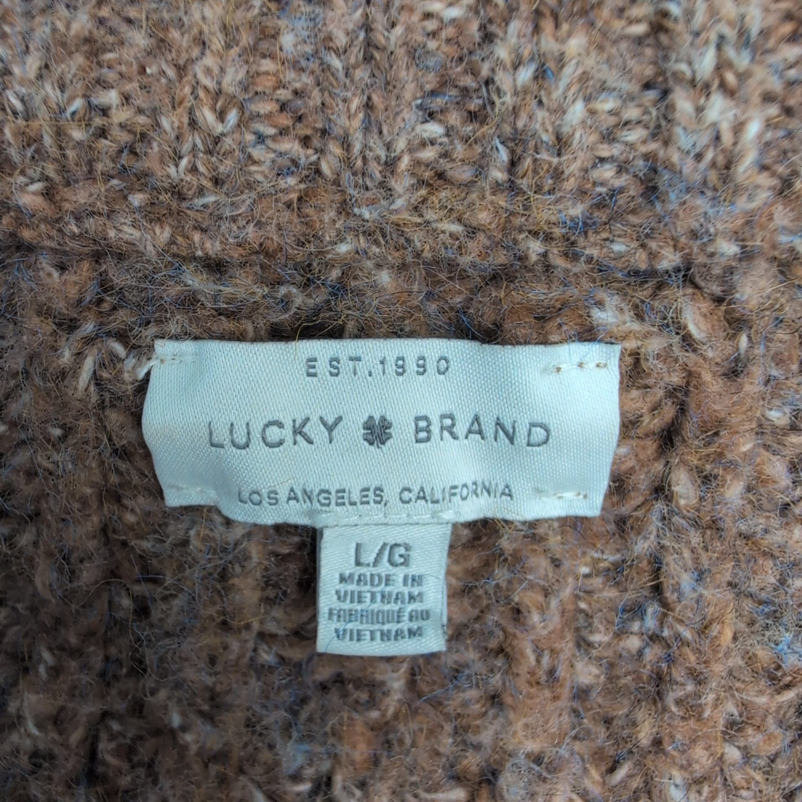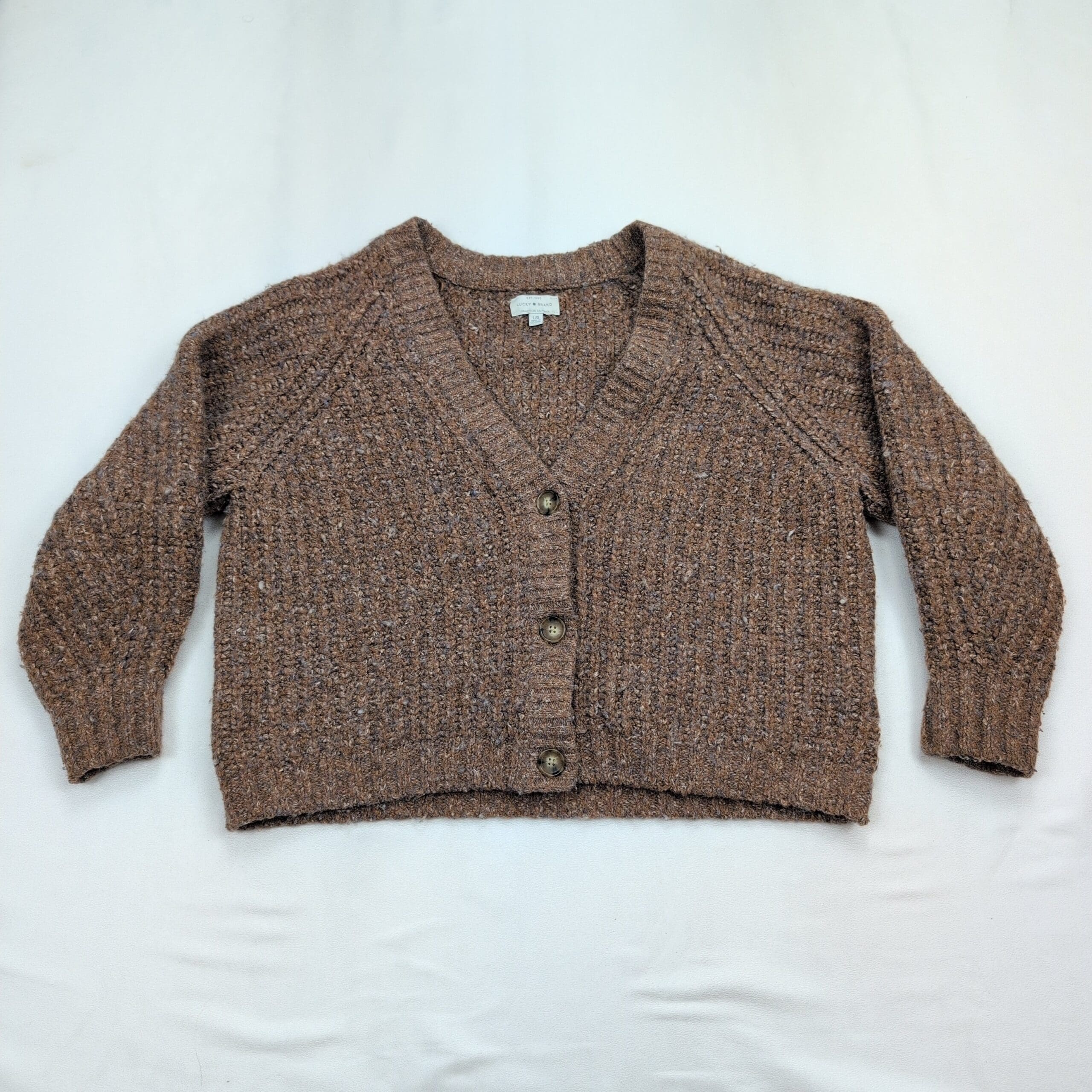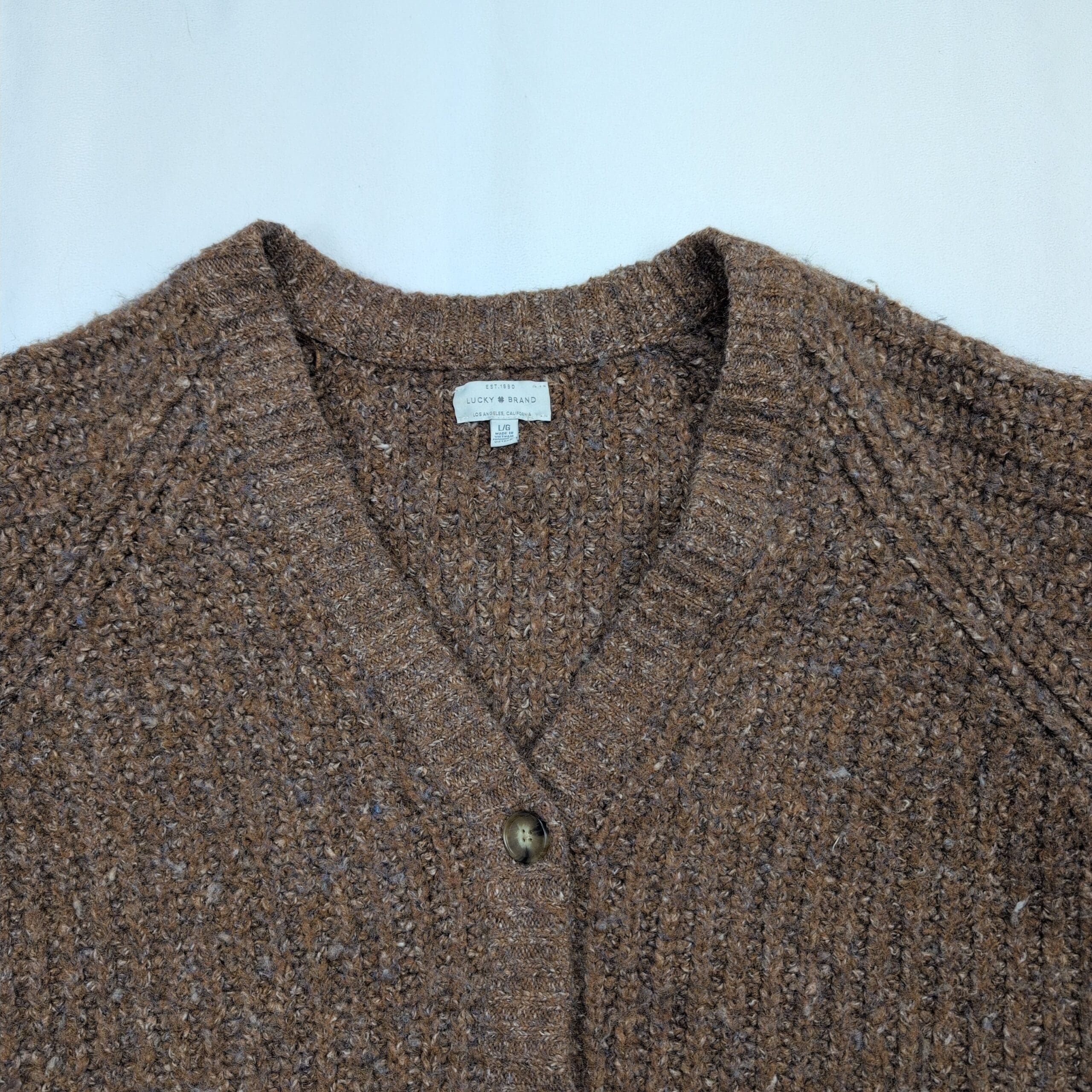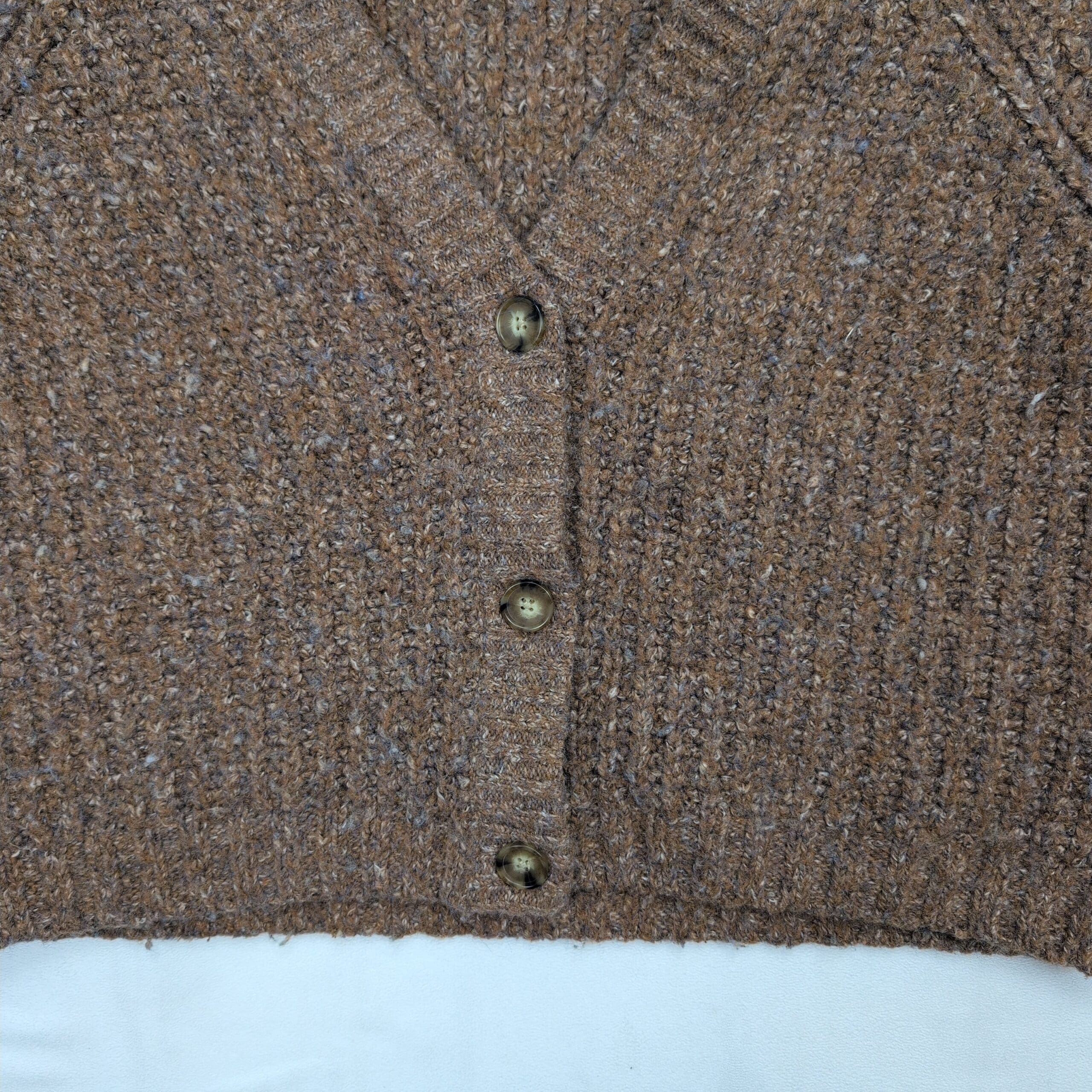 Lucky Brand women’s cropped chunky knit cardigan in size L. V-neck, button-front with three buttons, ribbed cuffs and hem, and a textured speckled brown knit that adds cozy, casual style. Cropped silhouette makes it ideal for layering over dresses or high-waist jeans for a relaxed, on-trend look.