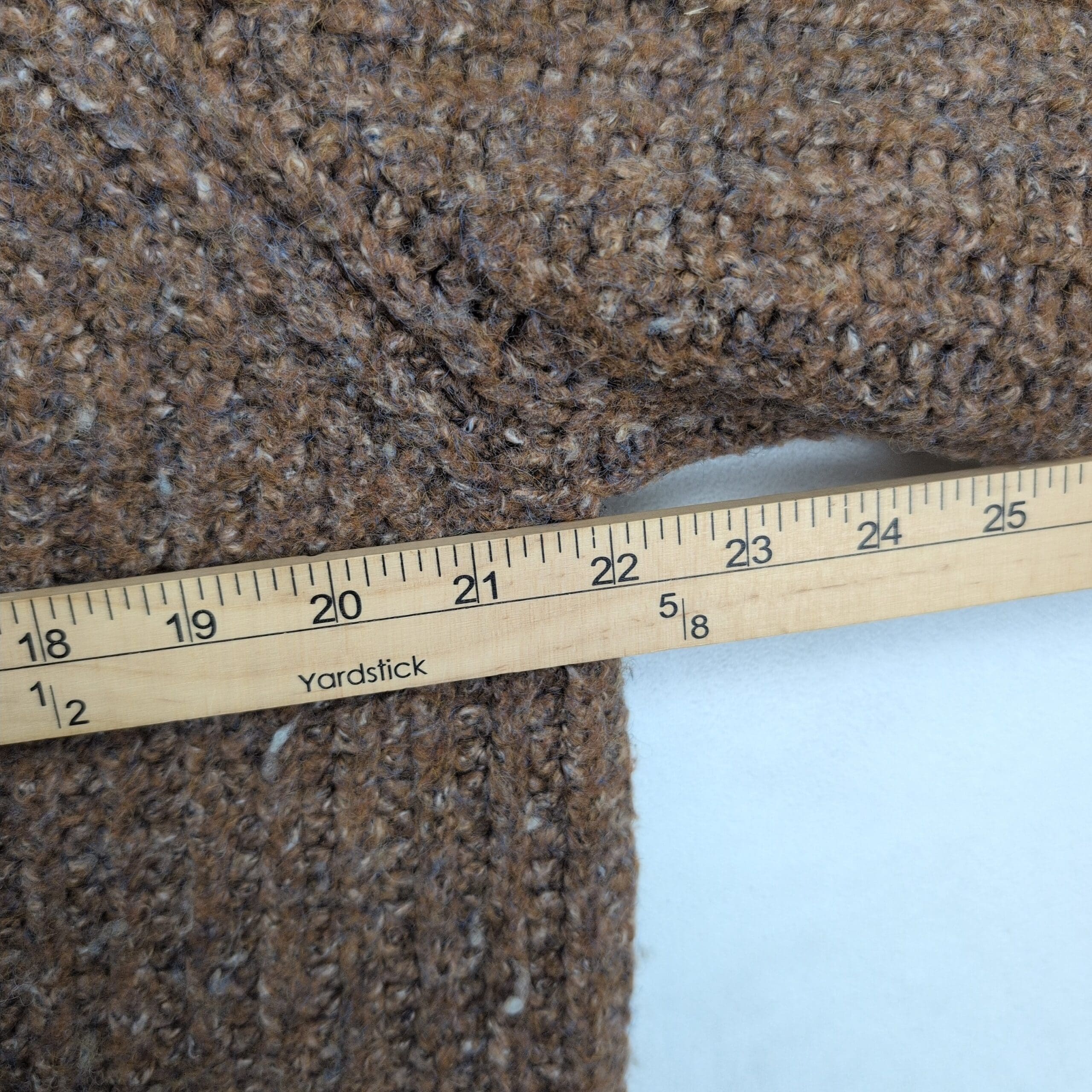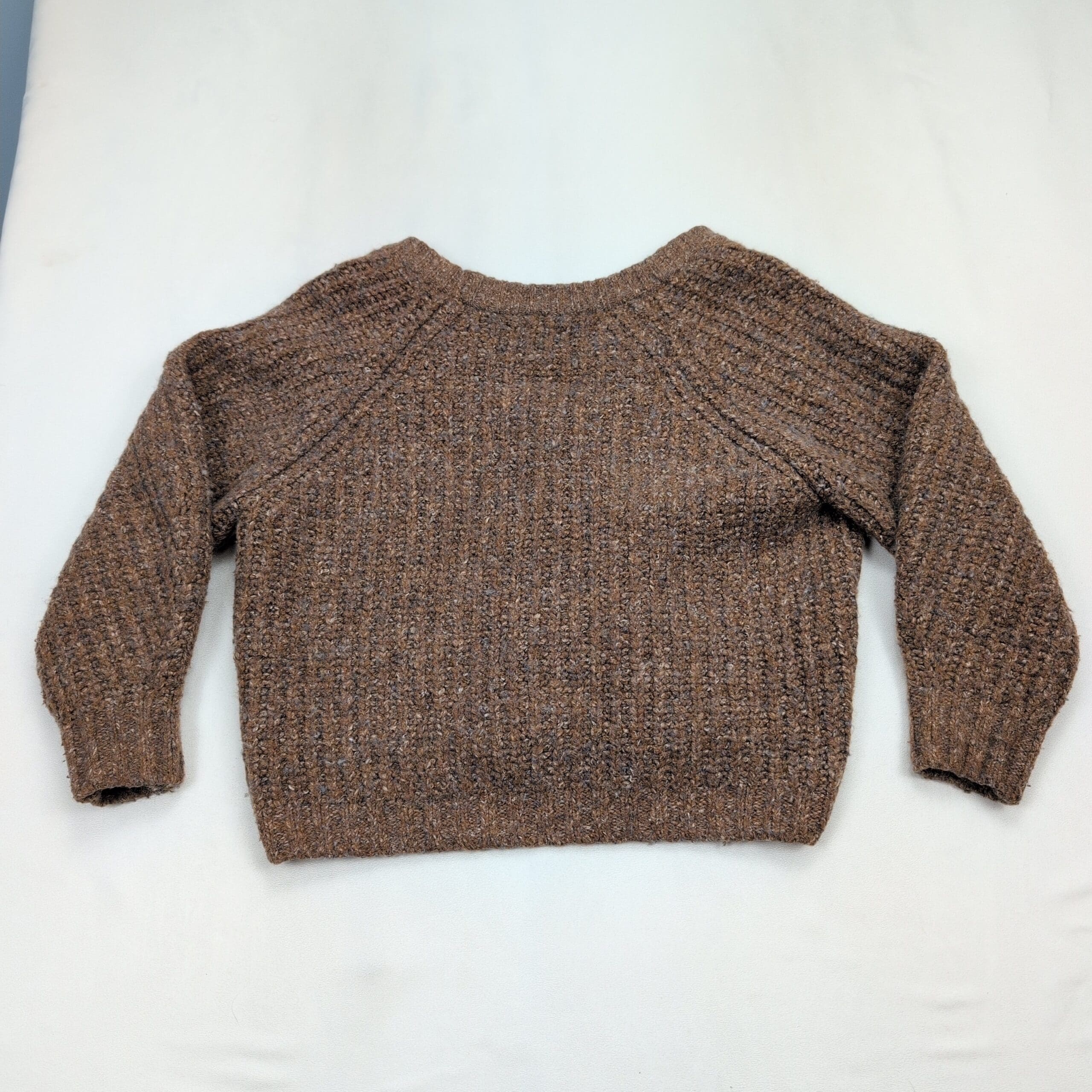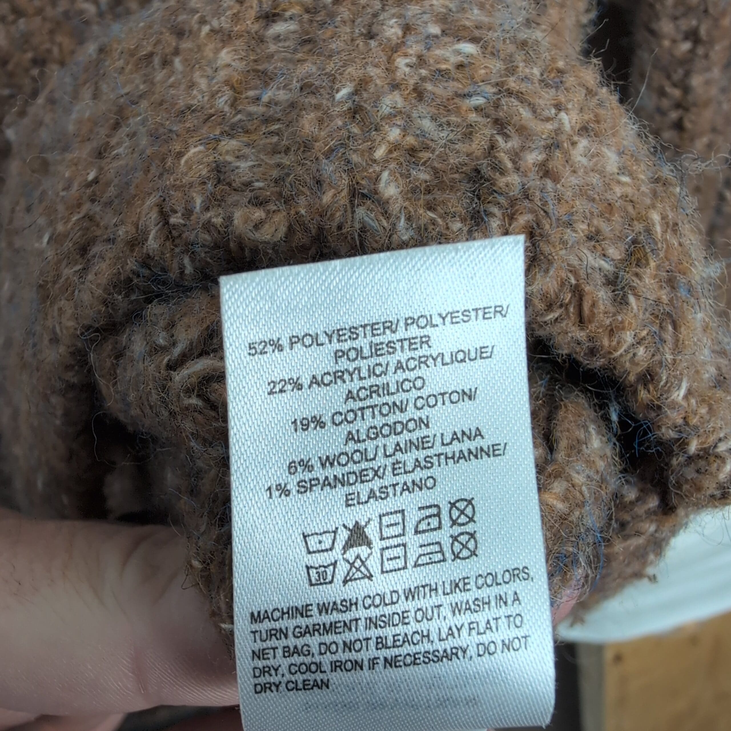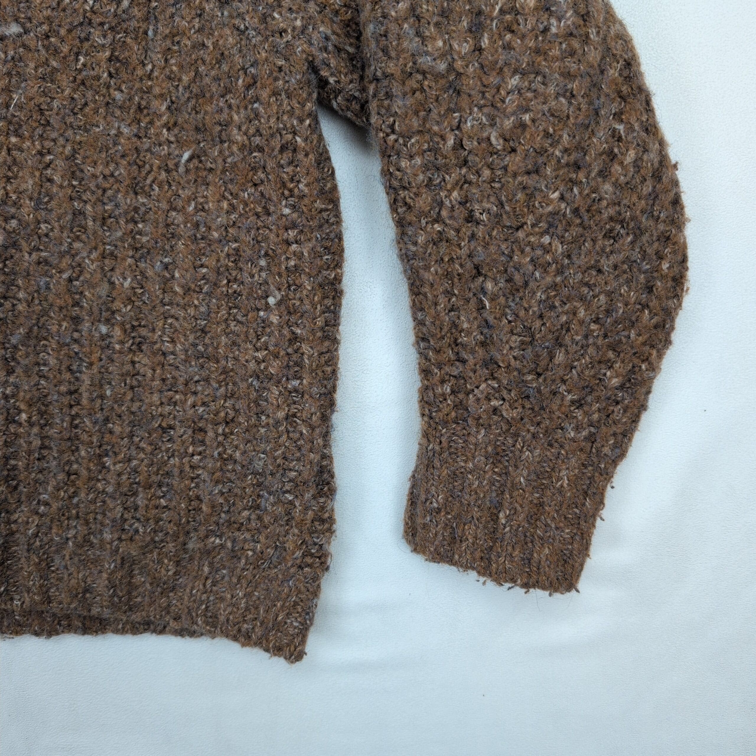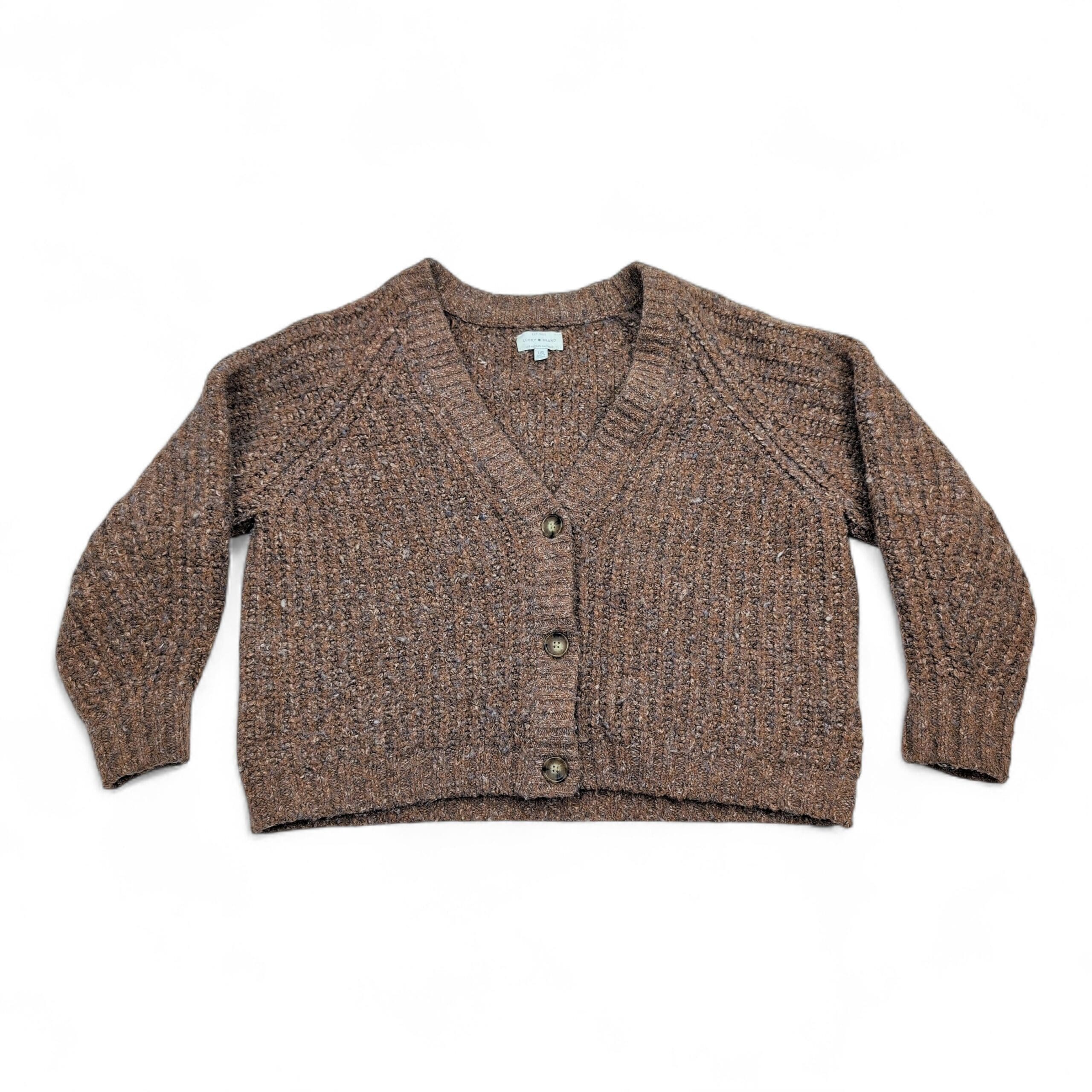 Lucky Brand women’s cropped chunky knit cardigan in size L. V-neck, button-front with three buttons, ribbed cuffs and hem, and a textured speckled brown knit that adds cozy, casual style. Cropped silhouette makes it ideal for layering over dresses or high-waist jeans for a relaxed, on-trend look.