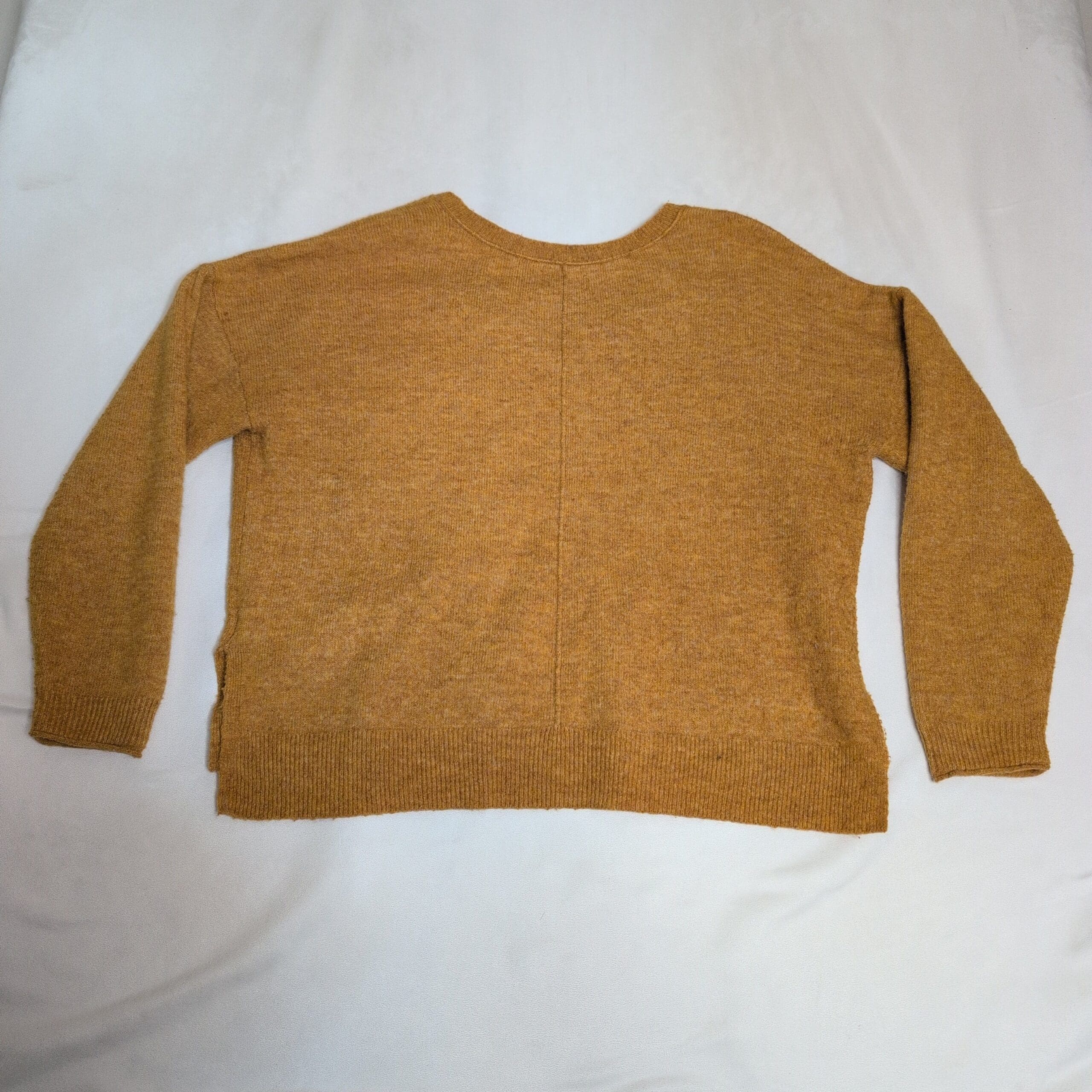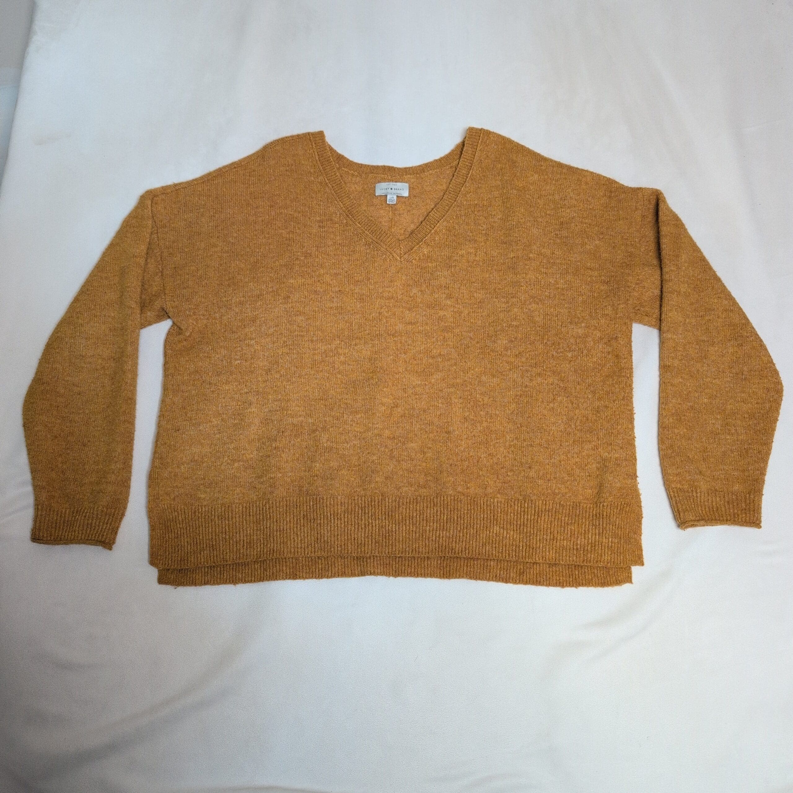 Lucky Brand women’s V-neck sweater in a warm mustard yellow. Size L (standard). Features a classic V-neckline, long sleeves, ribbed cuffs and hem, and a relaxed, slightly boxy silhouette ideal for layering. Midweight knit provides cozy warmth for cooler days. Good used condition with light, normal wear — please review photos for details and to confirm fit.