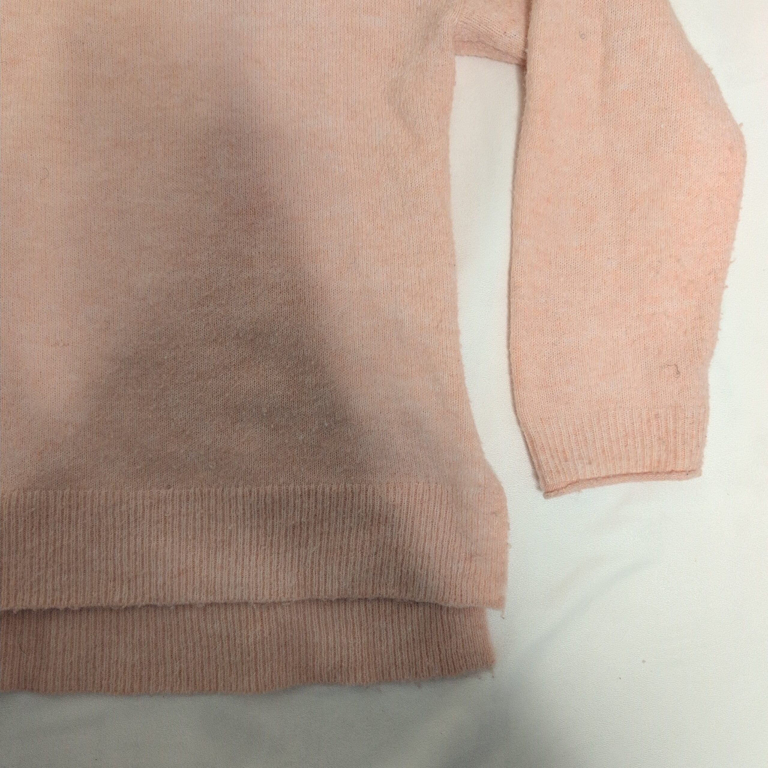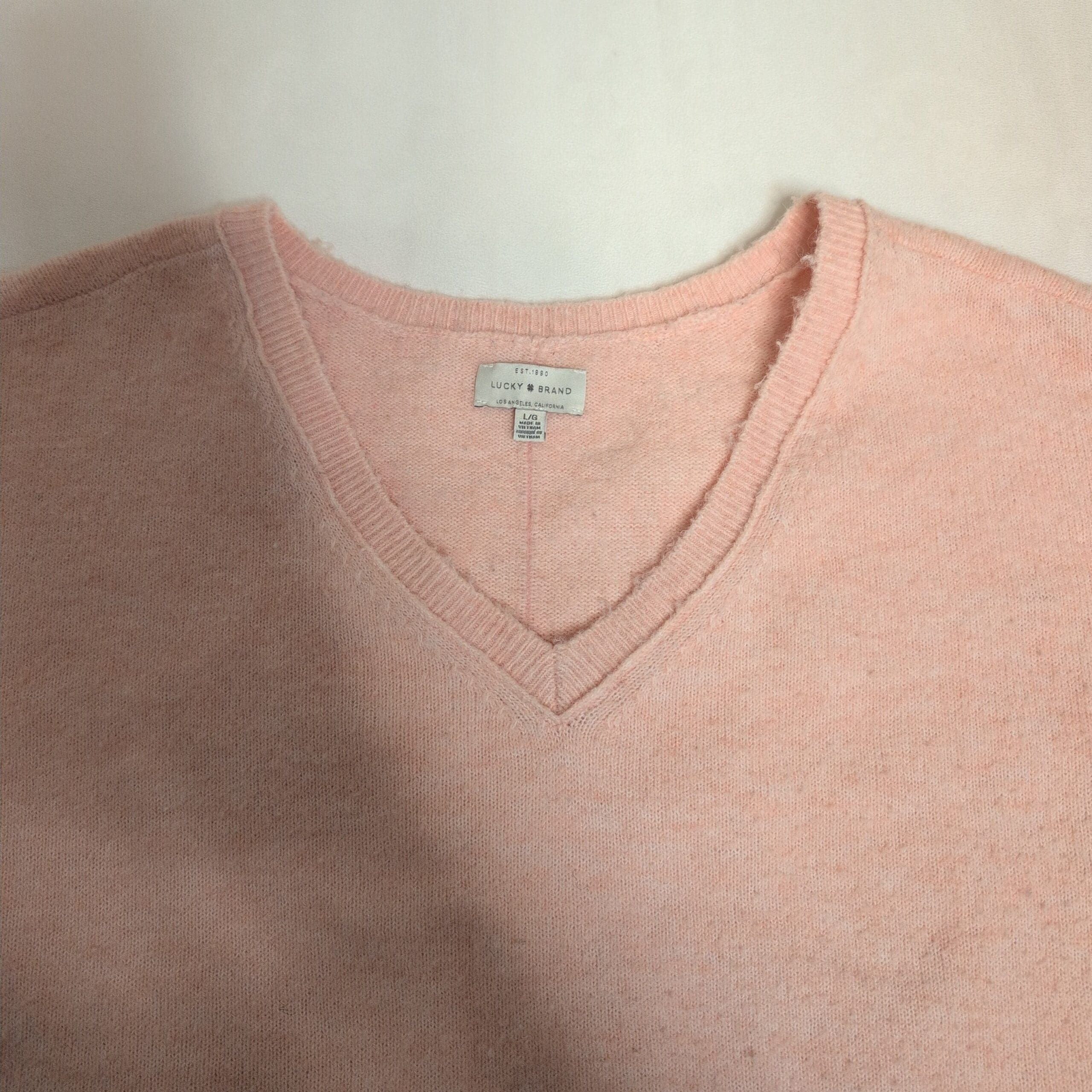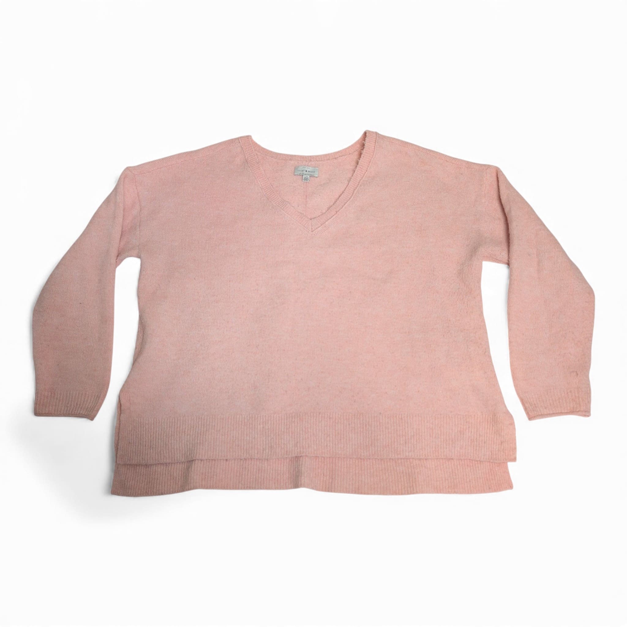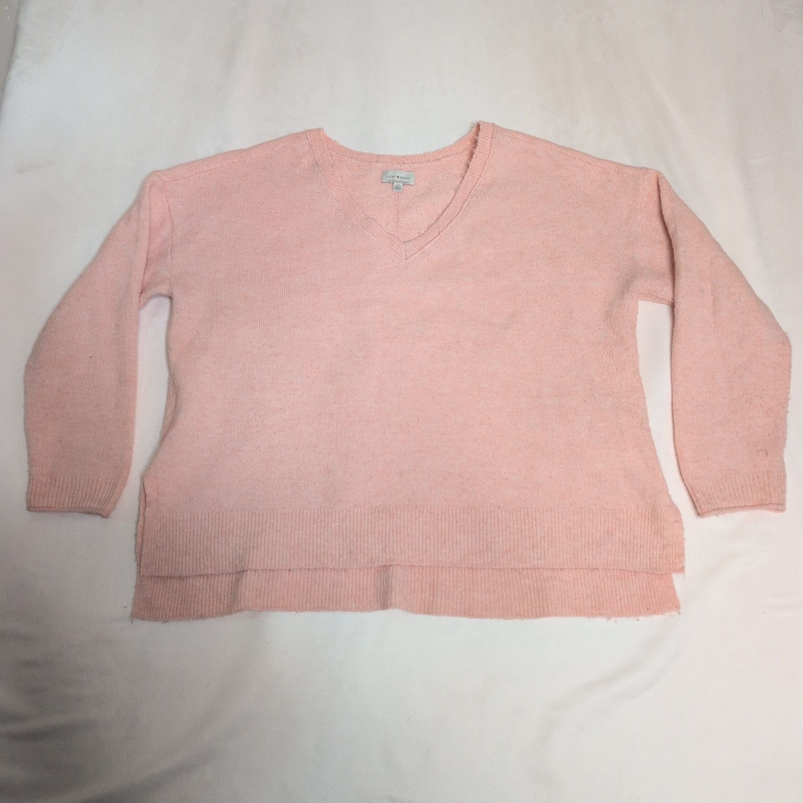 Lucky Brand women’s V-neck sweater in a soft blush pink. Size L (standard). Comfortable, lightweight knit with ribbed V-neck, cuffs, and a layered ribbed hem that creates a relaxed, modern silhouette. Great for everyday wear and easy to layer over tees or under jackets. Good used condition with light signs of wear consistent with normal use.