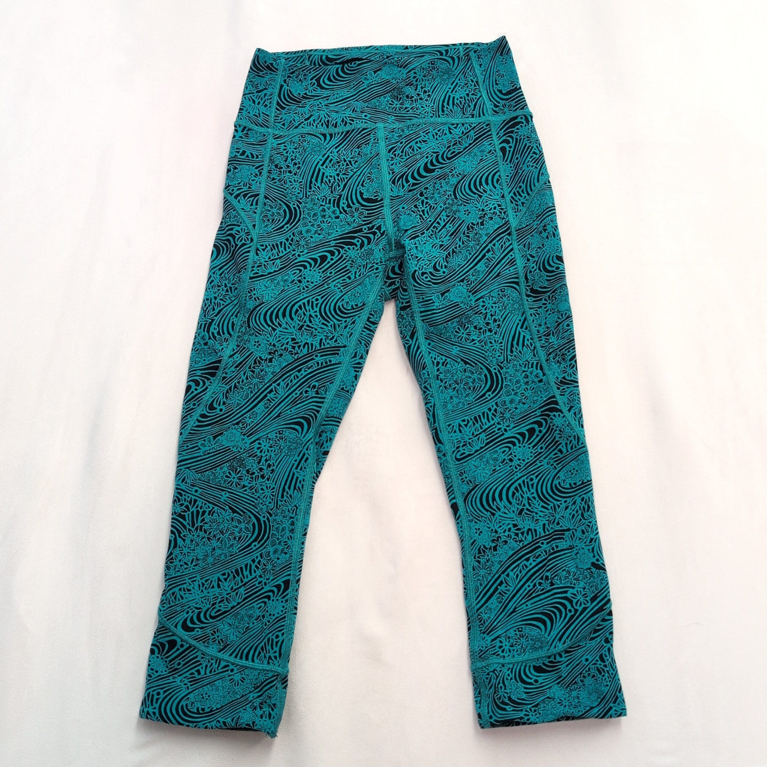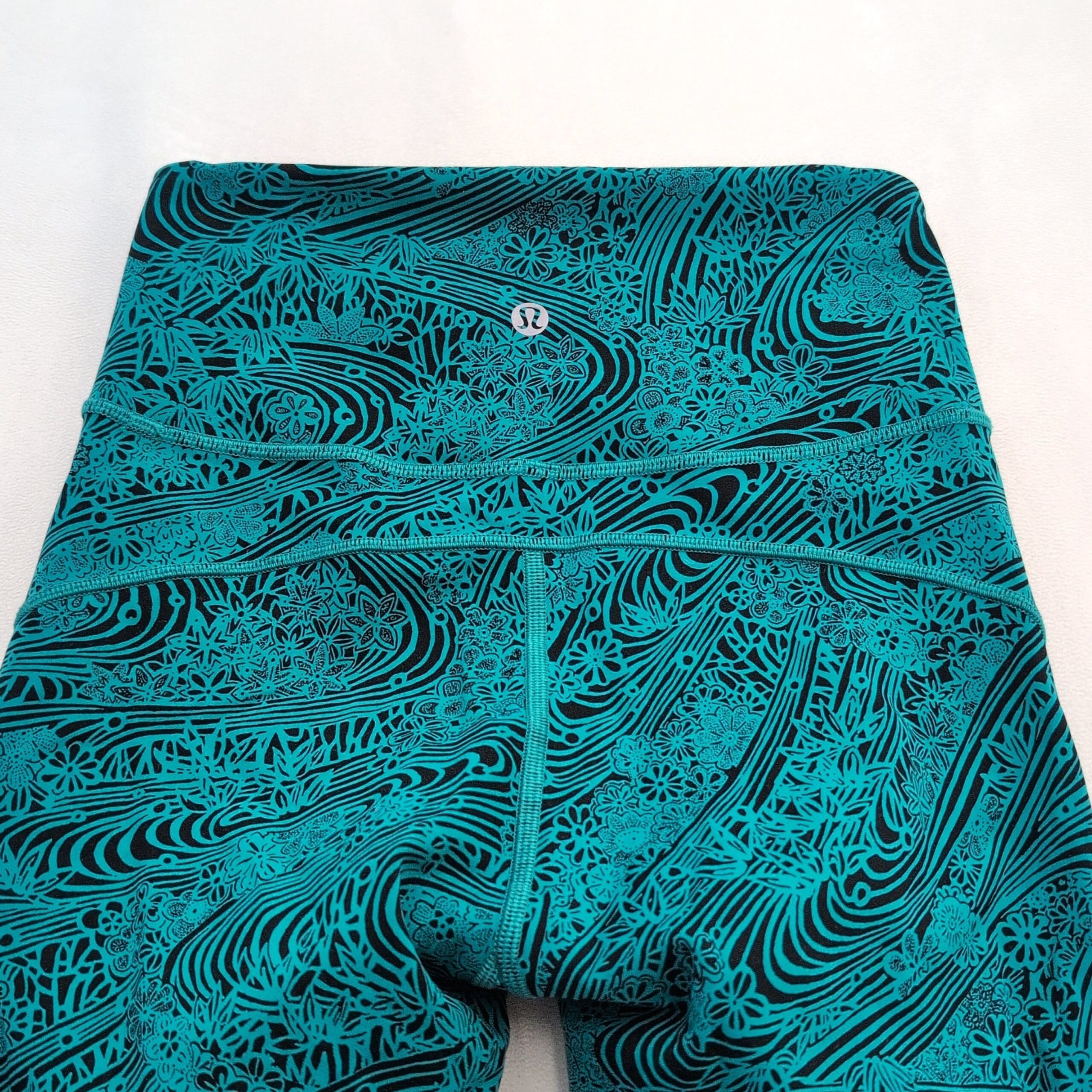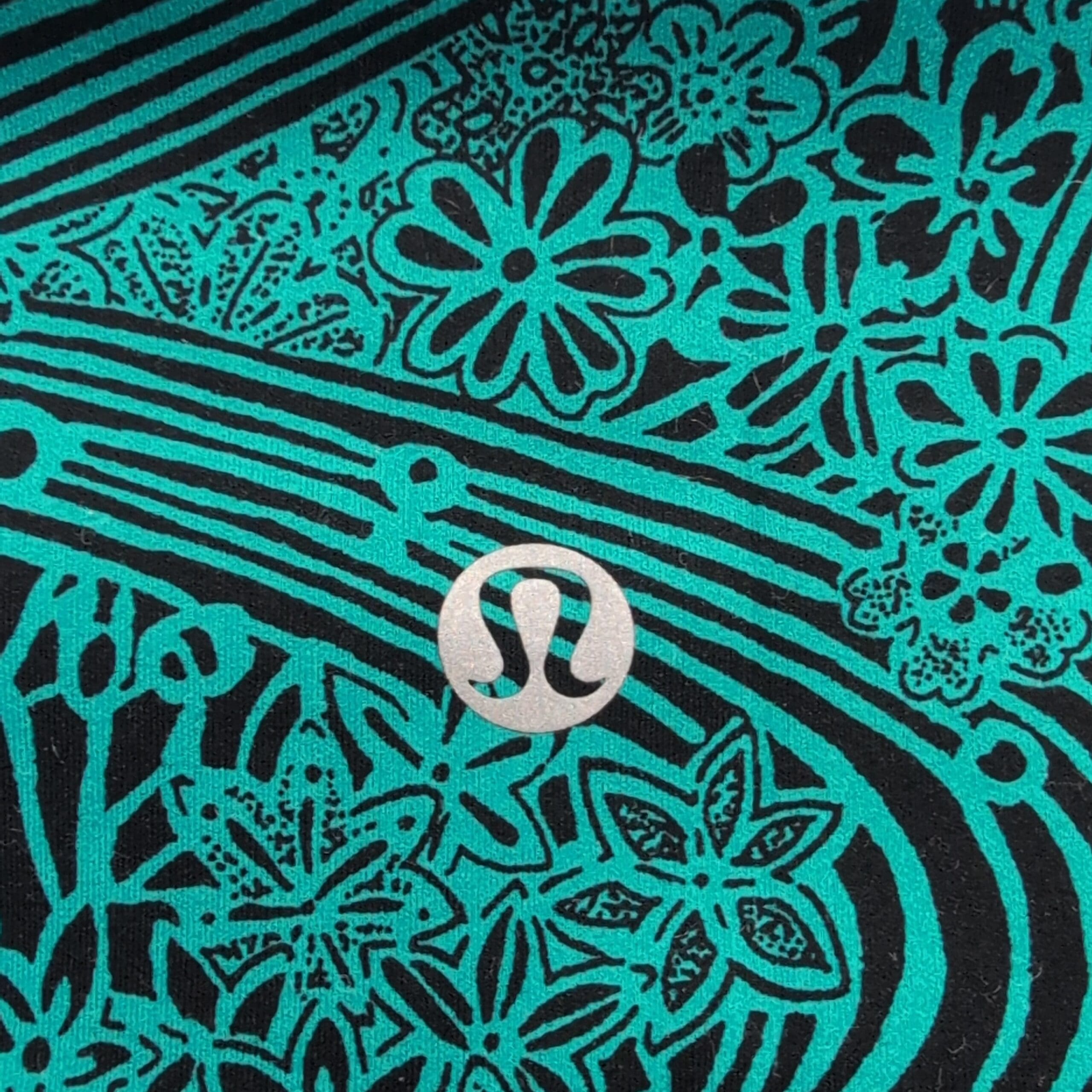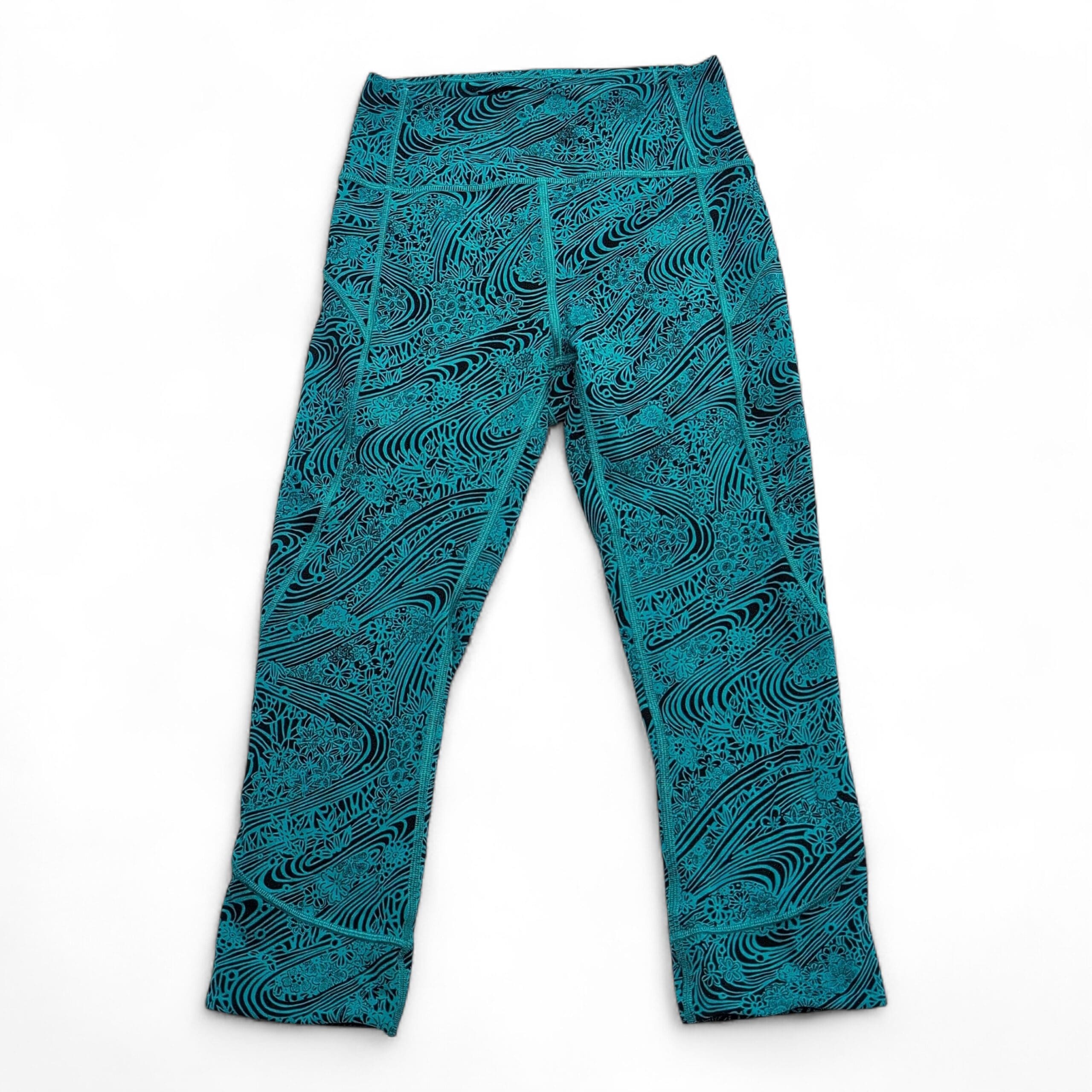 Lululemon women’s leggings in size 4. Black base with a vibrant teal swirl and floral print — eye-catching yet versatile. High-rise wide waistband provides a flattering, supportive fit. Four-way stretch fabric moves with you for yoga, studio workouts, or everyday athleisure. Clean flatlock seams and thoughtful paneling offer comfortable, chafe-free wear. Gently used — free of major rips, tears, stains, or flaws; typical light wear may be present. See photos for details.
