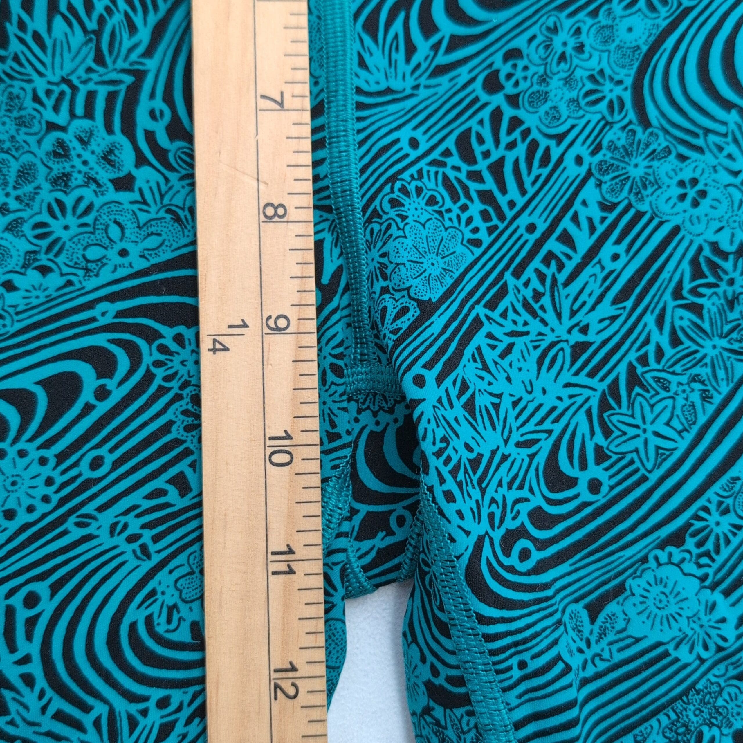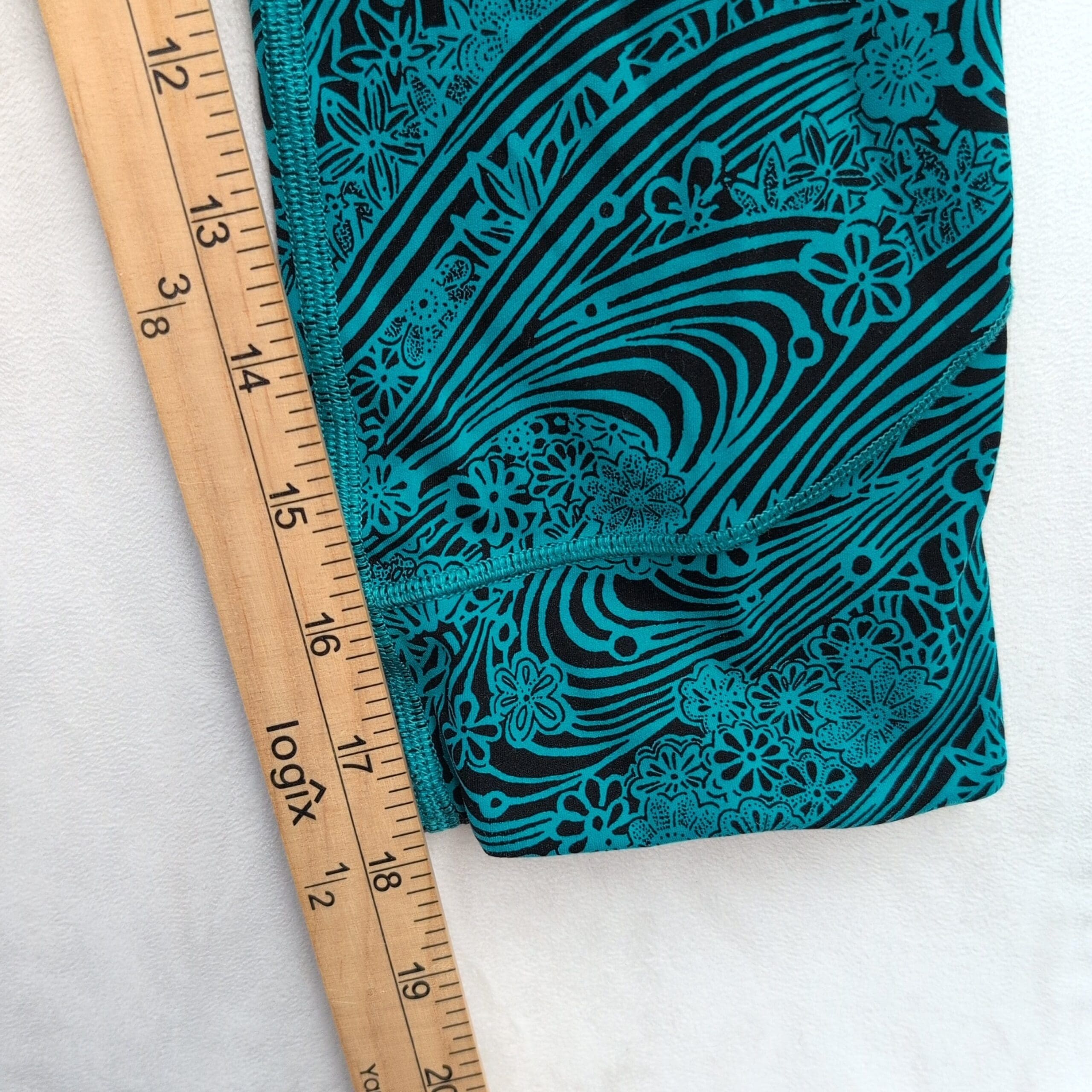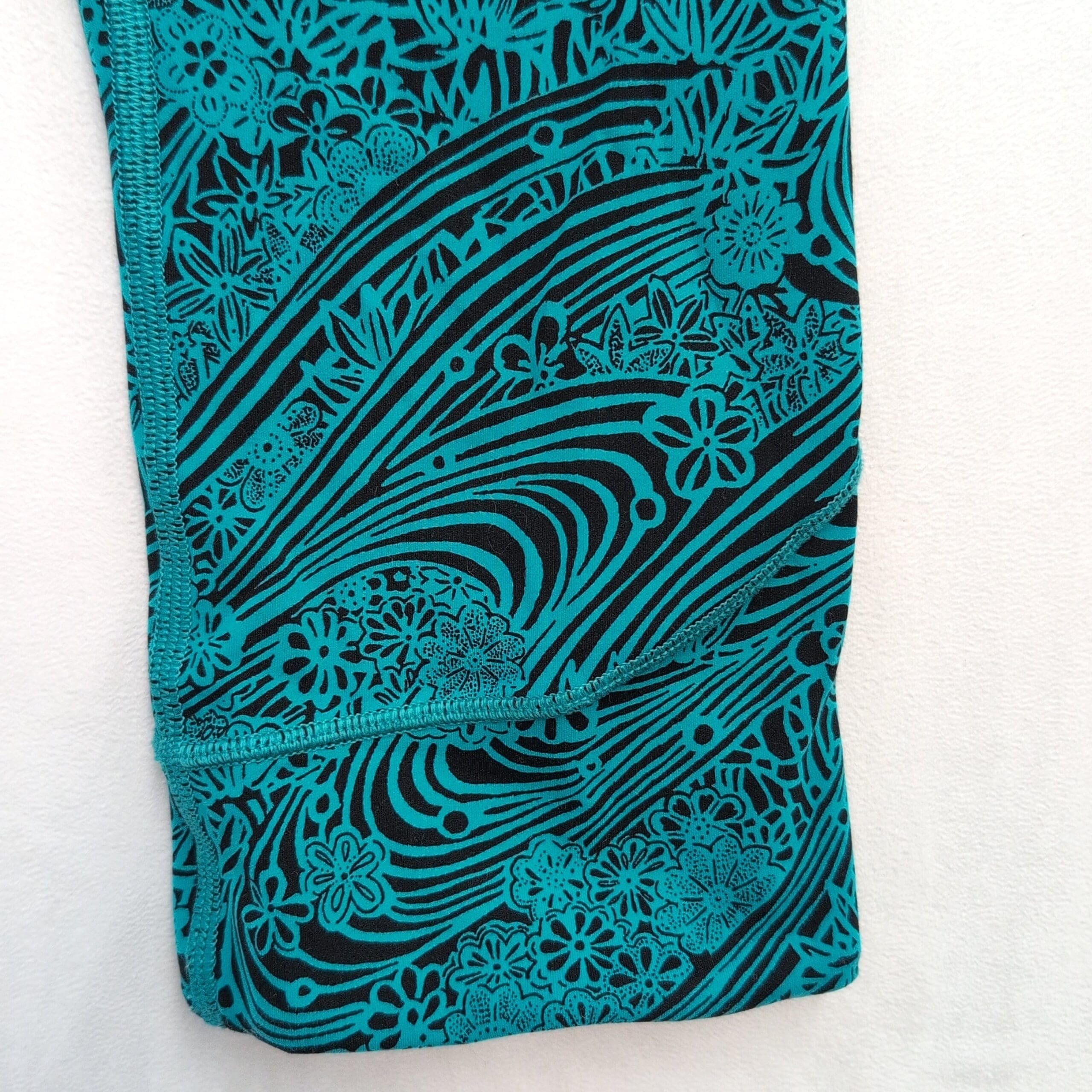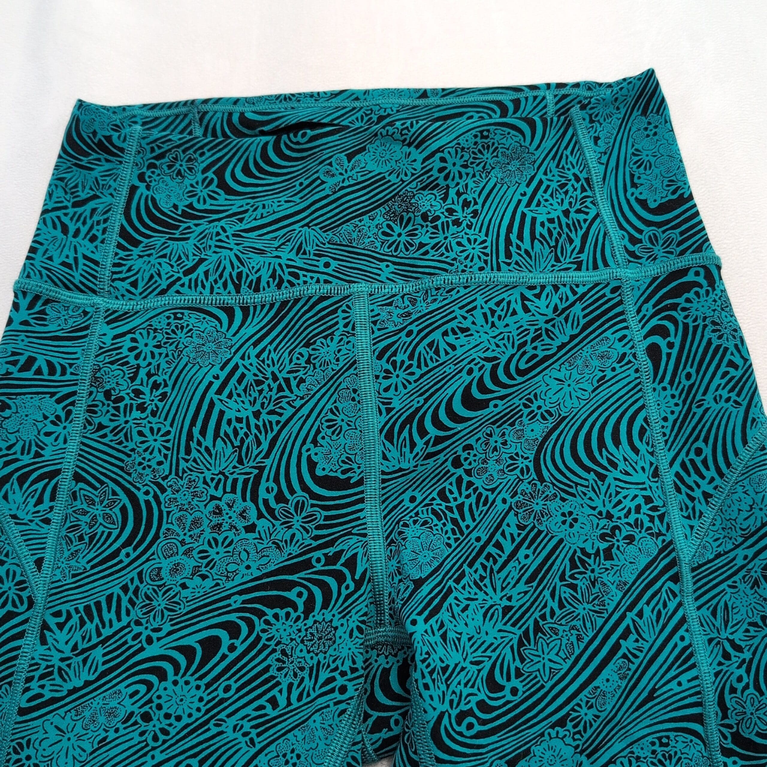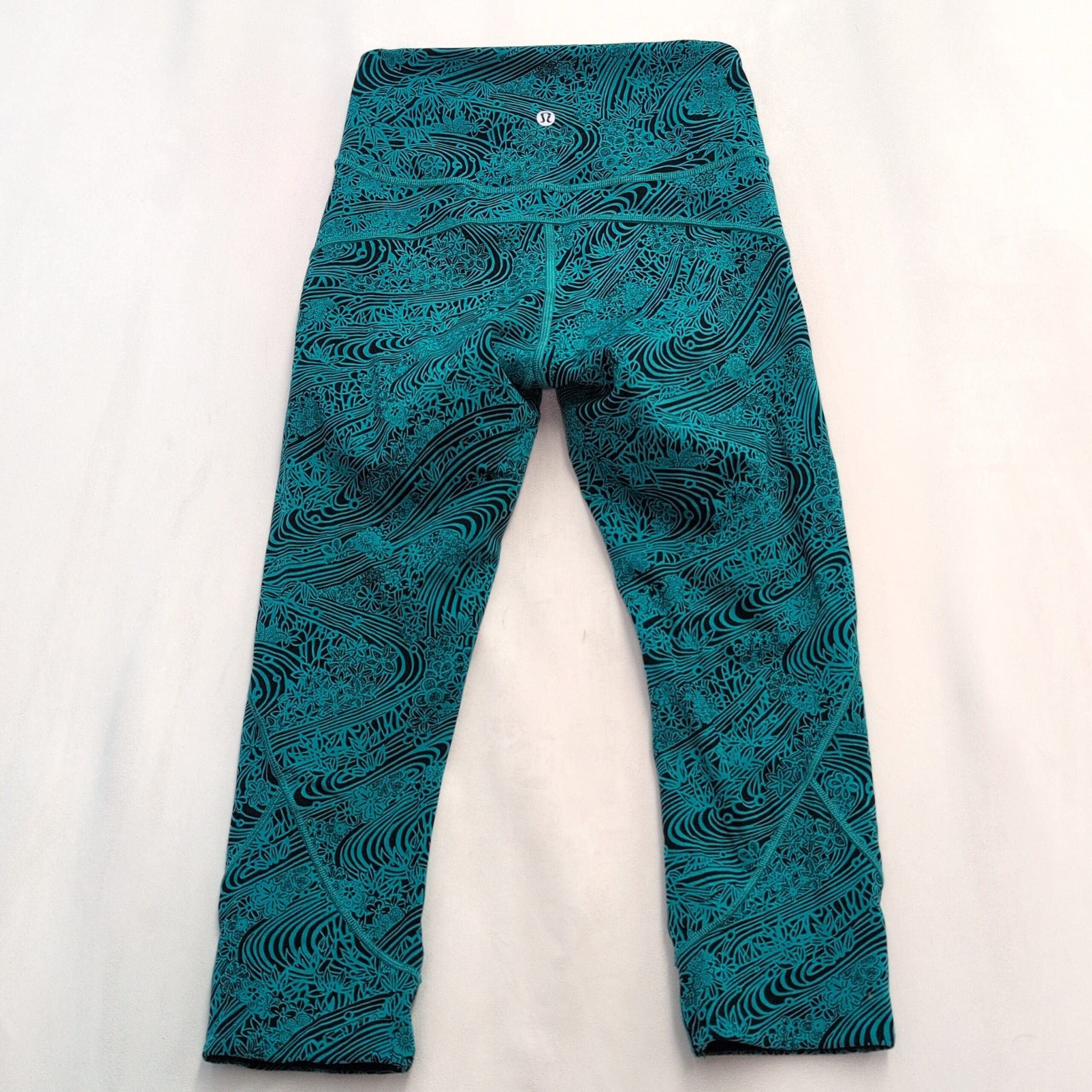 Lululemon women’s leggings in size 4. Black base with a vibrant teal swirl and floral print — eye-catching yet versatile. High-rise wide waistband provides a flattering, supportive fit. Four-way stretch fabric moves with you for yoga, studio workouts, or everyday athleisure. Clean flatlock seams and thoughtful paneling offer comfortable, chafe-free wear. Gently used — free of major rips, tears, stains, or flaws; typical light wear may be present. See photos for details.