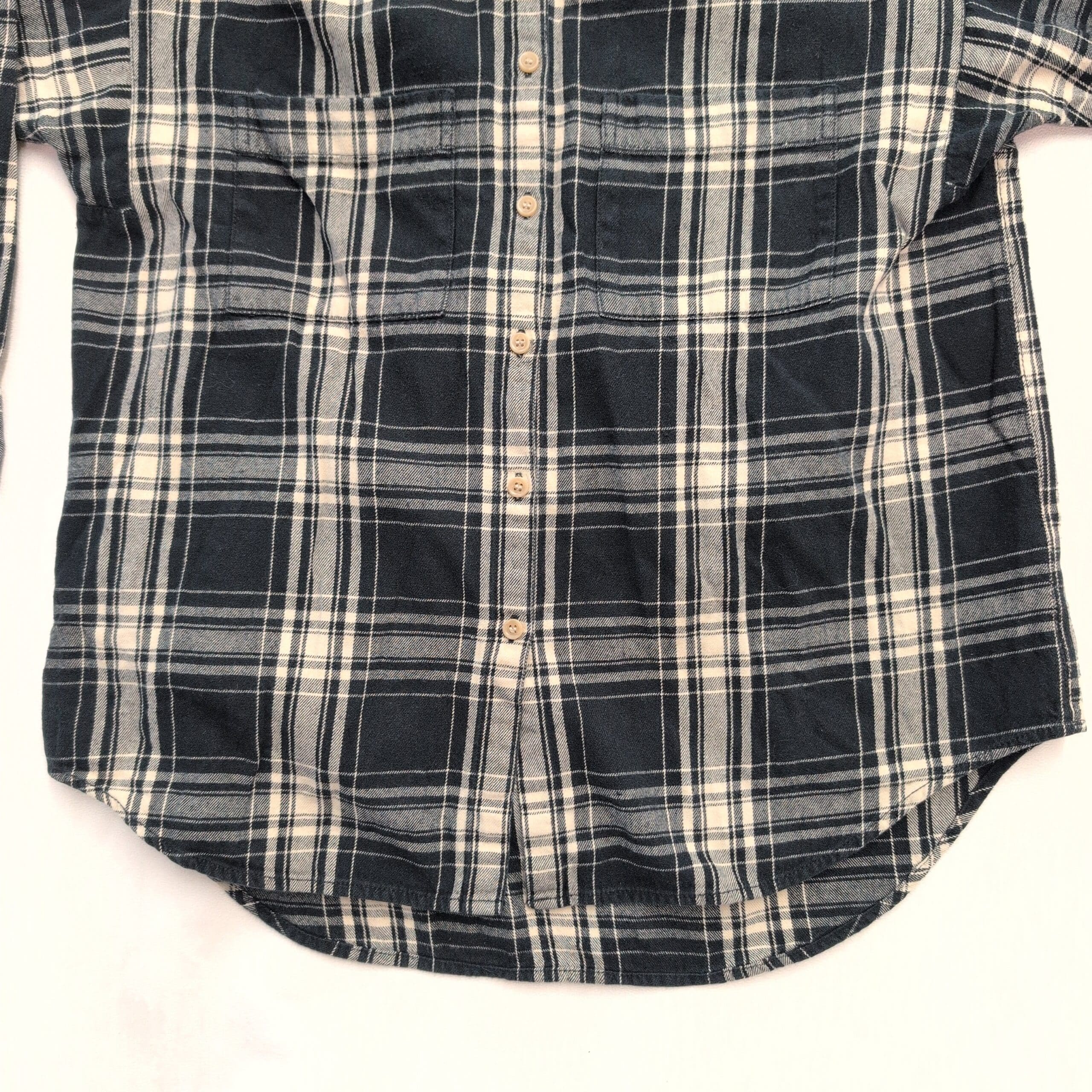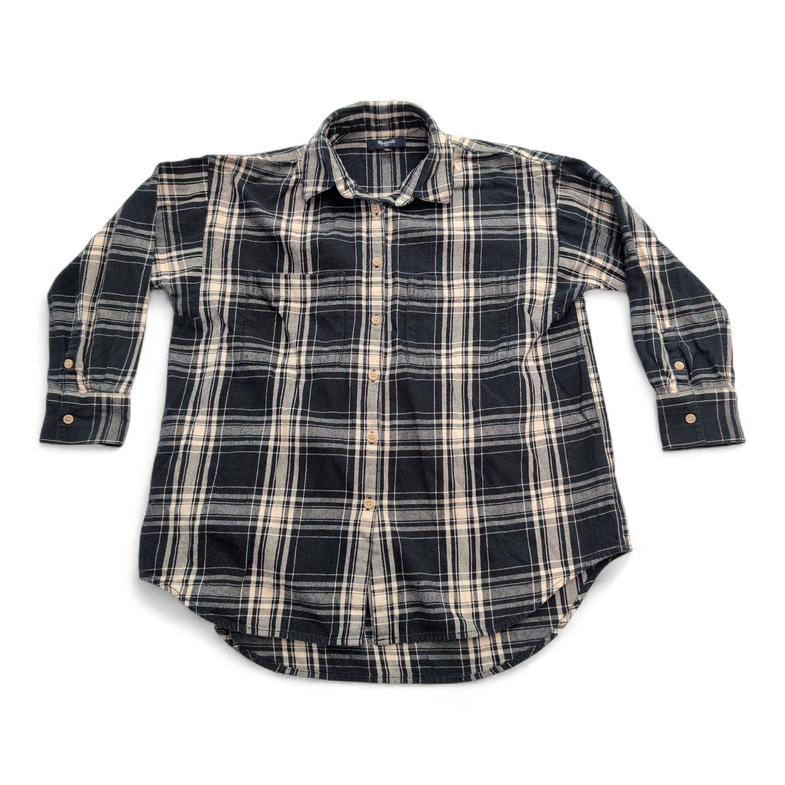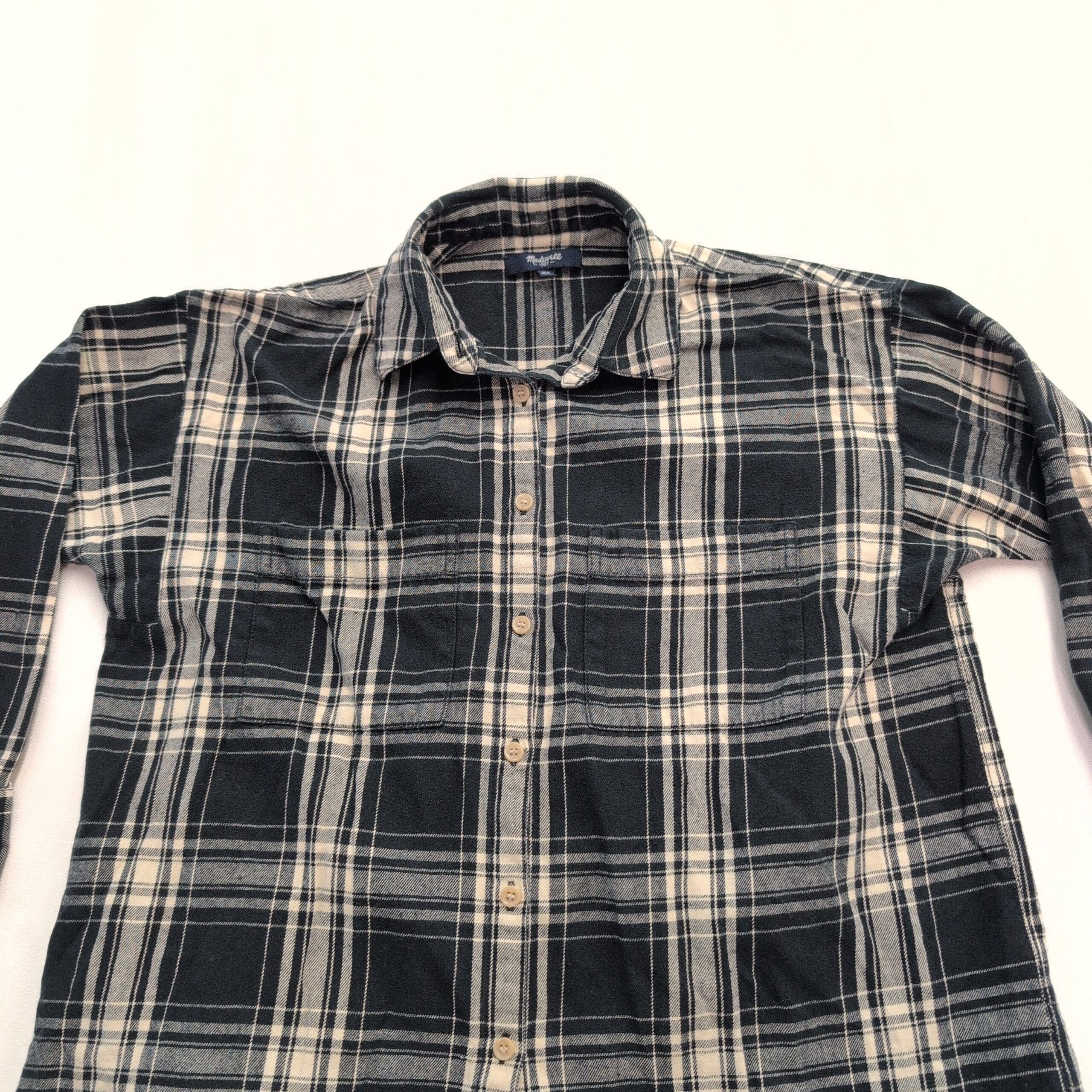 Classic Madewell long-sleeve button-down in black and cream plaid. Features a pointed collar, full button front with natural-tone buttons, single chest pocket, button cuffs, and a curved shirttail hem for a relaxed silhouette. Soft woven plaid ideal for layering or wearing on its own.