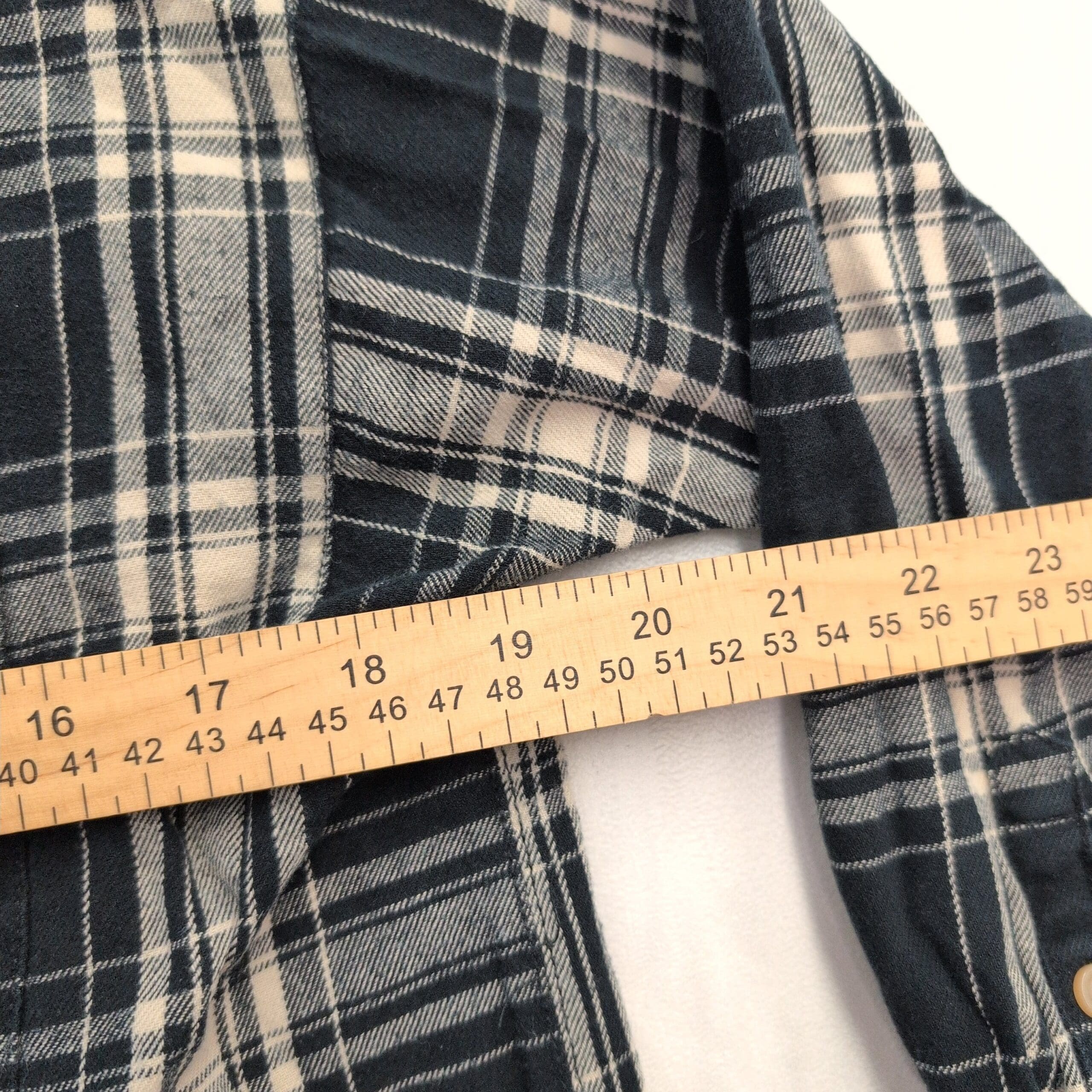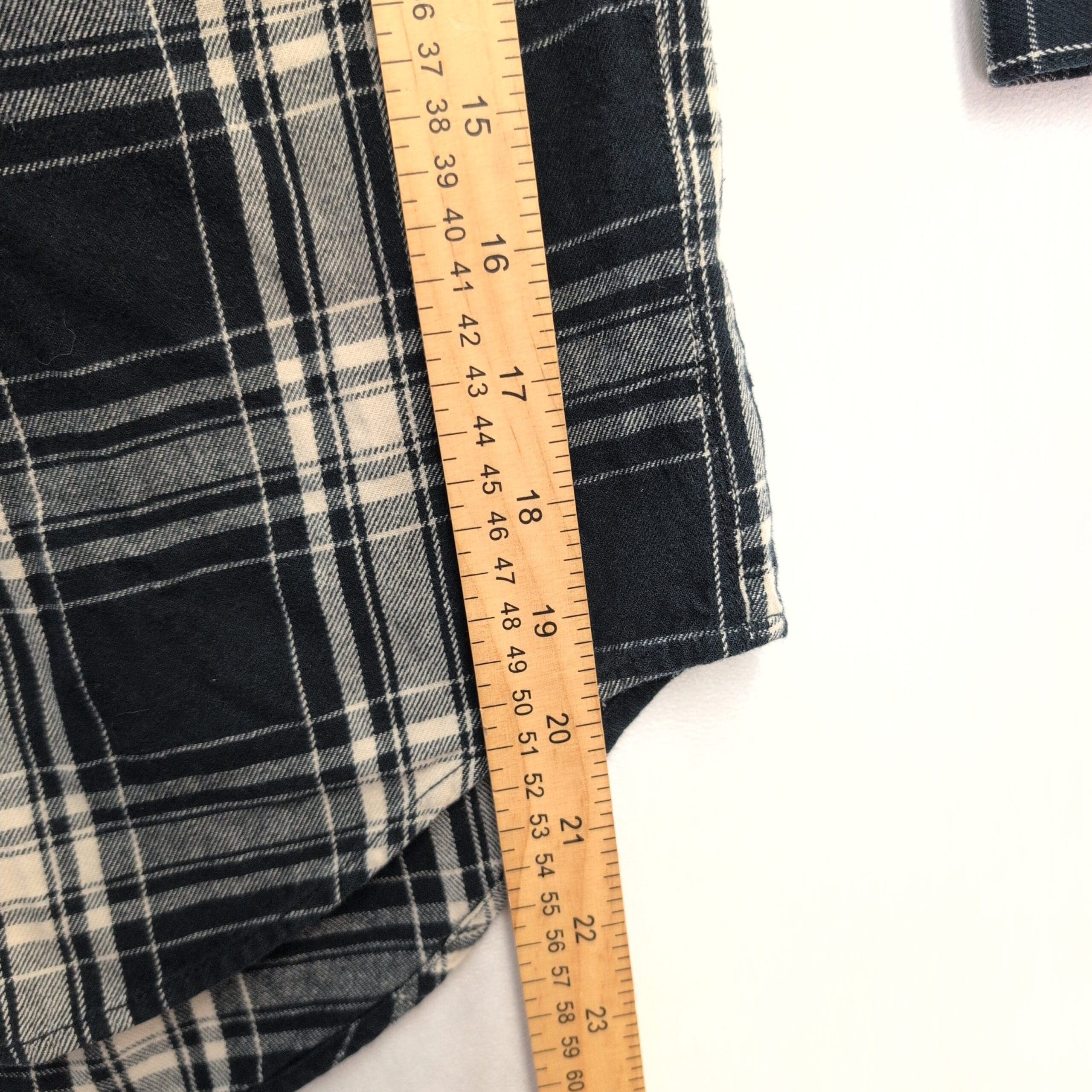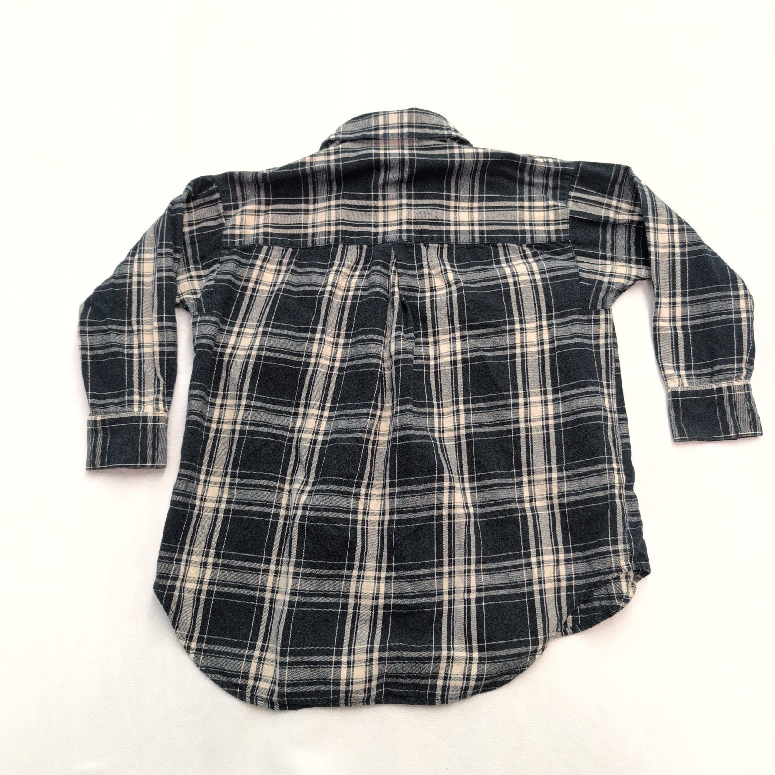 Classic Madewell long-sleeve button-down in black and cream plaid. Features a pointed collar, full button front with natural-tone buttons, single chest pocket, button cuffs, and a curved shirttail hem for a relaxed silhouette. Soft woven plaid ideal for layering or wearing on its own.