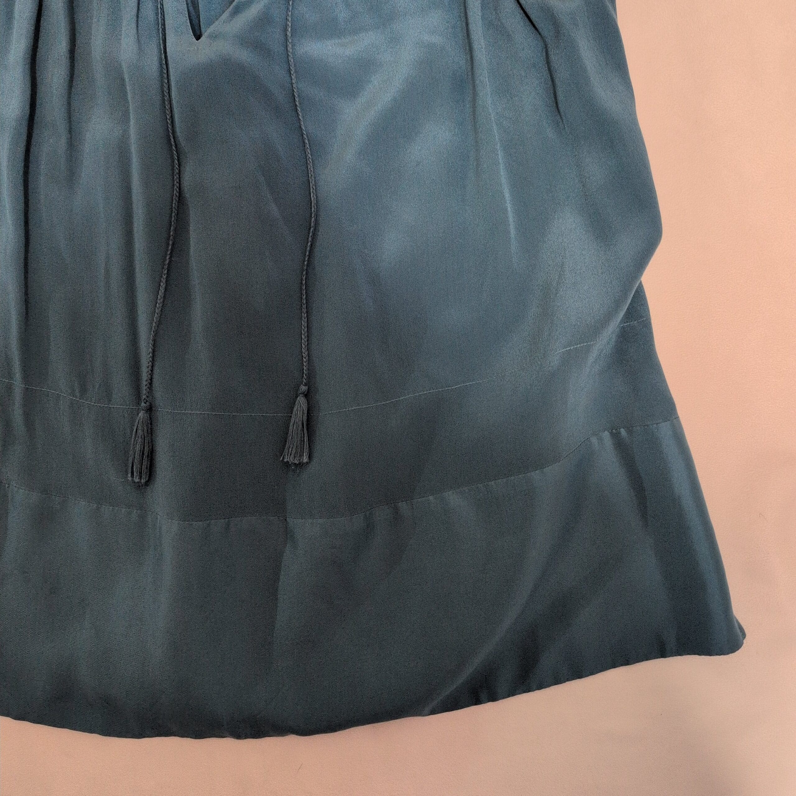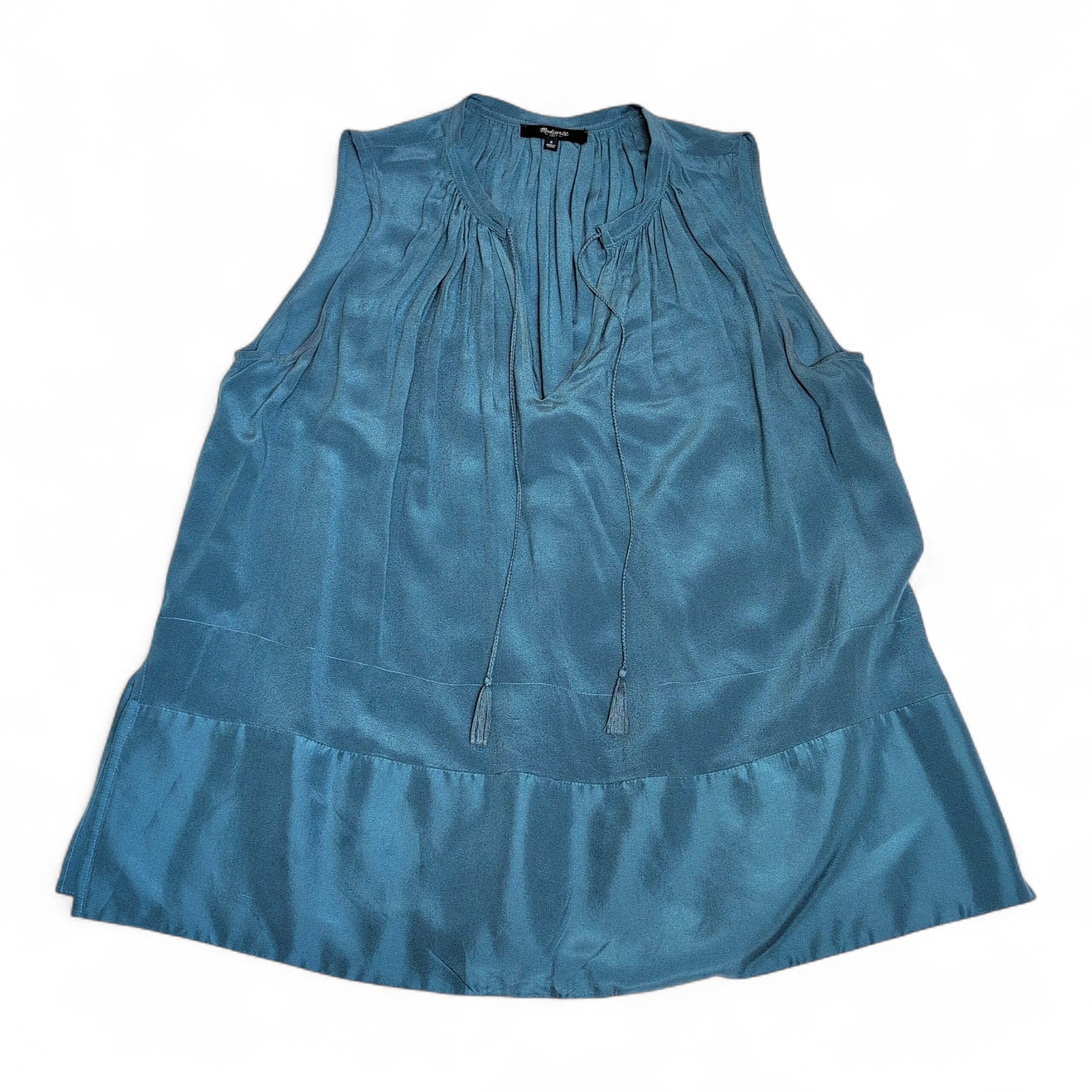 Madewell sleeveless blouse in a muted blue, size S. Features a pleated neckline with a keyhole and tasseled ties, a flowy A-line silhouette, and a ruffled hem. Silky-feel, lightweight fabric that dresses up or down for casual or more polished looks.