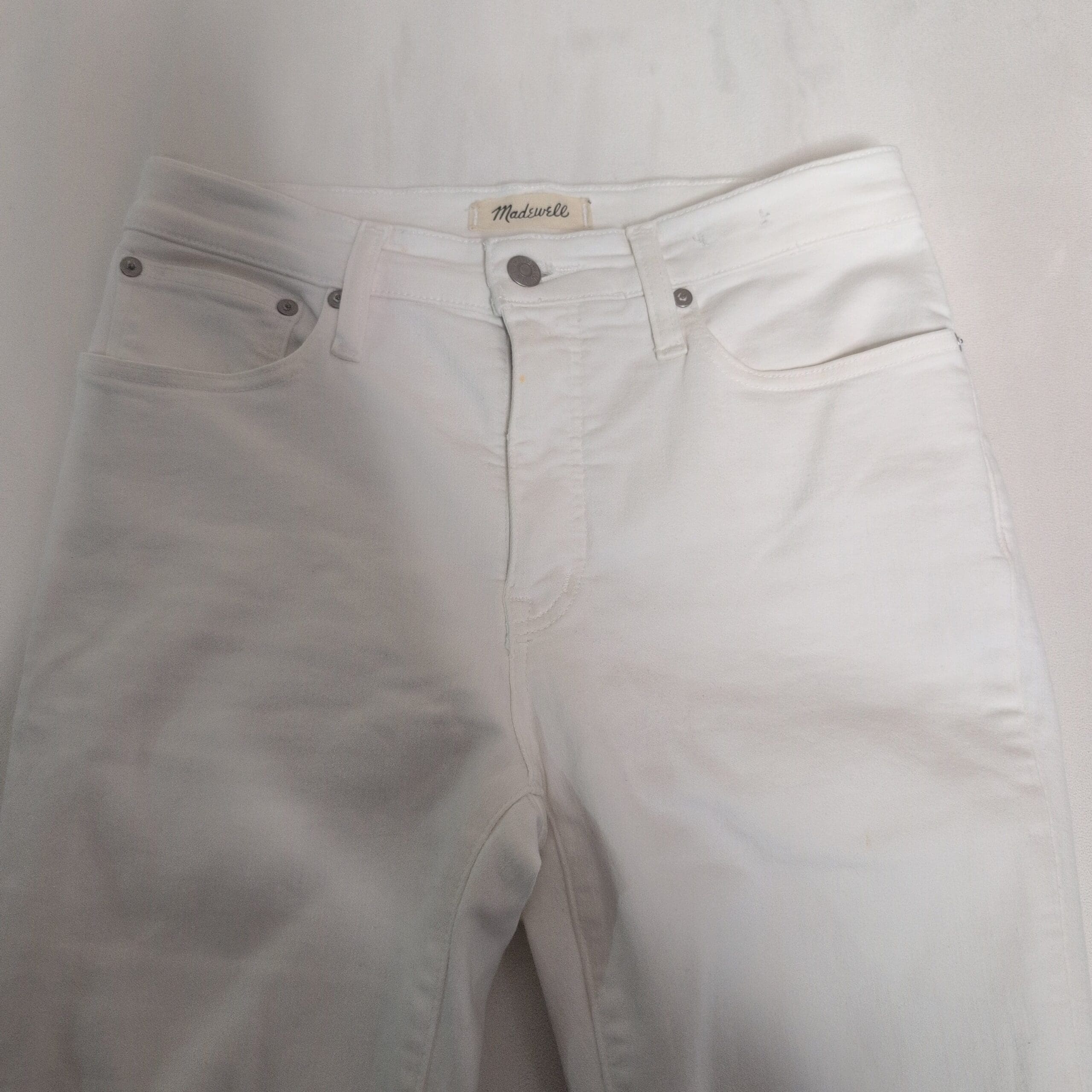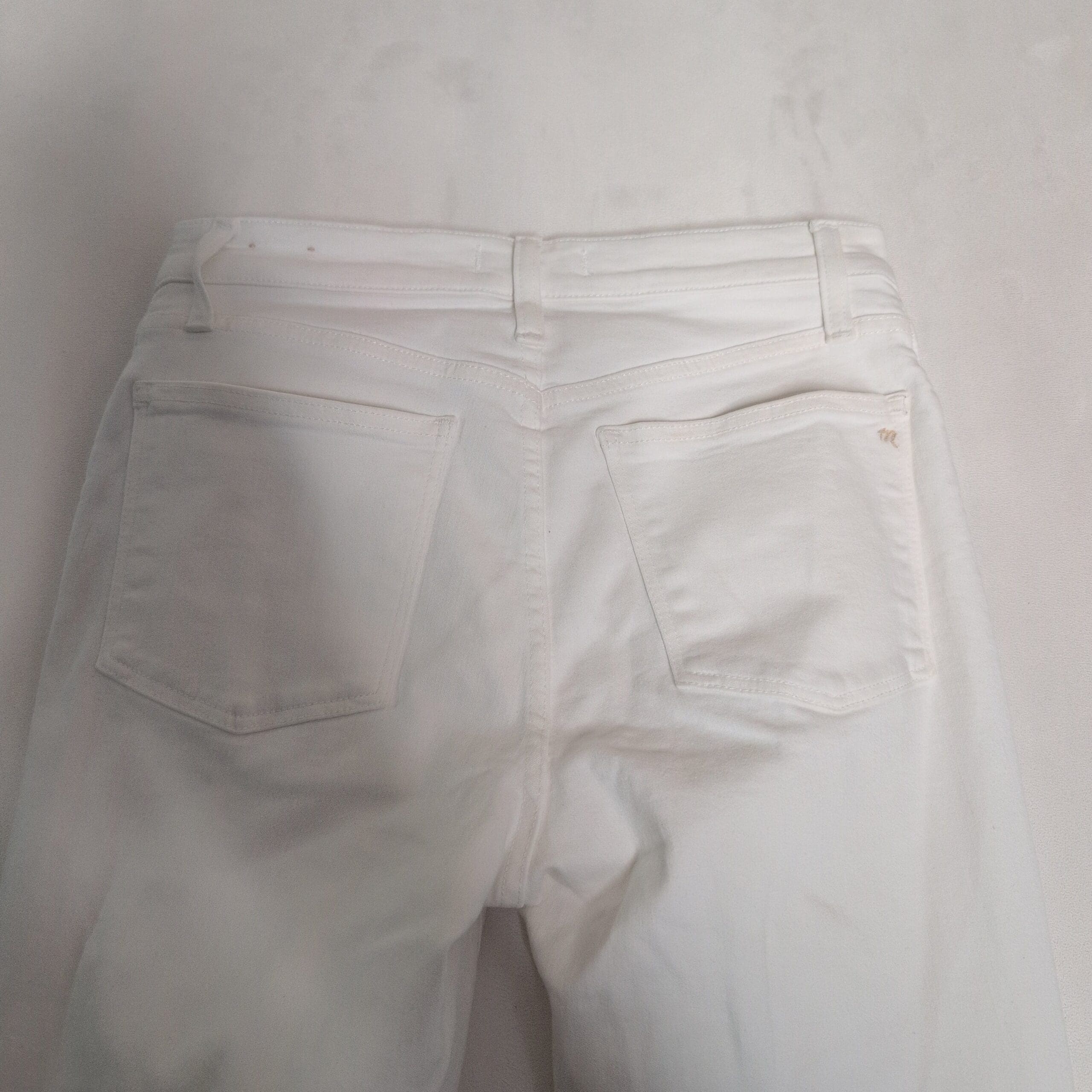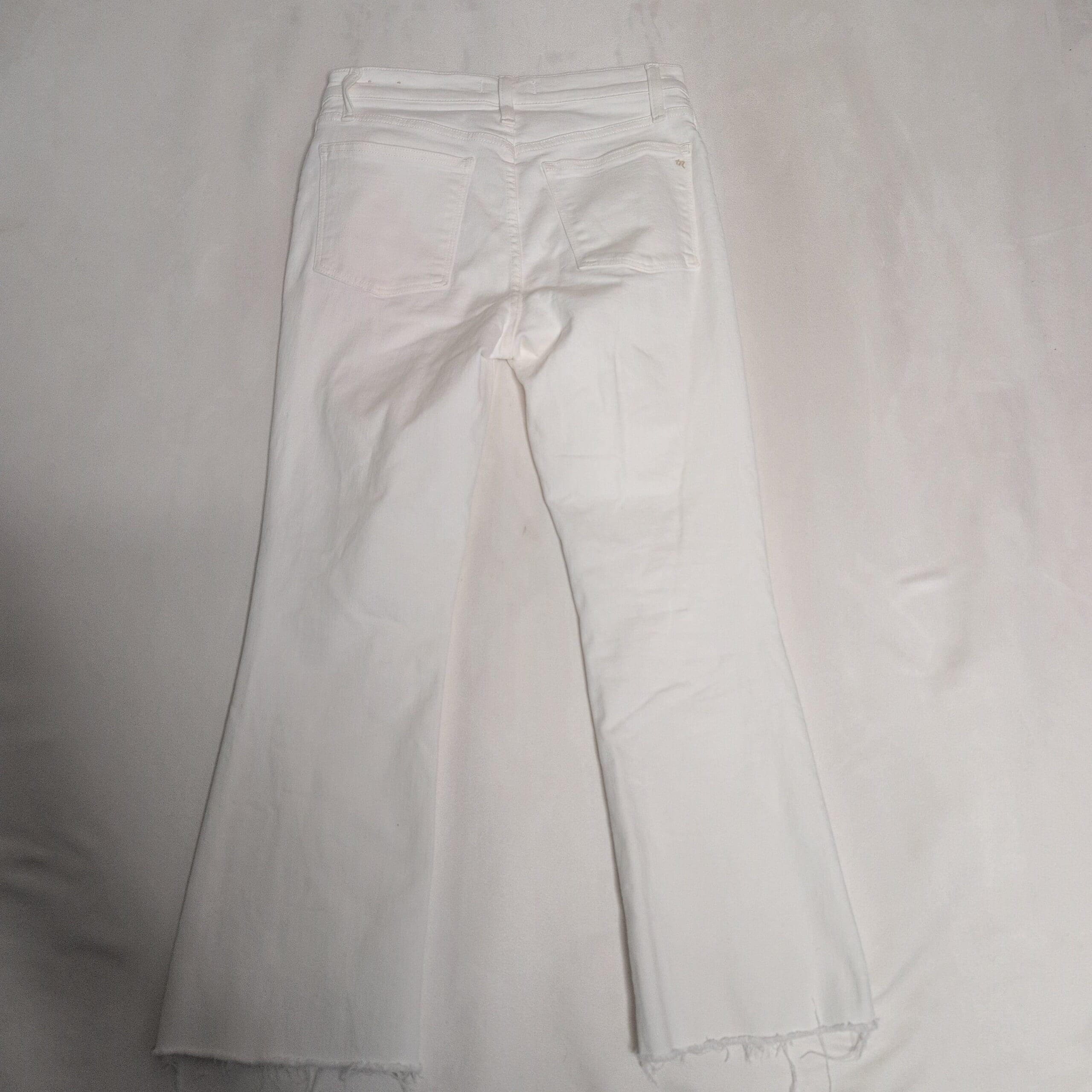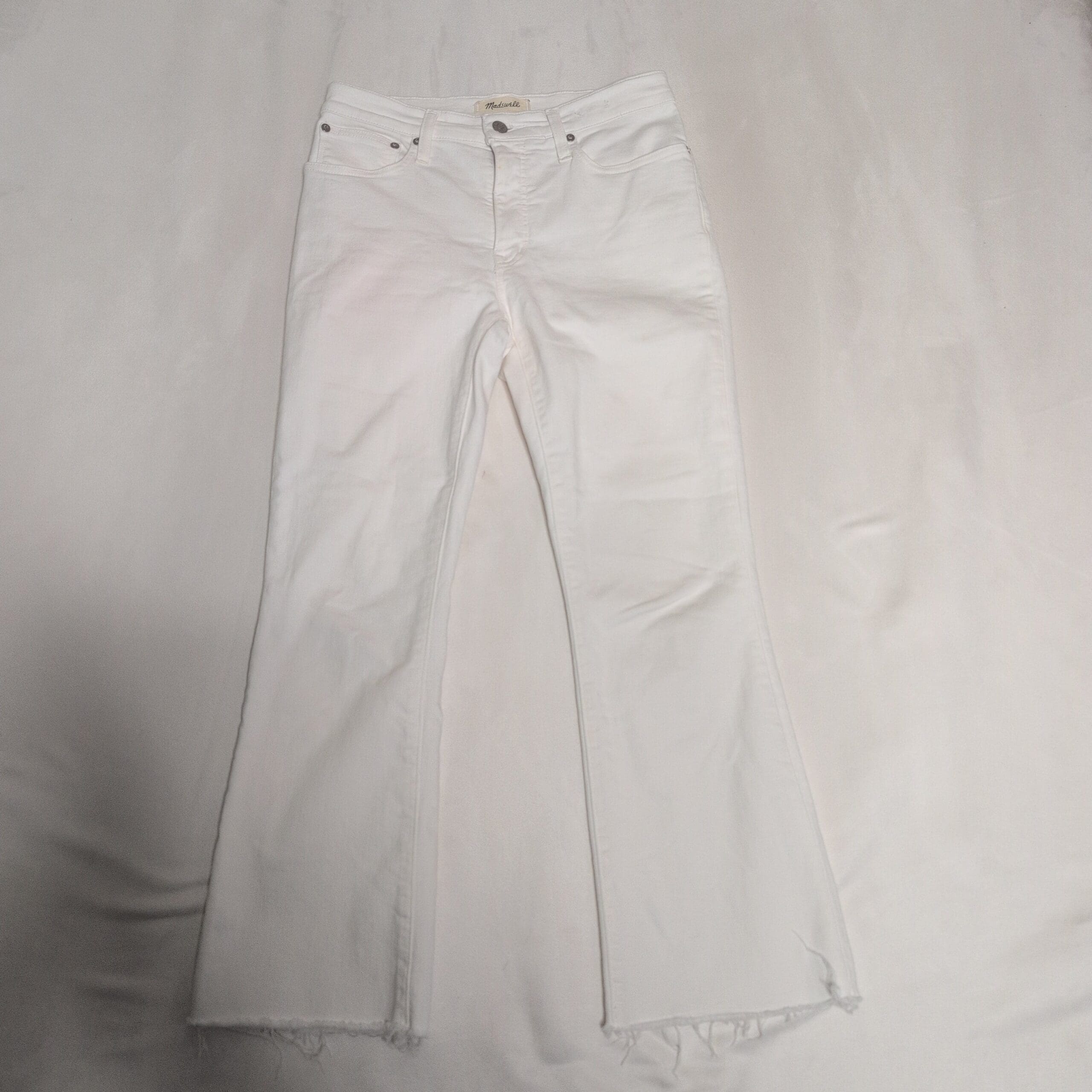 Madewell Cali Demi Boot in white, women’s size 28. Gently used white denim with a flattering bootcut silhouette, subtle flare from the knee and a raw frayed hem. Five-pocket styling with button and zipper closure — versatile for casual or dressier looks.