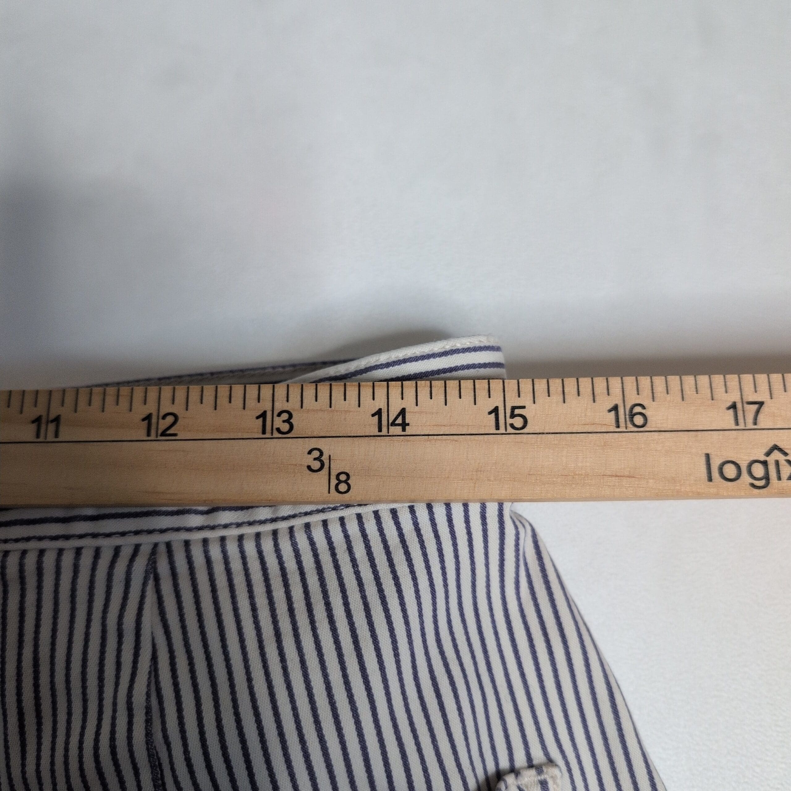 Madewell high-waist women’s shorts in blue with narrow vertical pinstripes. Features a high rise waistband, button-and-zip closure, and welt pockets at the back. Clean, gently used condition with no visible stains, holes, or major wear. Size: 31 (Standard).