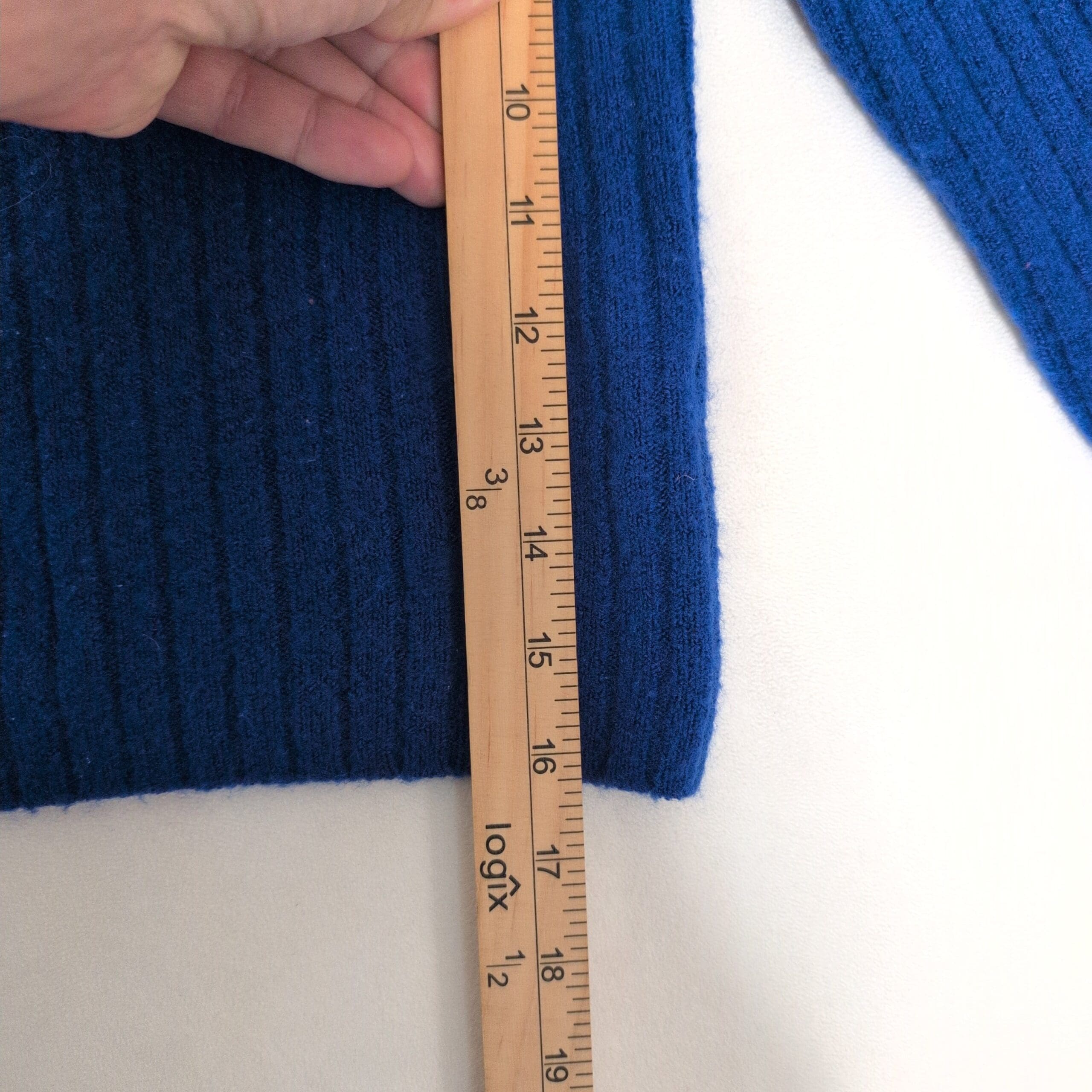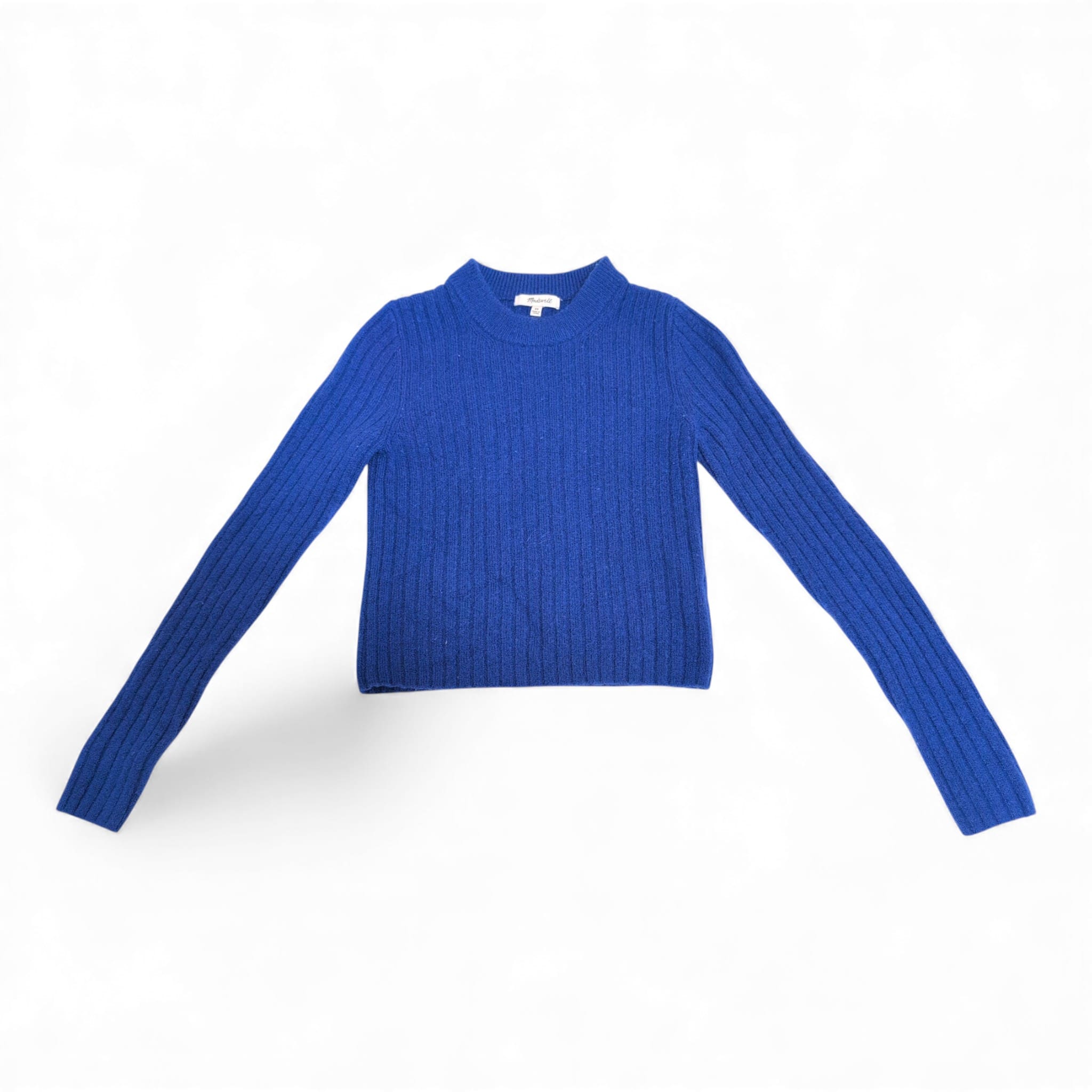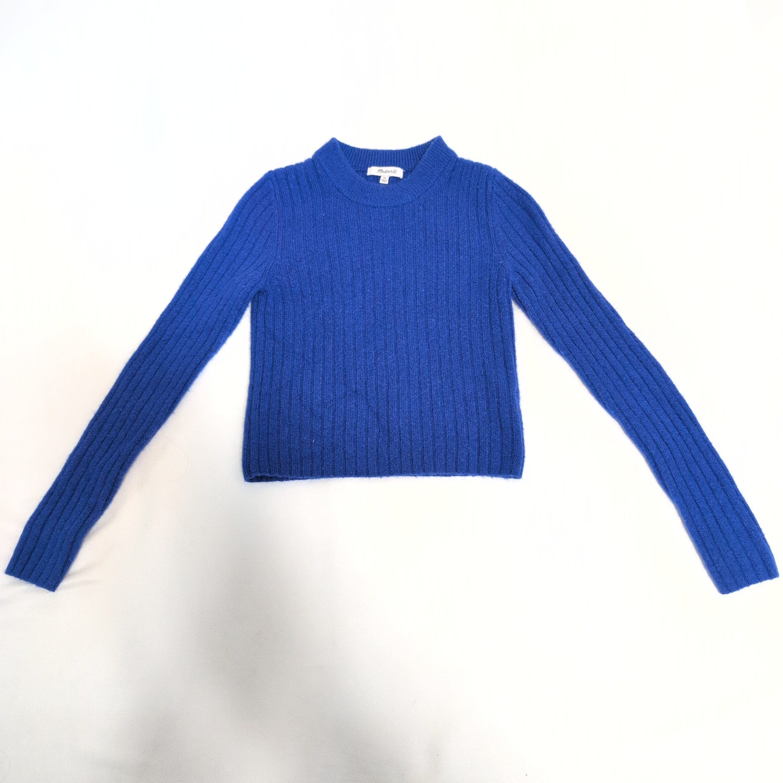 Madewell ribbed crop crewneck sweater in a vibrant royal blue. Size XS (standard). Midweight, soft ribbed knit with a classic crew neckline, long sleeves, and a slightly cropped hem — perfect for layering over dresses or pairing with high-rise jeans. Versatile everyday piece from Madewell that adds a pop of color to fall and winter wardrobes. Fiber content not specified; please refer to the garment tag in photos for material and care details. Pre-owned — please review photos and message with any questions or to request additional measurements or close-up images.