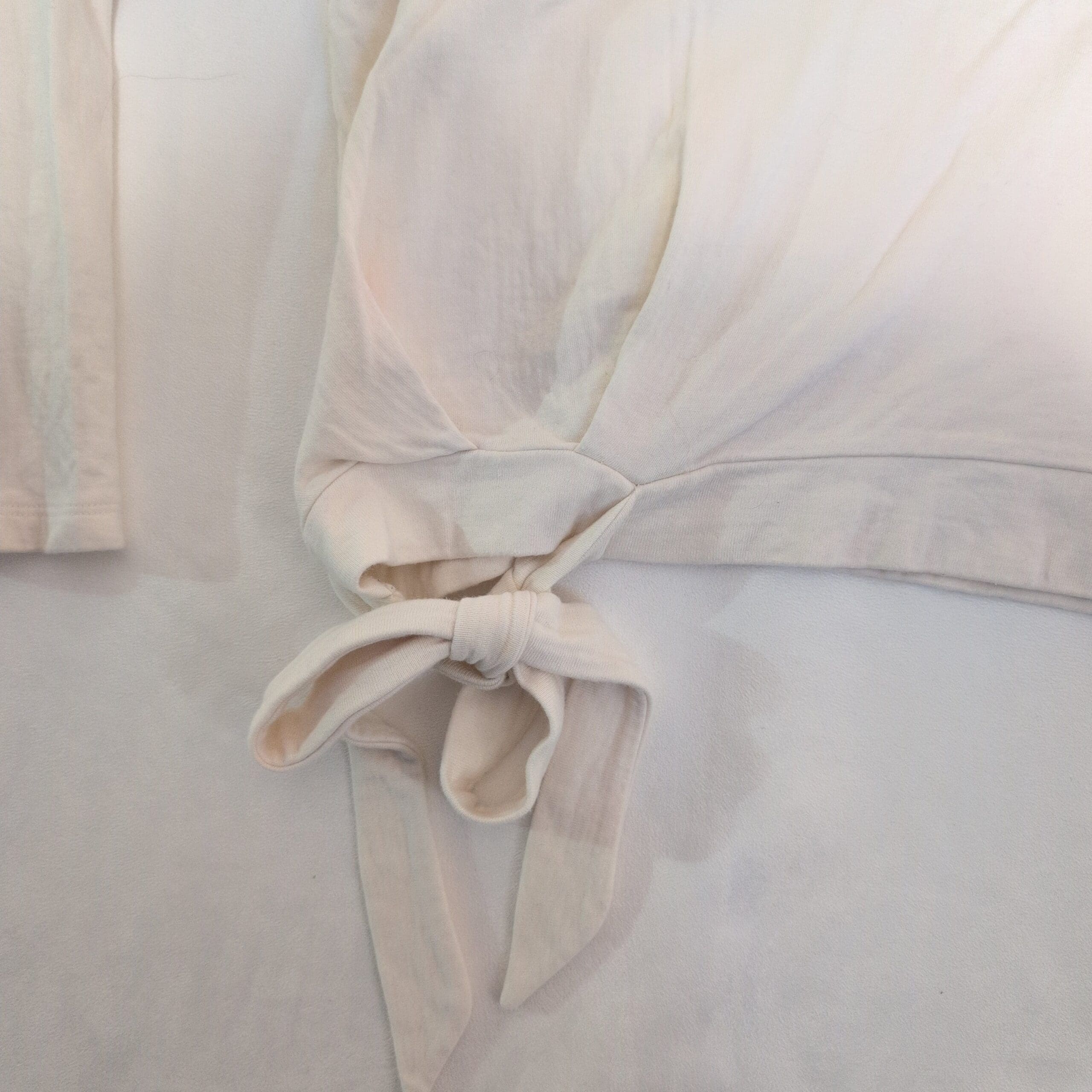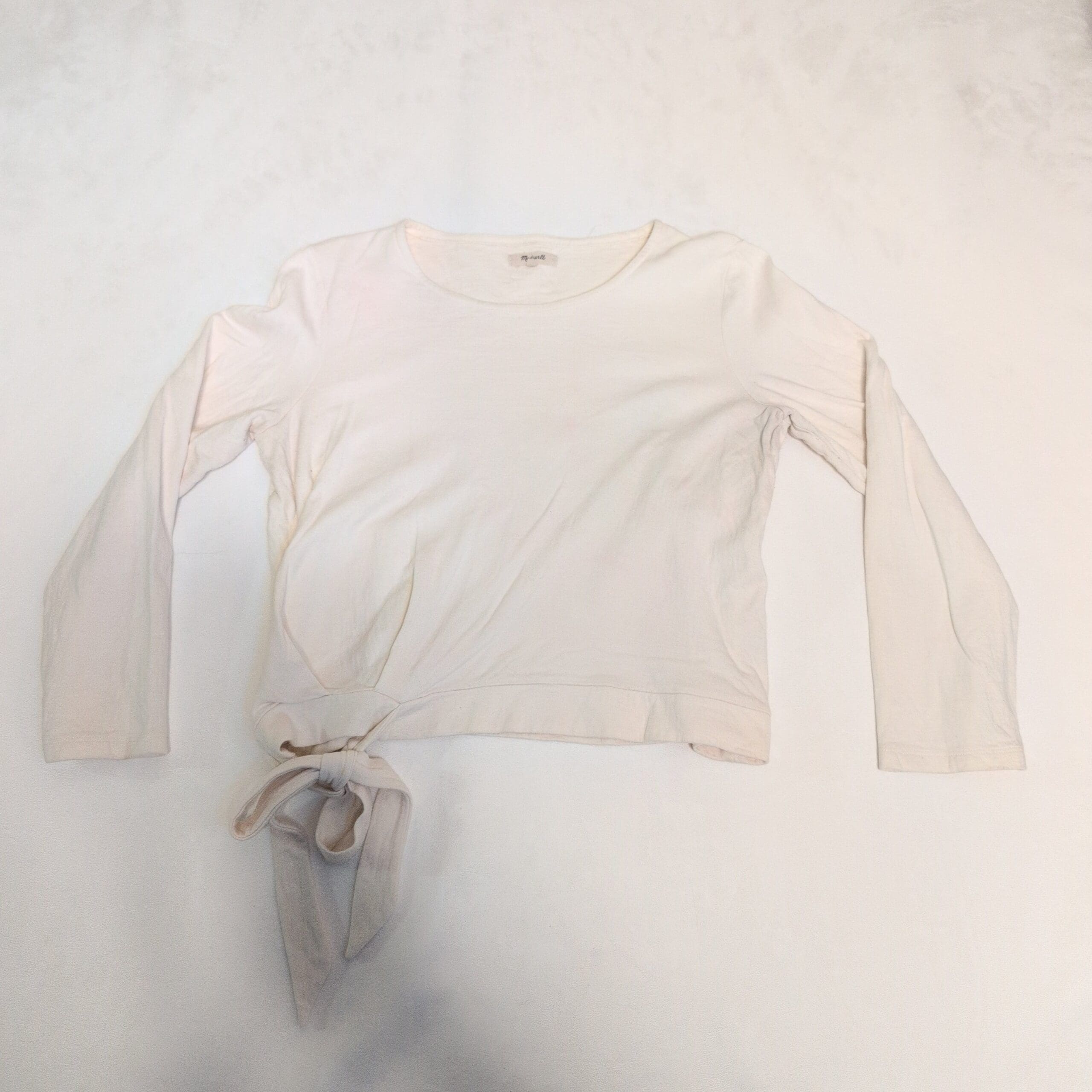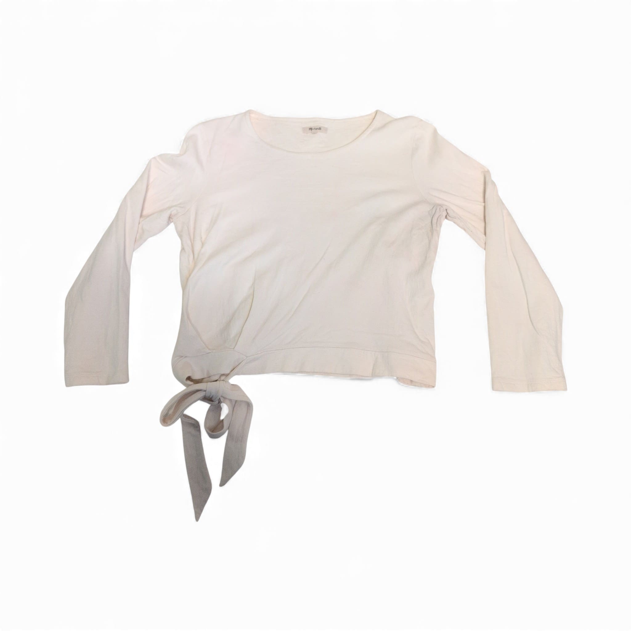 Madewell long sleeve tee in white, size L. Features a classic crew neckline and a tied side-hem detail for a modern twist. Perfect for layering and pairs easily with jeans, skirts, or under jackets.