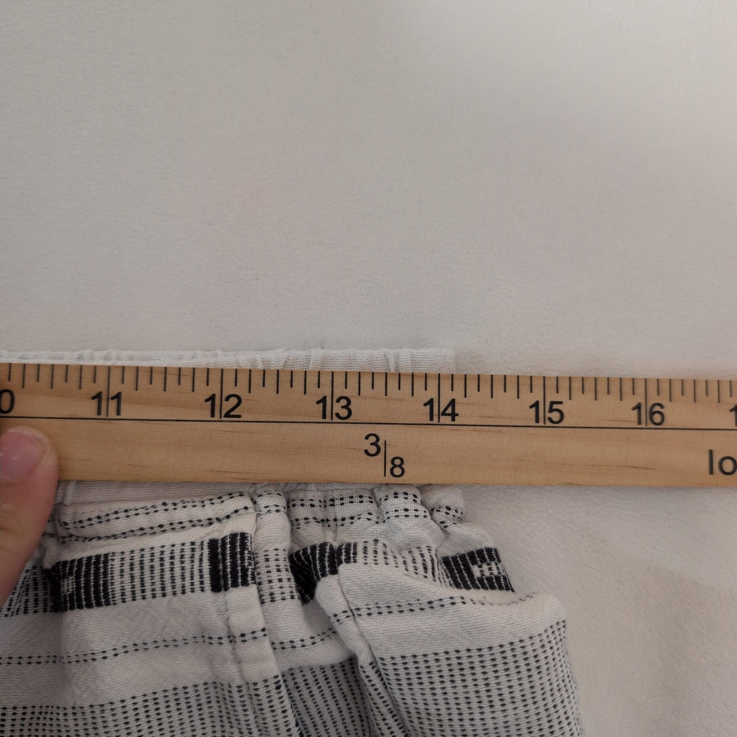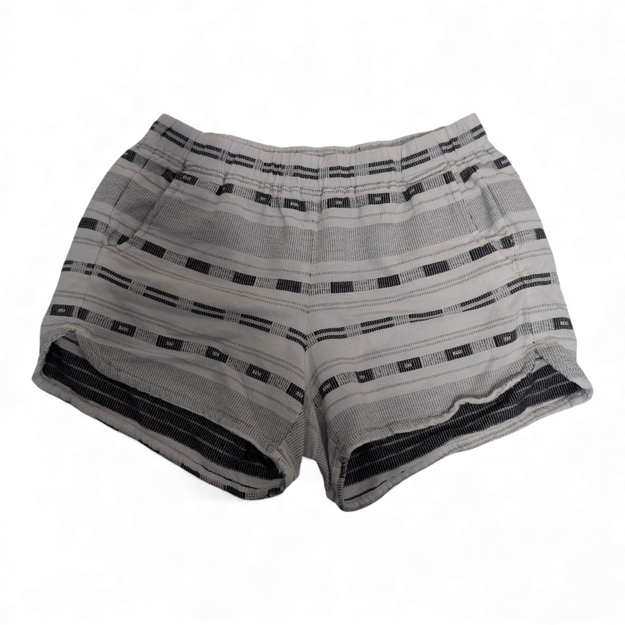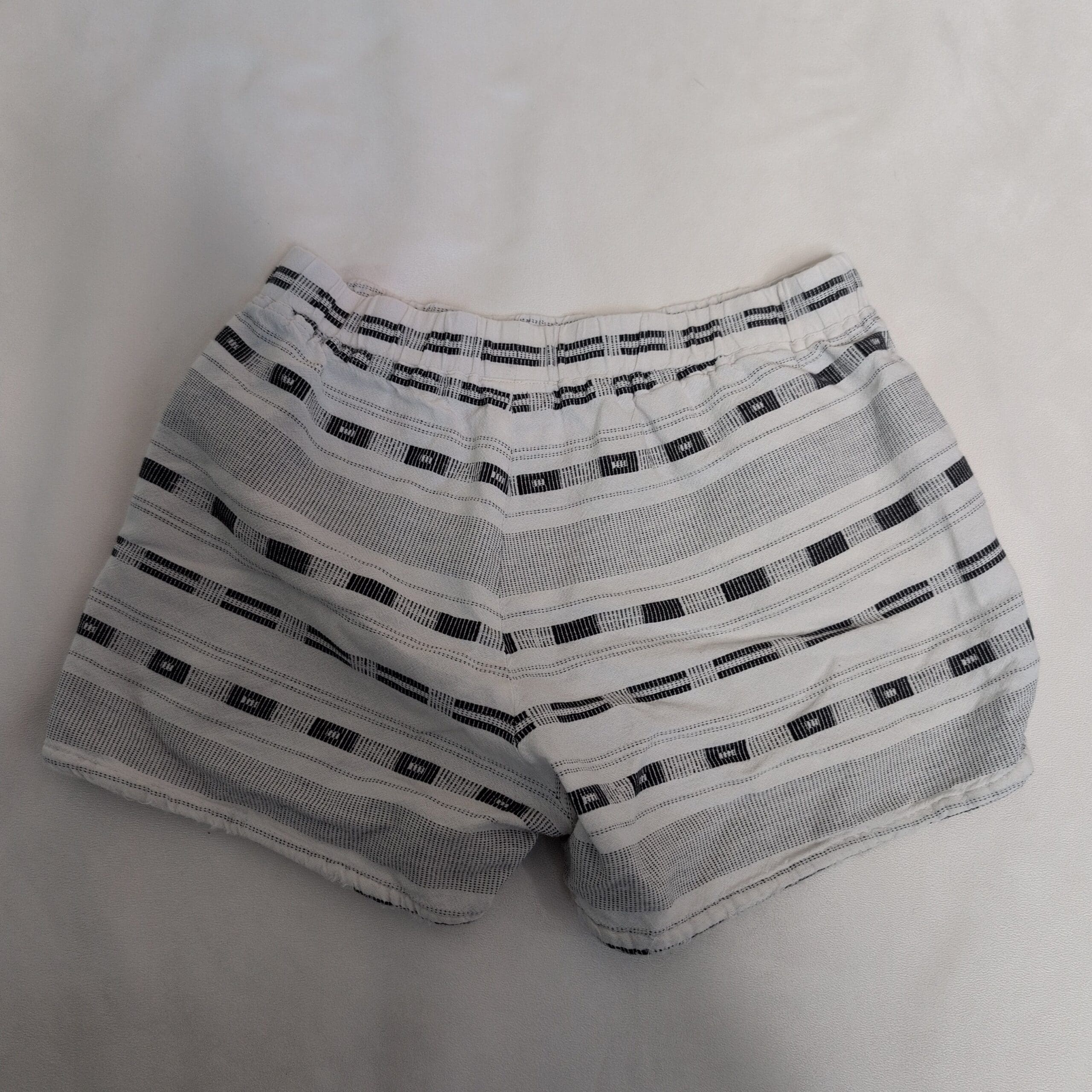 Madewell women’s white shorts with contrasting dark horizontal stripes. Lightweight woven construction with an elastic pull-on waistband, side pockets, and a relaxed short length — great for casual summer days. Pre-owned and in good condition with light signs of wear at the hems; no stains or holes visible.