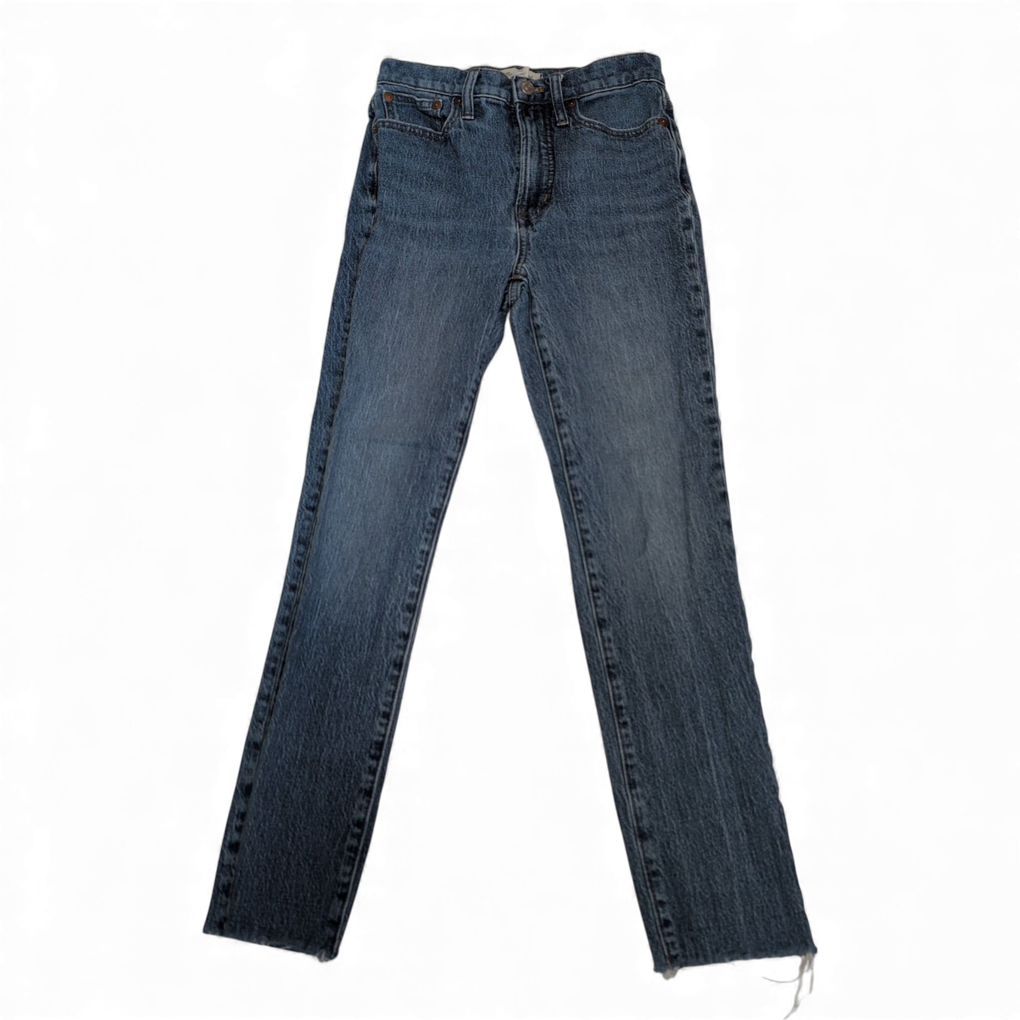 Madewell women’s straight leg jeans in blue, size 24. Classic five-pocket design with belt loops and a straight leg silhouette. Mid-blue wash with subtle fading and a raw frayed hem for a casual, modern look. Versatile pair that dresses up or down.