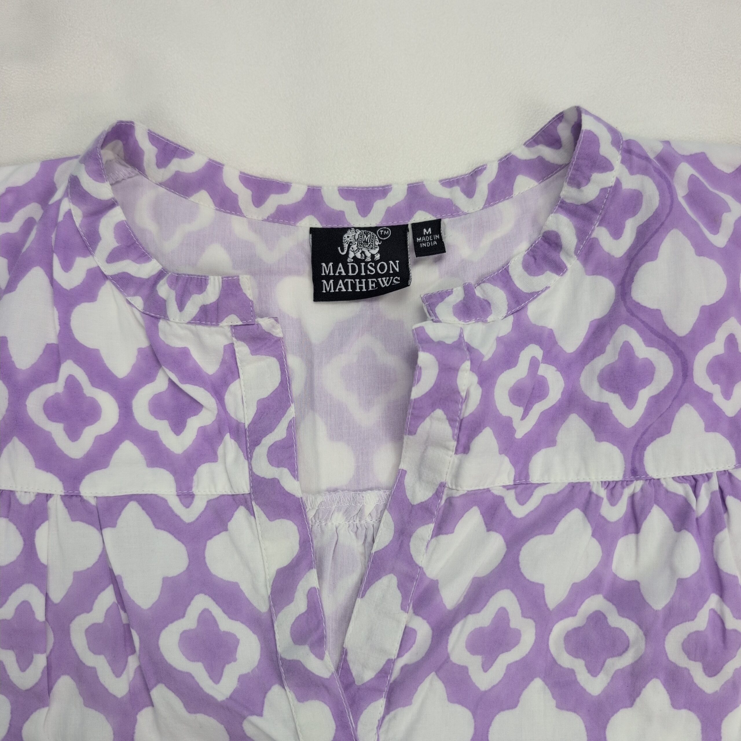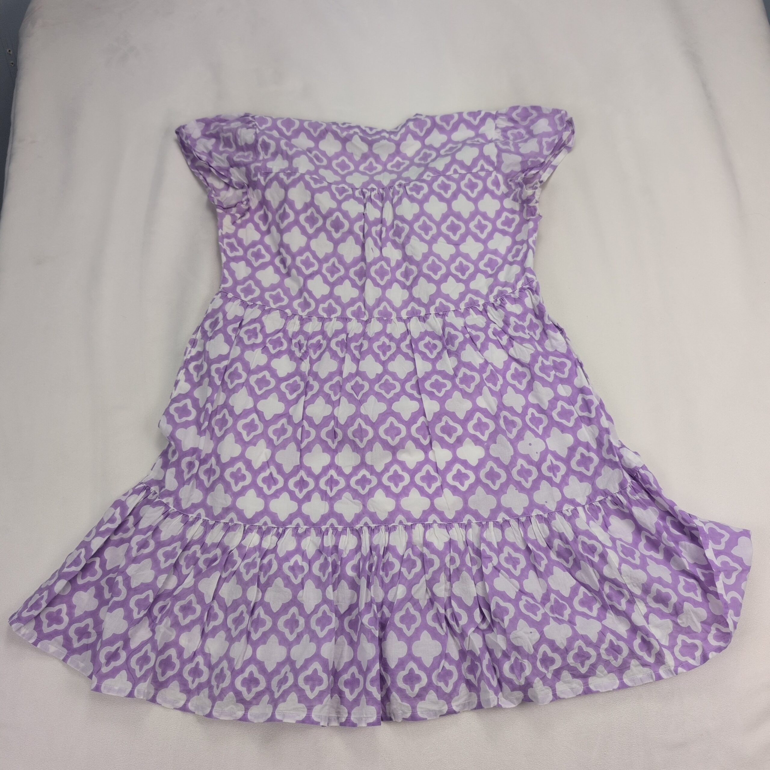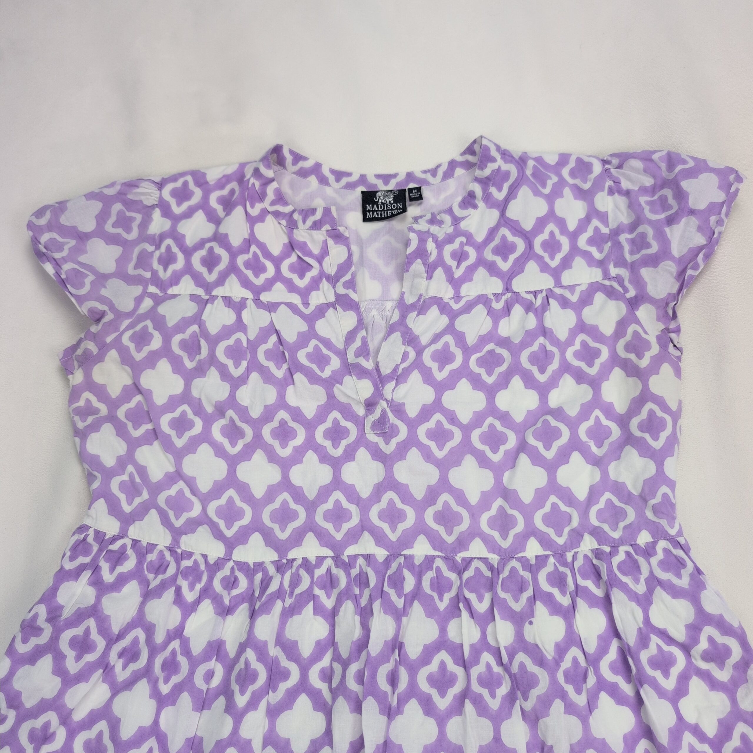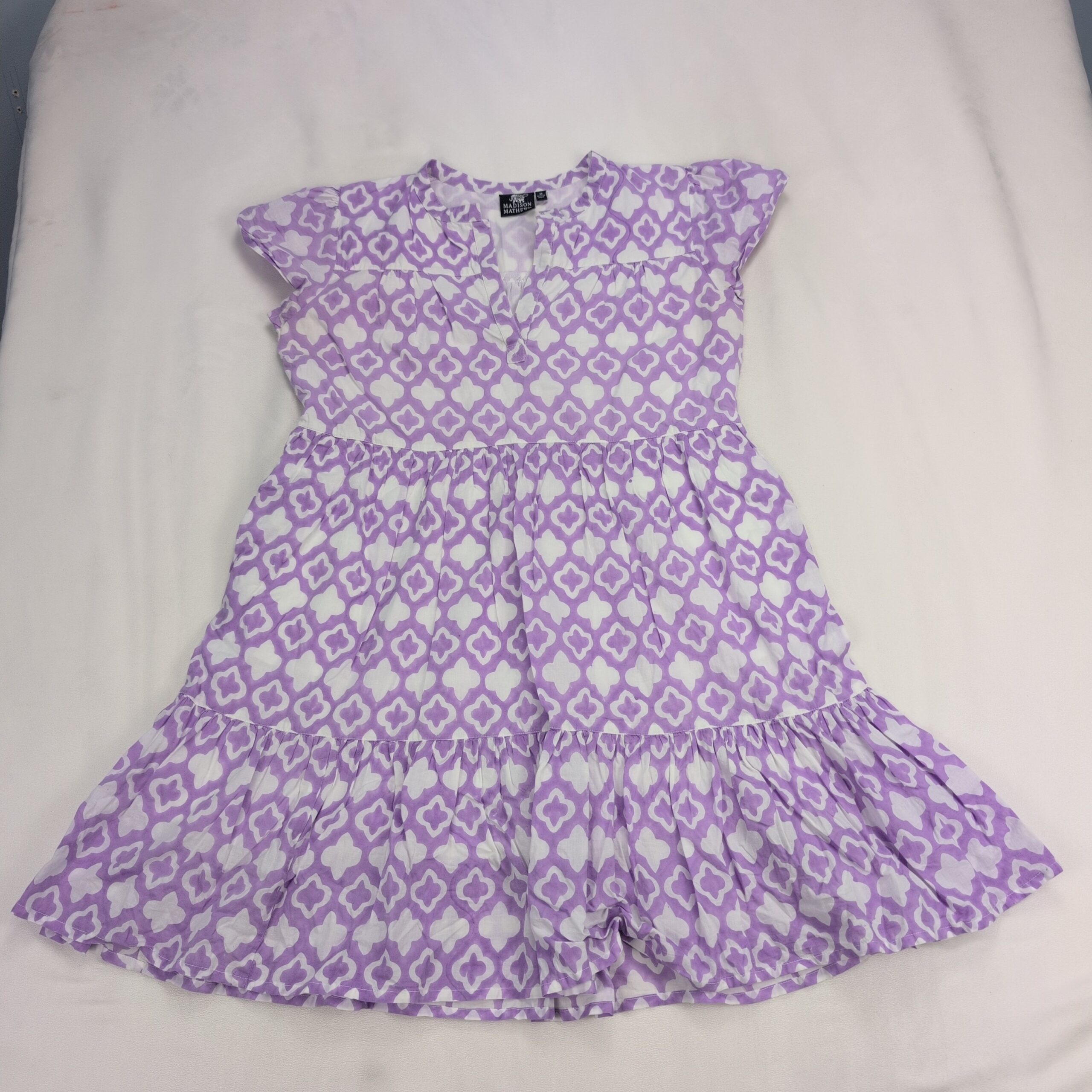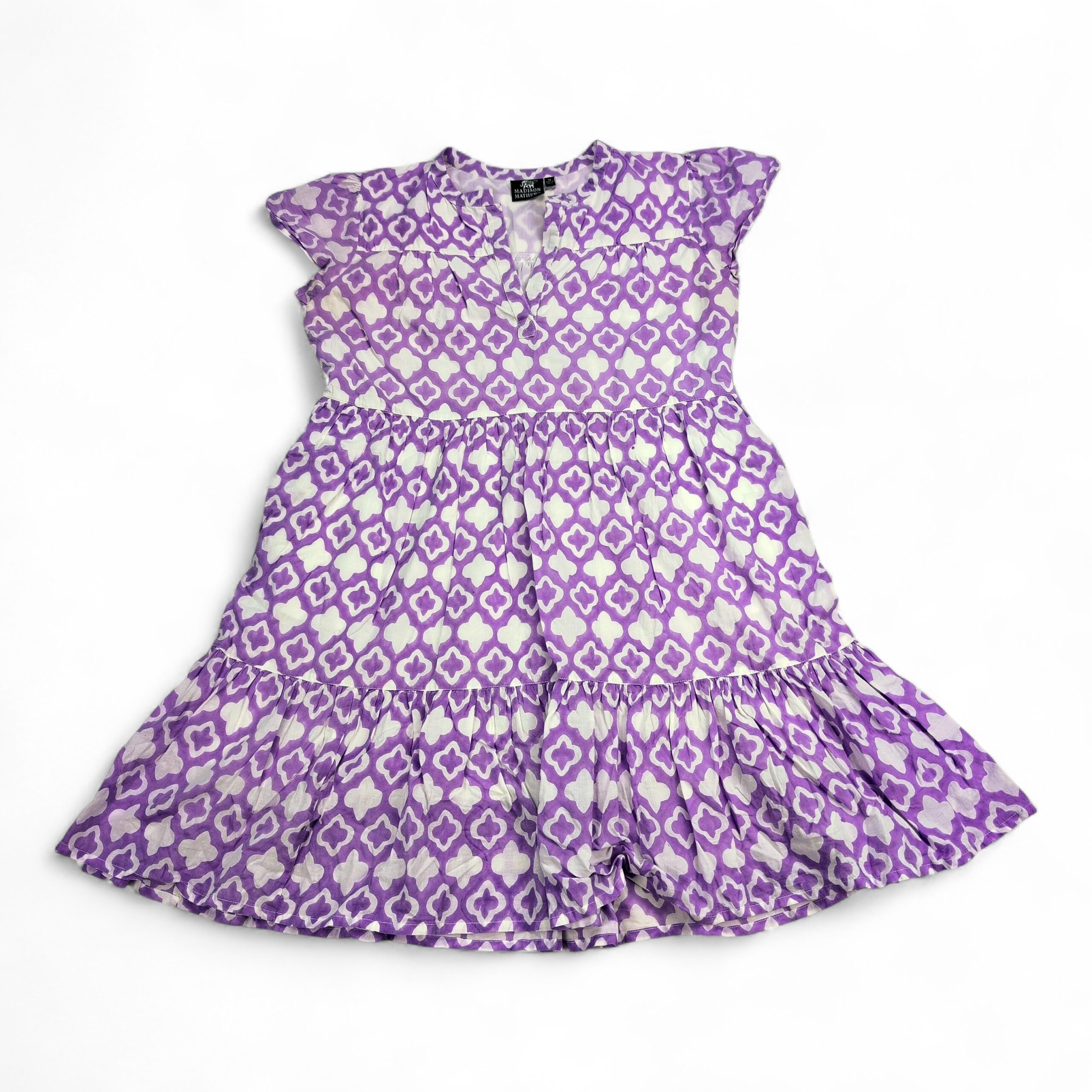 Madison Mathews women’s midi dress in size M. Purple and white geometric print with a V-notch neckline, flutter cap sleeves, gathered waist and a tiered ruffle hem for a breezy, feminine silhouette. Great for casual days, brunch, or vacation. Excellent used condition — free of major rips, tears, stains, or flaws; typical light wear may be present. Label: Madison Mathews.