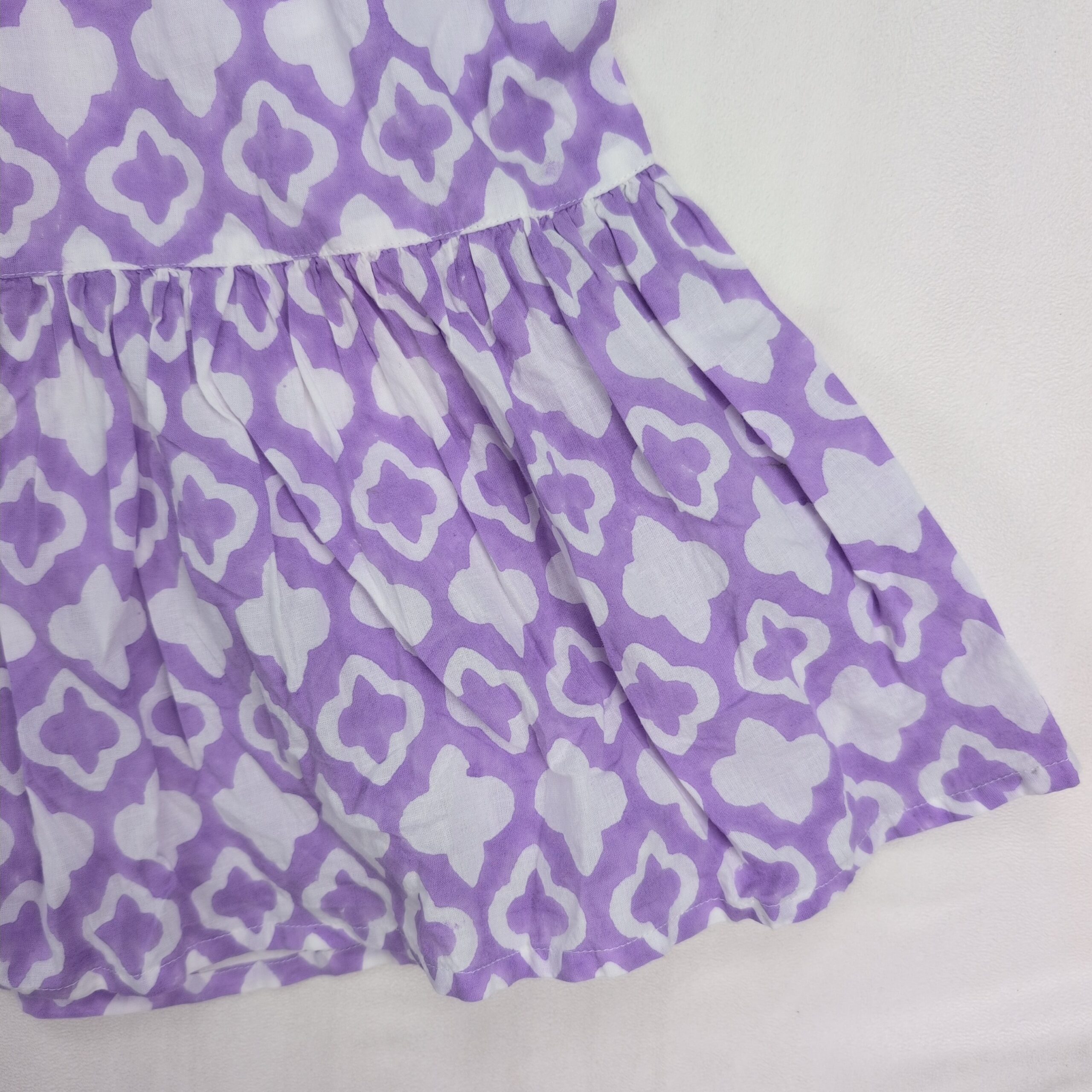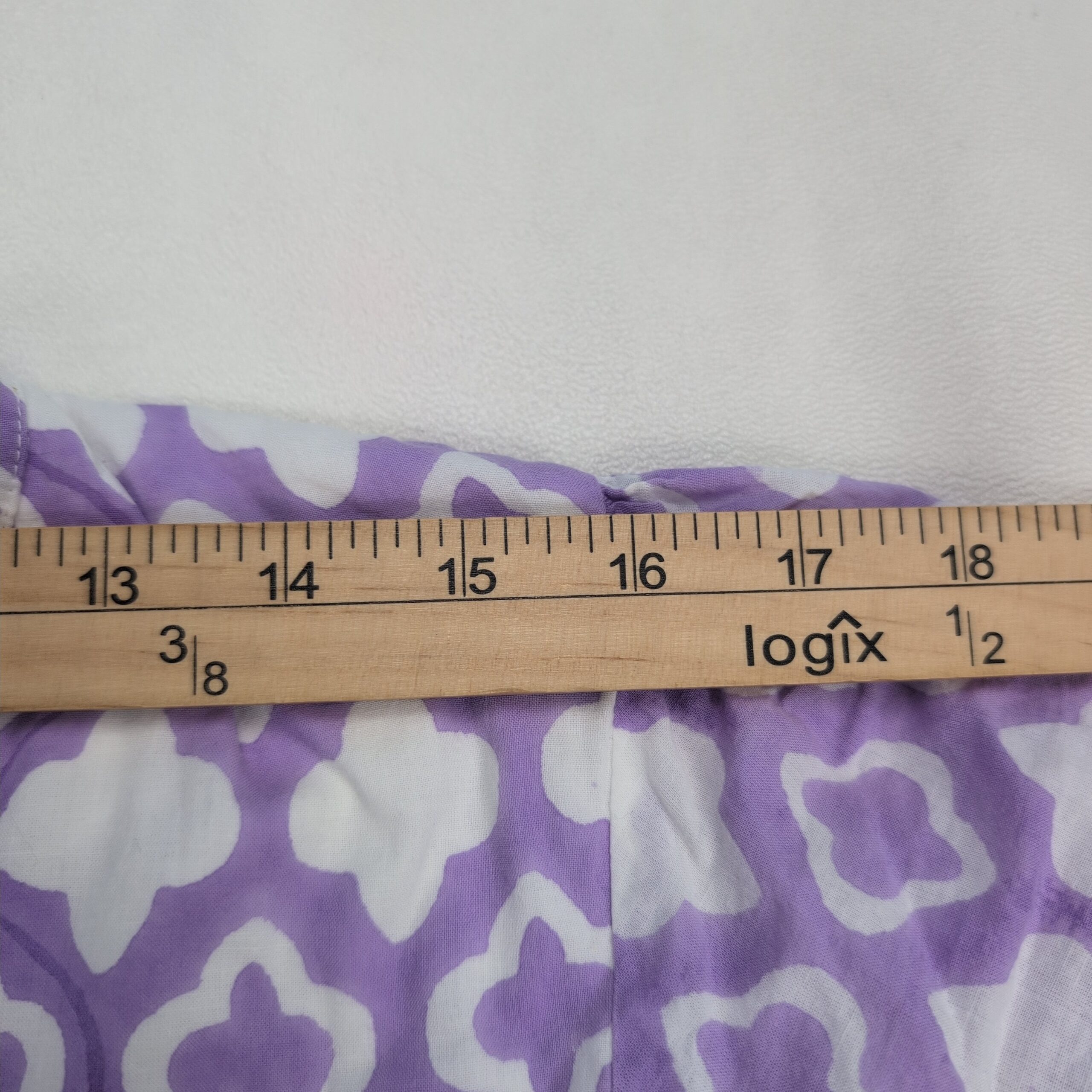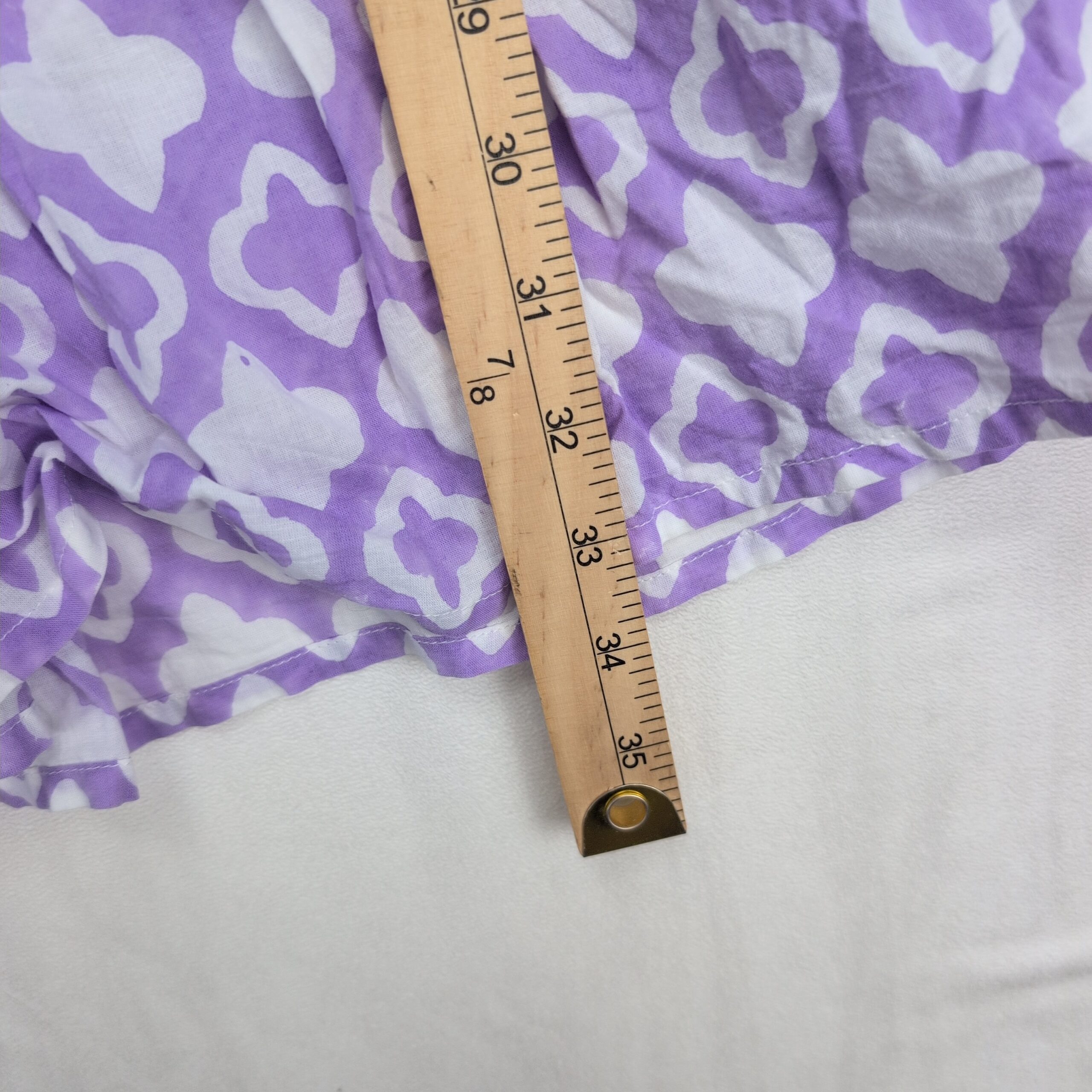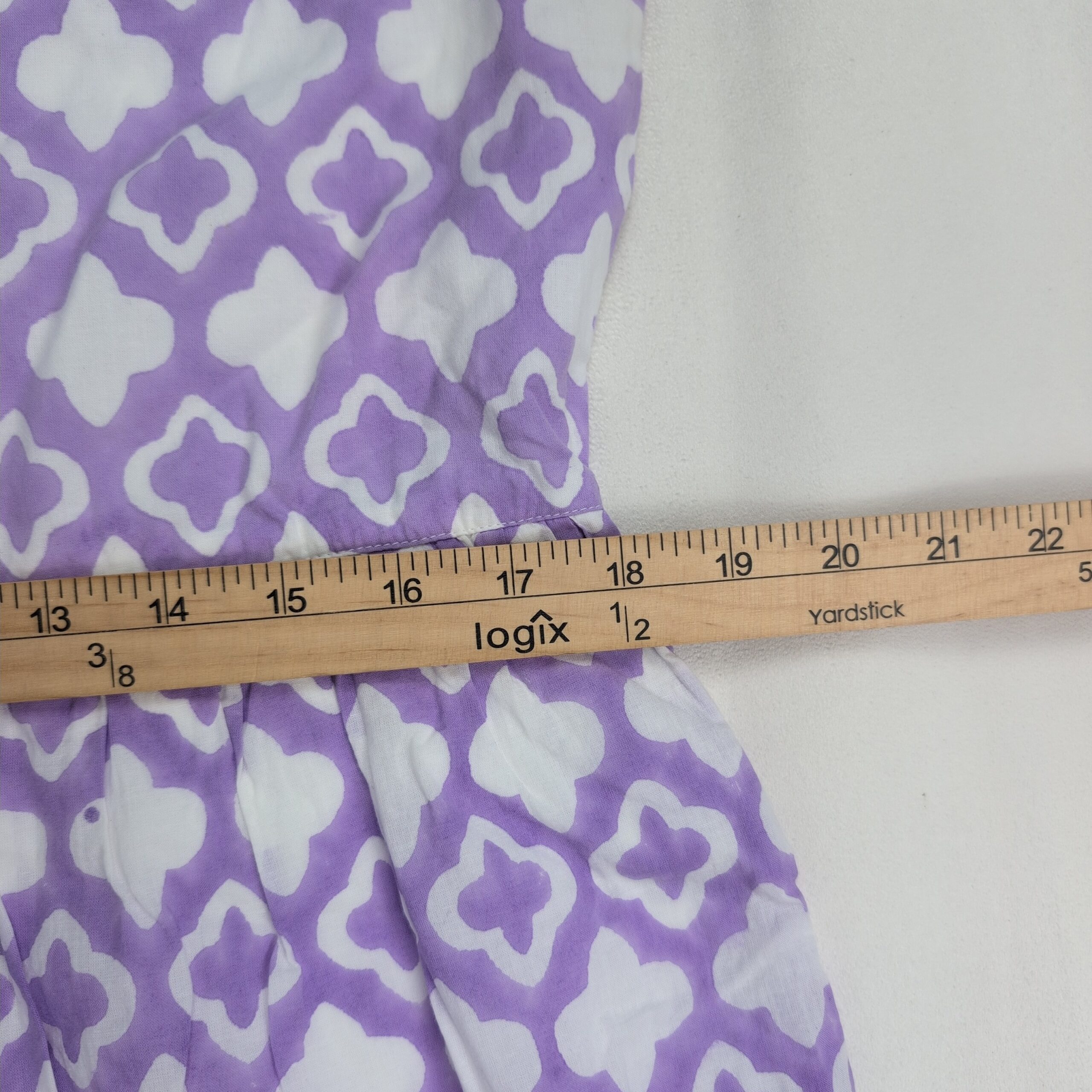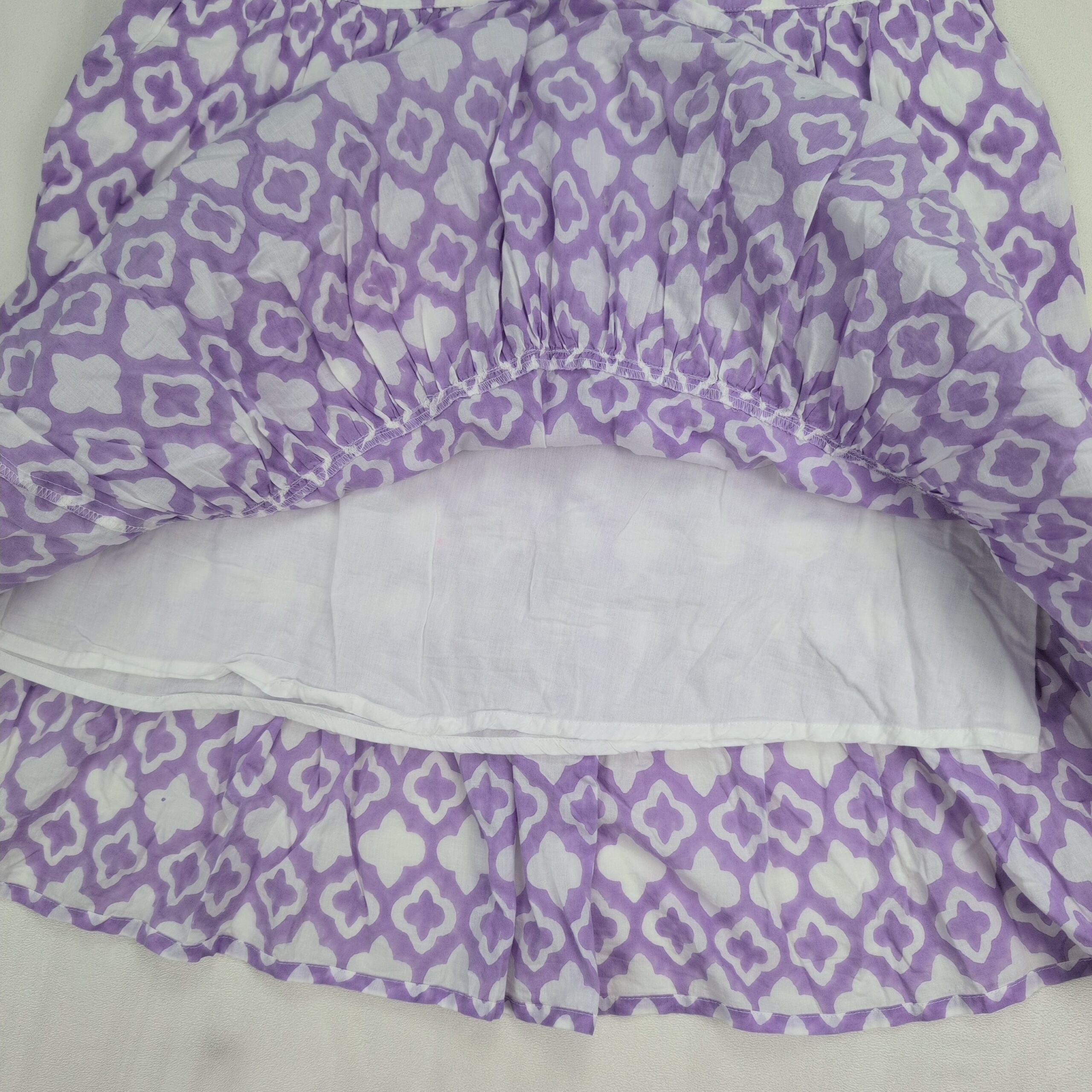 Madison Mathews women’s midi dress in size M. Purple and white geometric print with a V-notch neckline, flutter cap sleeves, gathered waist and a tiered ruffle hem for a breezy, feminine silhouette. Great for casual days, brunch, or vacation. Excellent used condition — free of major rips, tears, stains, or flaws; typical light wear may be present. Label: Madison Mathews.