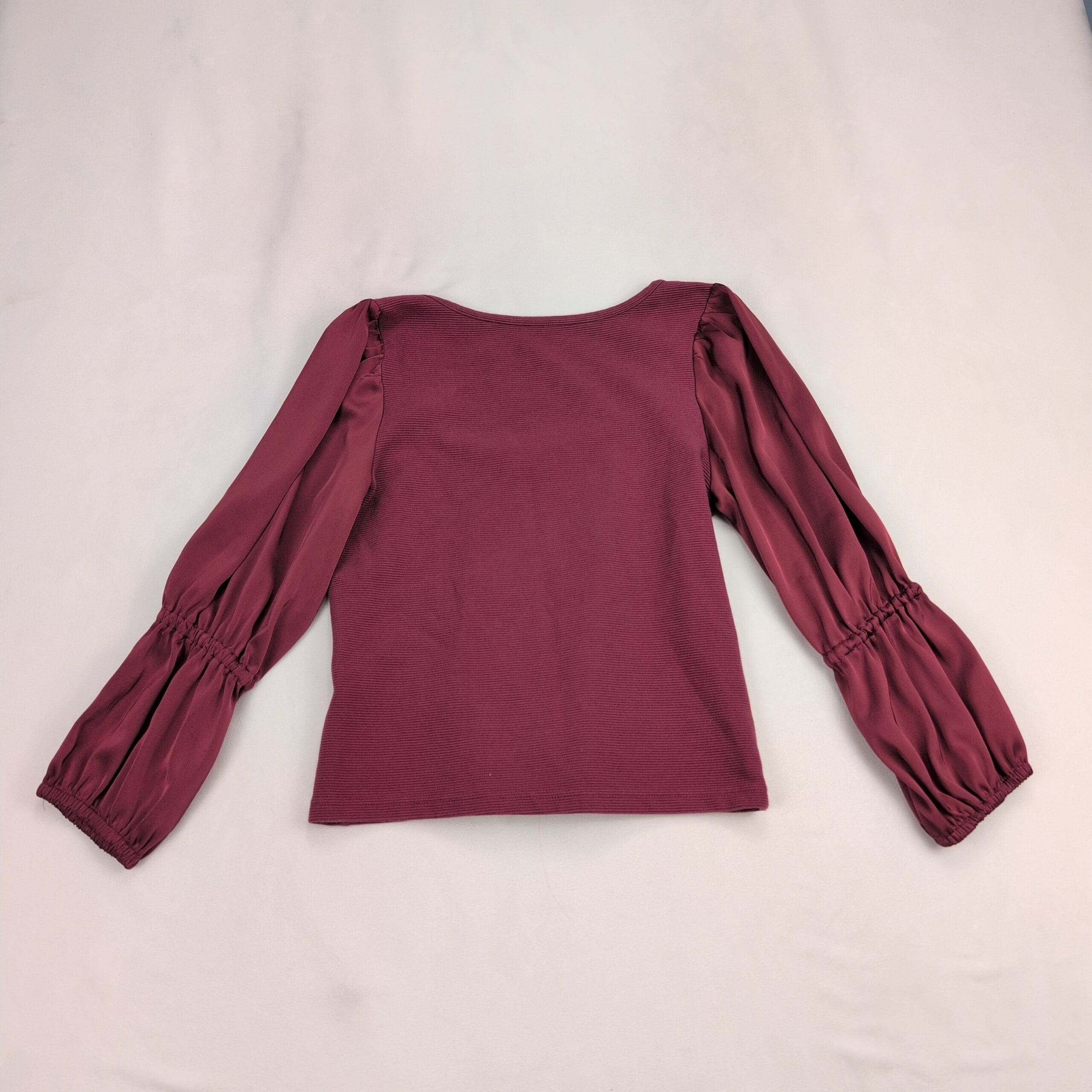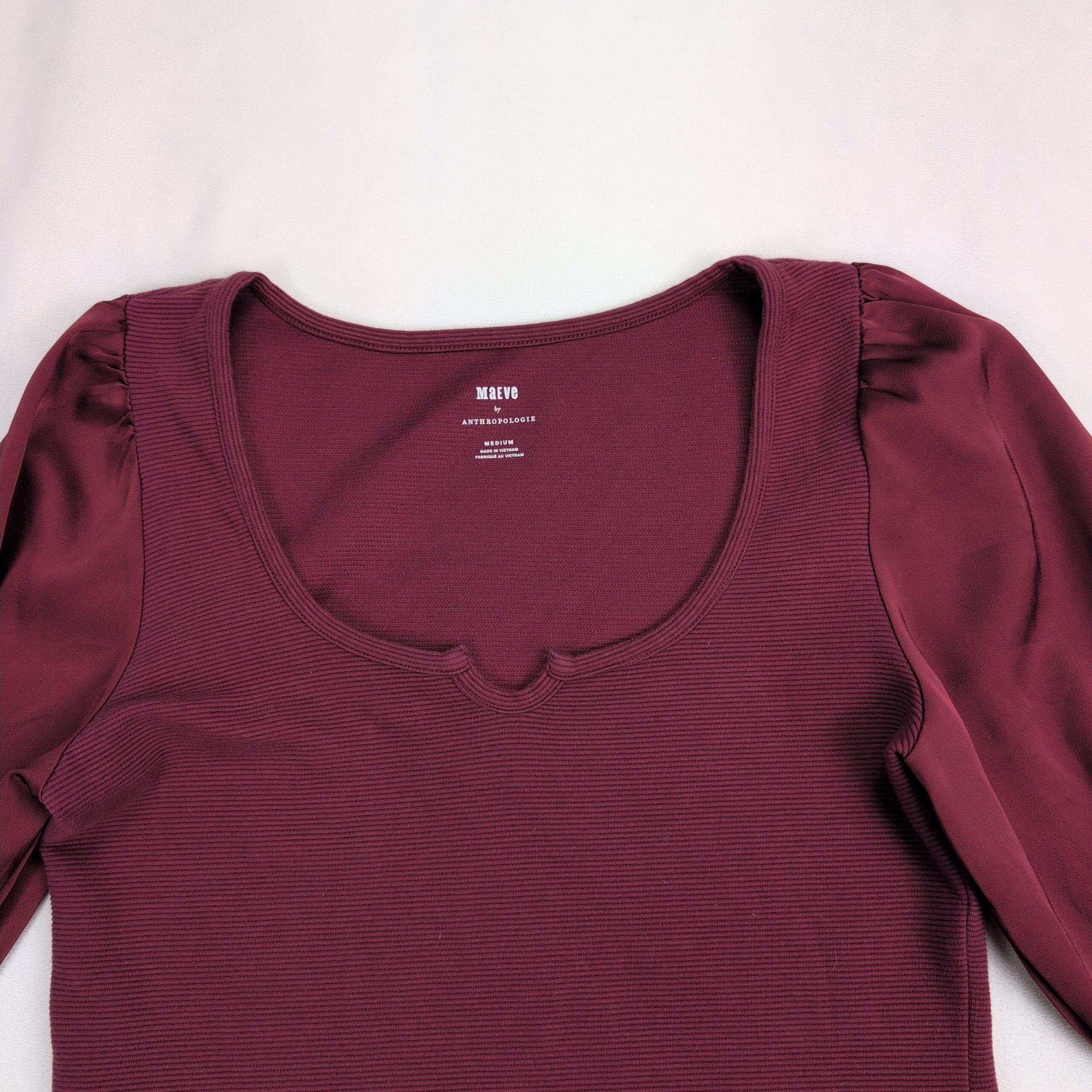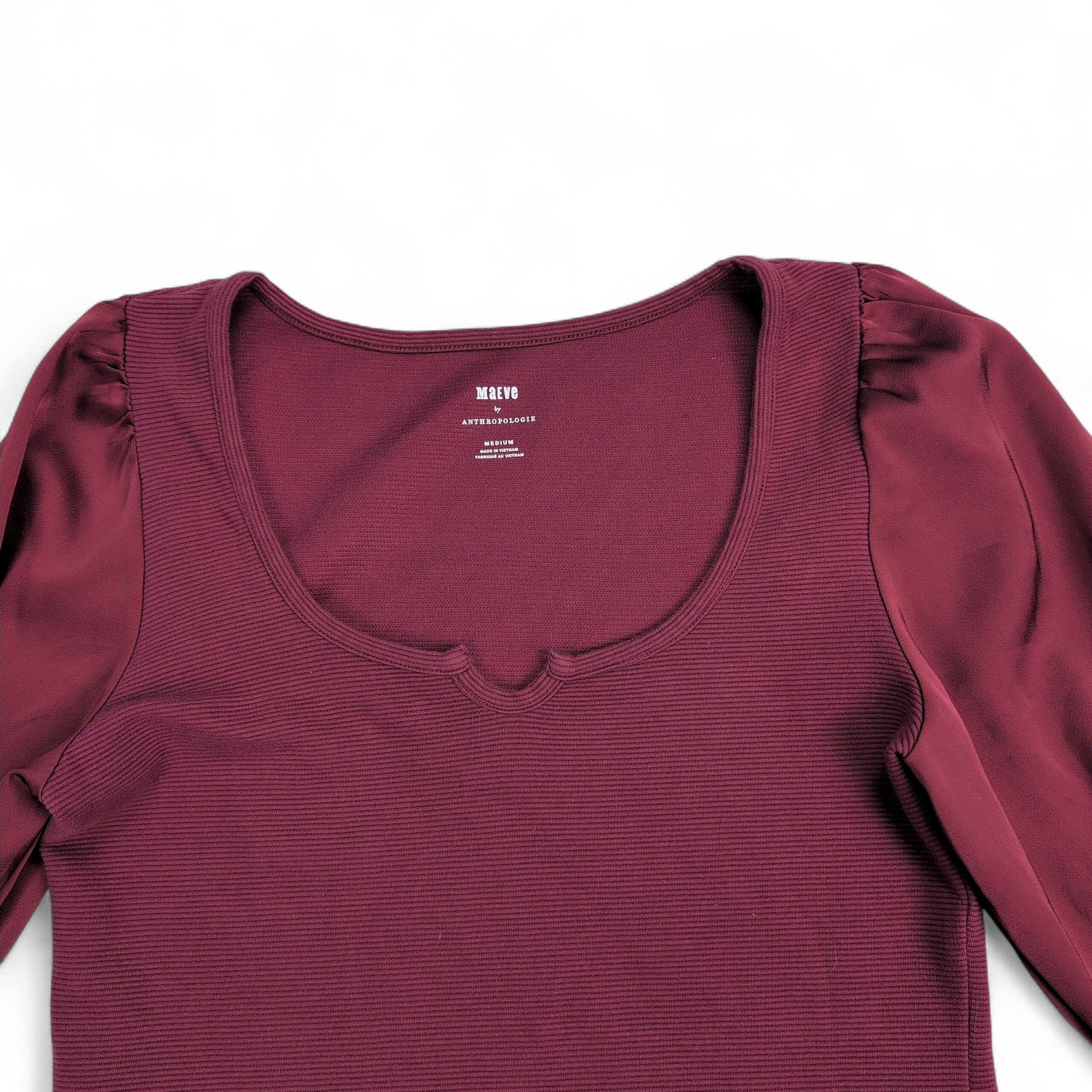 Maeve (Anthropologie) women’s top in a rich wine/burgundy. Size M. Features a ribbed knit body with a scoop neckline and subtle center notch, paired with silky semi-sheer puff long sleeves for a feminine, elevated look. Slightly fitted silhouette — great for work, evenings, or layered under jackets.