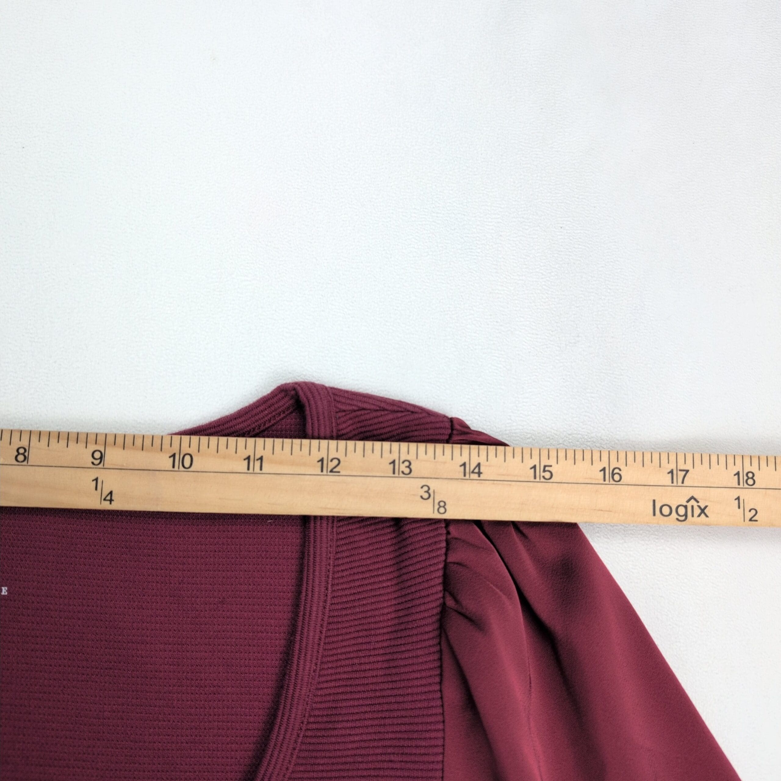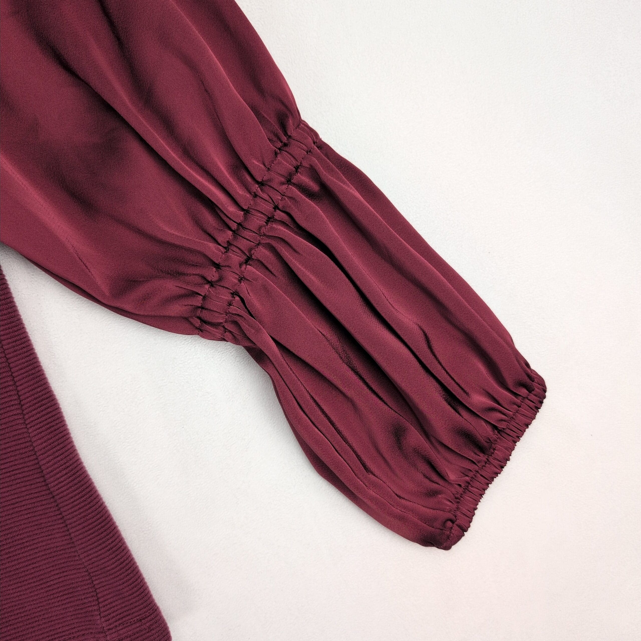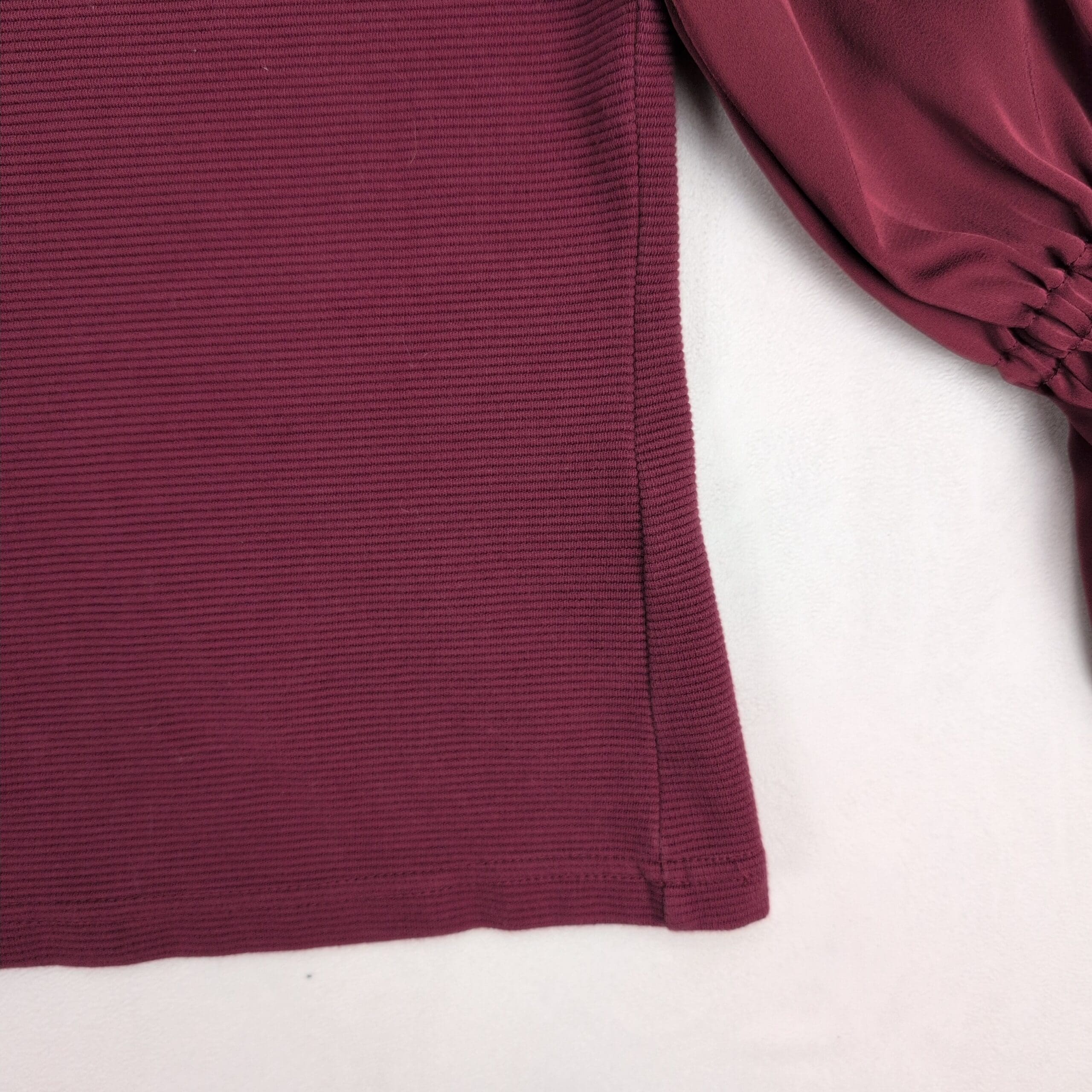 Maeve (Anthropologie) women’s top in a rich wine/burgundy. Size M. Features a ribbed knit body with a scoop neckline and subtle center notch, paired with silky semi-sheer puff long sleeves for a feminine, elevated look. Slightly fitted silhouette — great for work, evenings, or layered under jackets.