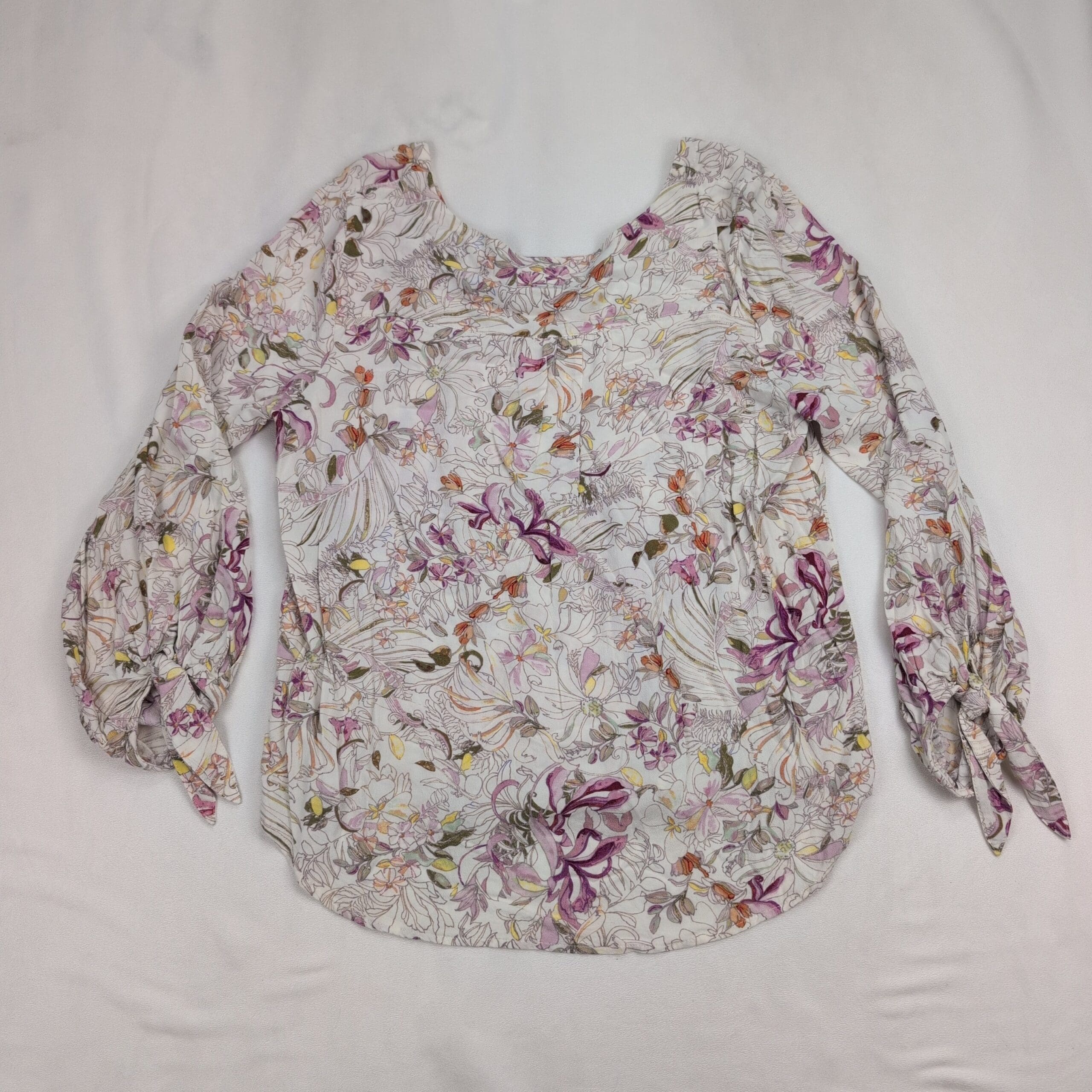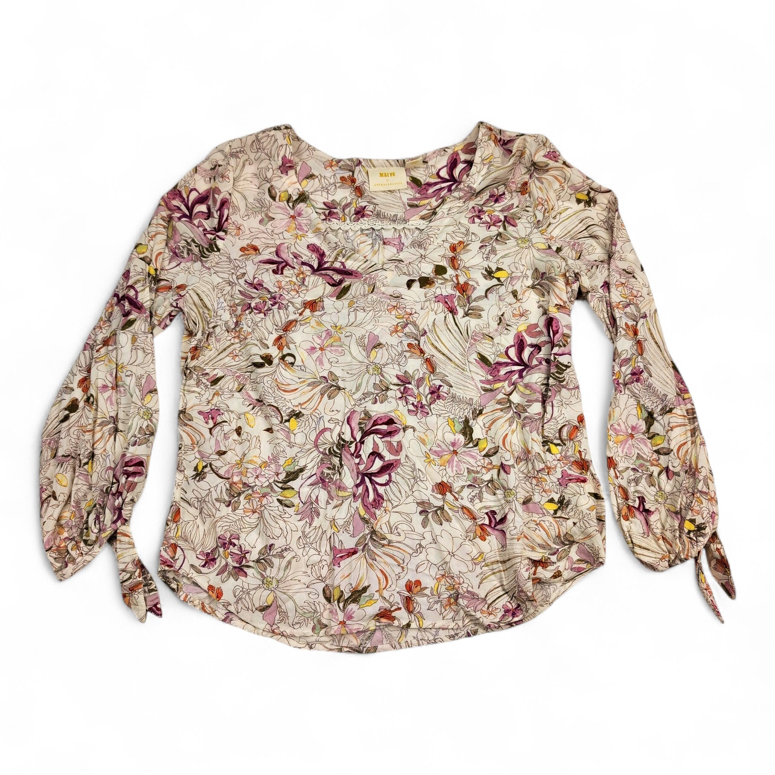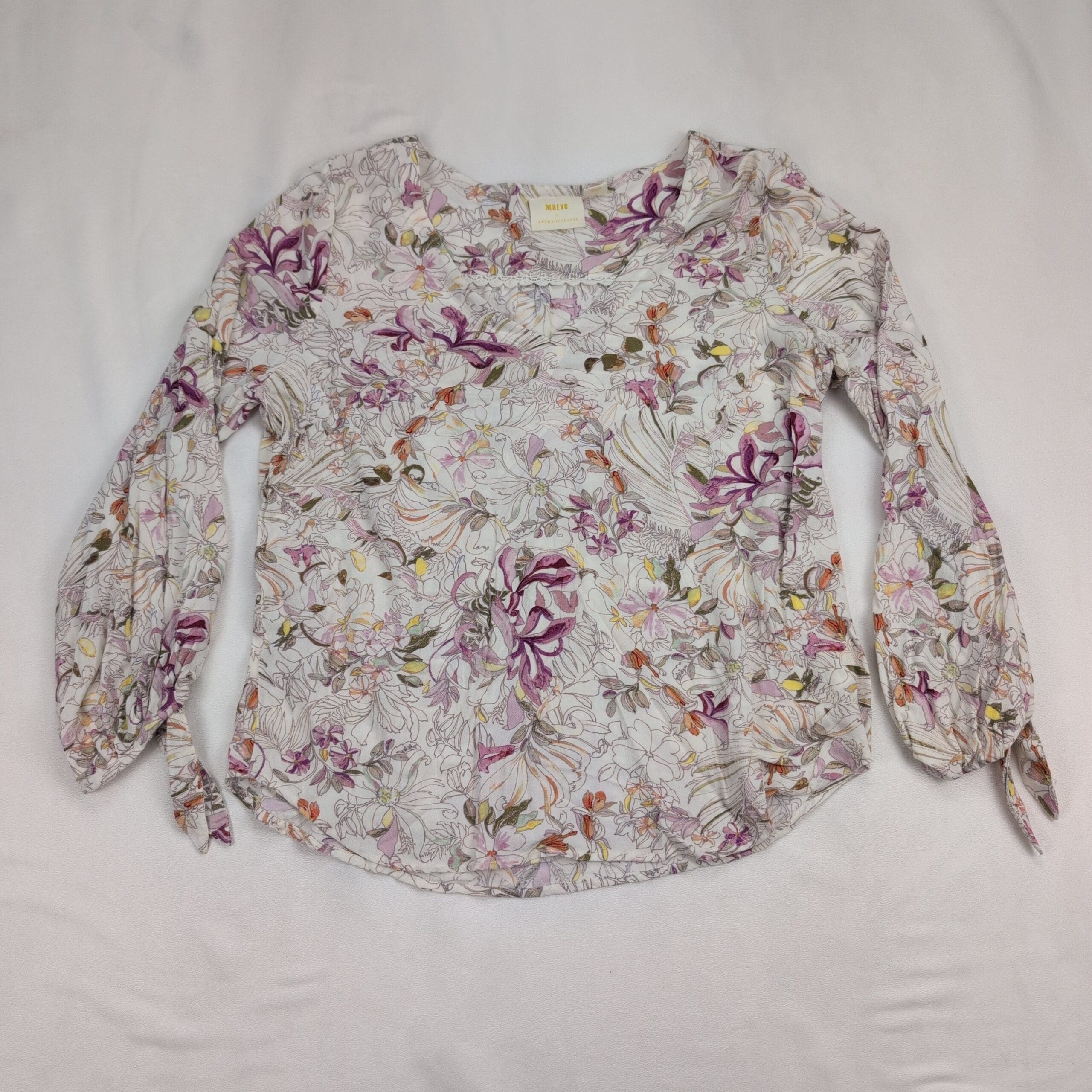 Maeve floral printed lightweight blouse in size L. Rounded scoop neckline with a gently gathered front yoke, long sleeves with elasticized cuffs and tie detail, and a curved hem for a relaxed, boho silhouette. Soft, airy woven fabric with an all-over sketch floral print in purple, pink, orange and olive on a cream background. Maeve tag present.