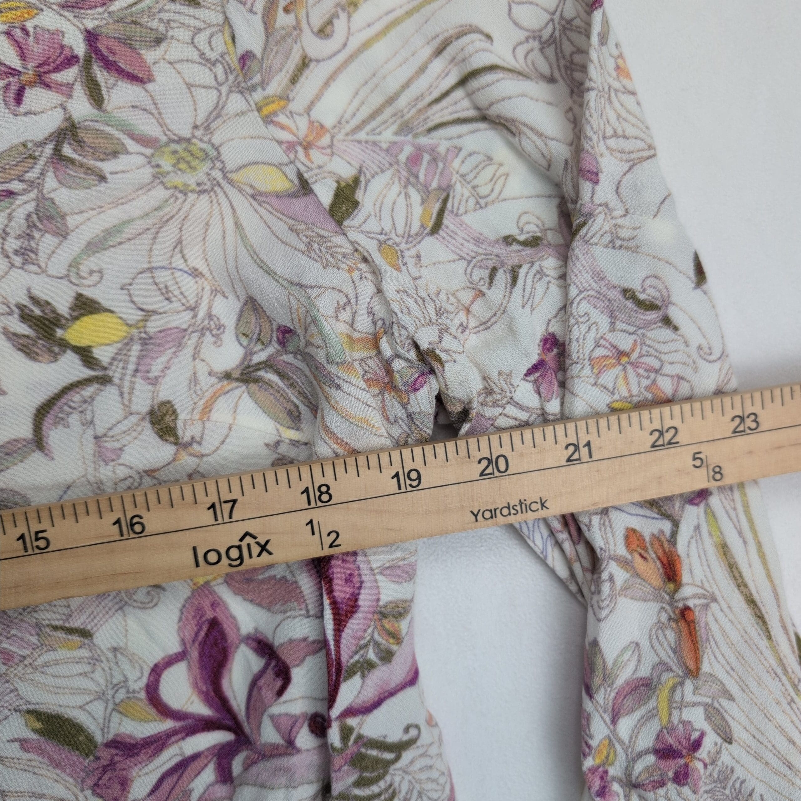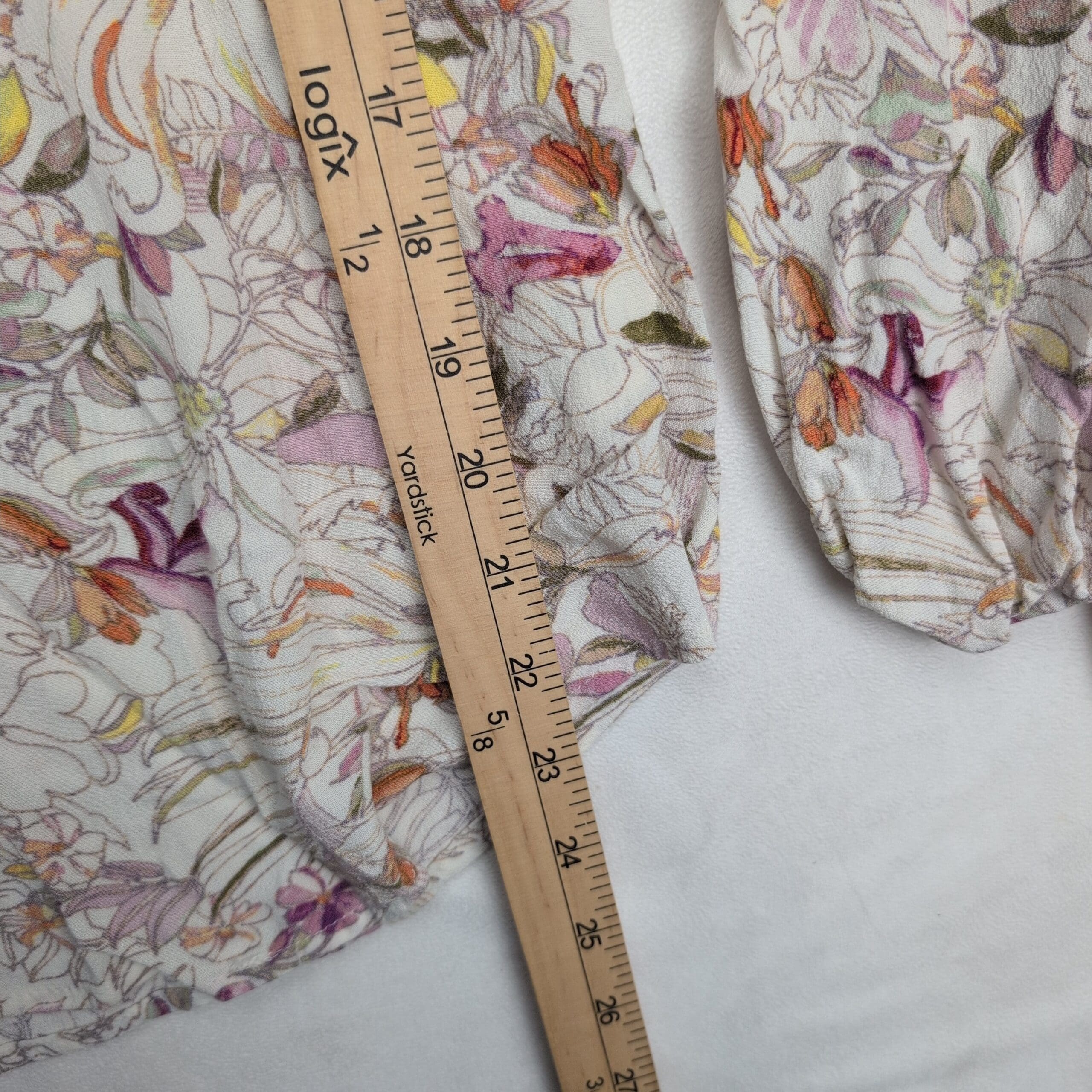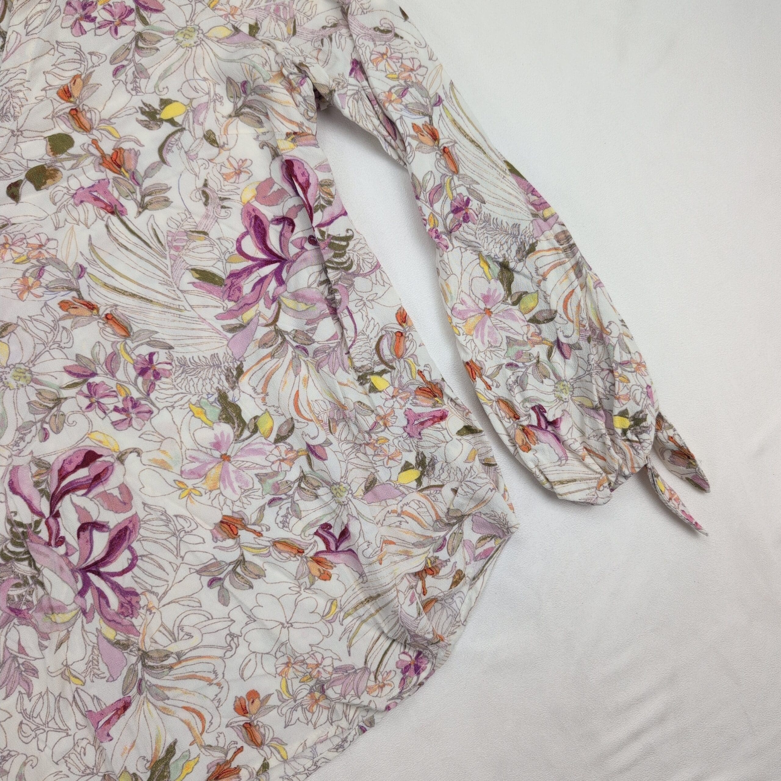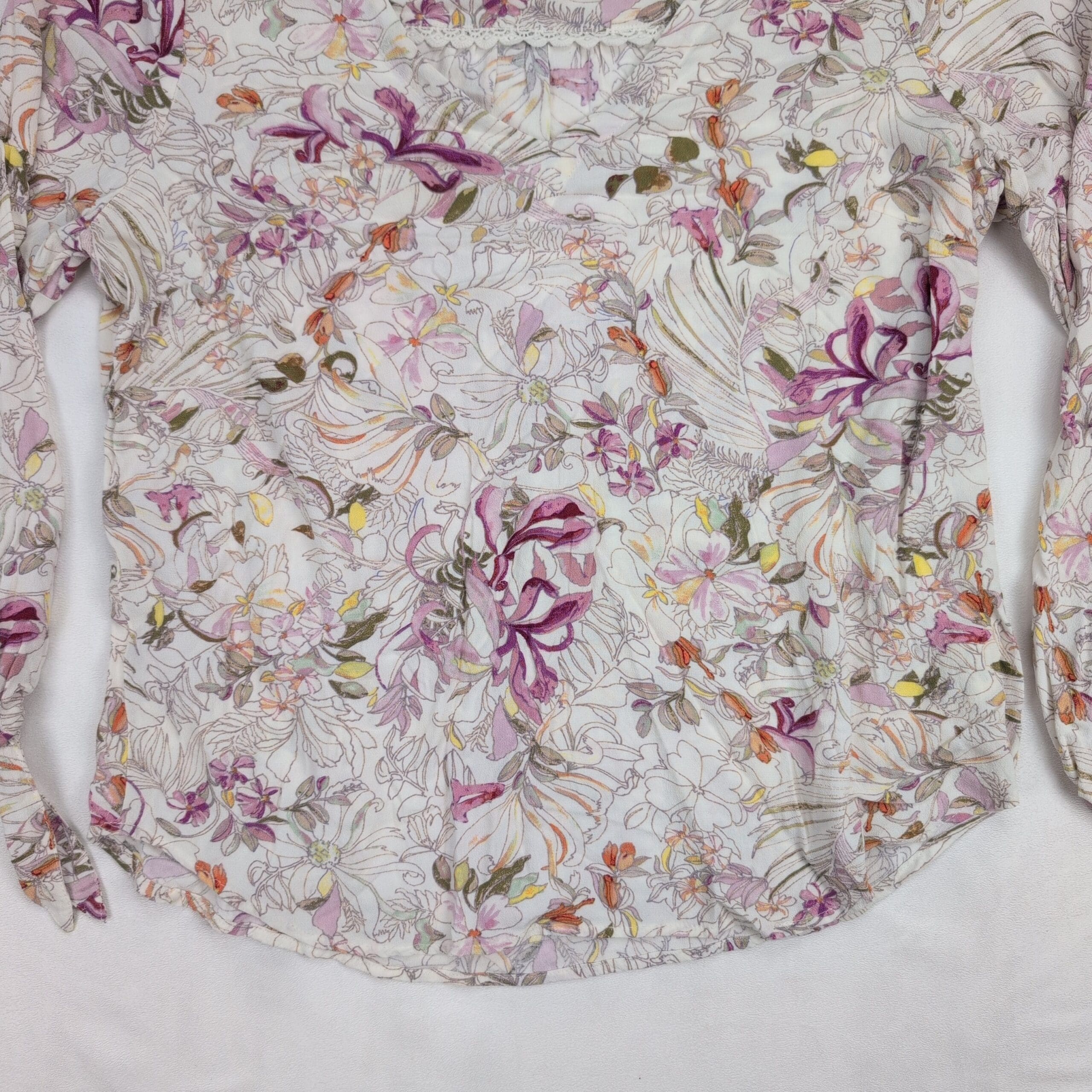 Maeve floral printed lightweight blouse in size L. Rounded scoop neckline with a gently gathered front yoke, long sleeves with elasticized cuffs and tie detail, and a curved hem for a relaxed, boho silhouette. Soft, airy woven fabric with an all-over sketch floral print in purple, pink, orange and olive on a cream background. Maeve tag present.
