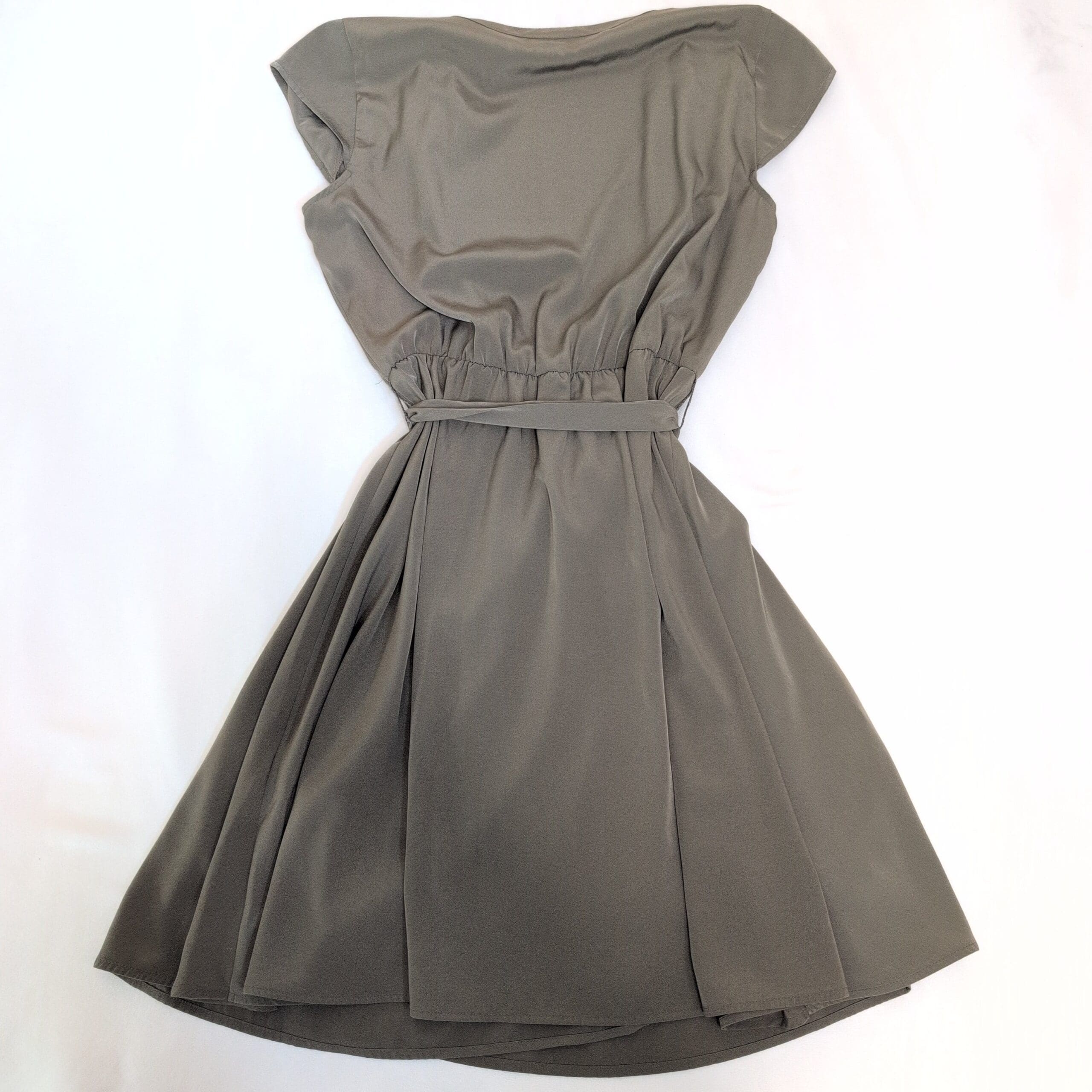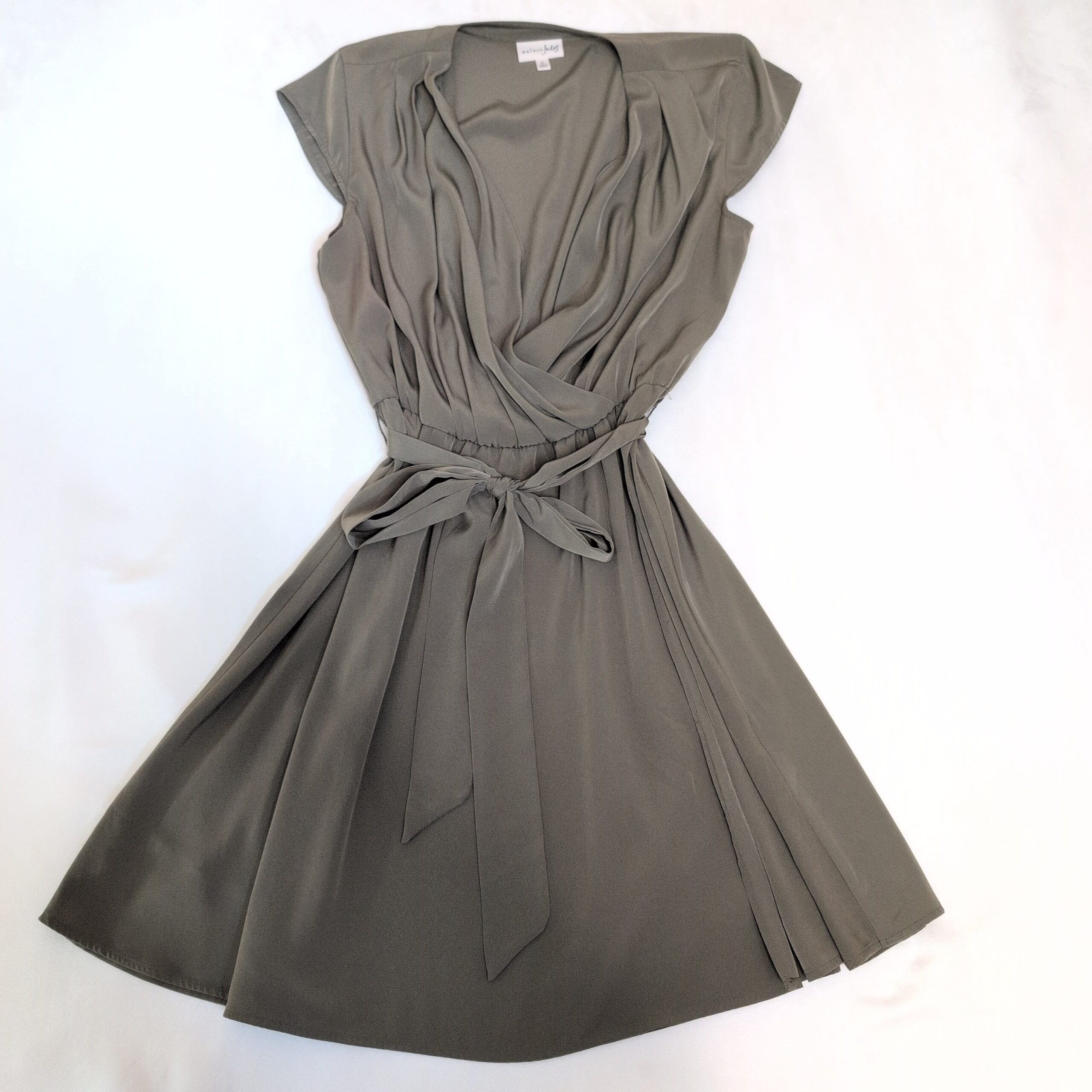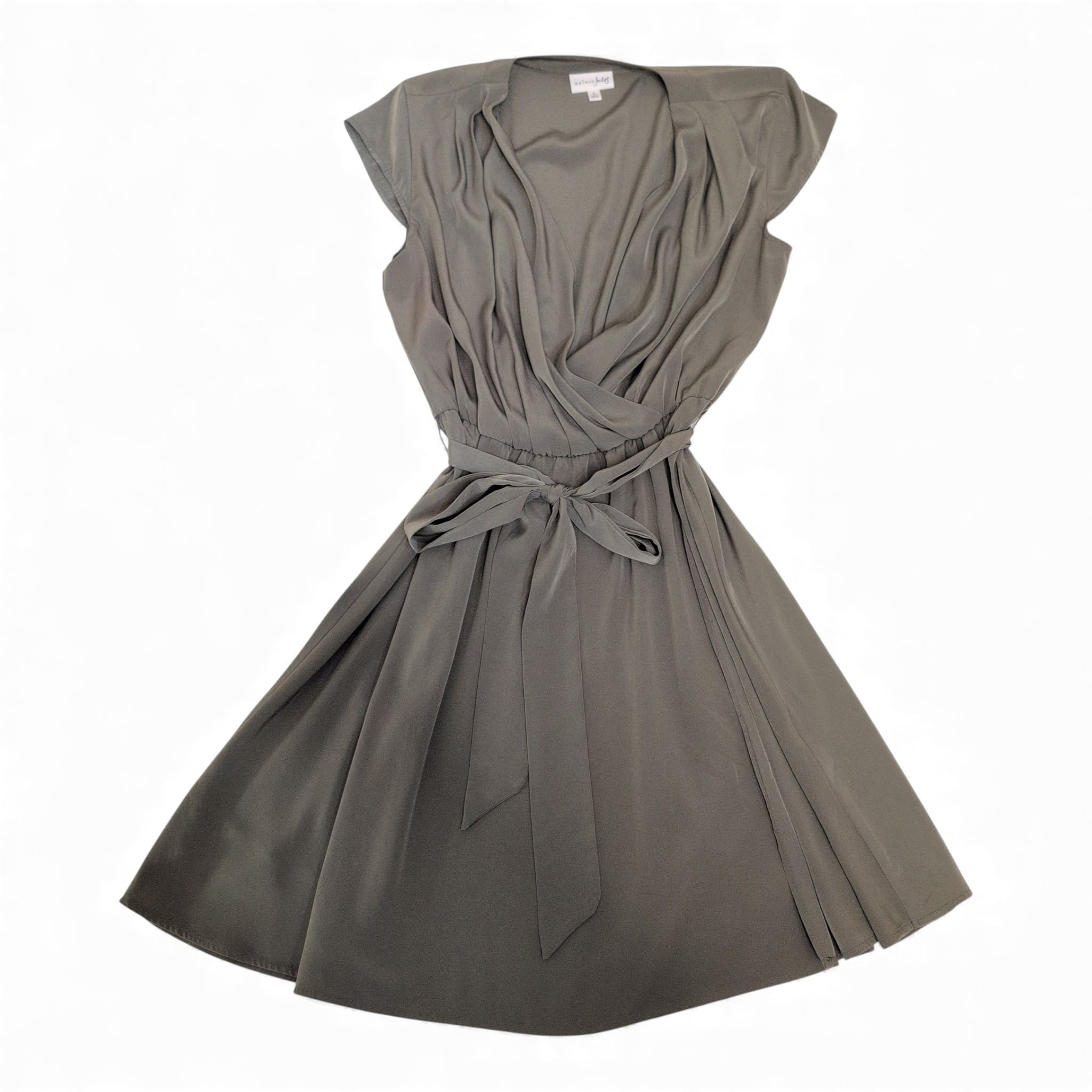 Maison Jules asymmetrical dress in a versatile green. Draped surplice V-neck with soft cap sleeves, elasticized waist and self-tie belt for a flattering, adjustable fit. Flowing A-line skirt with asymmetric pleat detail adds movement and polish — perfect for work, events, or everyday wear. Pre-owned; please review photos for condition and details.