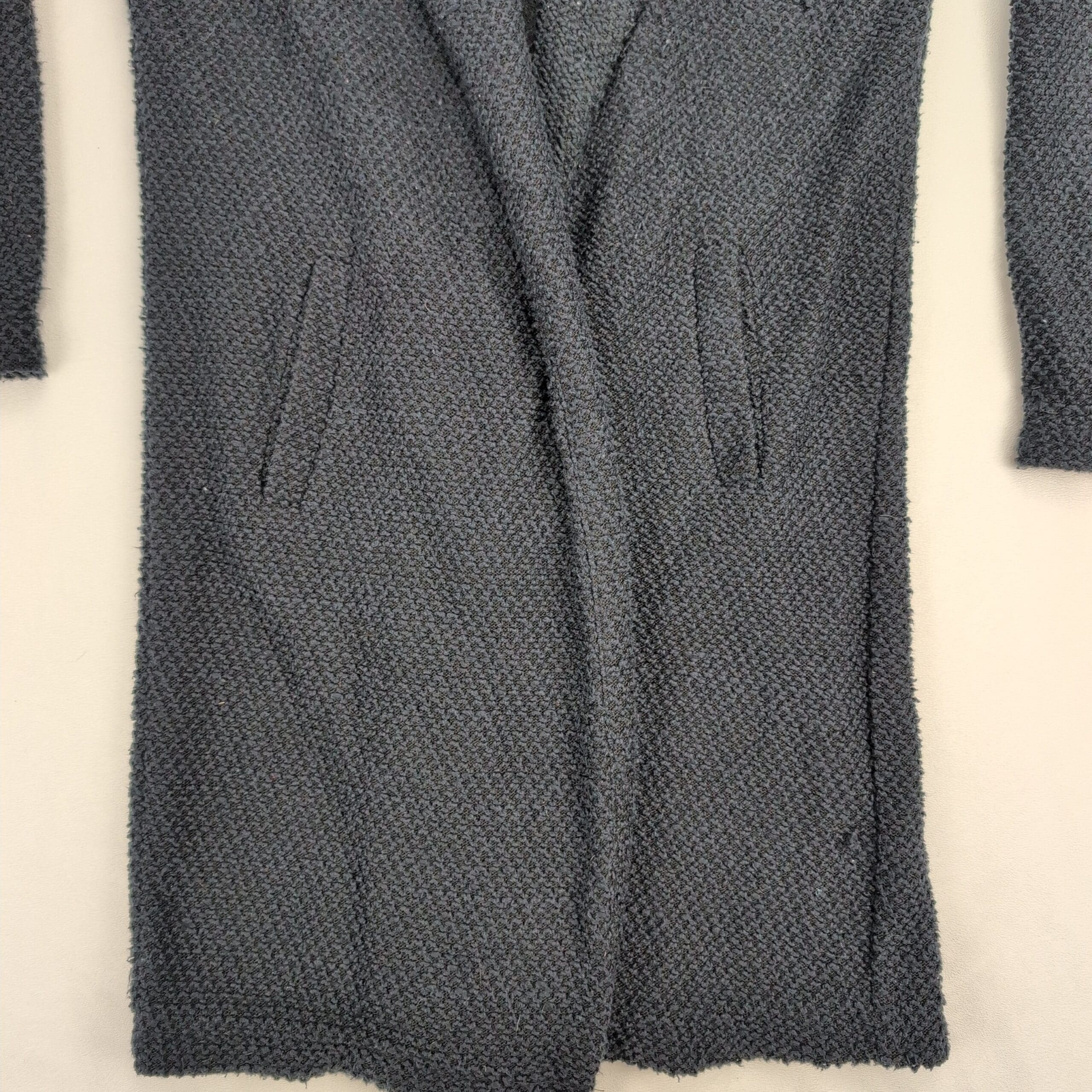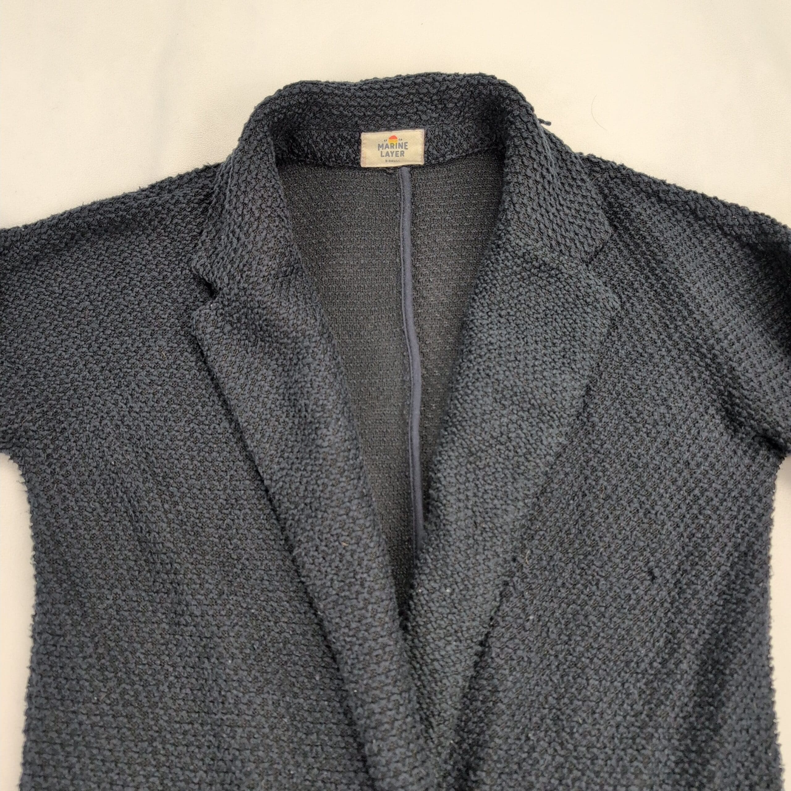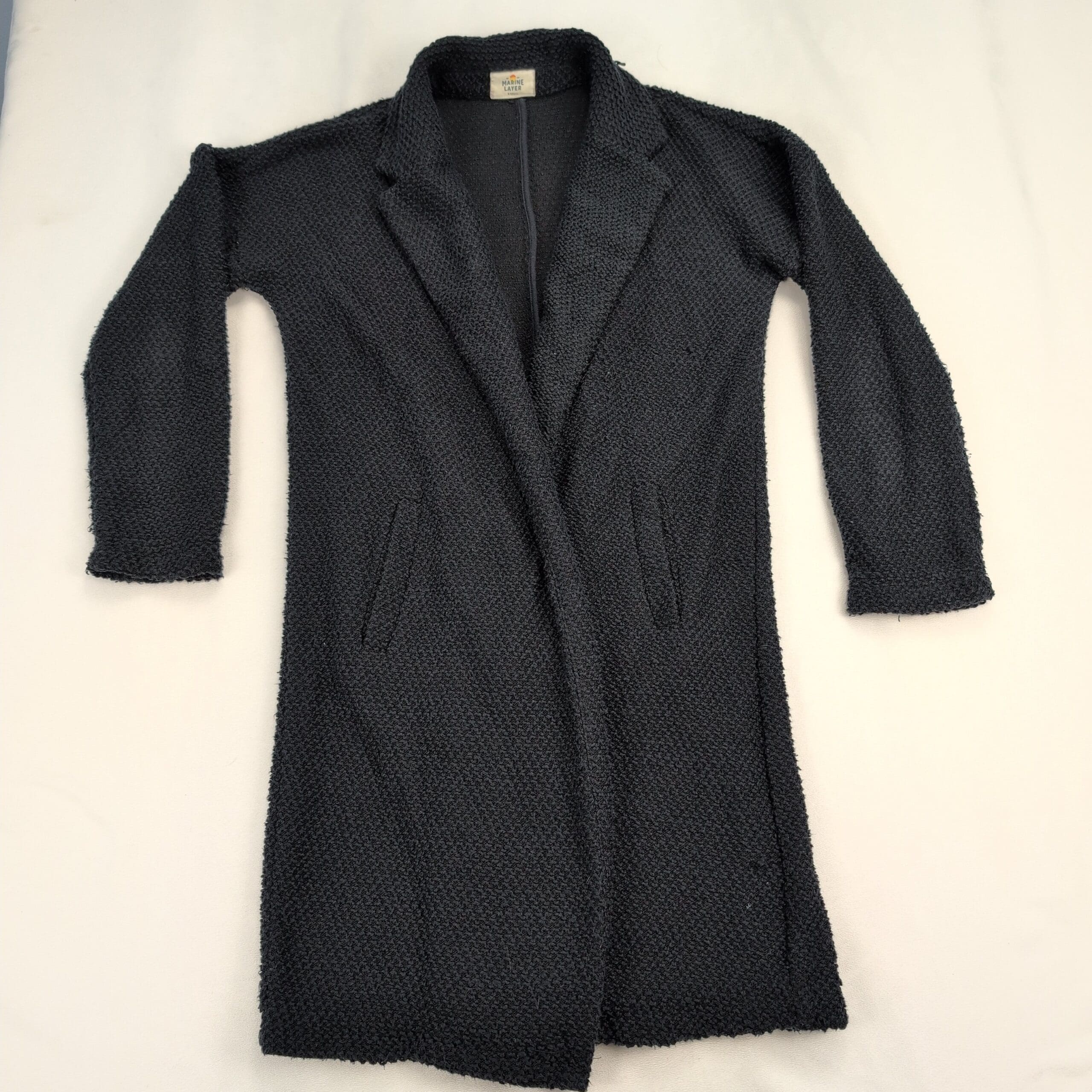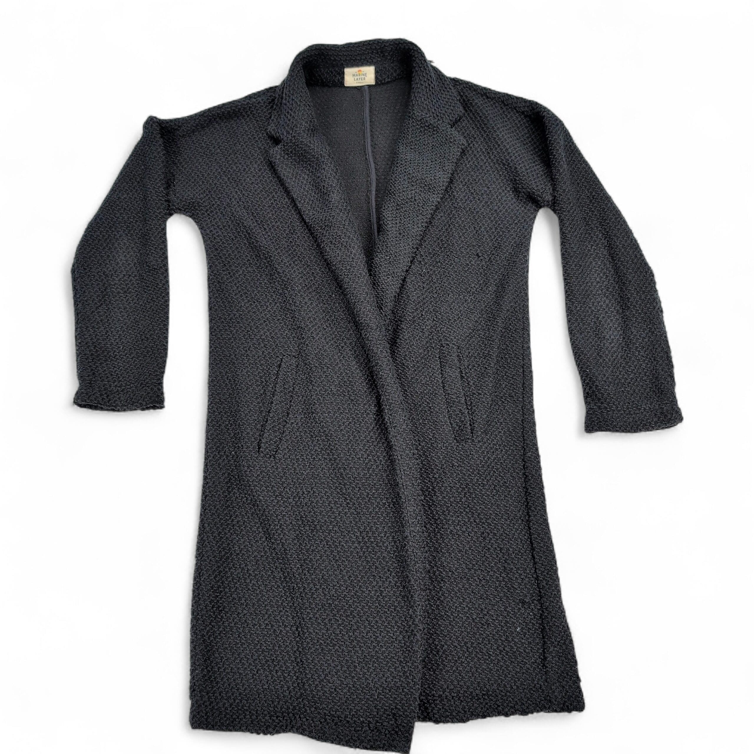 Marine Layer birdseye knit longline cardigan coat in size XS. Black textured knit with an open front and front welt pockets — a cozy, versatile layering piece for cooler weather. Excellent used condition overall; there are a few areas where the knit is pulling (see photos) but no major rips, stains, or holes. Typical gentle wear consistent with previous use.