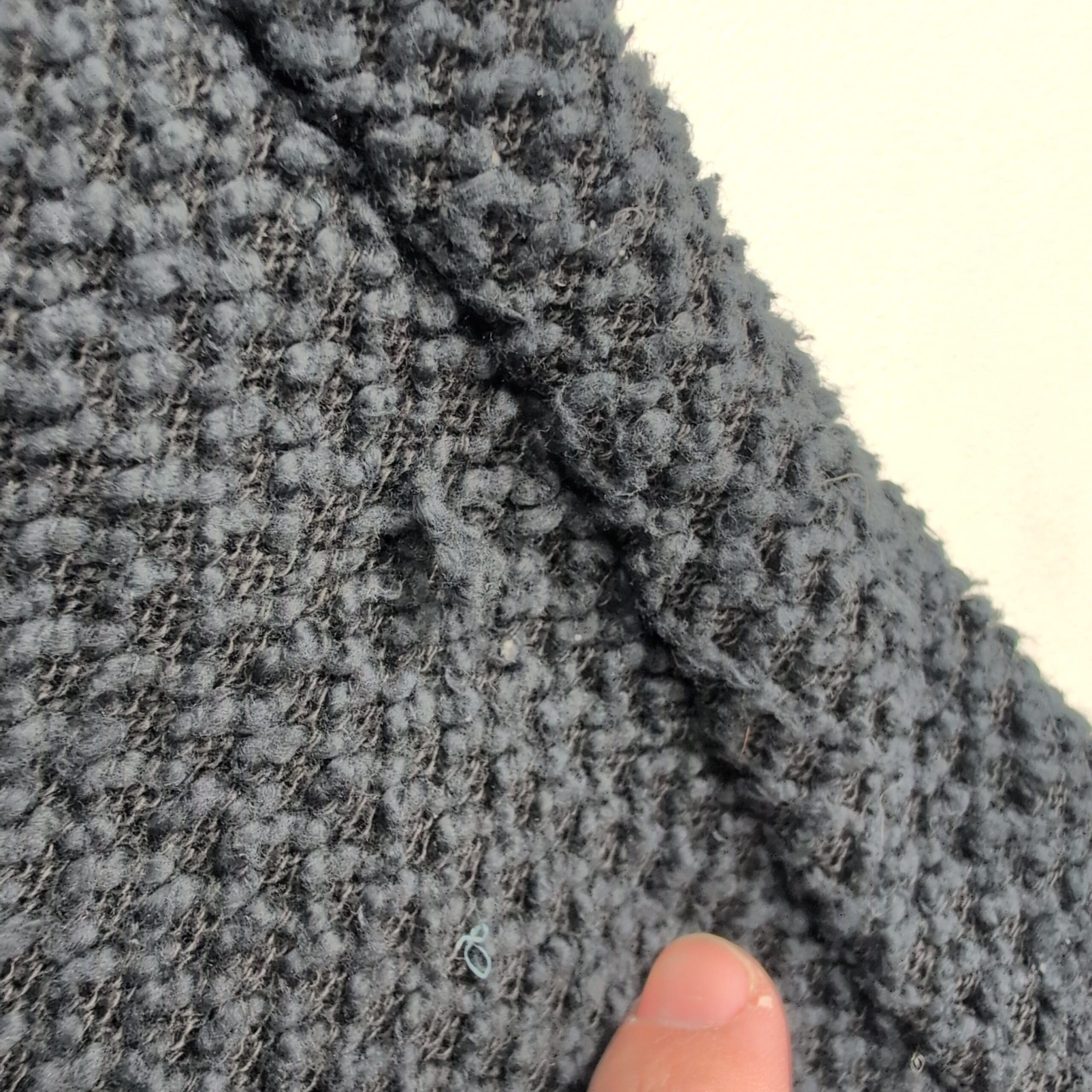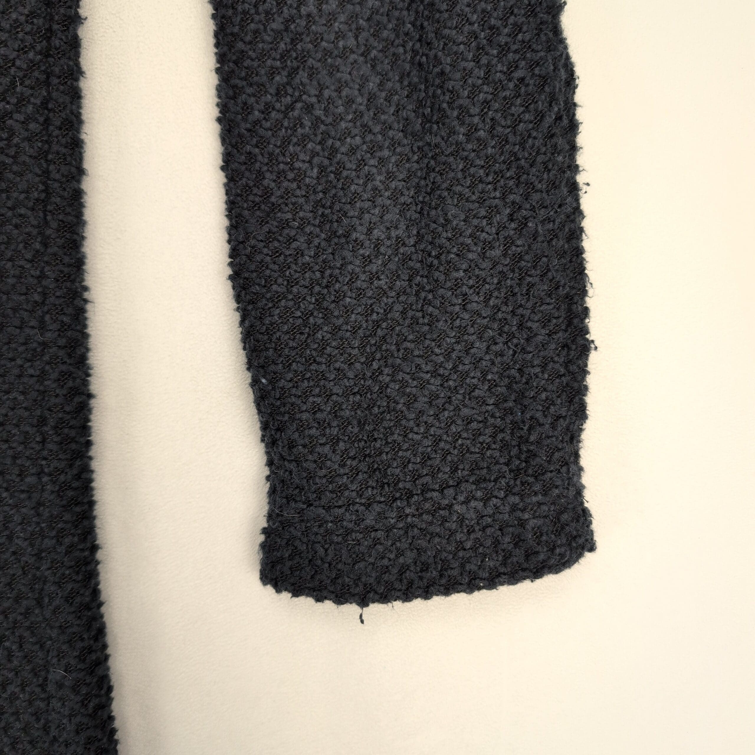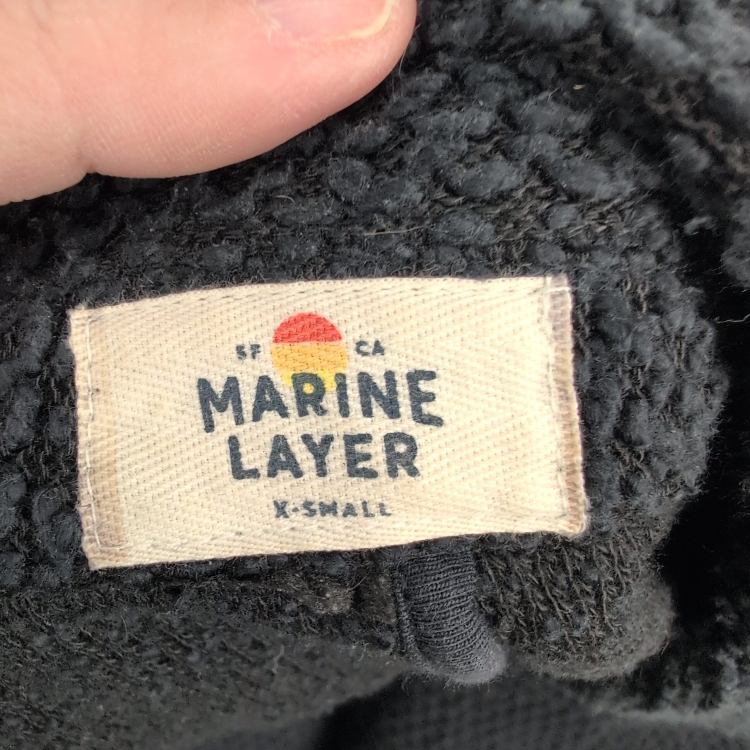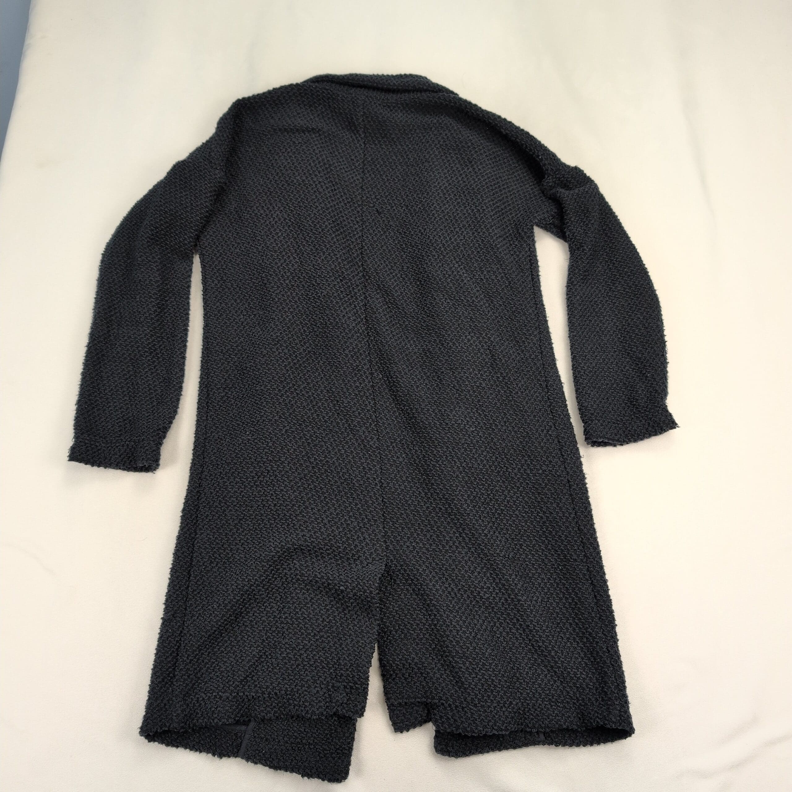 Marine Layer birdseye knit longline cardigan coat in size XS. Black textured knit with an open front and front welt pockets — a cozy, versatile layering piece for cooler weather. Excellent used condition overall; there are a few areas where the knit is pulling (see photos) but no major rips, stains, or holes. Typical gentle wear consistent with previous use.