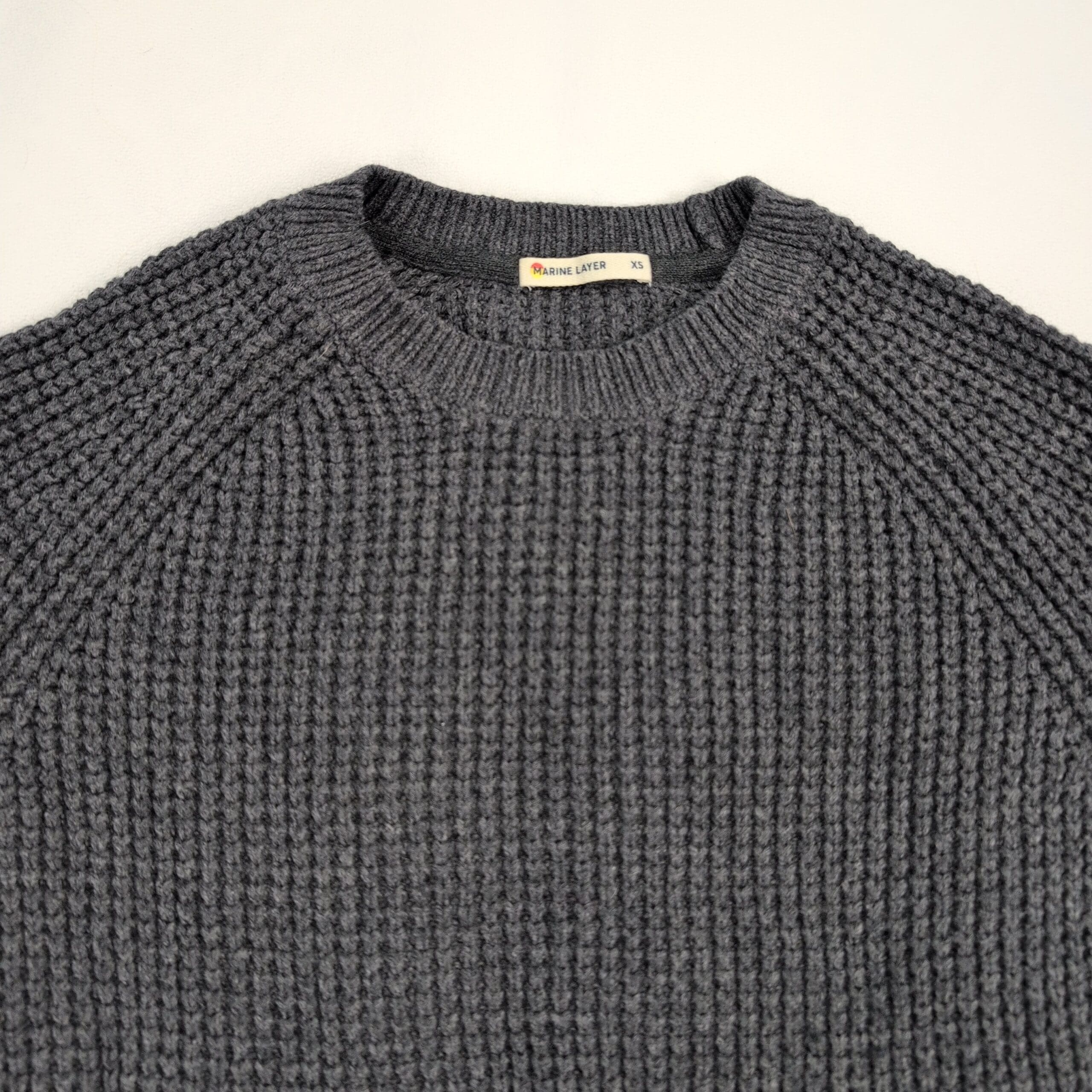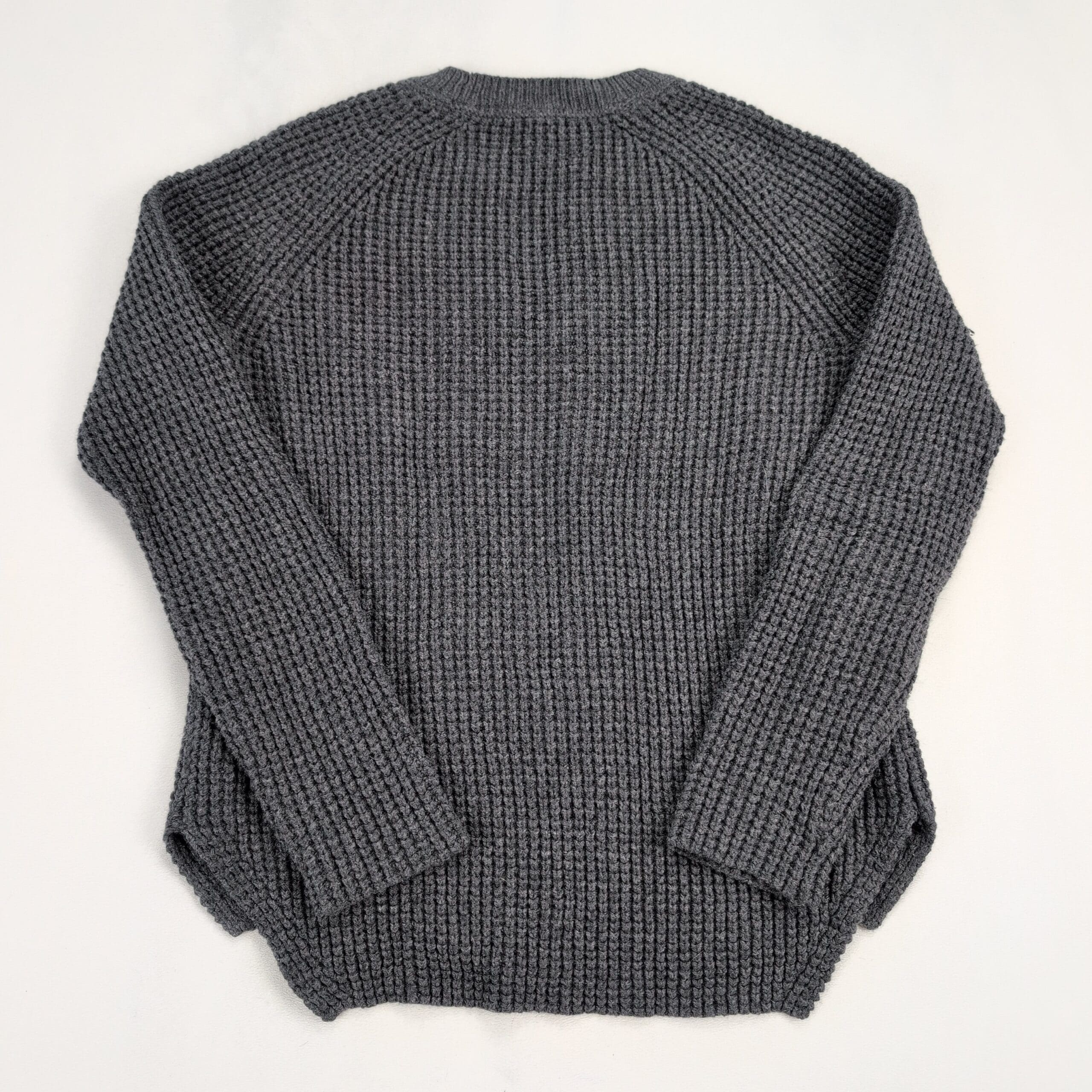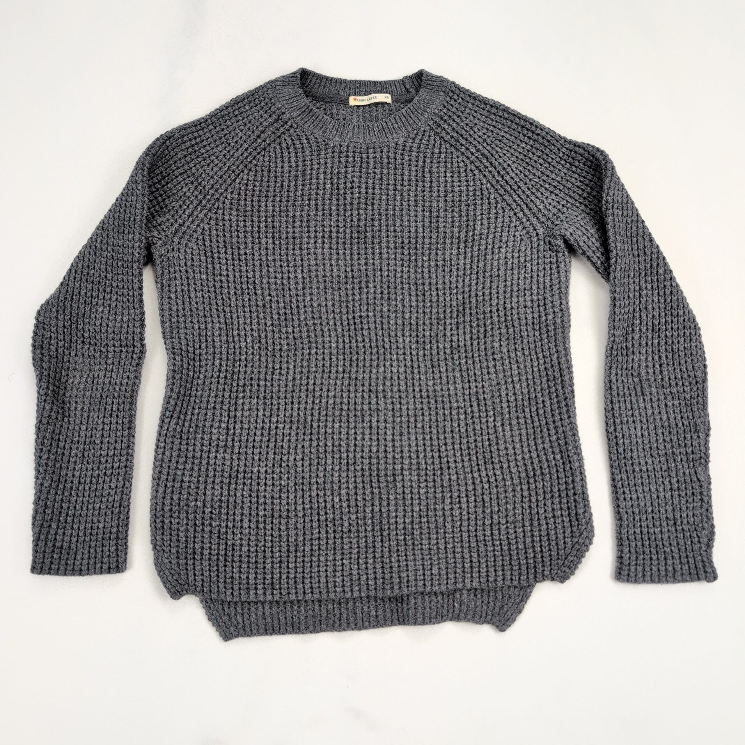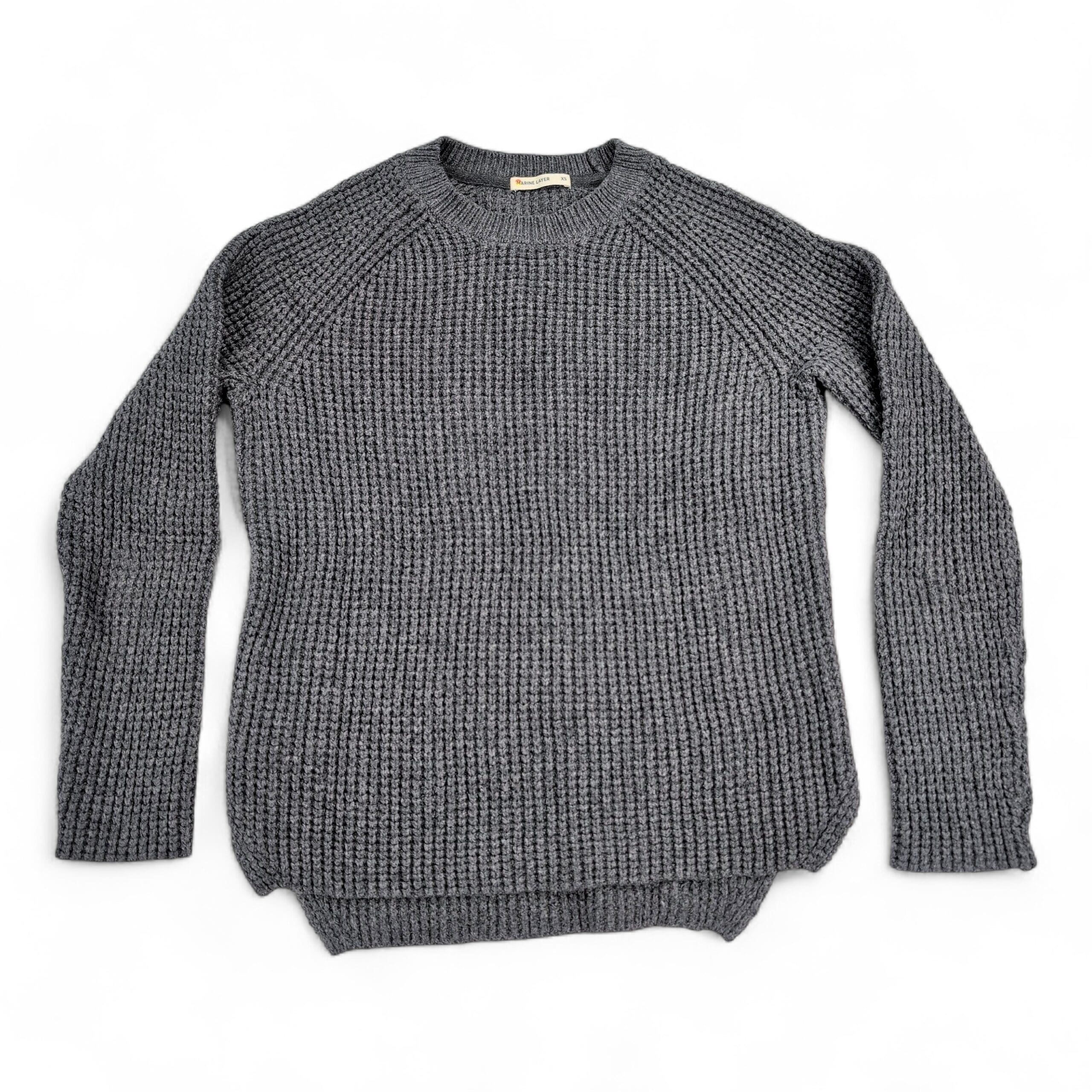 Marine Layer women’s waffle-knit crewneck sweater in gray, size XS. Features raglan sleeves, ribbed crew neckline, cuffs and hem, and a textured waffle stitch for cozy layering. A versatile casual staple that pairs well with denim, skirts, or leggings.
