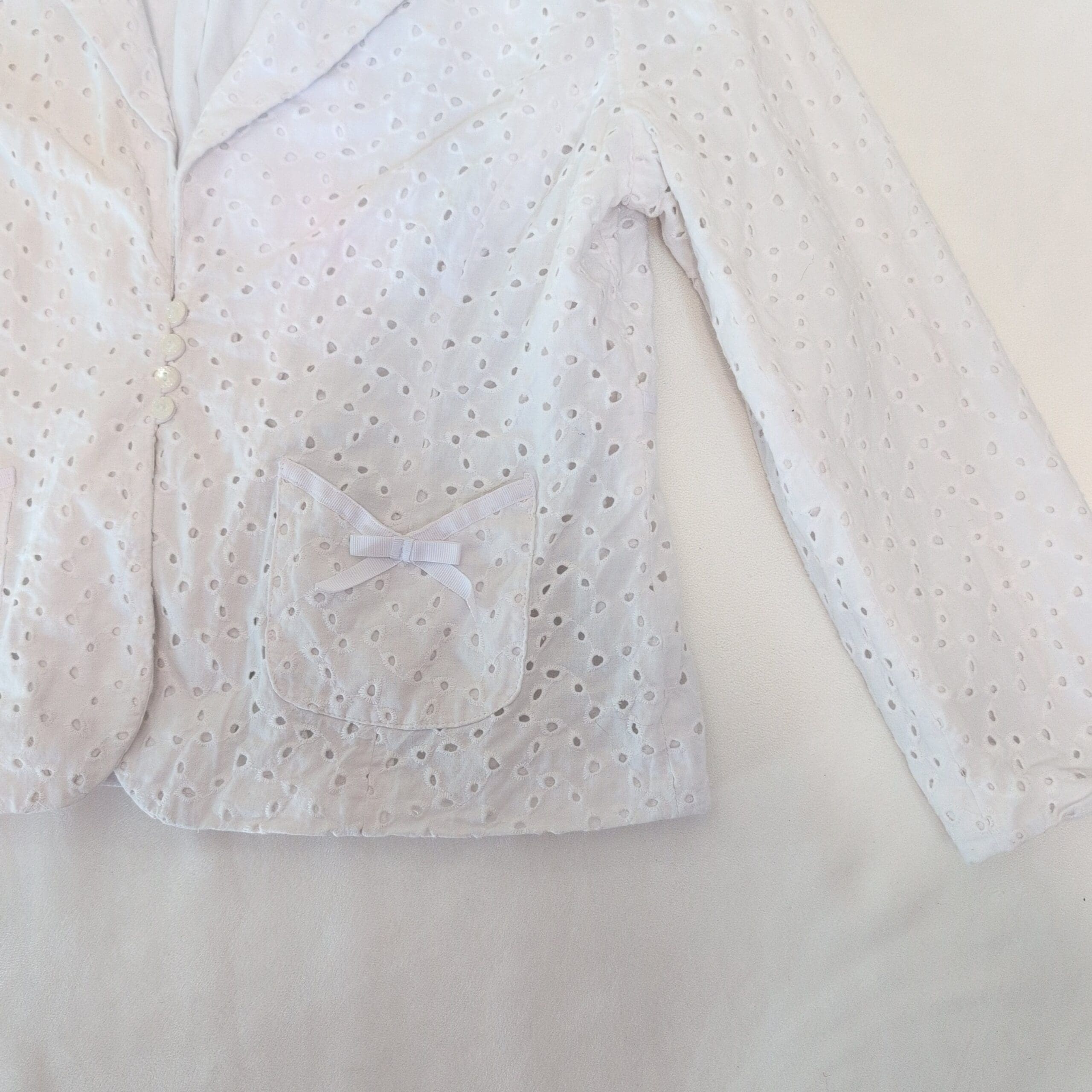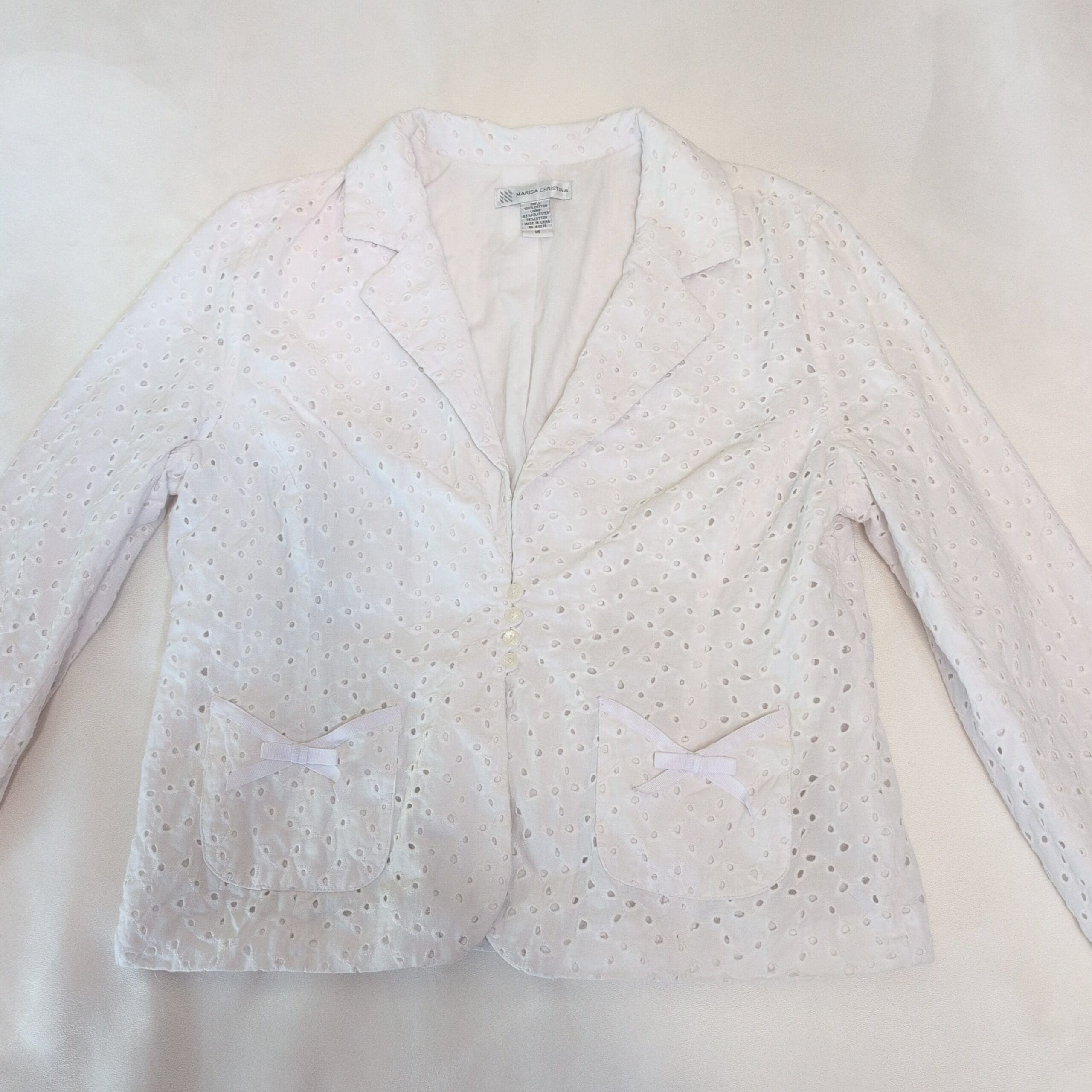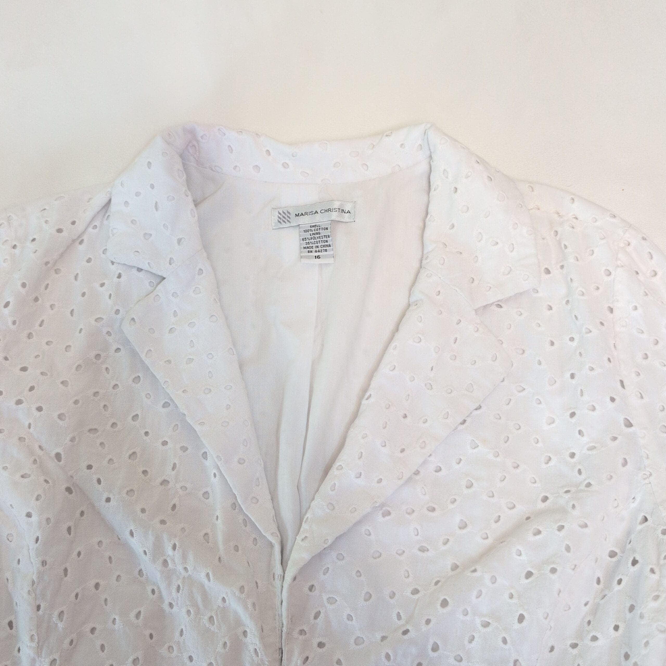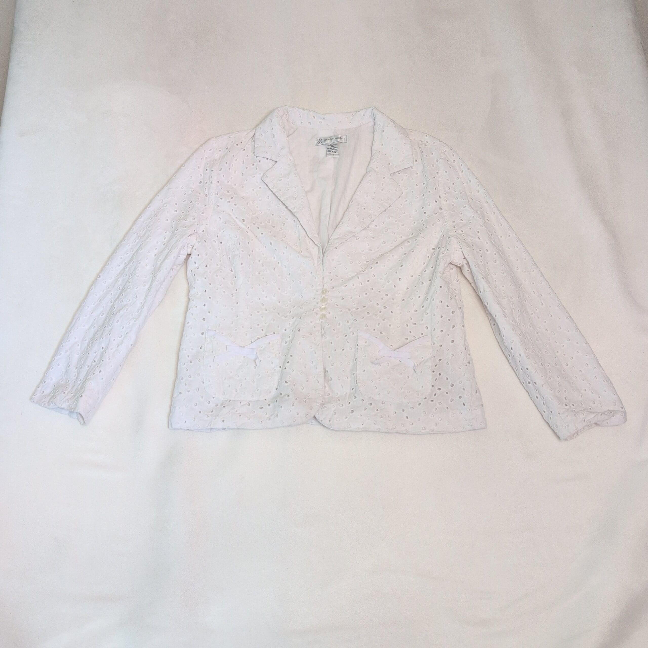 White eyelet blazer by Marisa Christina in women’s size 16 (Plus). Lightweight eyelet fabric with a notched lapel and button-front closure. Features two front patch pockets with delicate bow accents for a feminine touch — a clean, versatile piece perfect for spring and summer events or layered over dresses and tops. Measurements not provided; please refer to photos for details.