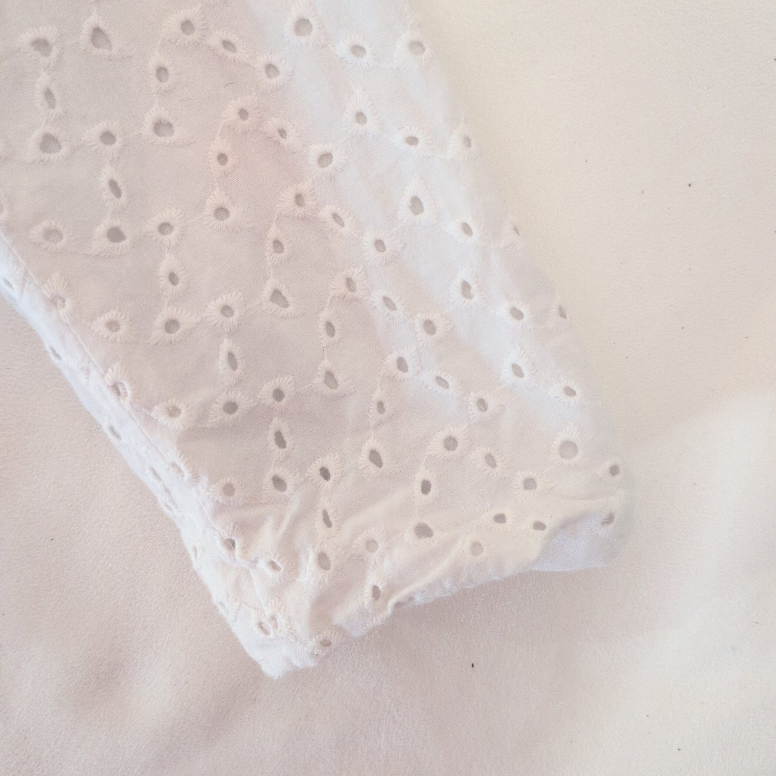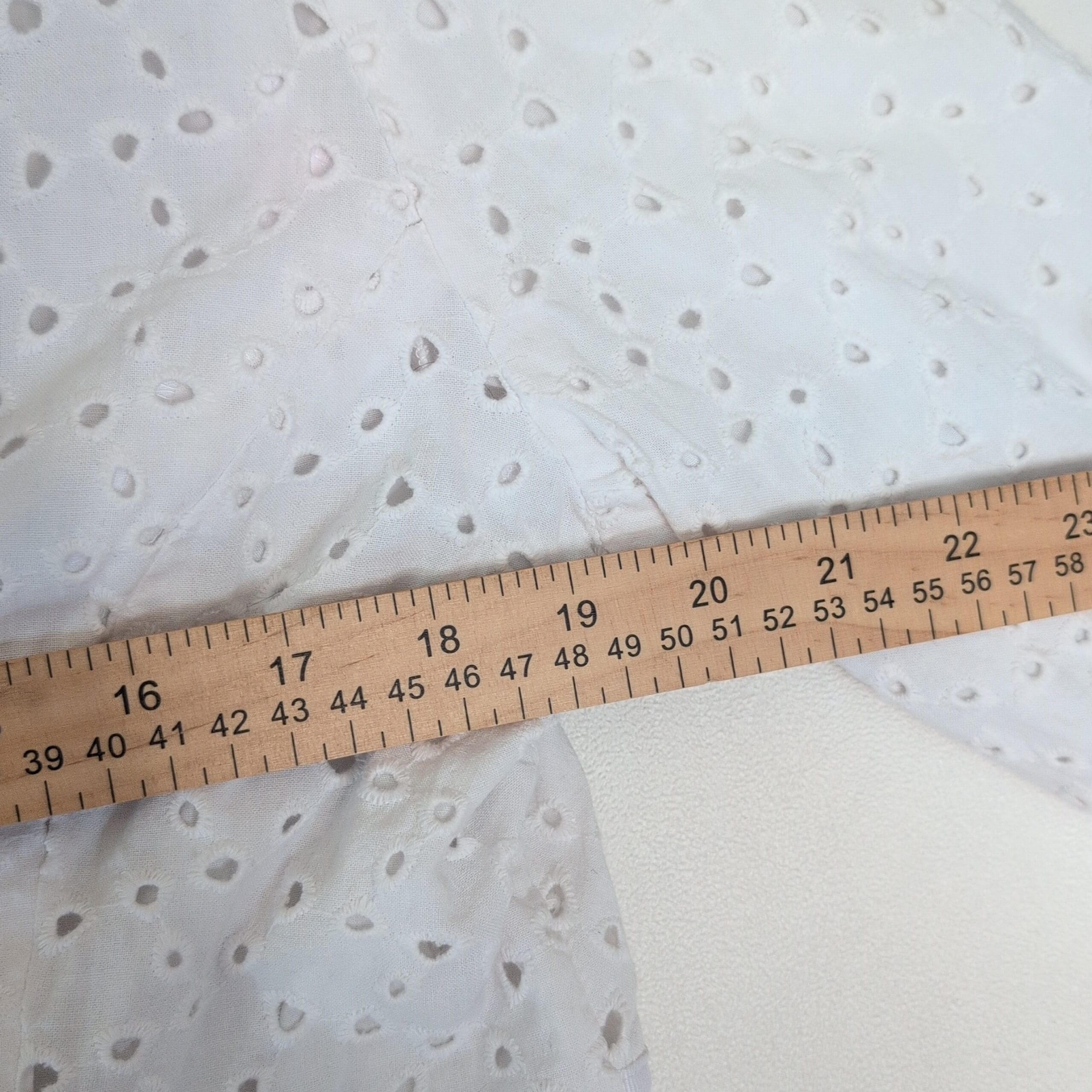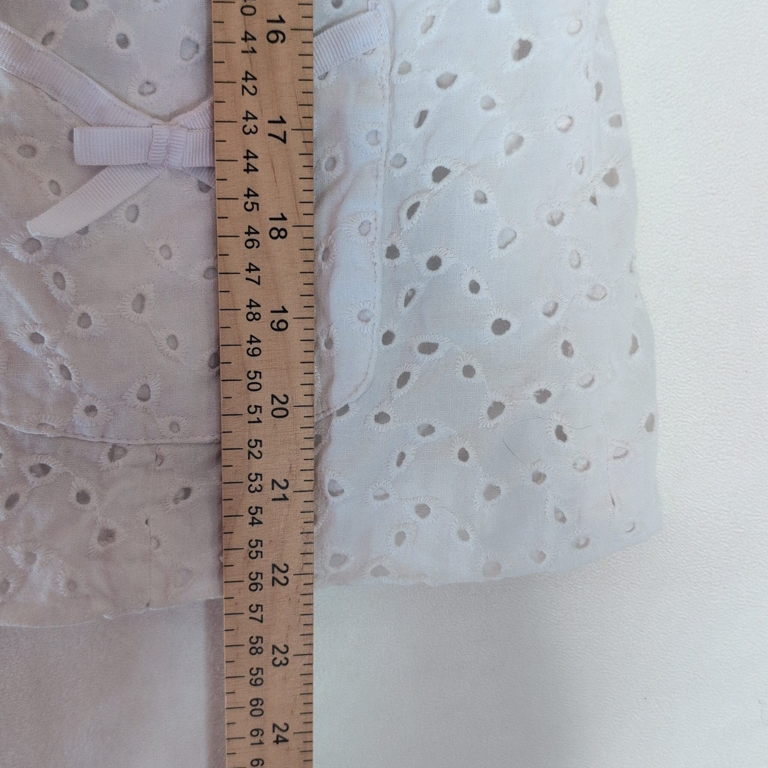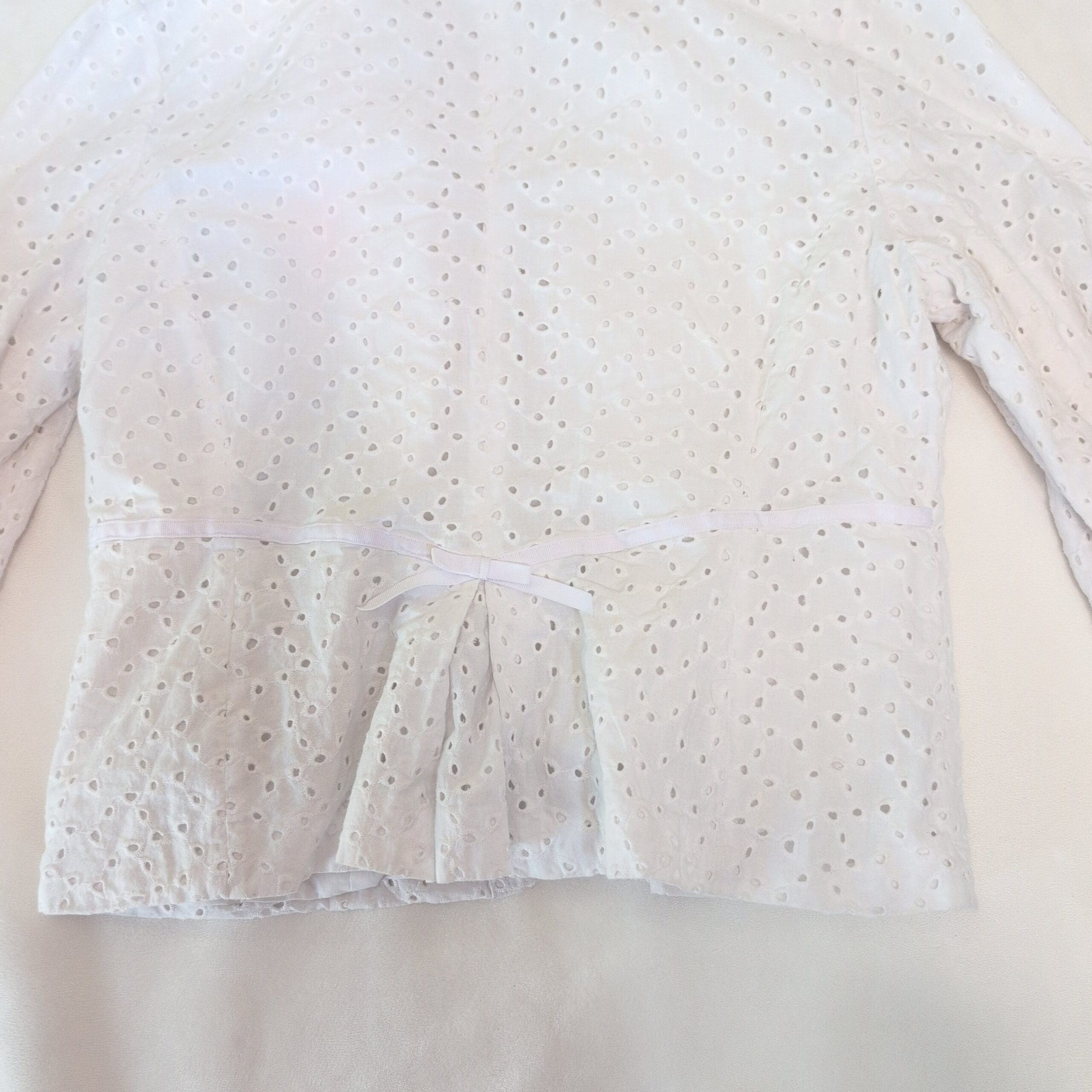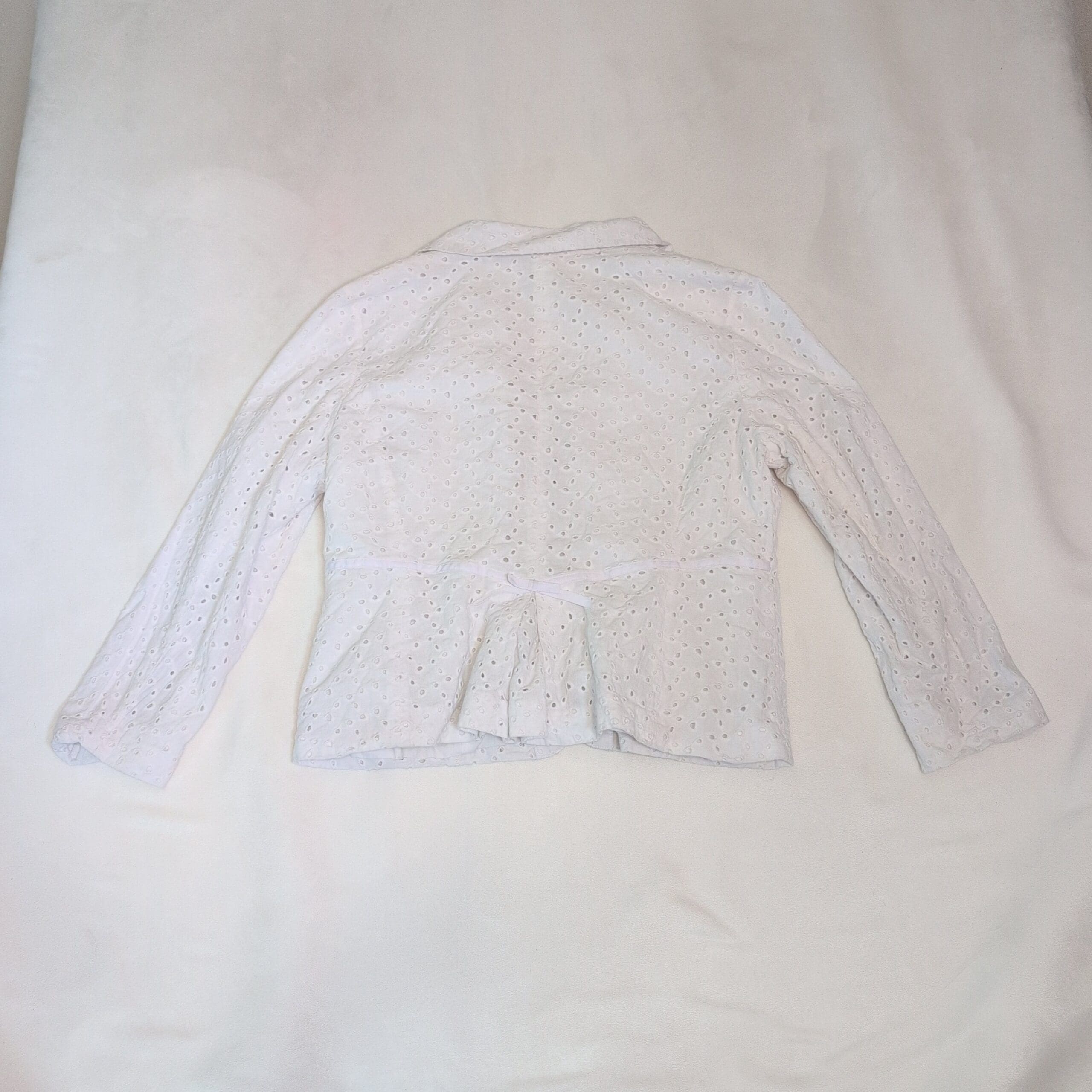 White eyelet blazer by Marisa Christina in women’s size 16 (Plus). Lightweight eyelet fabric with a notched lapel and button-front closure. Features two front patch pockets with delicate bow accents for a feminine touch — a clean, versatile piece perfect for spring and summer events or layered over dresses and tops. Measurements not provided; please refer to photos for details.