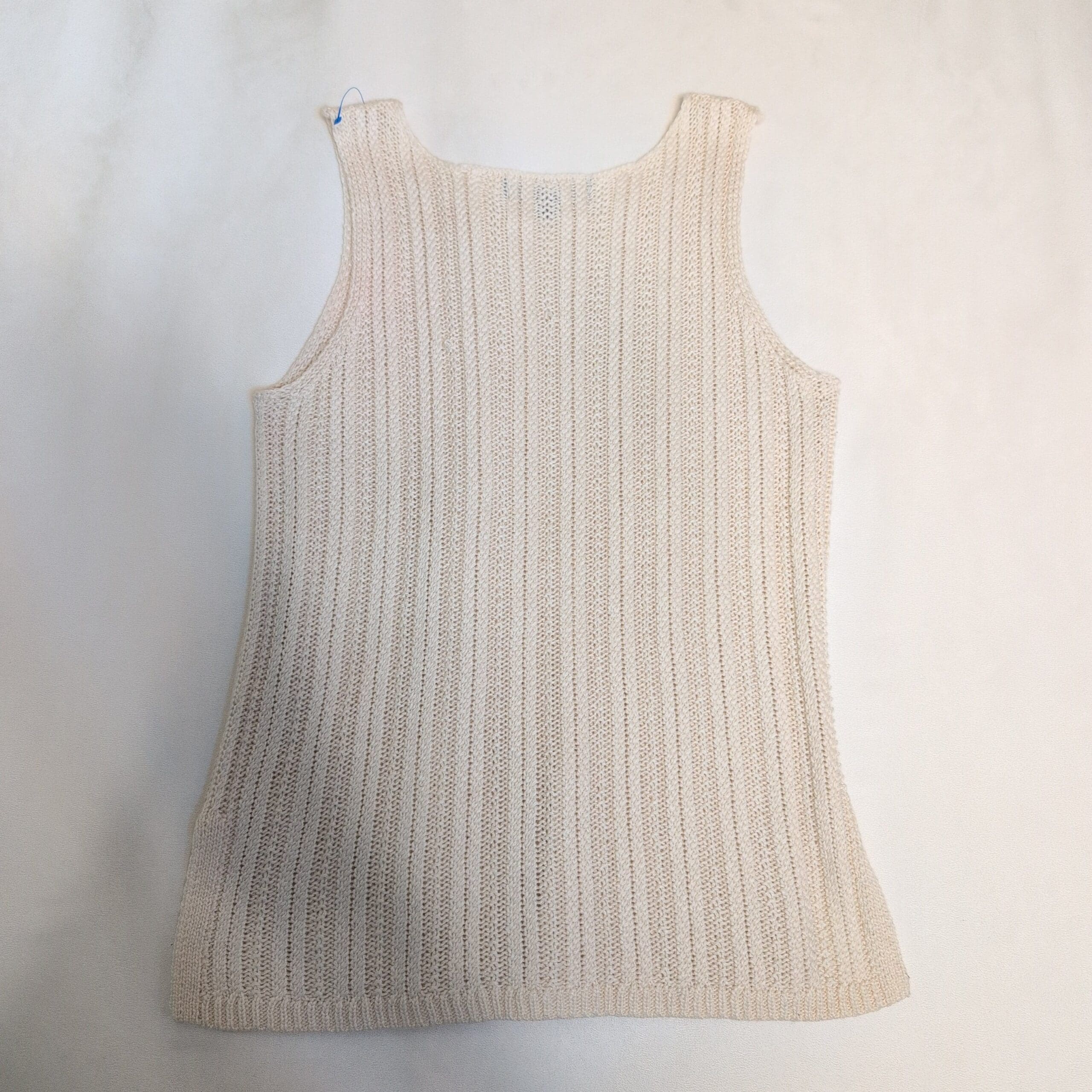 Marled sleeveless ribbed knit tunic in crisp white, size XS. Features a classic scoop neckline, relaxed A-line silhouette, and subtle side pockets — a versatile layering piece that pairs perfectly with jeans, leggings, or over a long-sleeve tee. Lightweight textured knit ideal for spring through fall; great for casual or elevated everyday looks. Well cared for and ready to wear.