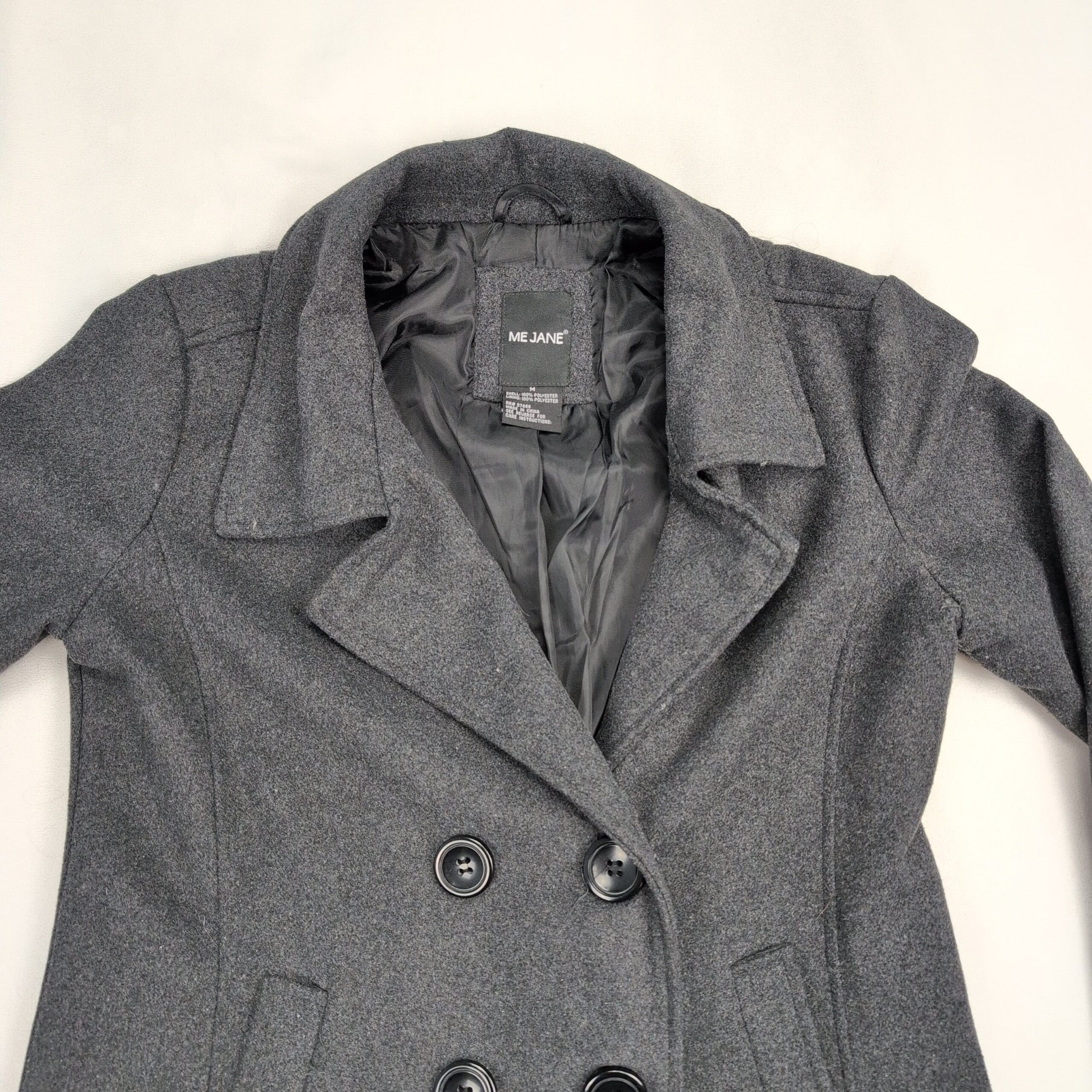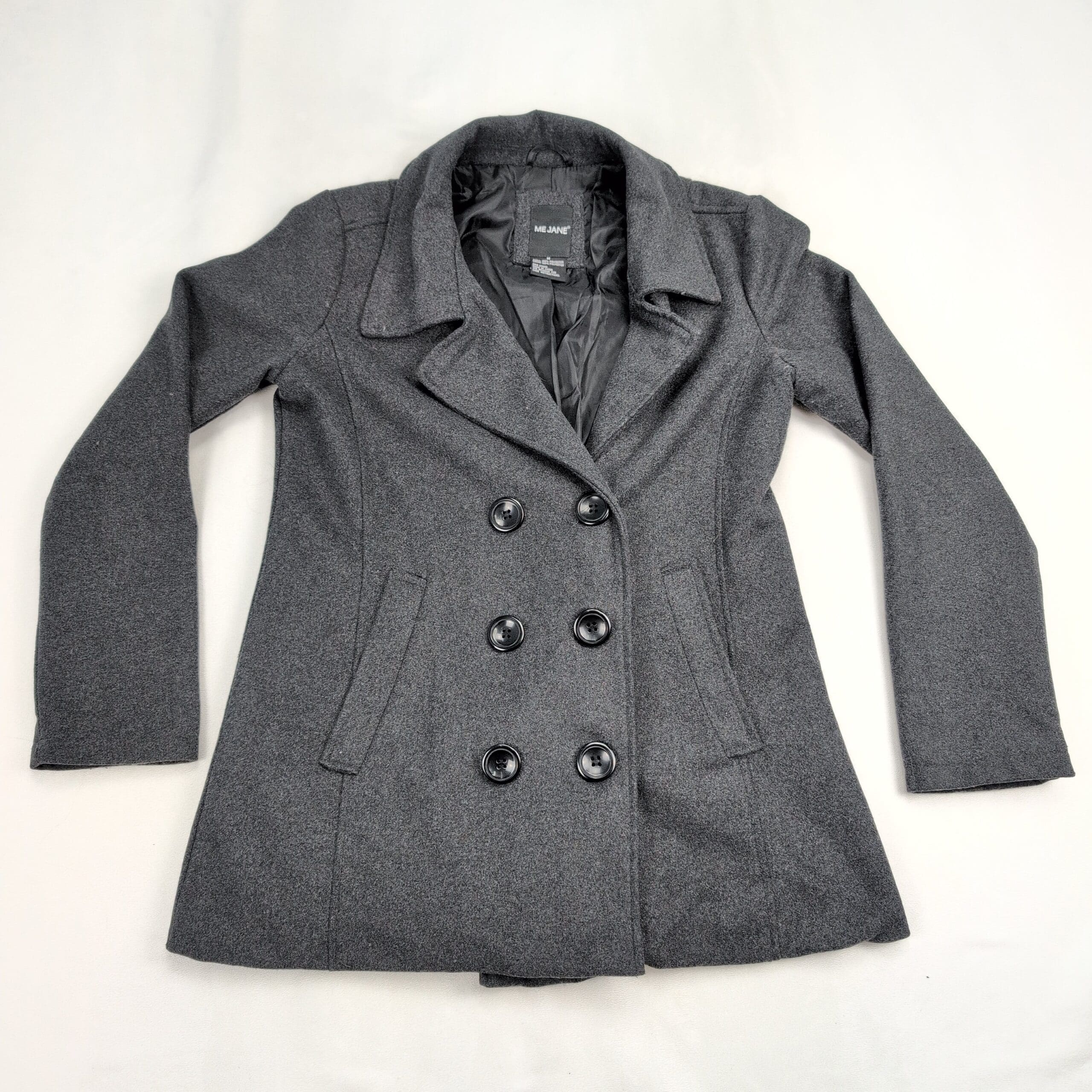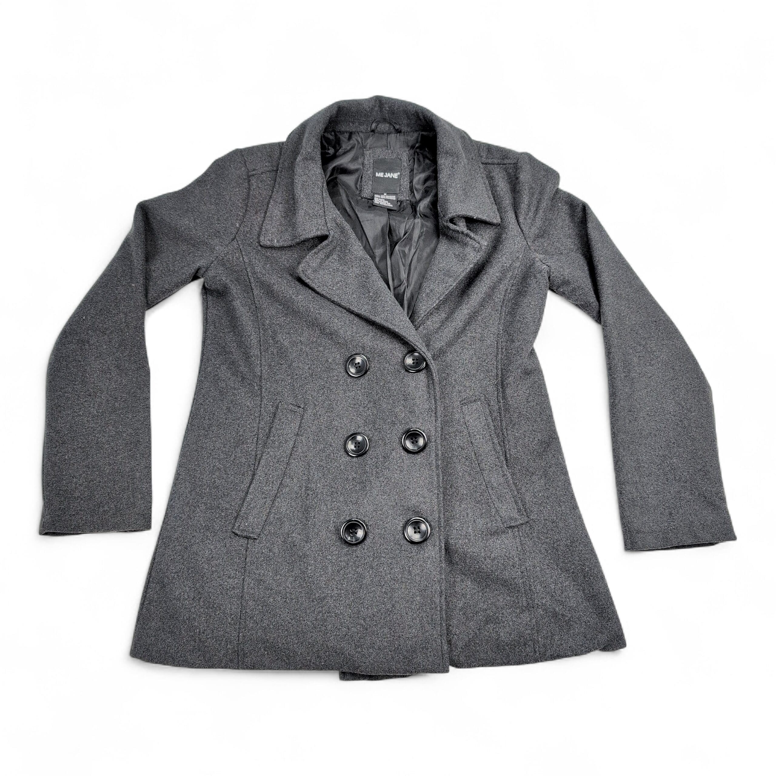 Me Jane women’s double-breasted pea coat in charcoal gray. Size M (standard). Polyester construction with a tailored silhouette, notch collar, six-button front, and angled welt pockets. Lined interior for added warmth and structure. Excellent used condition — free of major rips, tears, stains, or flaws; normal light wear consistent with gentle use. Please review photos for details.