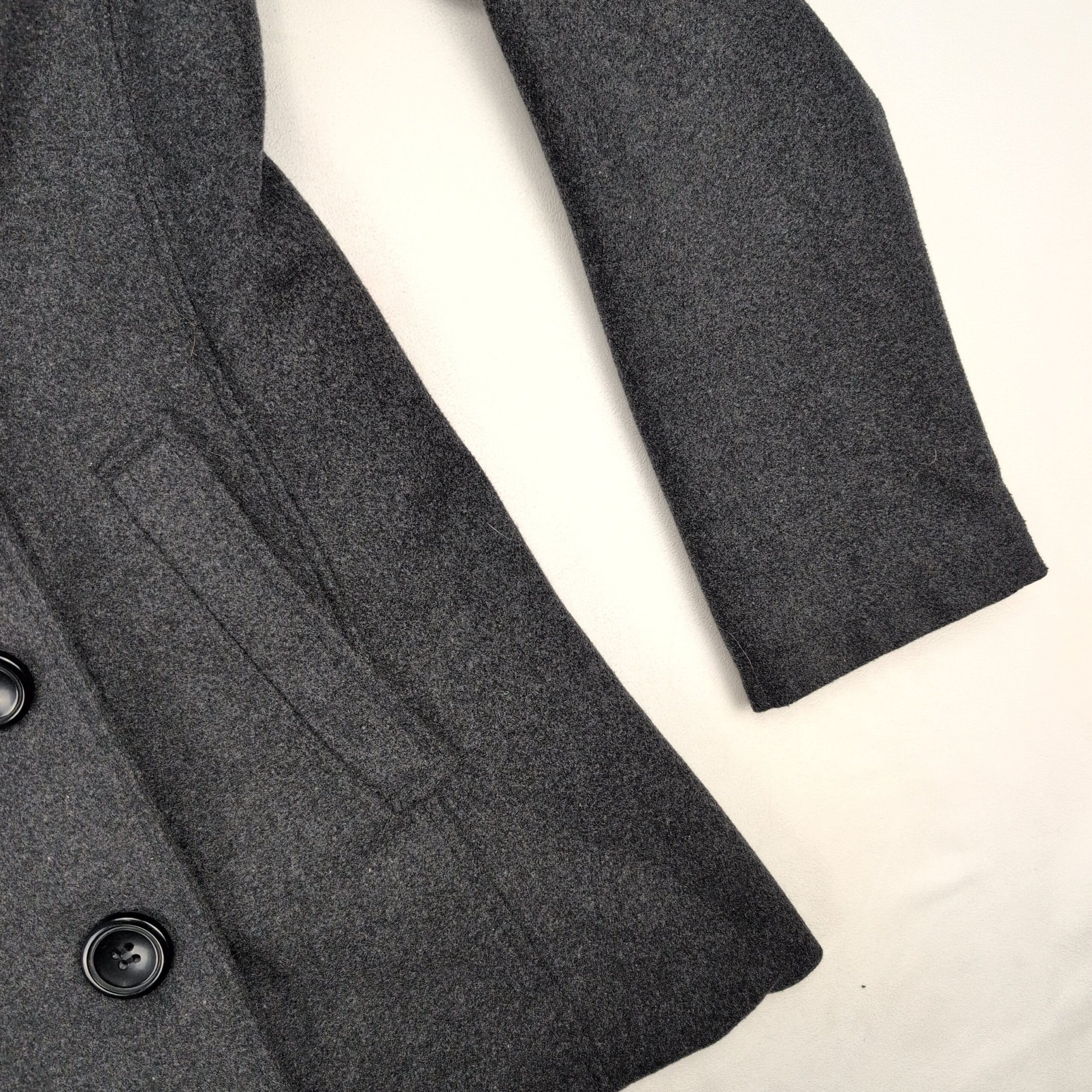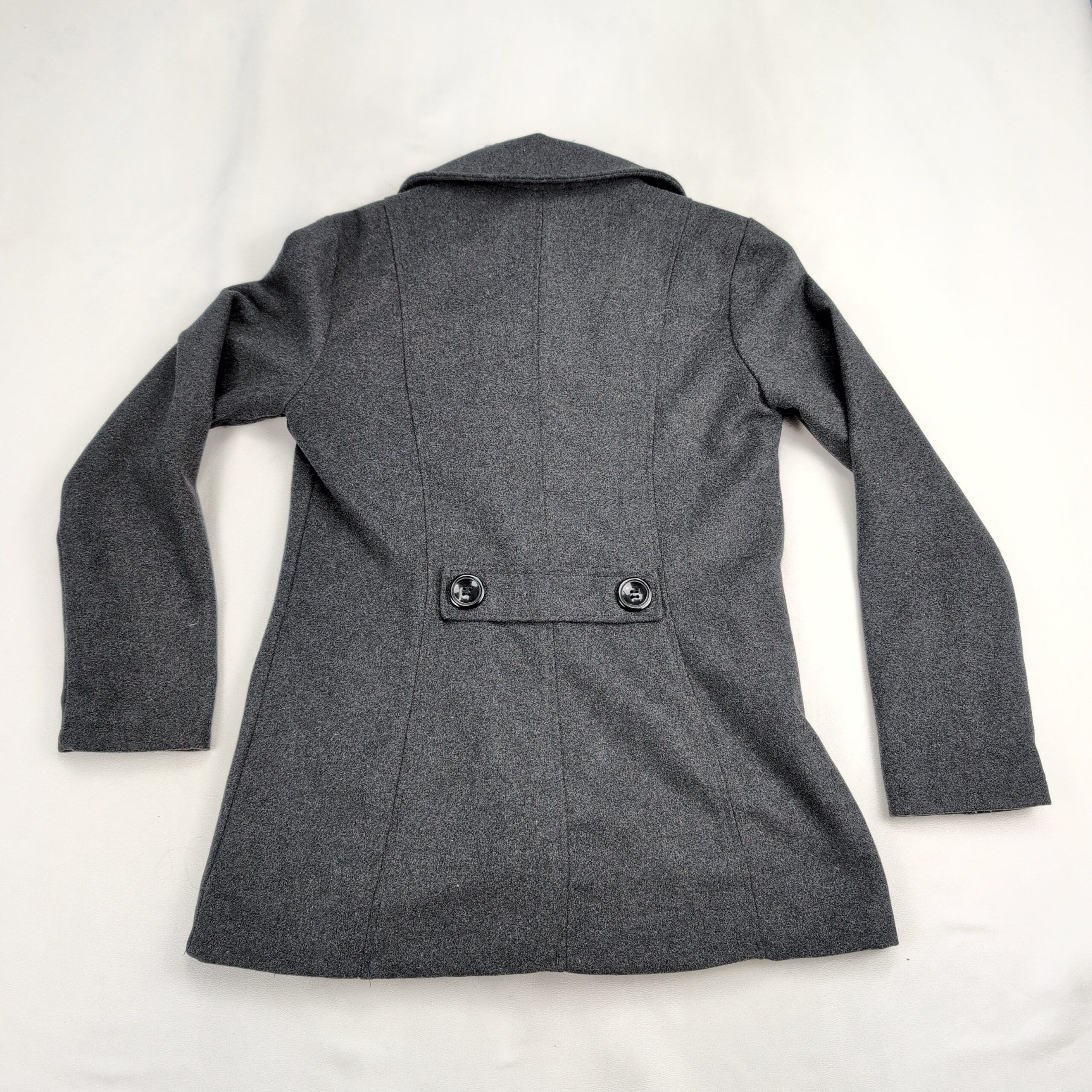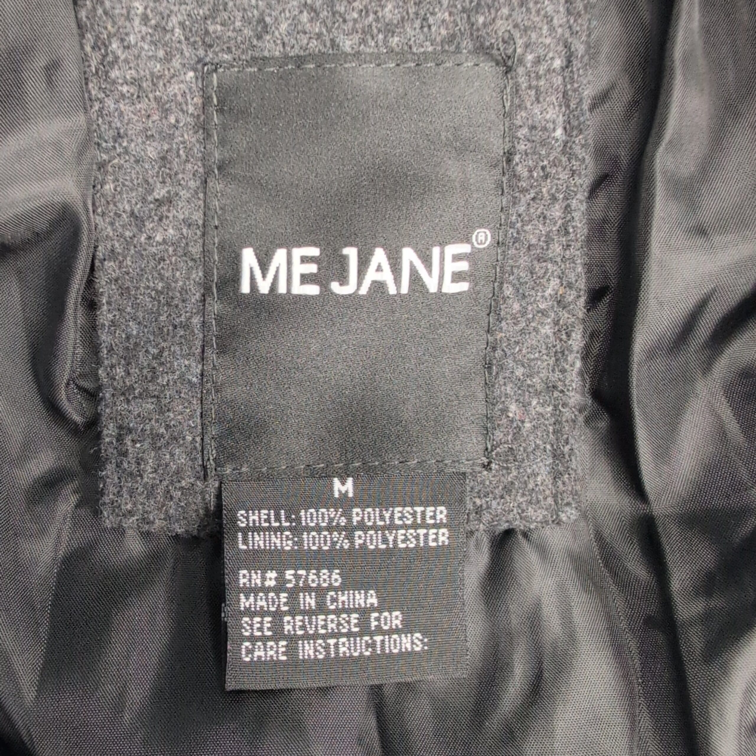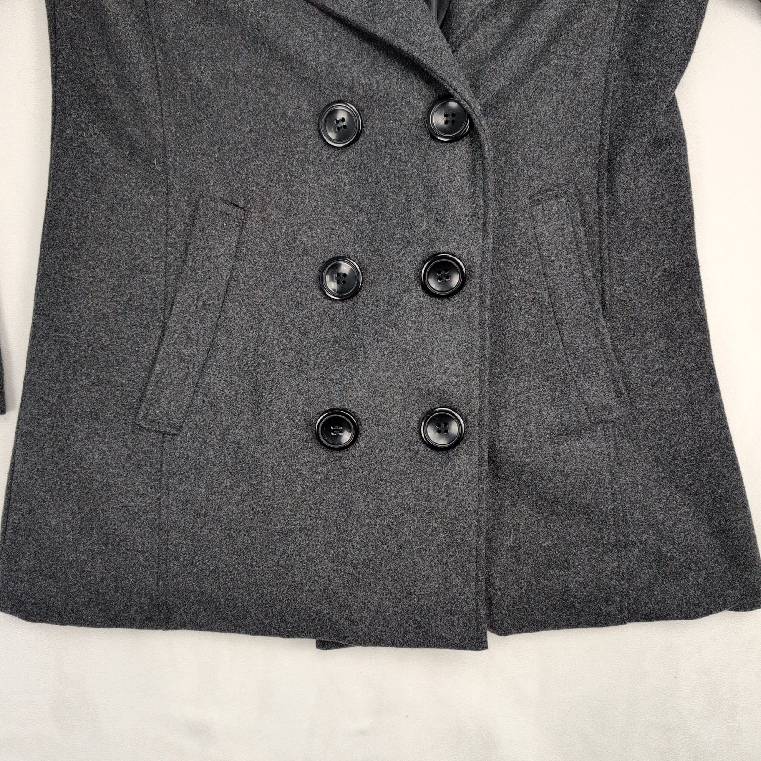 Me Jane women’s double-breasted pea coat in charcoal gray. Size M (standard). Polyester construction with a tailored silhouette, notch collar, six-button front, and angled welt pockets. Lined interior for added warmth and structure. Excellent used condition — free of major rips, tears, stains, or flaws; normal light wear consistent with gentle use. Please review photos for details.