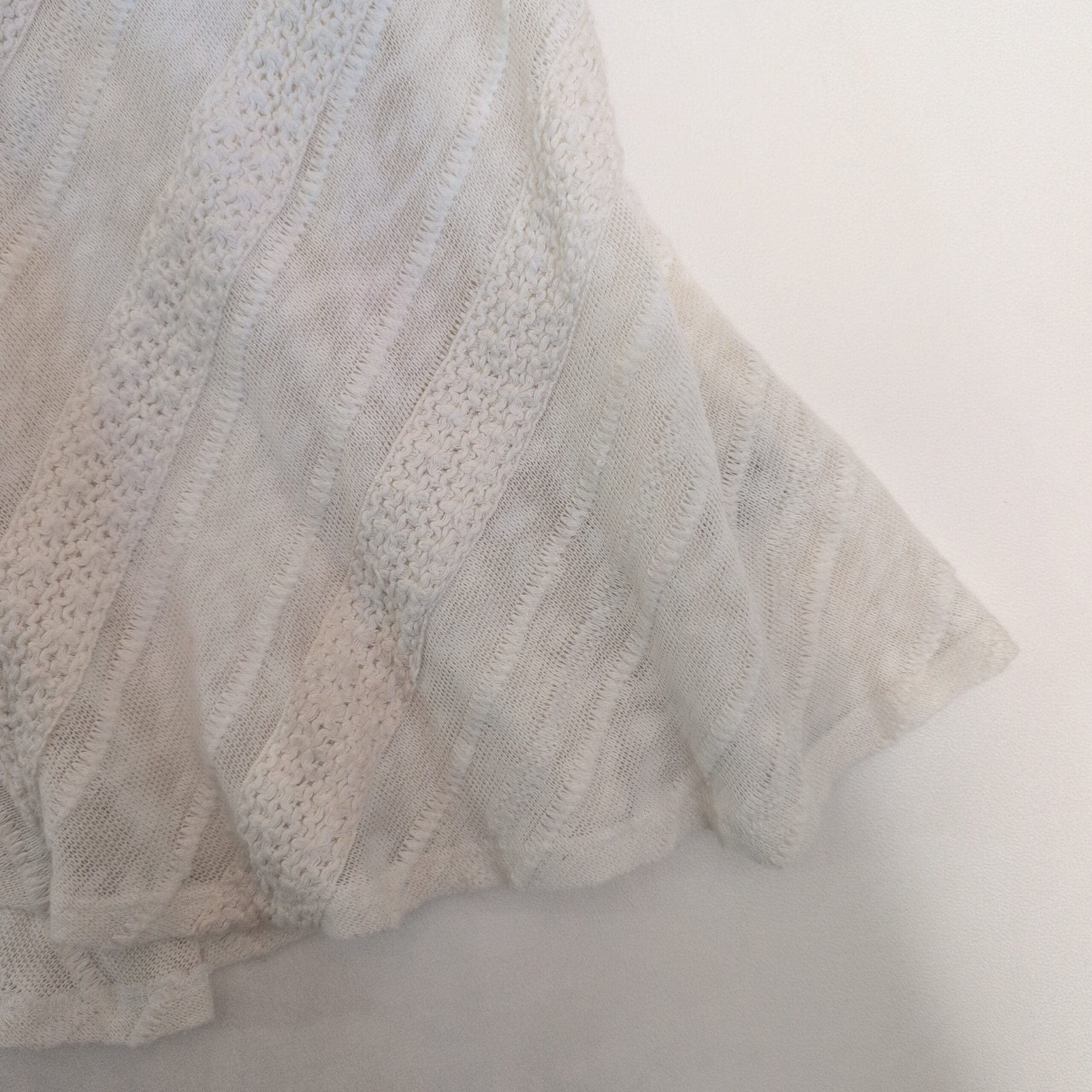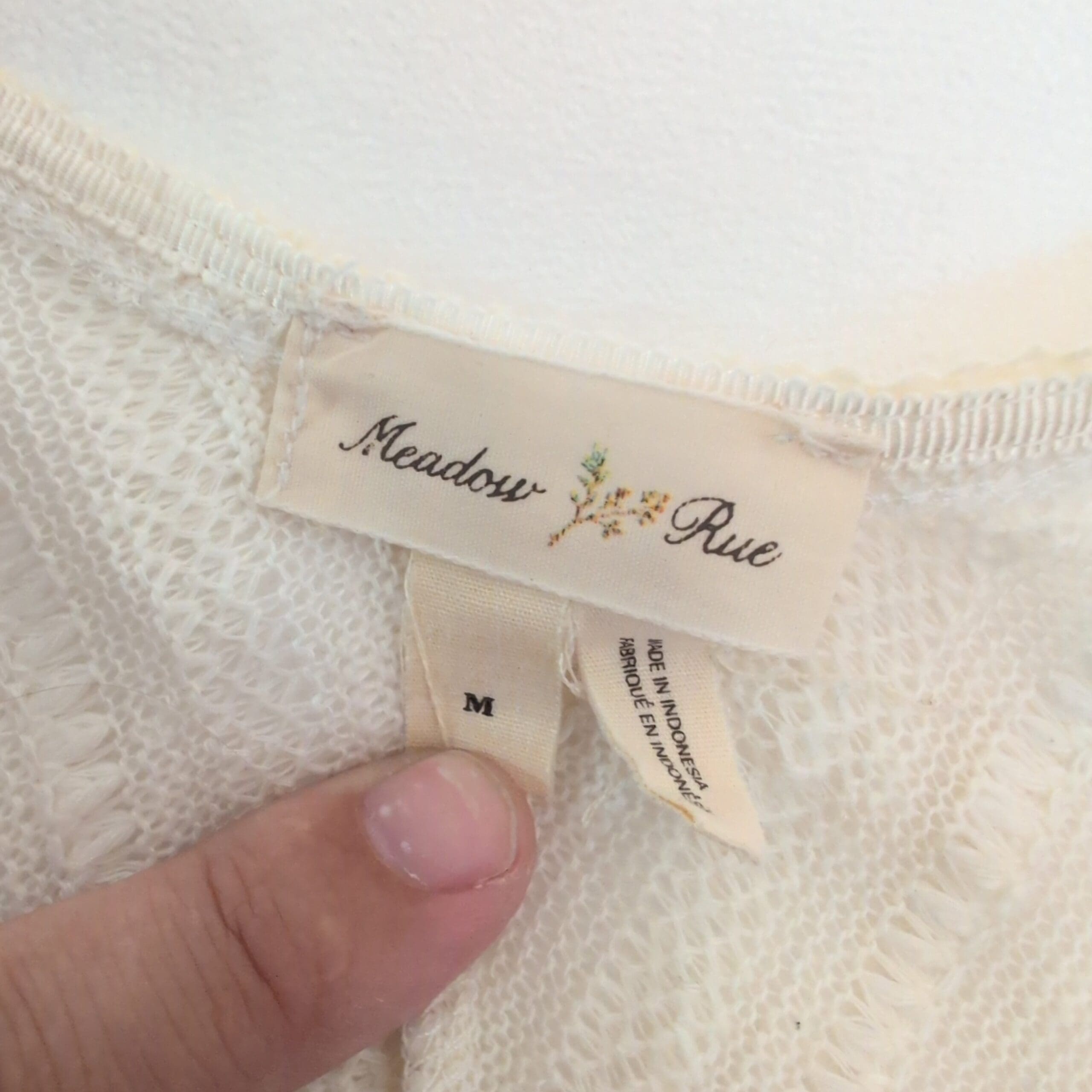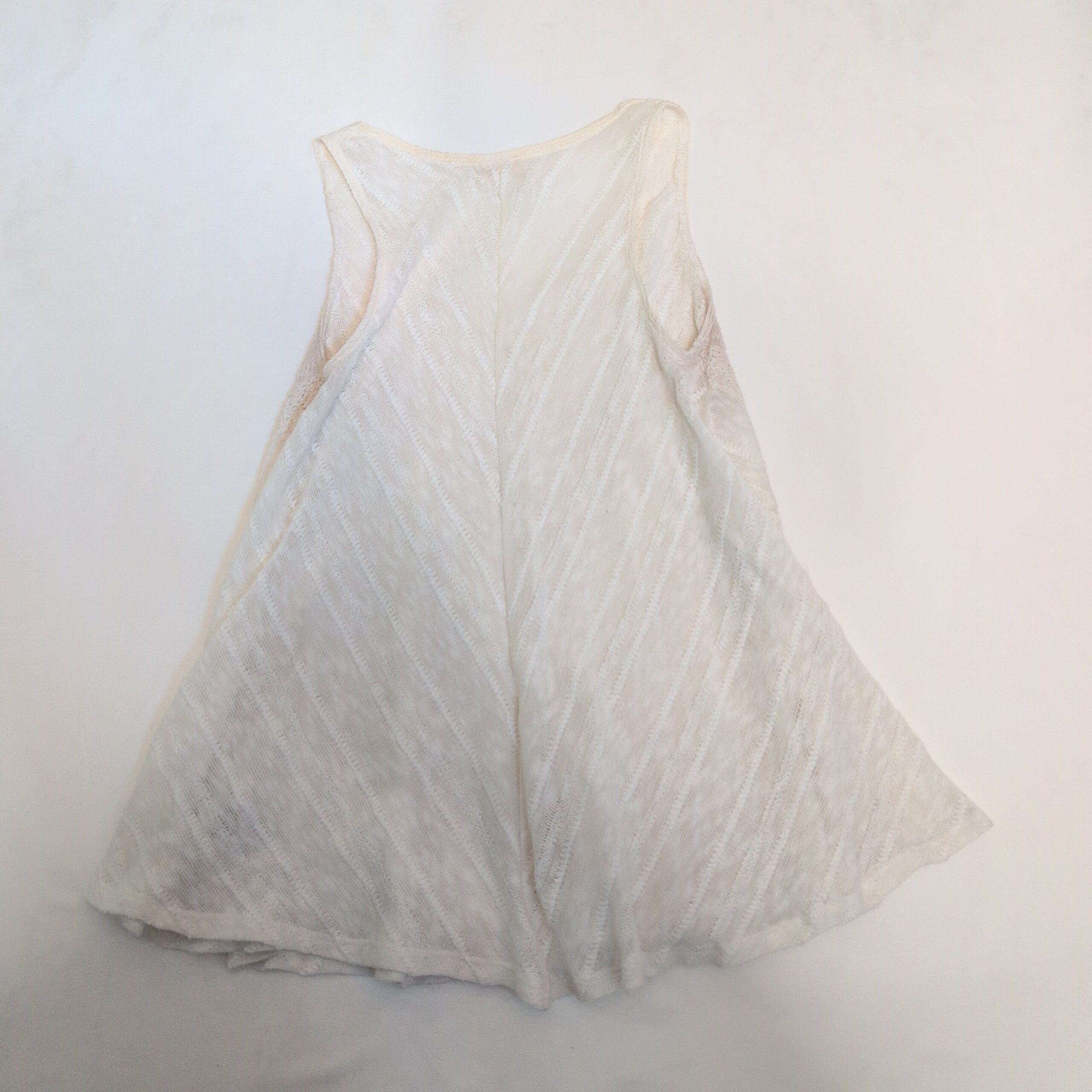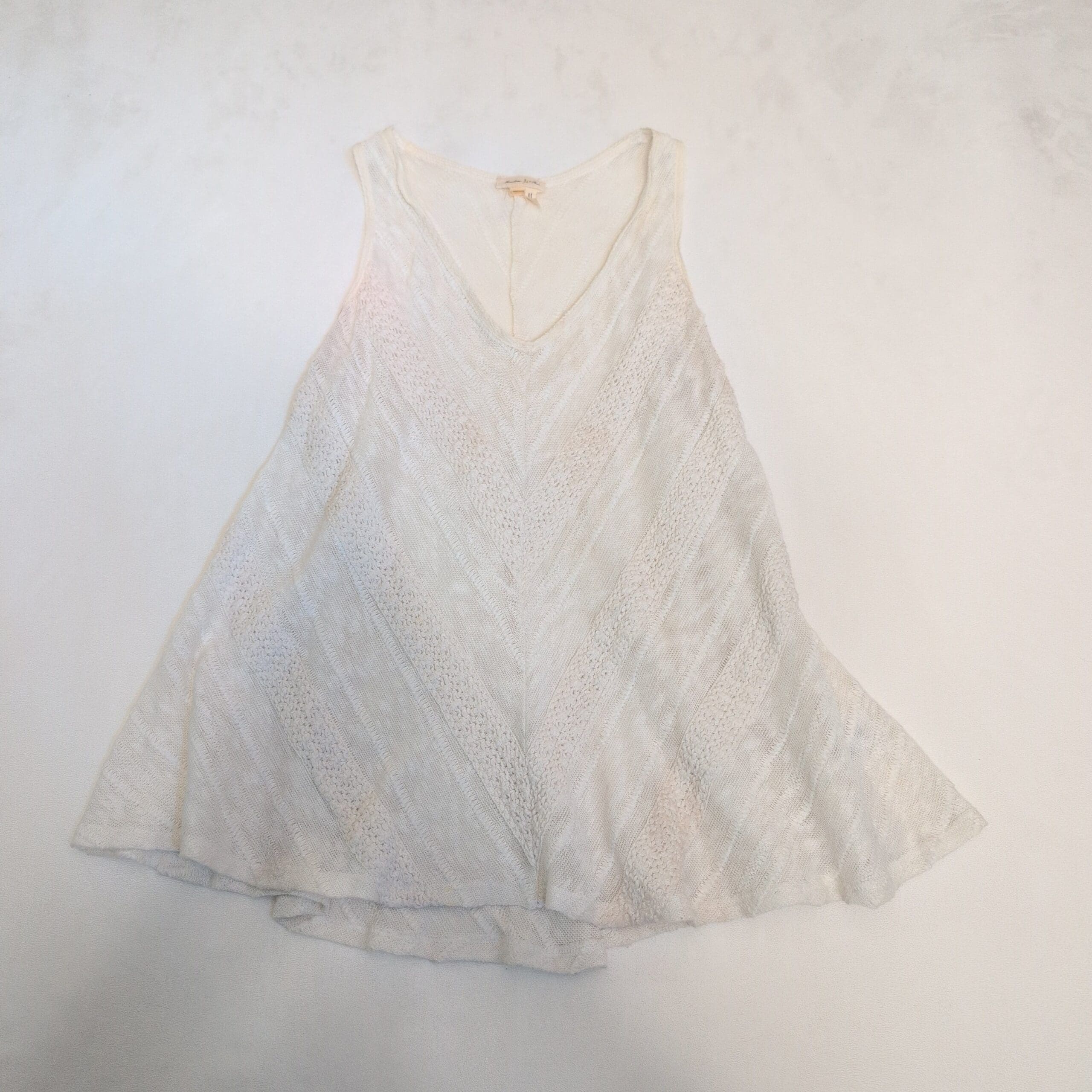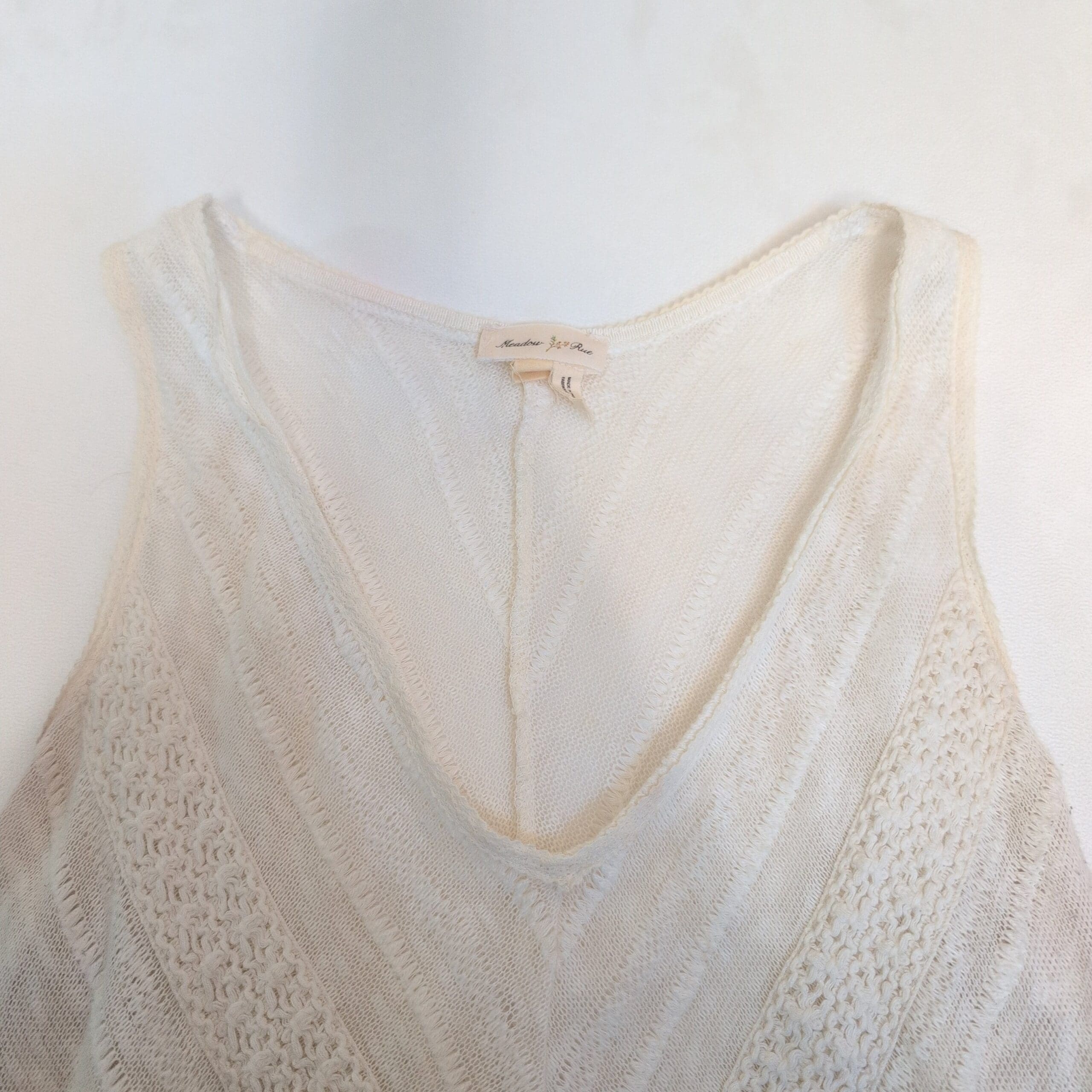 Meadow Rue white tank top in size M. Lightweight textured knit with chevron-style paneling and a relaxed A-line silhouette. V-neck and sleeveless with a gently flared hem for easy movement. Great for layering or wearing alone in warm weather. Brand tag shown in photos.
