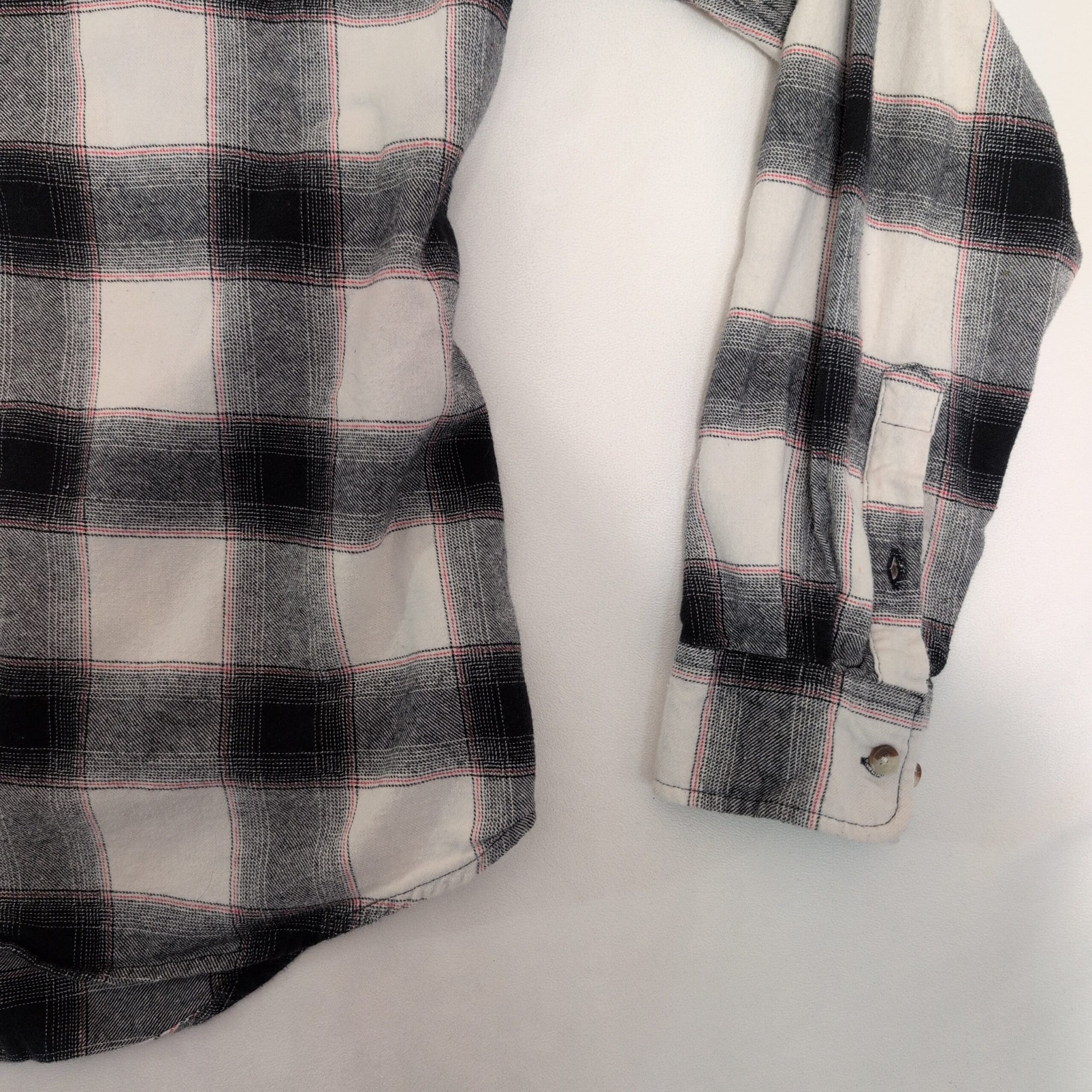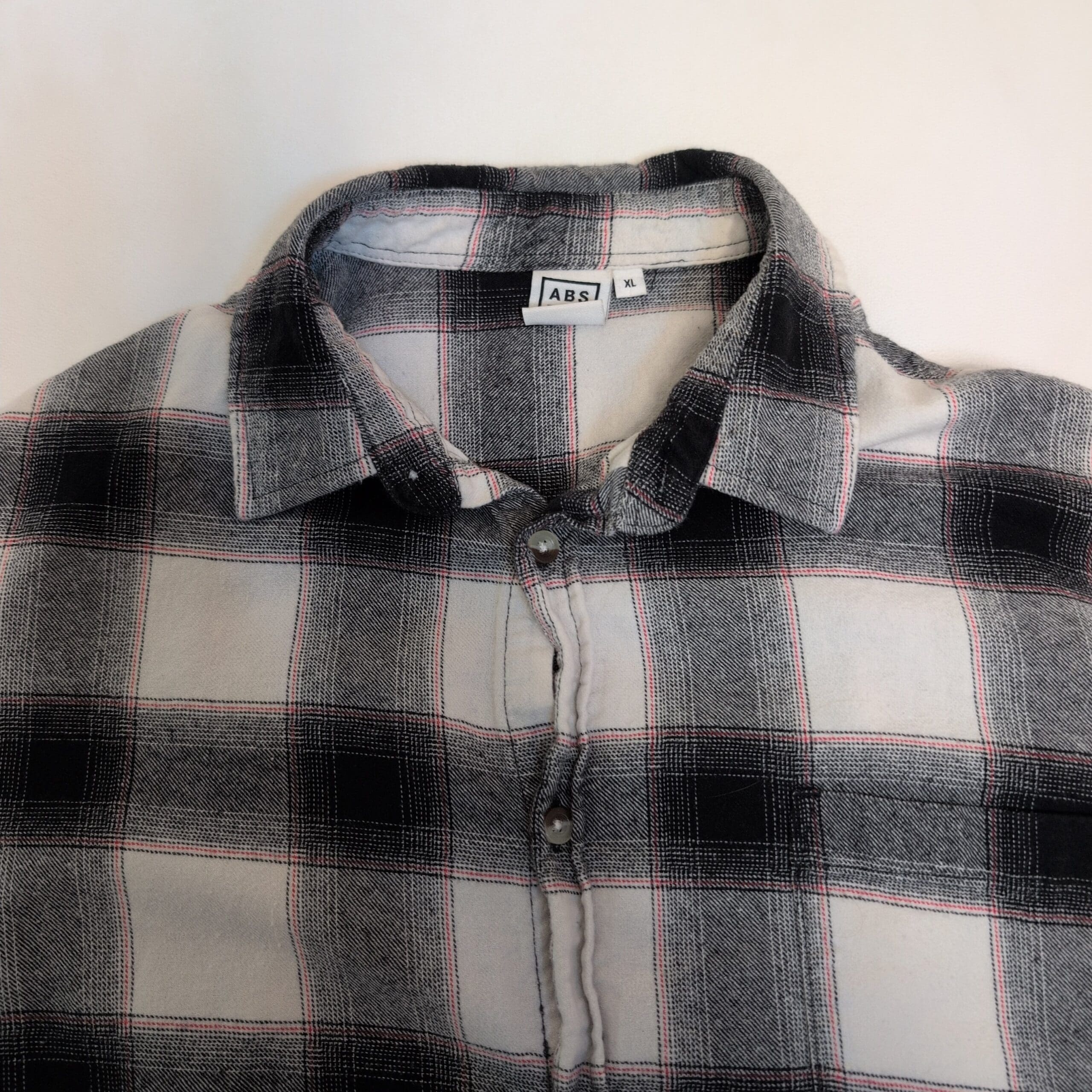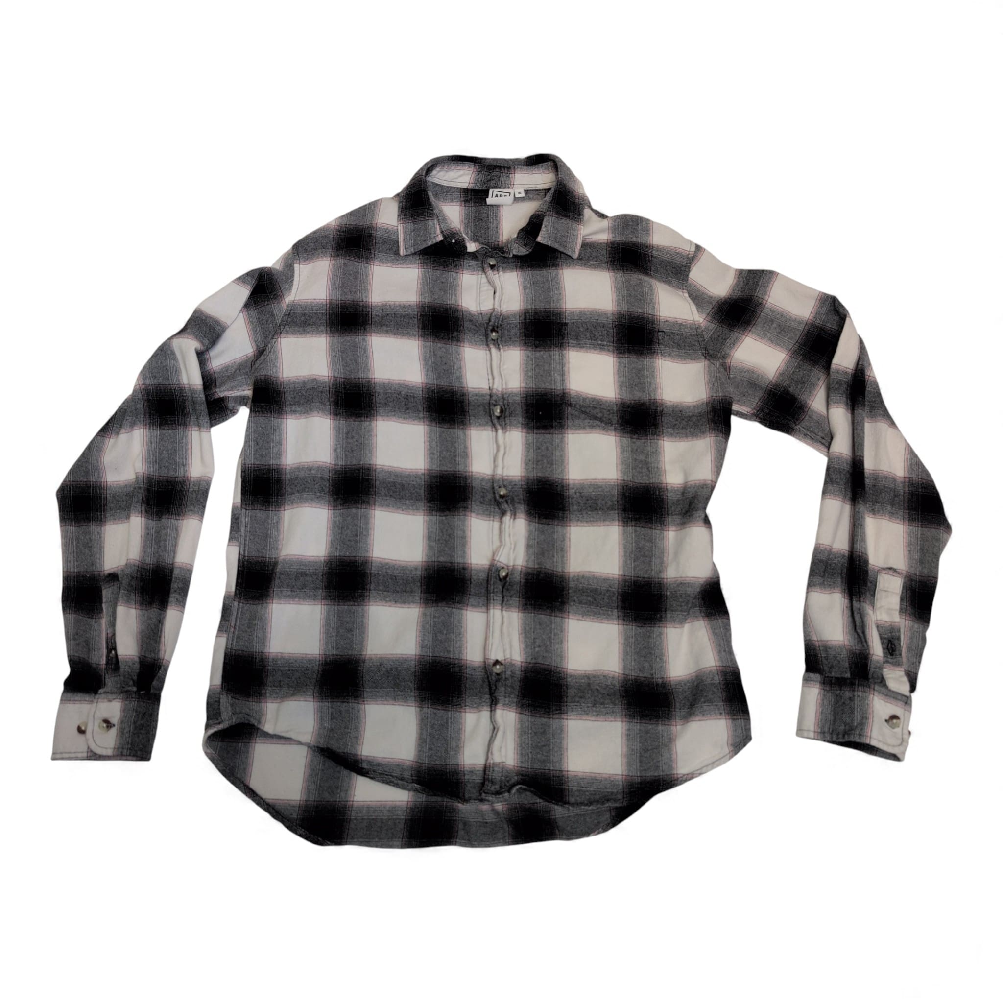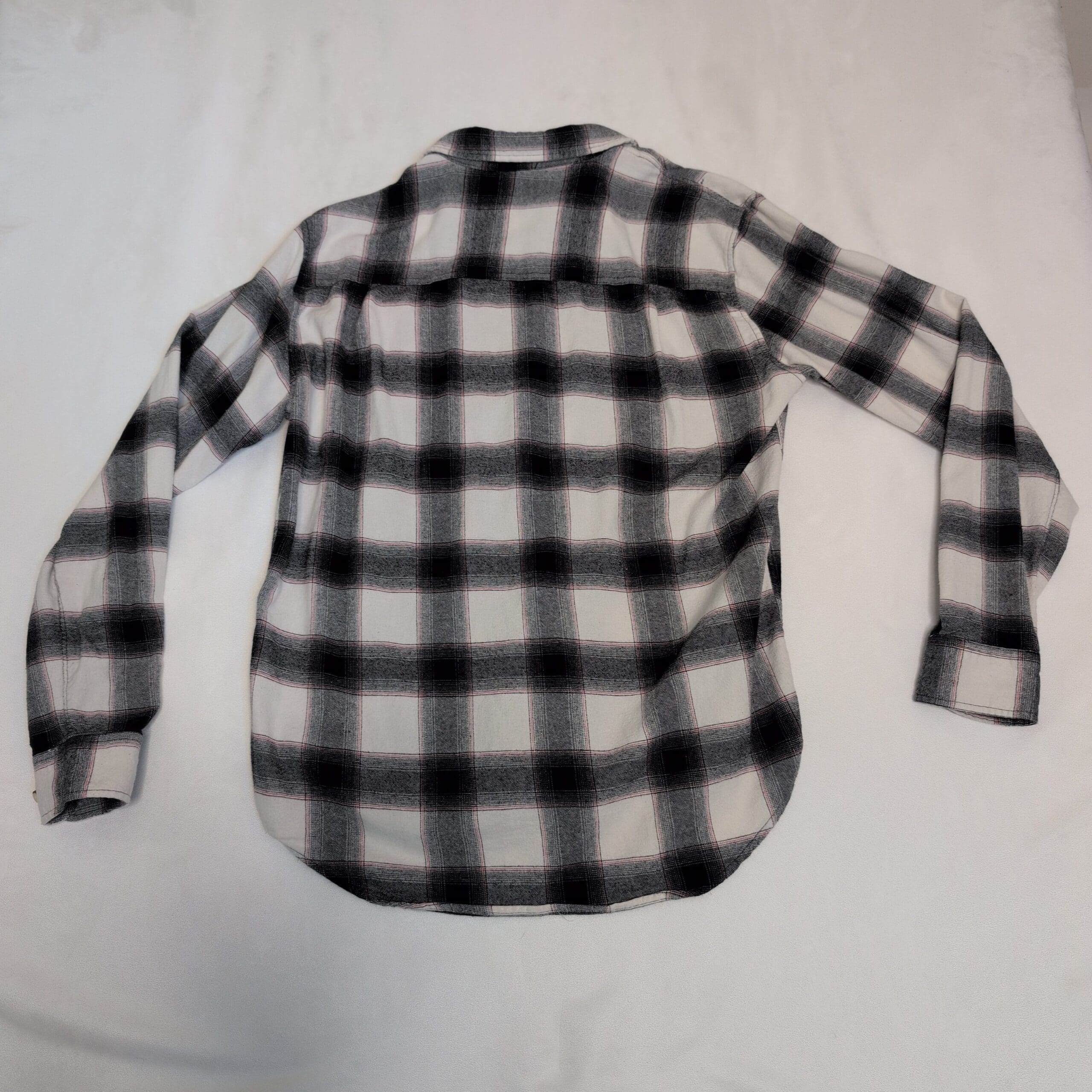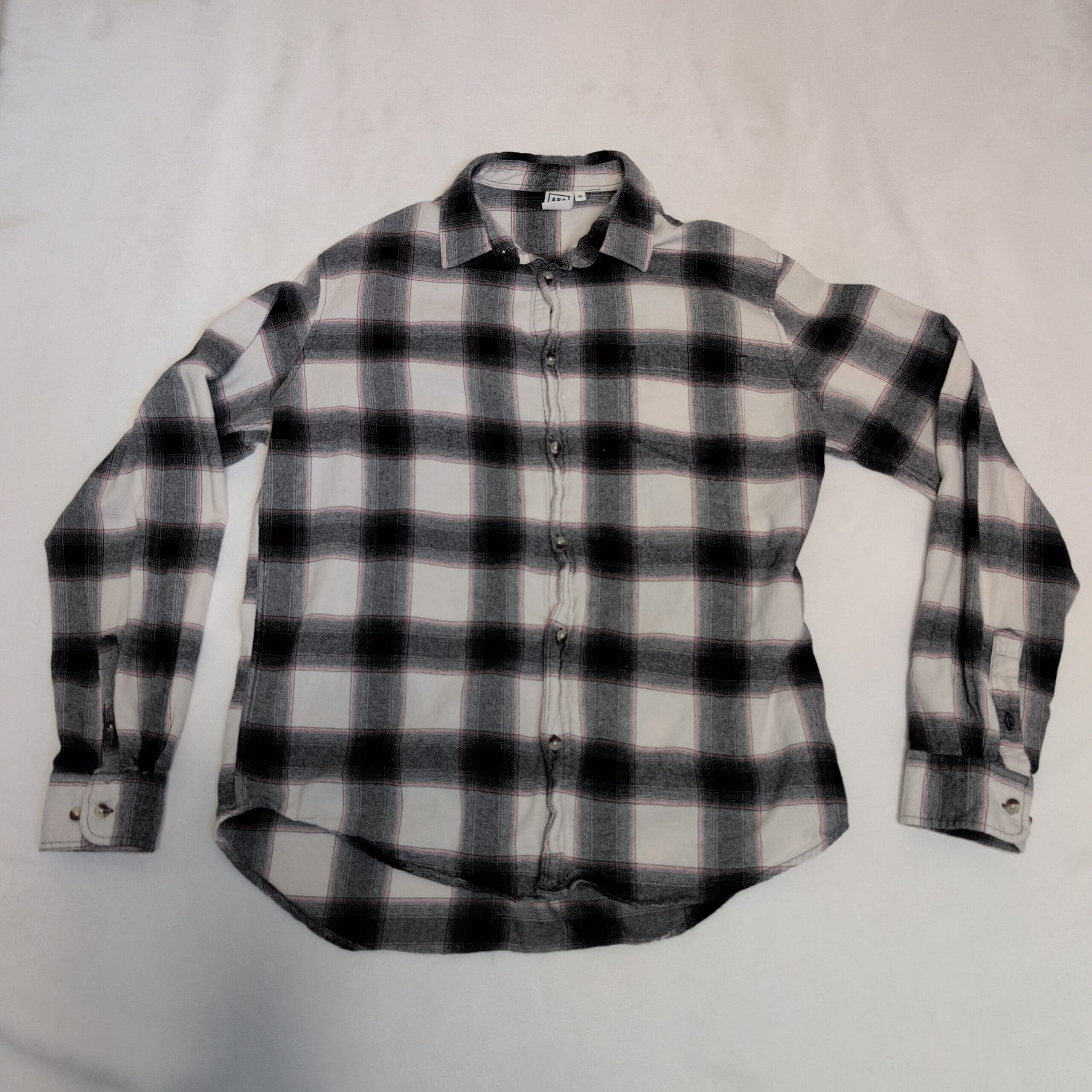 Classic men’s black-and-white plaid long-sleeve button-down shirt in size XL. Relaxed fit with a curved hem for easy tucking and layering. Features a full button front, spread collar, and button cuffs—versatile for casual or smart-casual looks. Pre-owned, gently used and in good condition with normal light signs of wear consistent with regular use. Great staple for everyday wear.