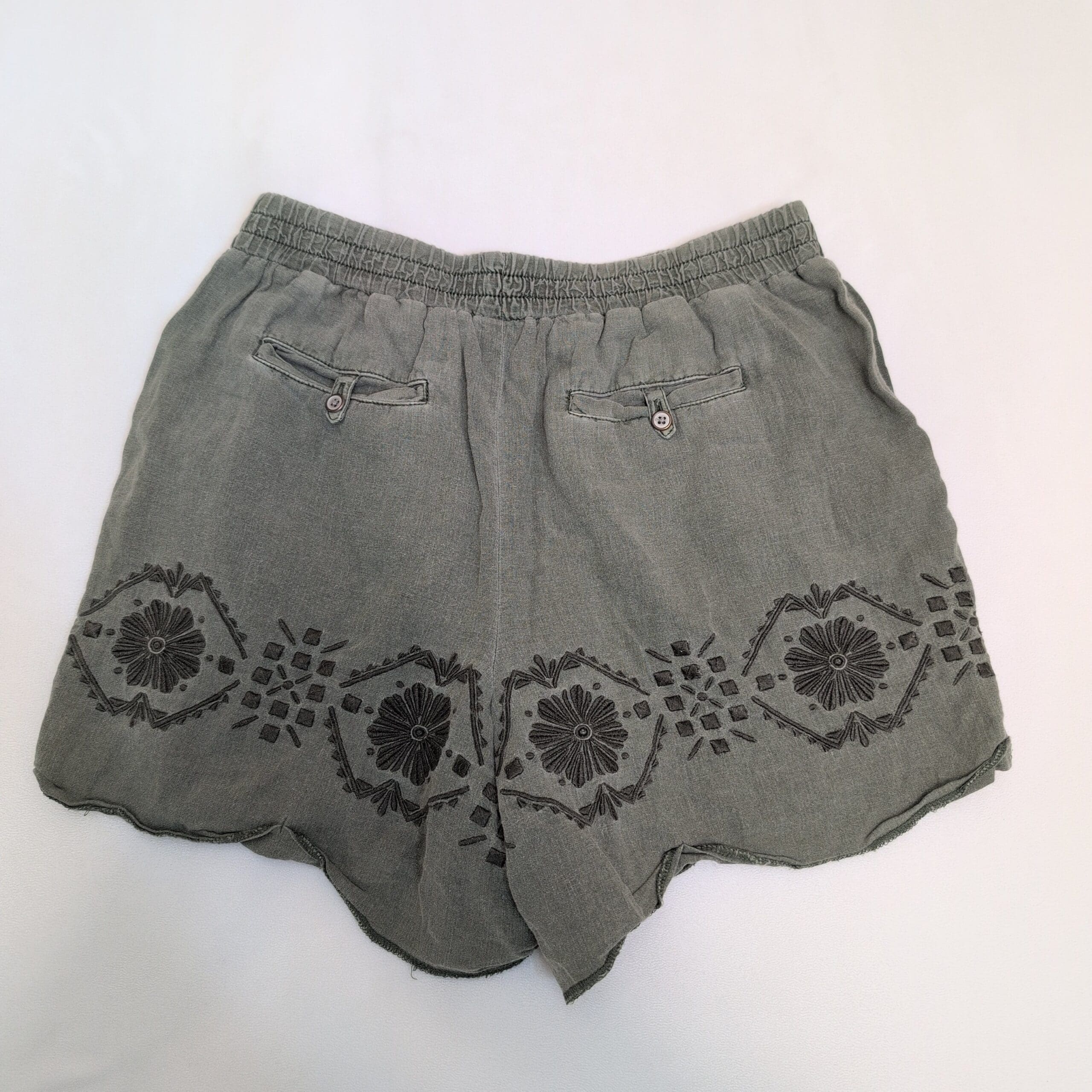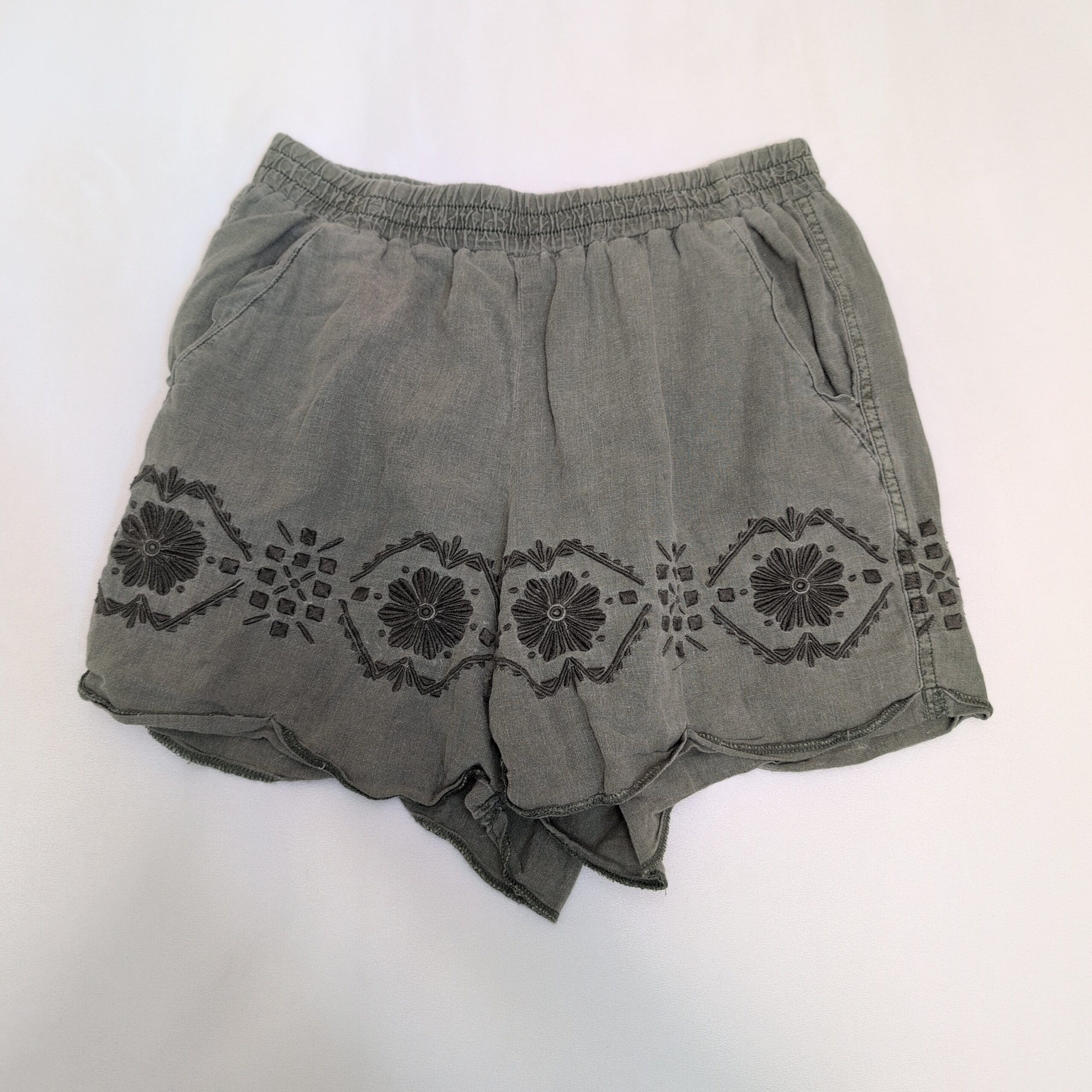 Mermiad green high-waist women’s shorts in size S. Lightweight woven fabric with an elastic waistband, side pockets, scalloped hem, and decorative embroidered floral border along the legs. Relaxed, flowy silhouette ideal for warm weather, casual outings, or beach days. Color is a muted olive green with a soft, lived-in wash. Gently pre-owned with no noticeable stains, holes, or odors; exact fiber content not labeled.