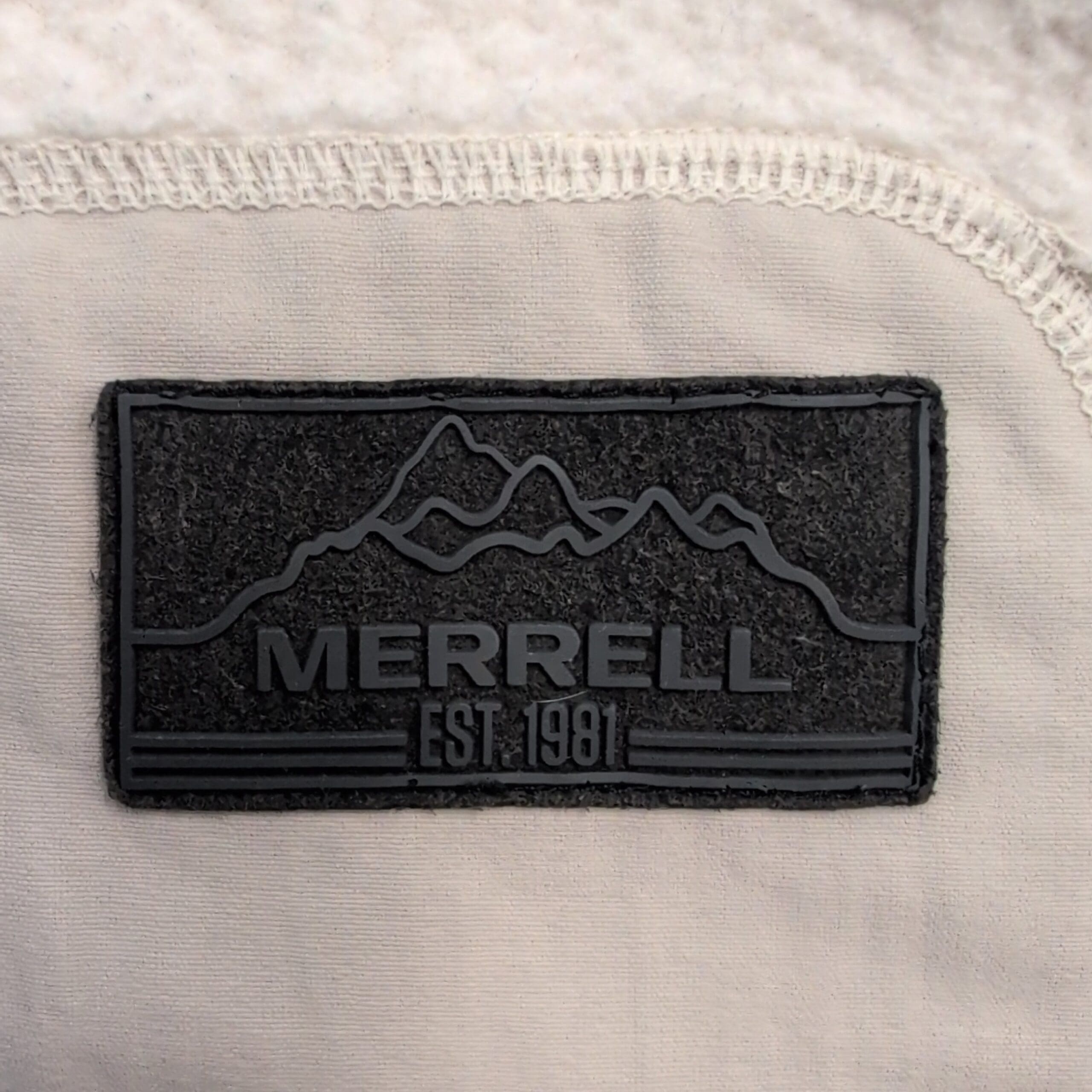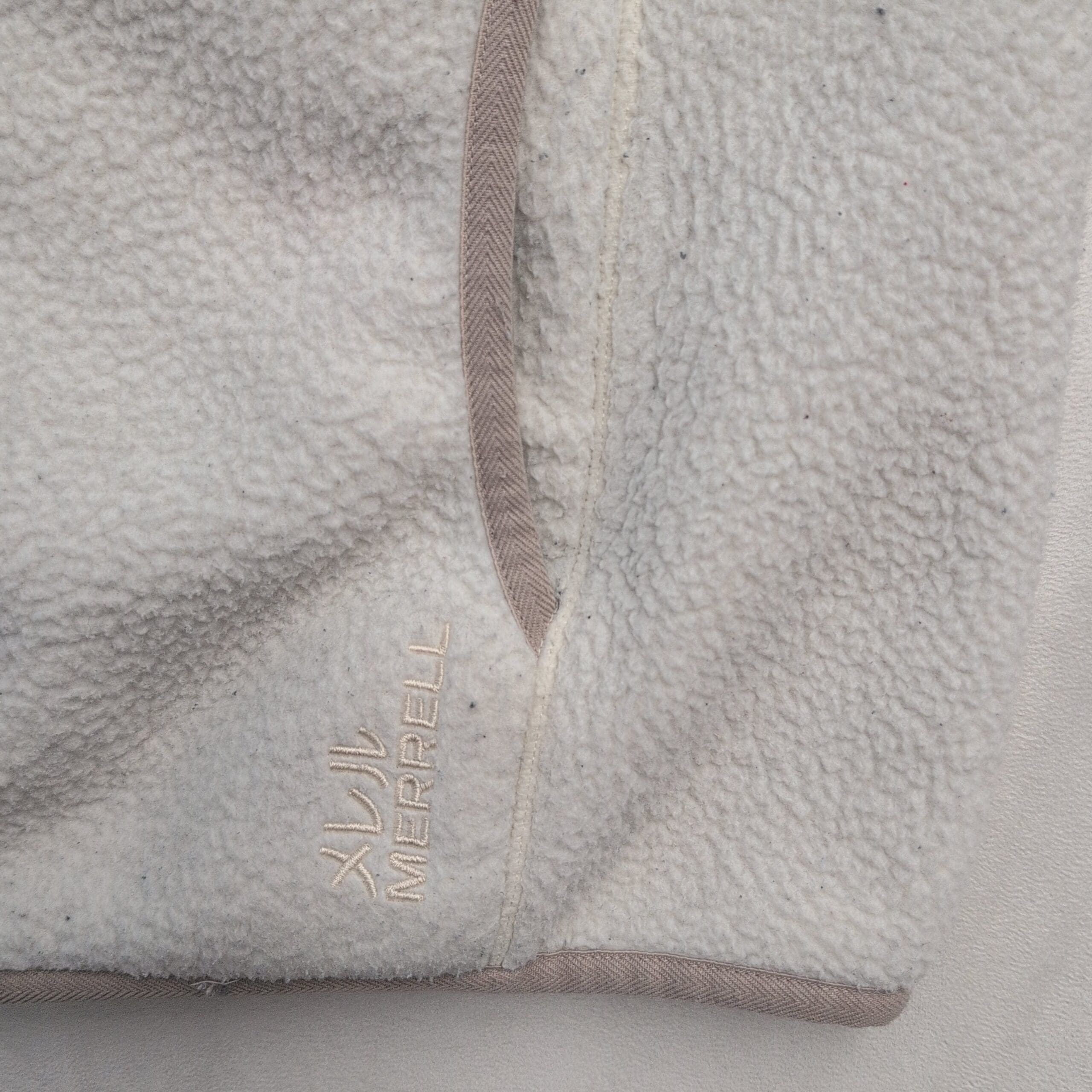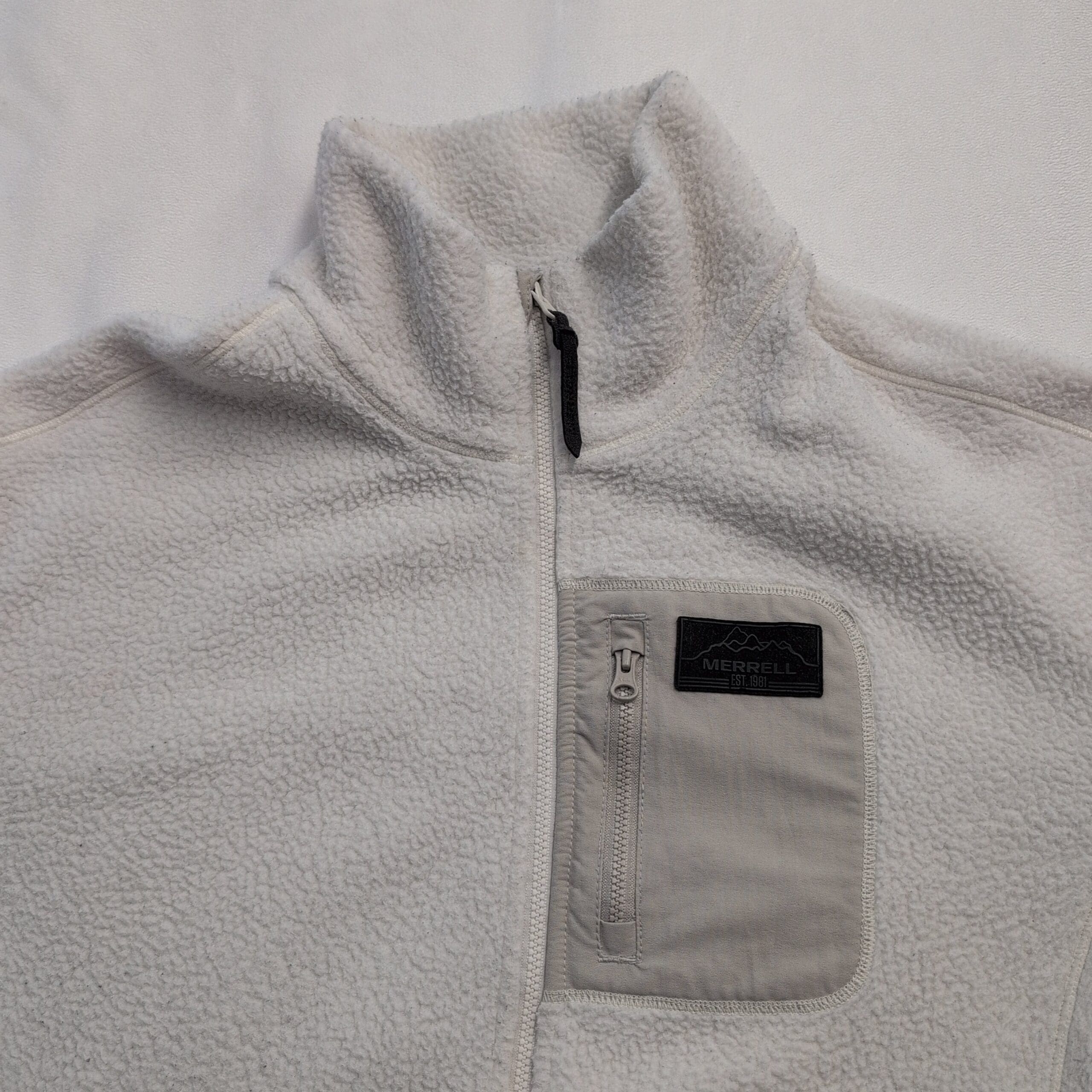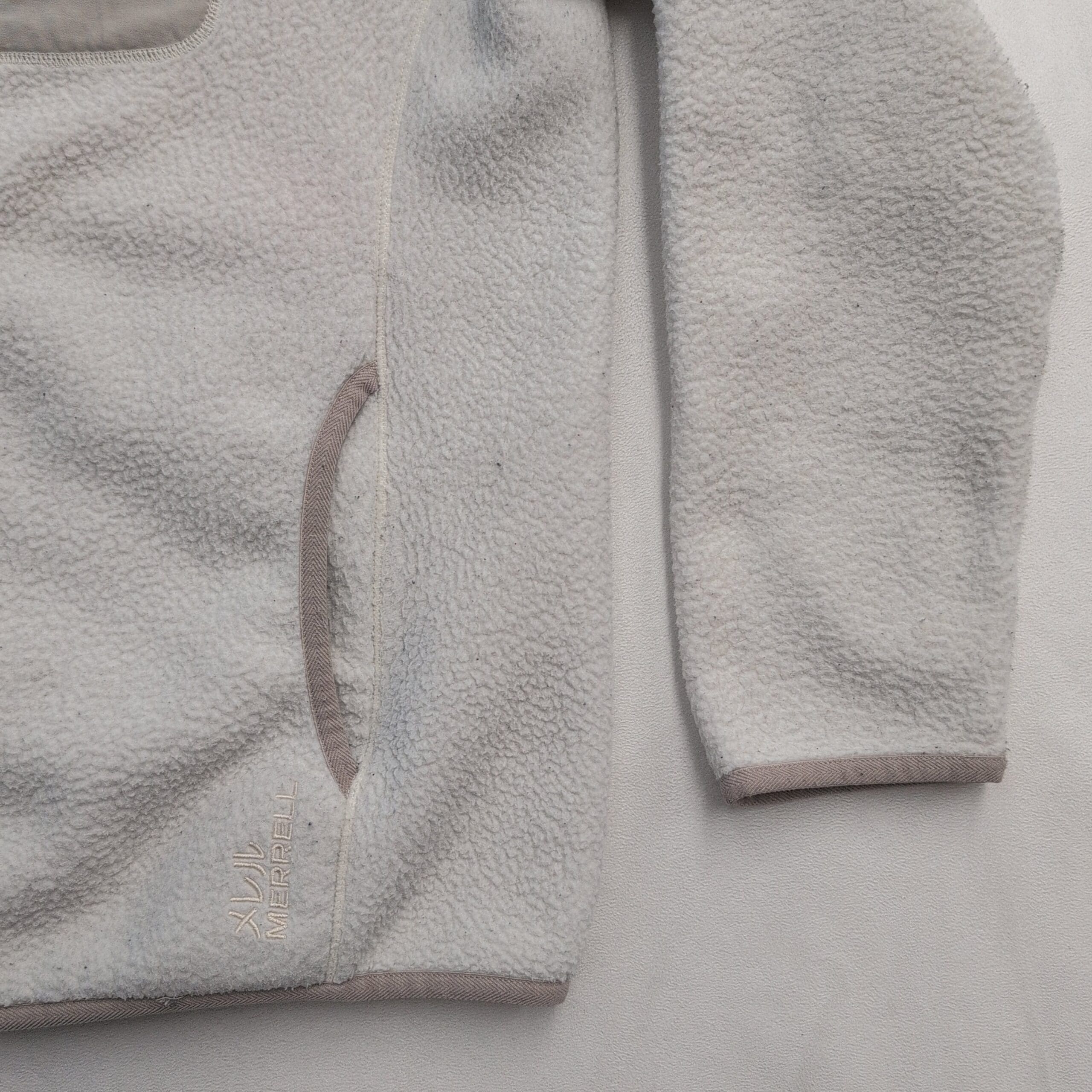 Merrell women’s full-zip fleece jacket in size L. Soft, insulating pile fleece with a stand collar, full-length zipper, zip chest pocket with Merrell logo patch, and two hand pockets. Light gray/ivory color with subtle contrast trim. Fair condition — slight discoloration consistent with normal use; otherwise intact with no rips, holes, or major stains. Comfortable layering piece for hiking or everyday wear.